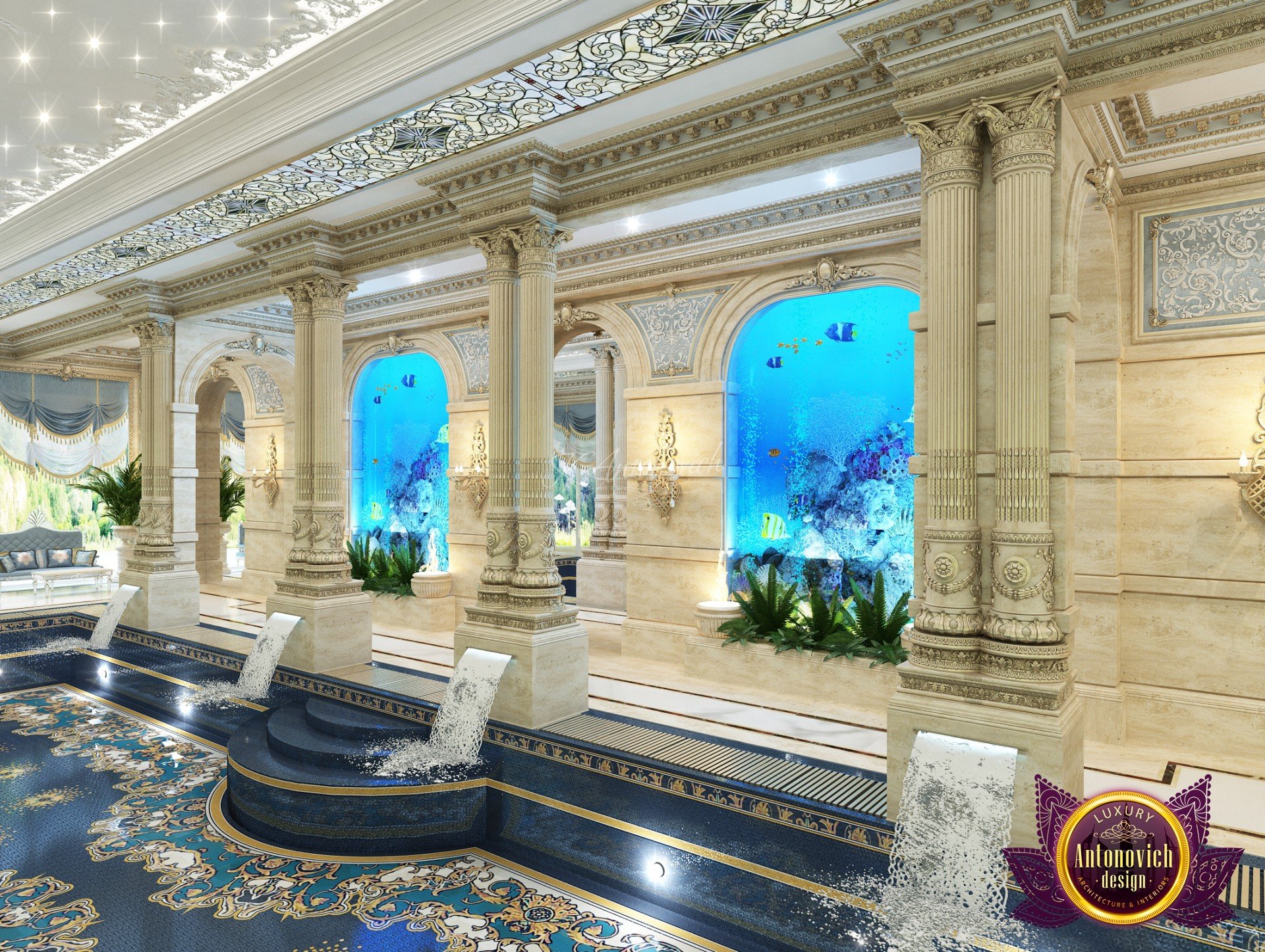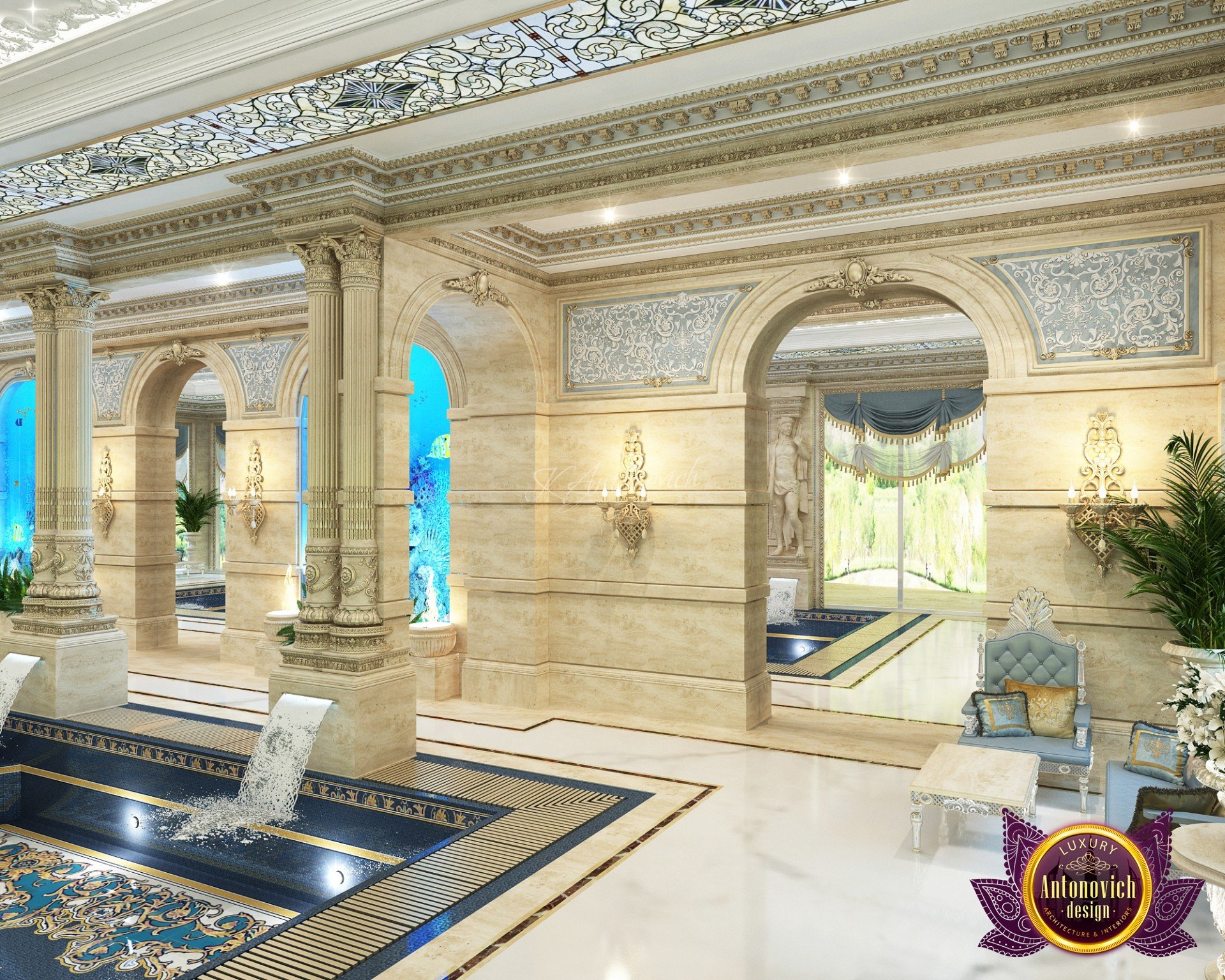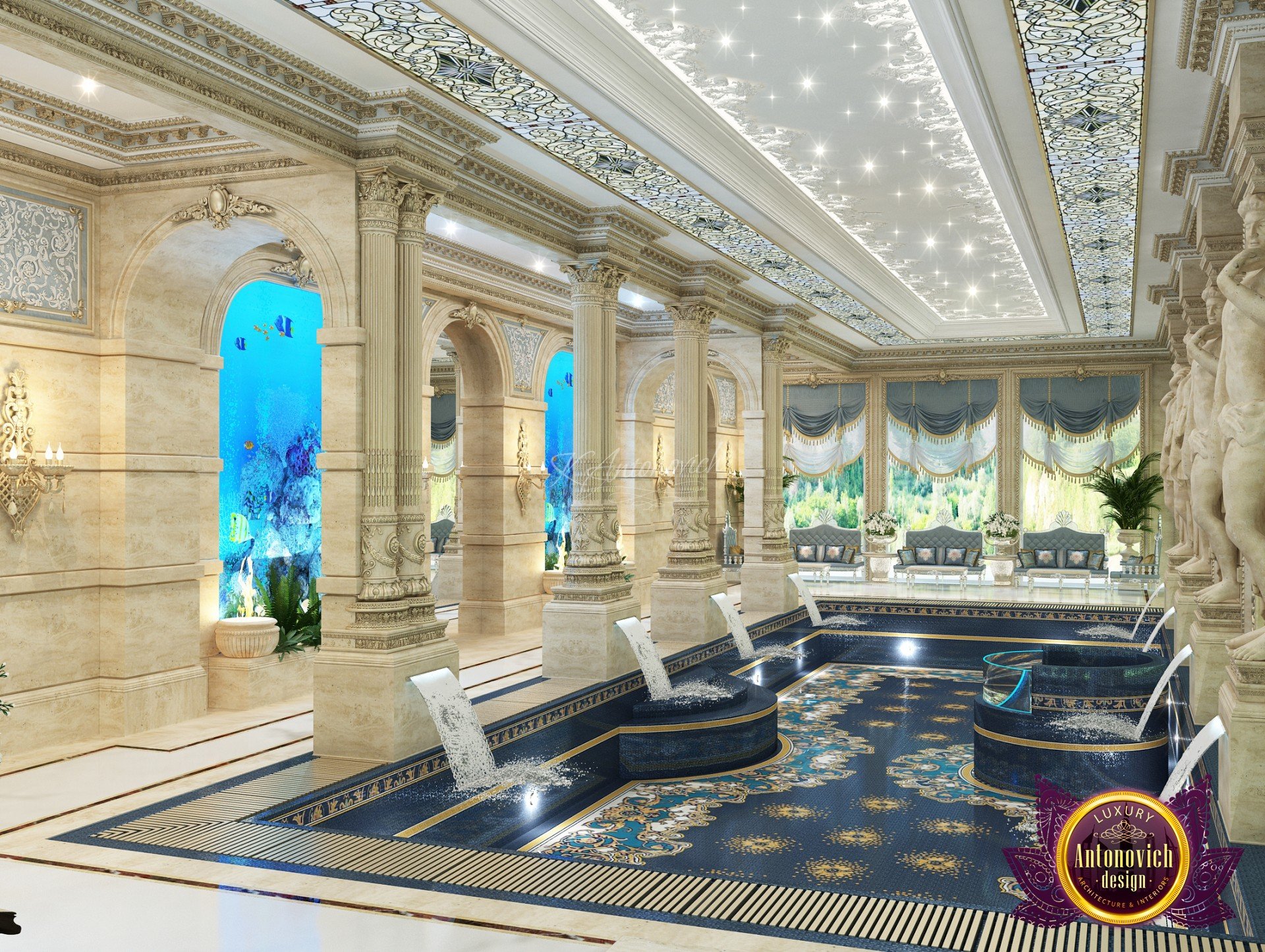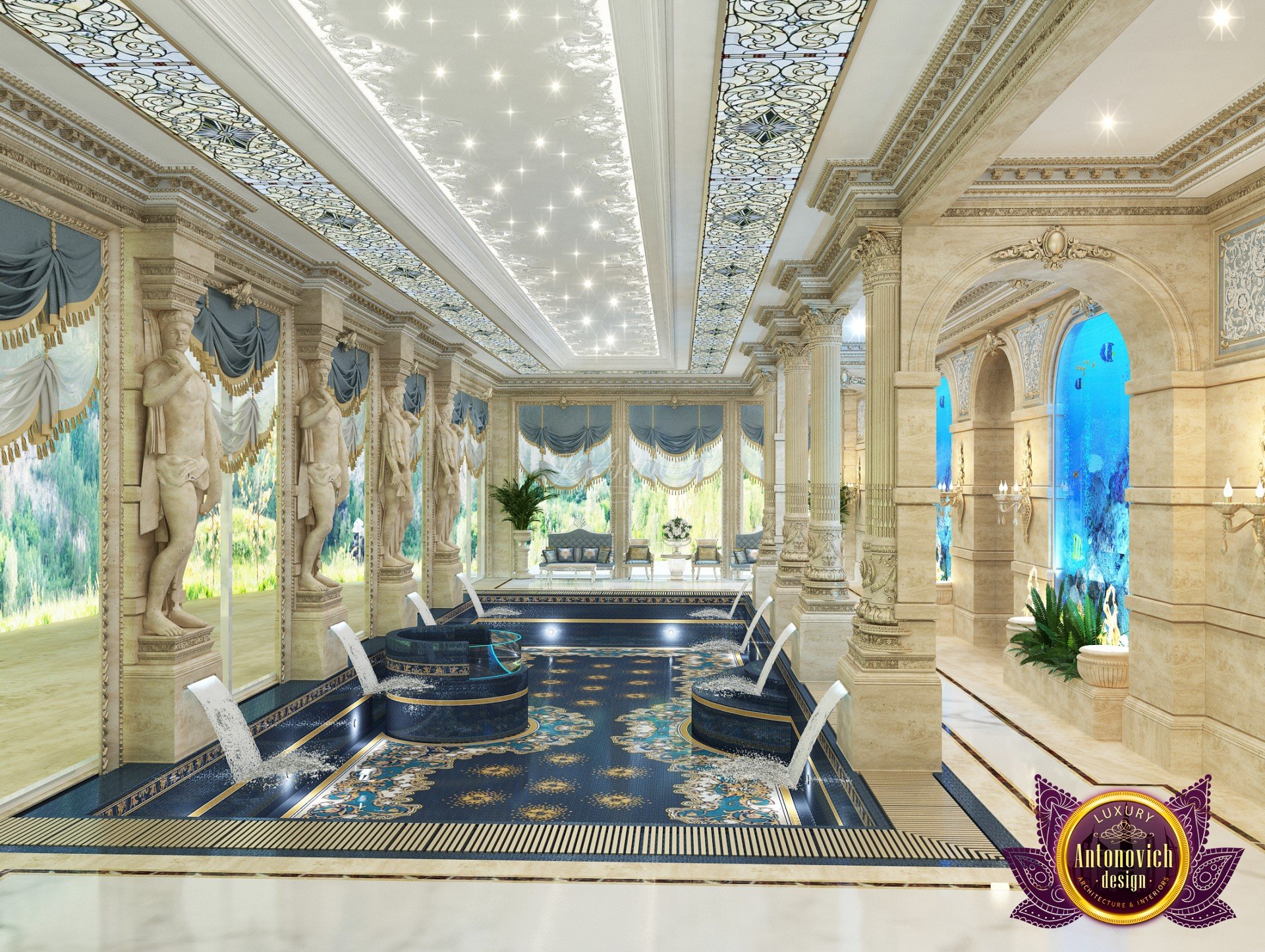 Бассейны остаются постоянным атрибутом богатых и знаменитых, но в последние годы этот «аксессуар» становится всё более распространённым. Люди стремятся обзавестись хотя бы небольшой зоной для плавания, которая заменит и тренажёрный зал, и спа-центр. Дизайн интерьера бассейна требует особых подходов и специальных знаний профессионалов Антонович Дизайн (Antonovich Design). Для отделки этого помещения мы используем натуральные высококачественные материалы — их подбор был задачей нашего специалиста по таким интерьерам. Стилистически оформление может решаться в разных вариантах. В этом проекте мы реализовали интерьер бассейна в классическом стиле с оттенками античности: скульптуры атлантов в интерьере, дополненные арки и колонны из гипса, что создаёт иллюзию пребывания на греческом или итальянском острове. Такой классический дизайн бассейна подчёркивают декоративные элементы. Наши дизайнеры также предусмотрели хранение халатов и полотенец. Дизайн крытого бассейна включает фонтаны и гейзеры в бассейне. Центральный композиционный акцент — сказочный мозаичный джакузи.