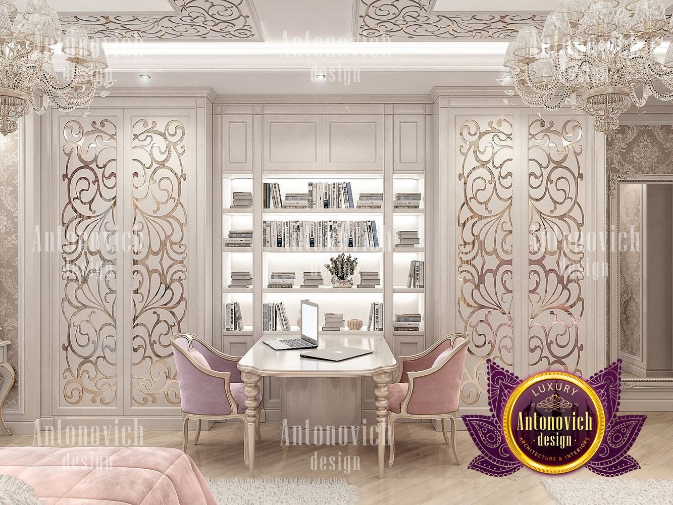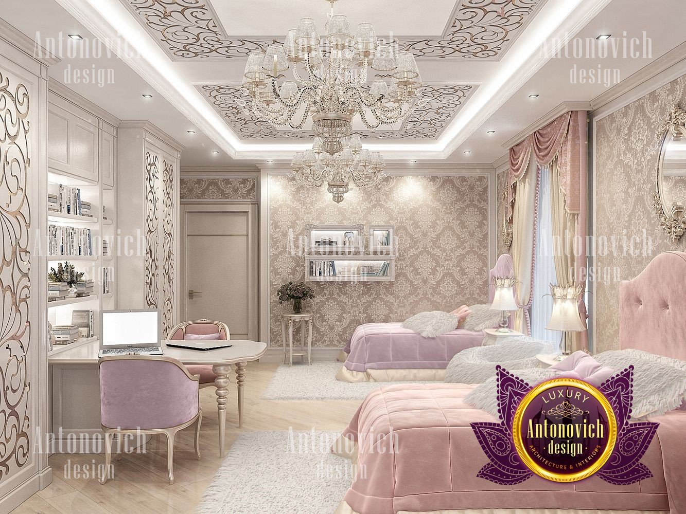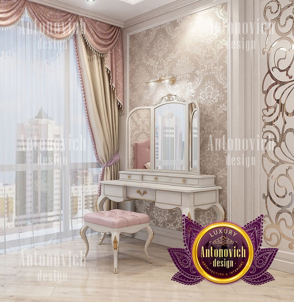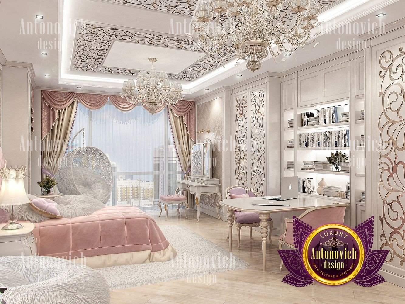 Чтобы окунуться в сказку, в мир детских фантазий, в оазис нежности и тепла. Мы предлагаем близкое знакомство с новым проектом детской комнаты для маленькой принцессы пяти лет. В этом чудесном возрасте все верят в чудеса, сказки и множество прекрасного. Эти мечты дизайнеры студии Антонович Дизайн (Antonovich Design) искусно перенесли в интерьер детской спальни. Предлагаем начать путешествие по этому сказочному пространству с оформления окна. Это восхитительный пример того, какими яркими и элегантными могут быть шторы в классическом стиле. Шелк приятного розово-лилового оттенка с красивыми волнами драпировки опускается до пола. Он удерживается мягкими держателями на двух уровнях. Мягкий ламбрекен, а также аккуратная бахрома прекрасно дополняют композицию. Сверху два больших банта завершают ансамбль, который обрамляет снежно-белую прозрачную тюль. На этом элегантном фоне превосходно смотрится небольшой мягкий диван. Сегодня итальянские мебельные фабрики предлагают роскошные коллекции мебели, особенно для детских комнат. В обивке используются натуральные ткани с тематическими орнаментами, а декор мебели идеально соответствует сказочному настрою в этой комнате, который продолжается удобной кроватью с балдахином. Декор кровати гармонирует с остальной мебелью. Романтический балдахин из белого полупрозрачного шелка увенчан красивым лиловым венком. Этот элемент подчёркивает нежный возраст юной хозяйки комнаты. Потолок и стены оформлены респектабельно и аристократично в лучших традициях классического стиля.