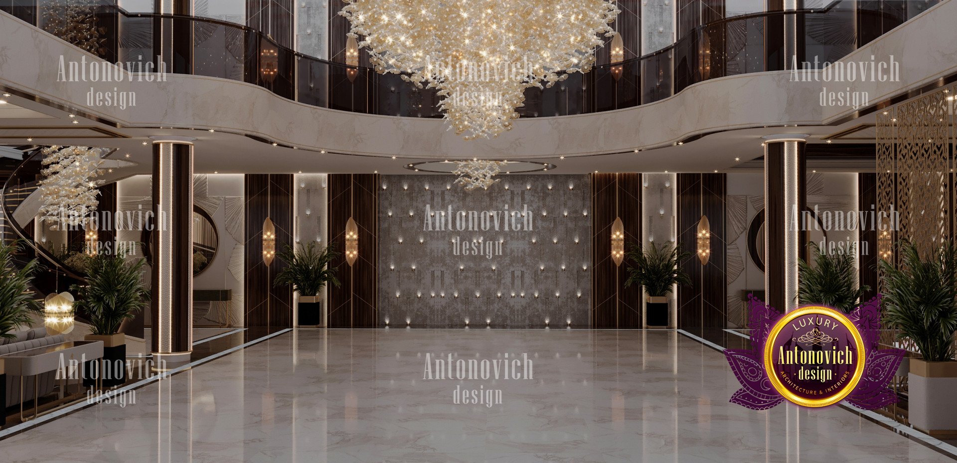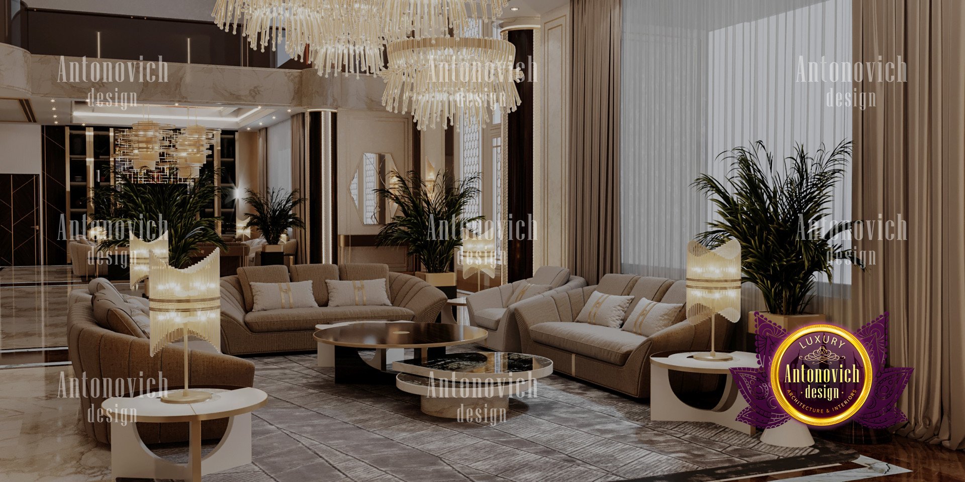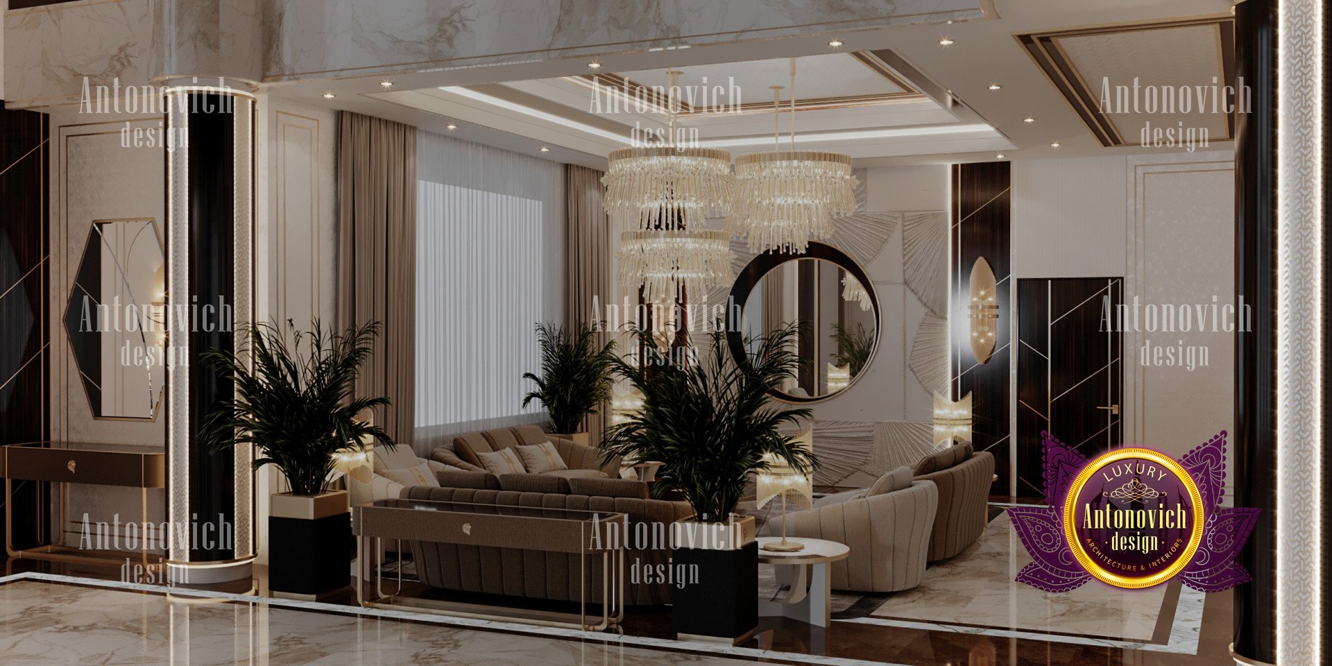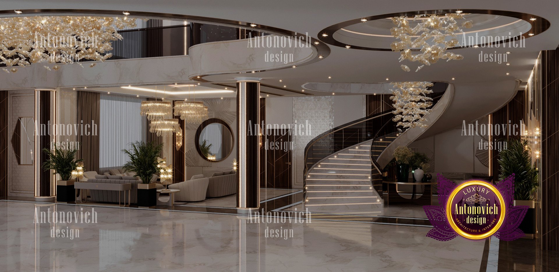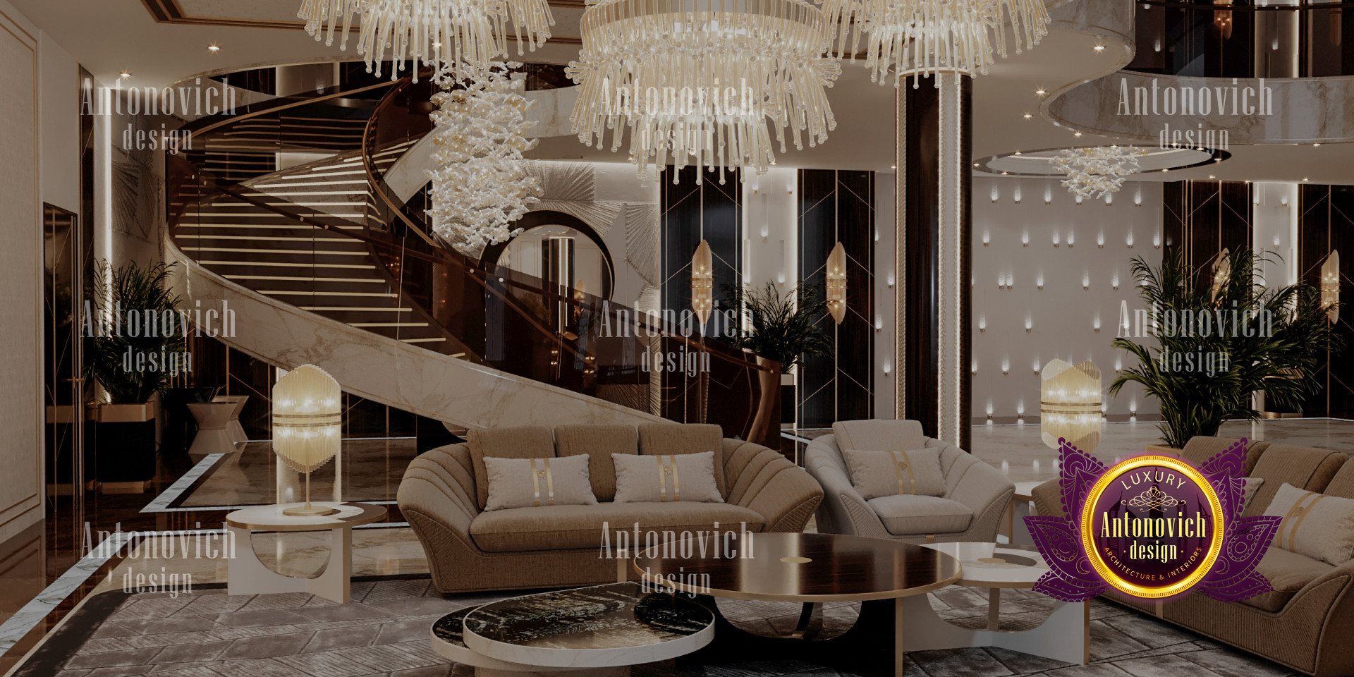 Проект выполнен как арт-деко интерьер виллы, размещённый в гламурной обстановке. Сочетание тёмной древесины в лестничных конструкциях, детализированных настенных панелей, мебели и оформления пола придаёт всему интерьеру классический и уникальный облик. Для отделки использованы золотые акценты, подчёркивающие тёмно‑коричневые и бежевые оттенки. В проекте применены панели декора для виллы и продуманное комбинирование мрамора и плитки, что обеспечило премиальную фактуру полов. Из-за насыщенных тёмных акцентов индивидуальное освещение и люстры были разработаны на заказ — они наполняют пространство светом и органично связаны с художественными гипсовыми деталями, а также включено оформление гостиной виллы.