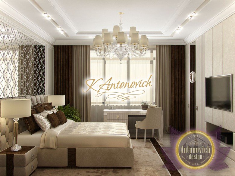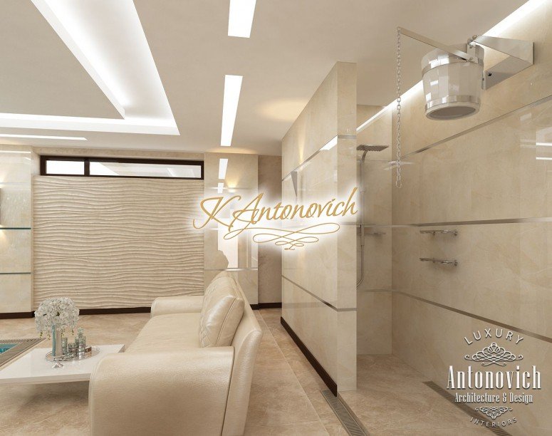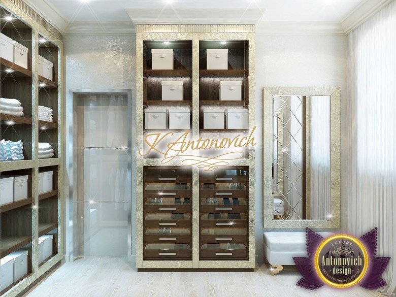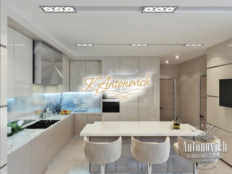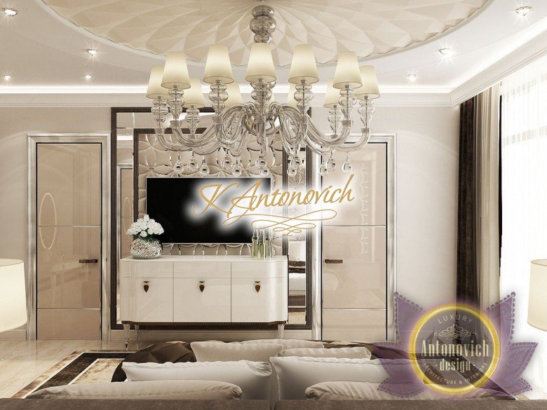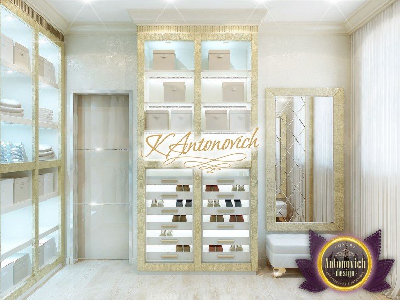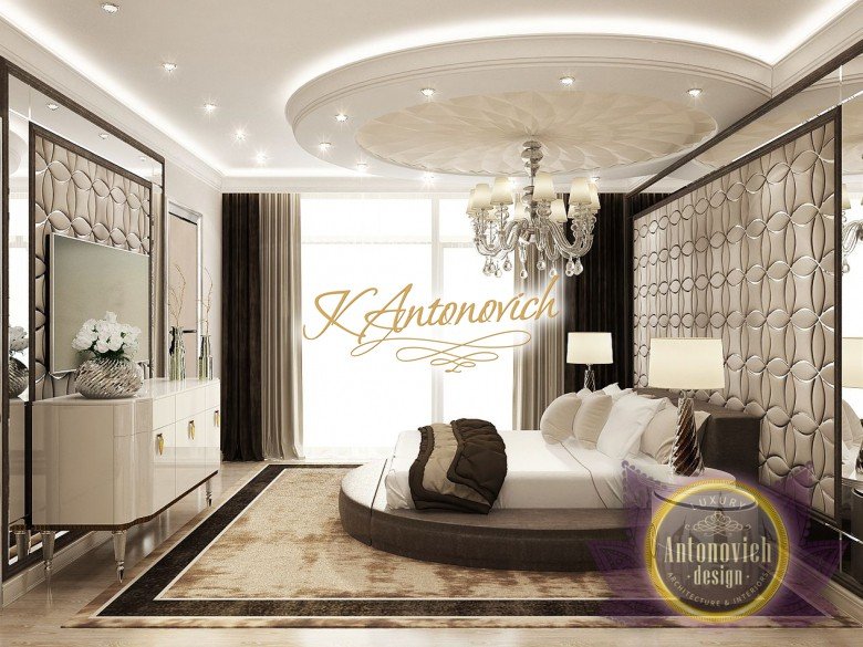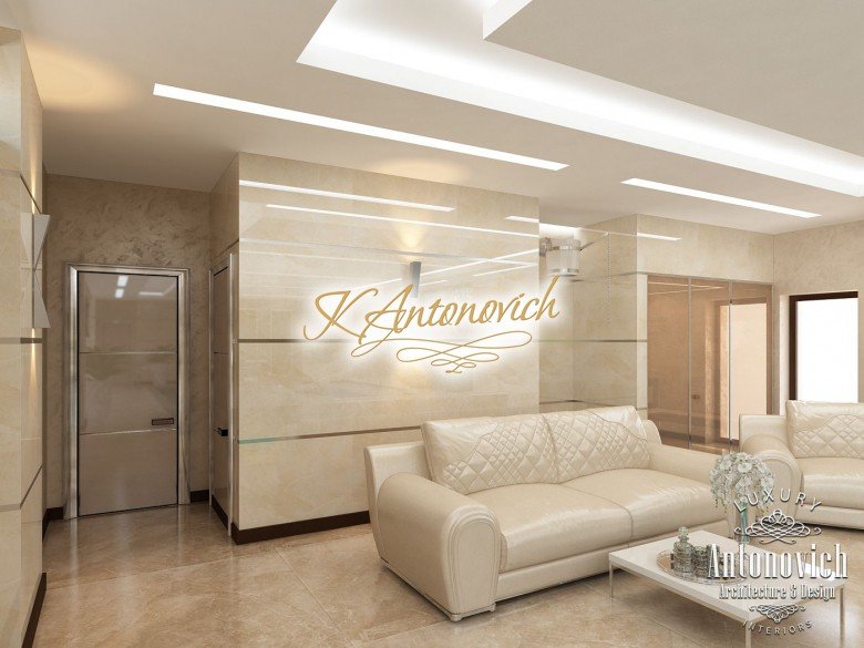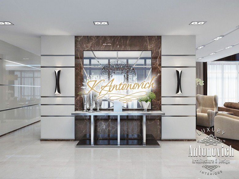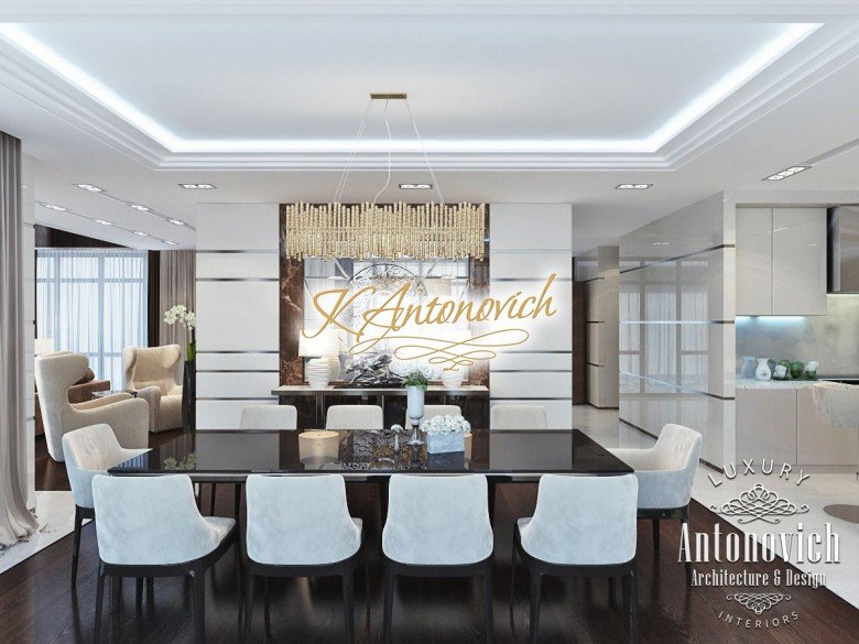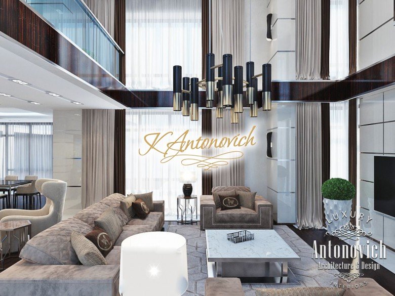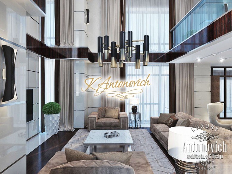 Антонович Дизайн (Antonovich Design) черпала вдохновение из множества собственных вариантов внутреннего оформления для этого проекта. Этот проект — вилла современного стиля. Пространство сочетает изысканность и комфорт: декоративный потолок с карнизами, занавеси от пола до потолка с белыми ламбрекенами наверху и крупная мебель. Тёмный деревянный пуф с точёными ножками гармонирует с диванами. Открытые стеллажи, поднимающиеся до потолка, усиливают атмосферу сдержанной роскоши, которая пронизывает весь интерьер. Антонович Дизайн остановилась на мягких приглушённых оттенках, поскольку семье важно мгновенно расслабляться, входя в дом после насыщенного дня. Хотя базовая мебель и аксессуары преобразуют дом в уютное пространство, небольшие акценты оживляют оформление: роскошные элементы сидения, пушистые подушки и декоративные корзины делают комнату более комфортной.