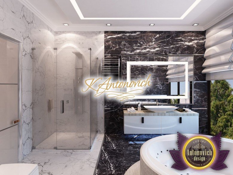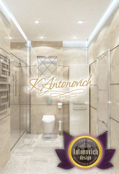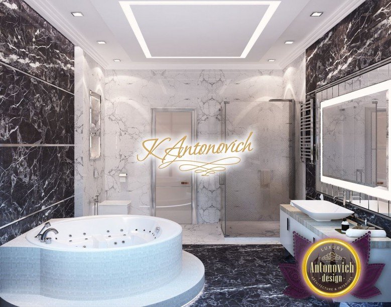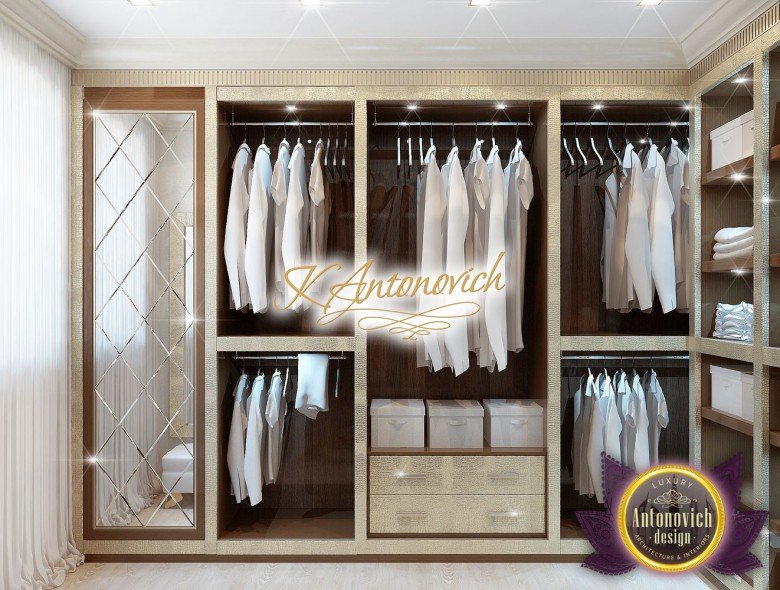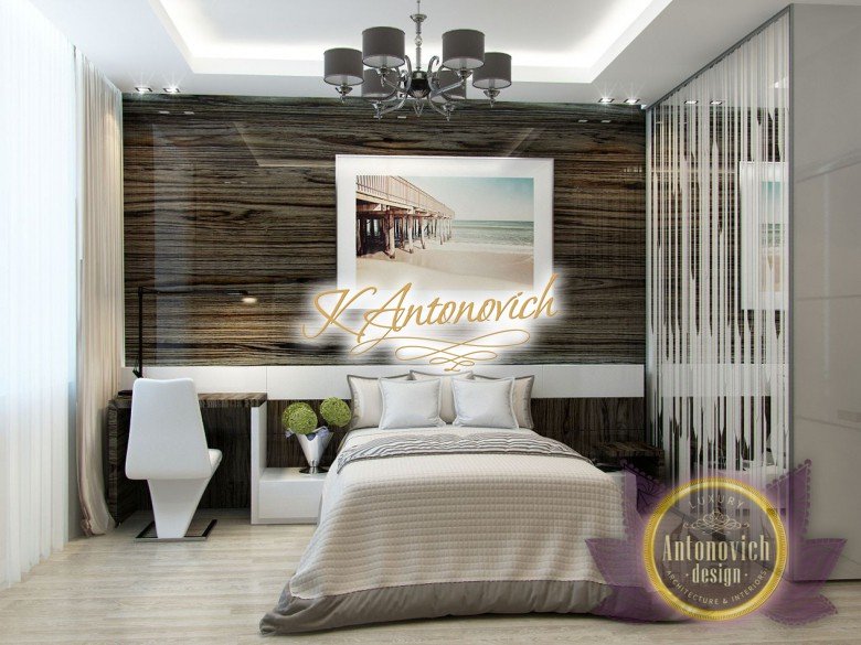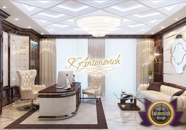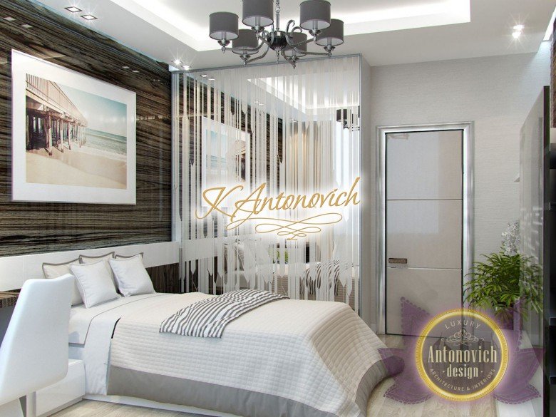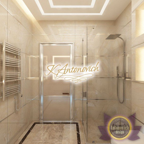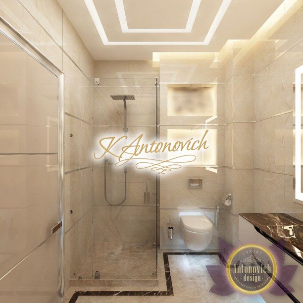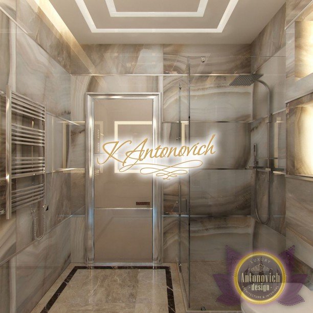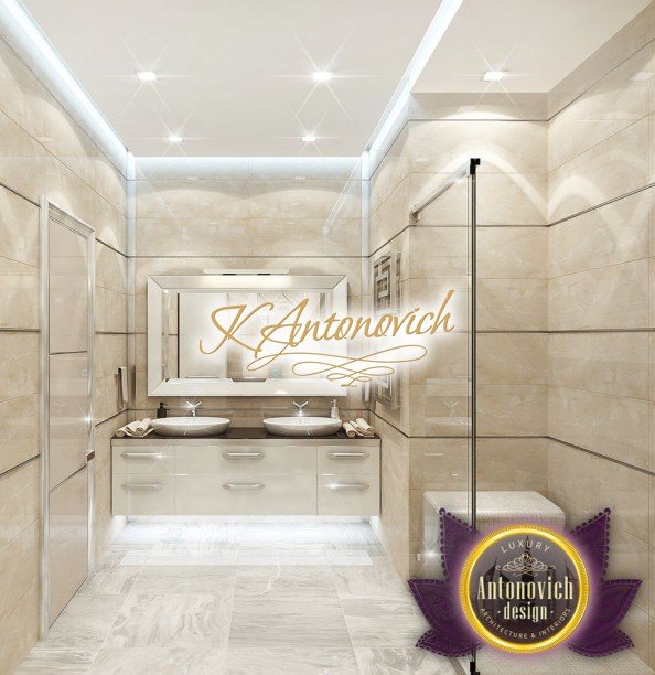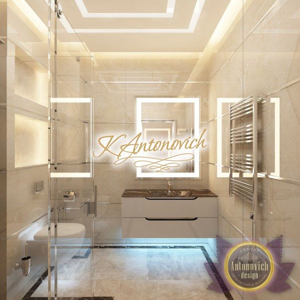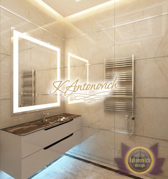 Антонович Дизайн (Antonovich Design) черпала вдохновение из множества собственных вариантов внутреннего оформления для этого проекта. Этот проект — вилла современного стиля. Пространство сочетает изысканность и комфорт: декоративный потолок с карнизами, занавеси от пола до потолка с белыми ламбрекенами наверху и крупная мебель. Тёмный деревянный пуф с точёными ножками гармонирует с диванами. Открытые стеллажи, поднимающиеся до потолка, усиливают атмосферу сдержанной роскоши, которая пронизывает весь интерьер. Антонович Дизайн остановилась на мягких приглушённых оттенках, поскольку семье важно мгновенно расслабляться, входя в дом после насыщенного дня. Хотя базовая мебель и аксессуары преобразуют дом в уютное пространство, небольшие акценты оживляют оформление: роскошные элементы сидения, пушистые подушки и декоративные корзины делают комнату более комфортной.