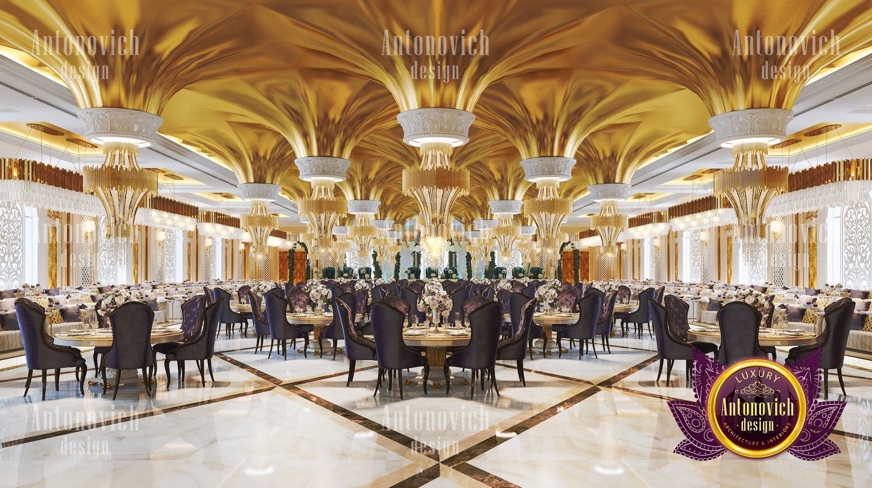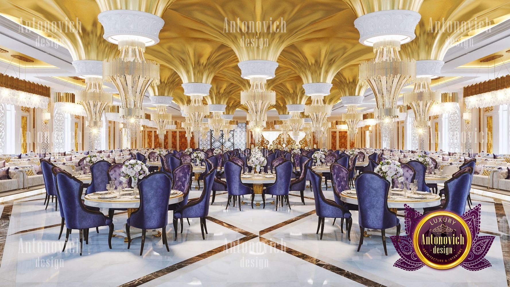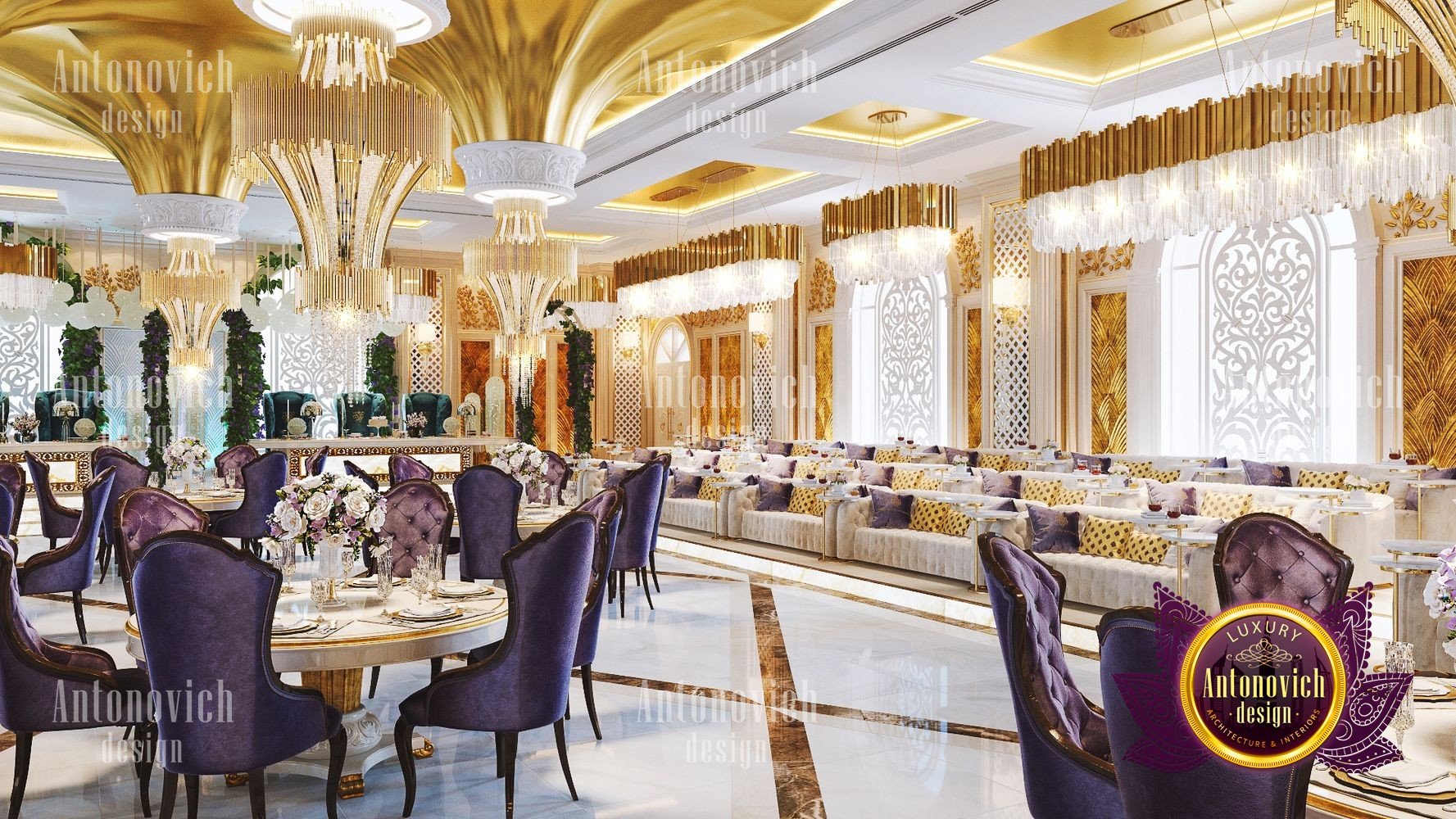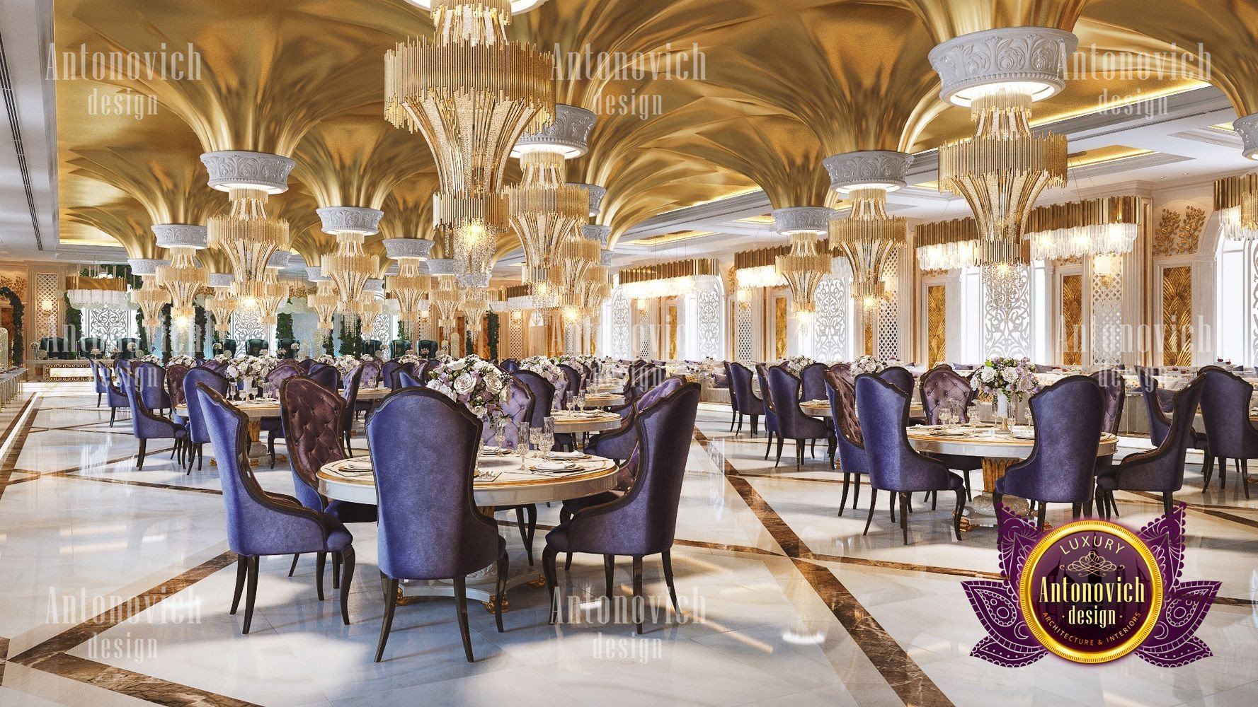Интерьер ресторана для торжеств должен всегда идеально соответствовать концепции. Только в этом случае гости почувствуют гармонию и целостность, а у заведения появится незабываемое лицо. Дизайнерская студия Антонович Дизайн (Antonovich Design) всегда придерживается философии уникальности в своих проектах: только новые и роскошные идеи в каждом объекте. Дизайн свадебного зала в этом проекте полностью соответствует его базовой концепции — проведению самых разных праздничных мероприятий. В таком пространстве каждое событие запомнится своим чарующим великолепием, а праздничный интерьер для фотосессий подчеркнёт стиль и элегантность снимков. Дизайнеры студии отказались от скромности и сдержанности: только яркие цвета, только блеск и сияние праздника. Авторы проекта предложили оригинальное решение для декора потолка: декор потолка с подвесными конструкциями в виде перевёрнутых конусов, покрытых золотой отделкой и увенчанных элегантными хрустальными люстрами. Блеск позолоты искрится, создавая неповторимую атмосферу. Праздничный и чарующий потолок продолжается в не менее изящном оформлении стен — ажурные вставки со подсветкой прекрасно сочетаются с трехмерными панелями с позолотой. Игра цветовых контрастов делает пространство ещё эффектнее: эффектный цветовой контраст в интерьере подчёркивает глубину и ритм композиции. Большая часть мебели обита бархатом благородного лилового оттенка. Натуральный мраморный пол с противоскользящей обработкой дополняет элитарность статуса заведения. Пример этого проекта — полноценный интерьер свадебного банкета в Москве. Результат — роскошный дизайн зала для мероприятий, который надолго останется в памяти гостей.