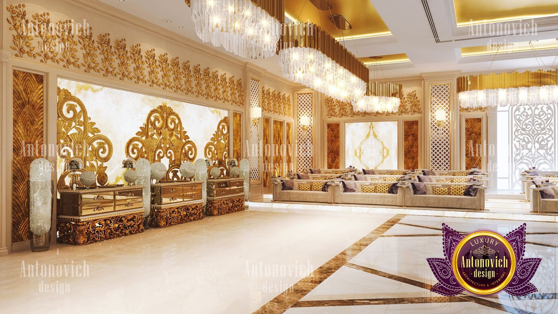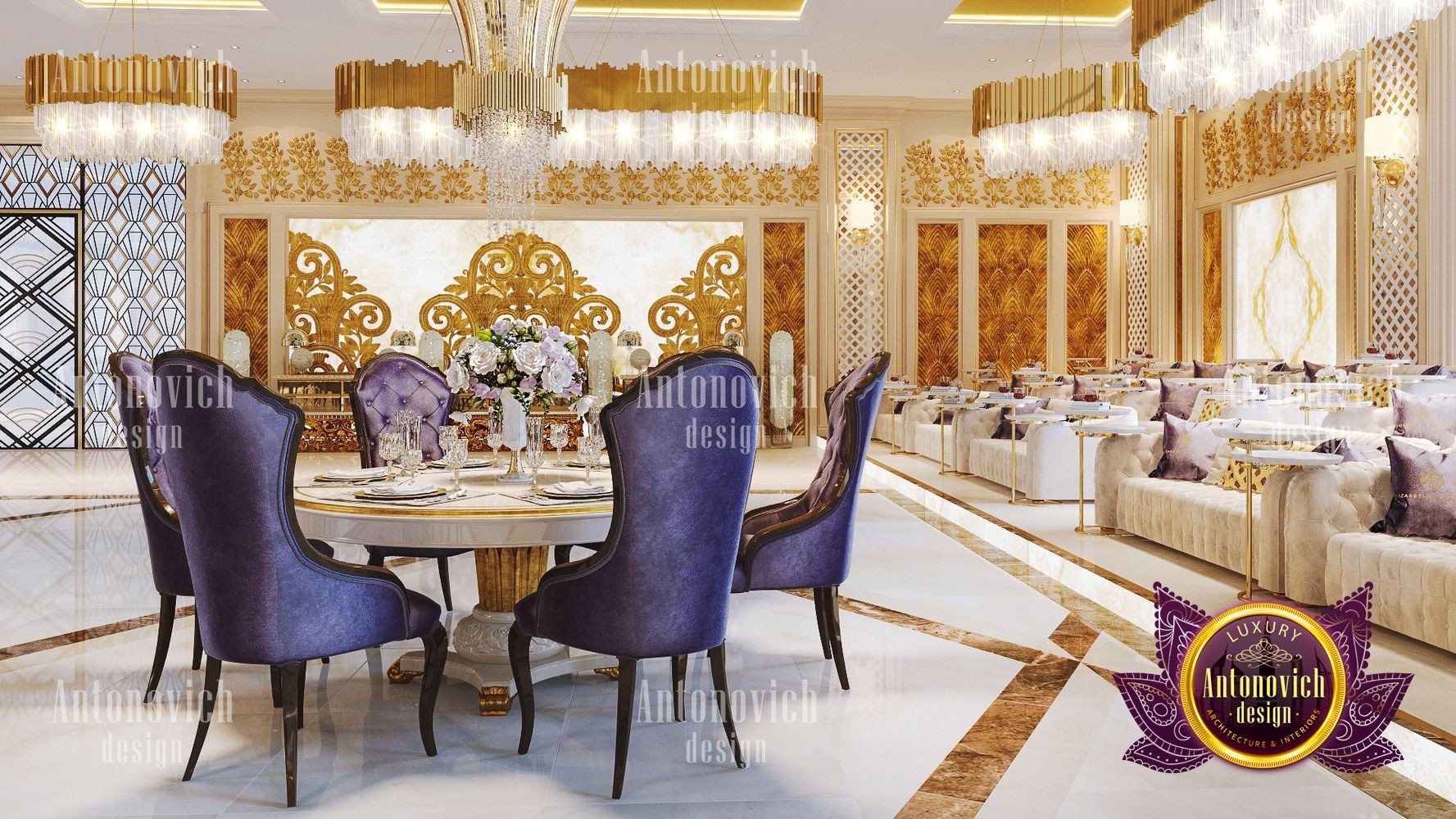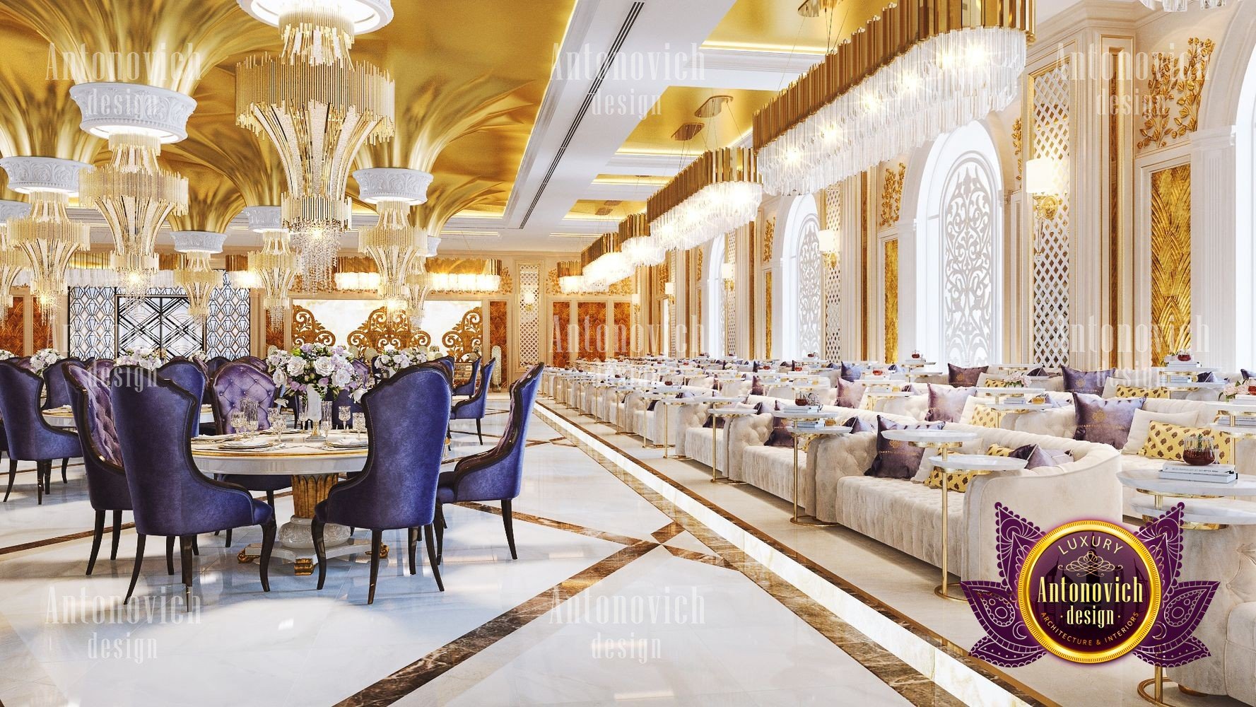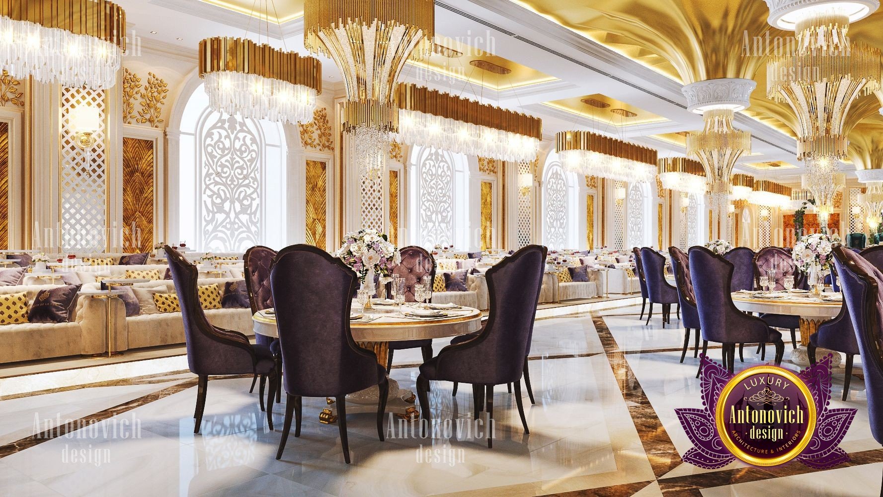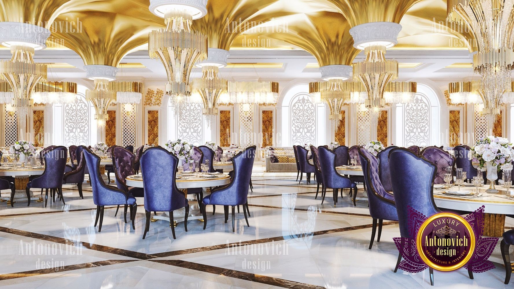 Интерьер ресторана для торжеств должен всегда идеально соответствовать концепции. Только в этом случае гости почувствуют гармонию и целостность, а у заведения появится незабываемое лицо. Дизайнерская студия Антонович Дизайн (Antonovich Design) всегда придерживается философии уникальности в своих проектах: только новые и роскошные идеи в каждом объекте. Дизайн свадебного зала в этом проекте полностью соответствует его базовой концепции — проведению самых разных праздничных мероприятий. В таком пространстве каждое событие запомнится своим чарующим великолепием, а праздничный интерьер для фотосессий подчеркнёт стиль и элегантность снимков. Дизайнеры студии отказались от скромности и сдержанности: только яркие цвета, только блеск и сияние праздника. Авторы проекта предложили оригинальное решение для декора потолка: декор потолка с подвесными конструкциями в виде перевёрнутых конусов, покрытых золотой отделкой и увенчанных элегантными хрустальными люстрами. Блеск позолоты искрится, создавая неповторимую атмосферу. Праздничный и чарующий потолок продолжается в не менее изящном оформлении стен — ажурные вставки со подсветкой прекрасно сочетаются с трехмерными панелями с позолотой. Игра цветовых контрастов делает пространство ещё эффектнее: эффектный цветовой контраст в интерьере подчёркивает глубину и ритм композиции. Большая часть мебели обита бархатом благородного лилового оттенка. Натуральный мраморный пол с противоскользящей обработкой дополняет элитарность статуса заведения. Пример этого проекта — полноценный интерьер свадебного банкета в Москве. Результат — роскошный дизайн зала для мероприятий, который надолго останется в памяти гостей.