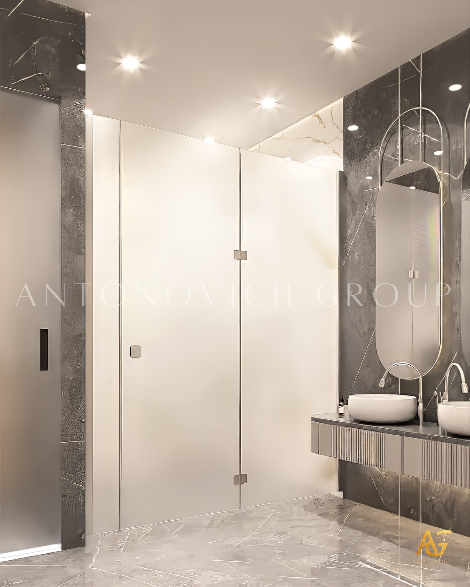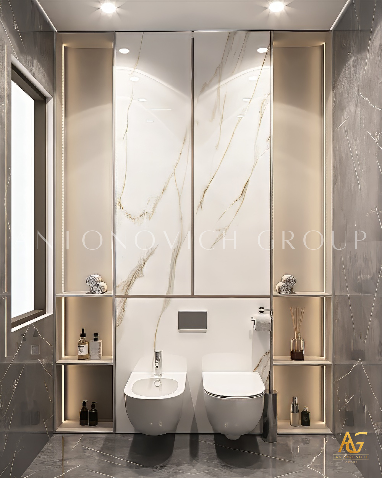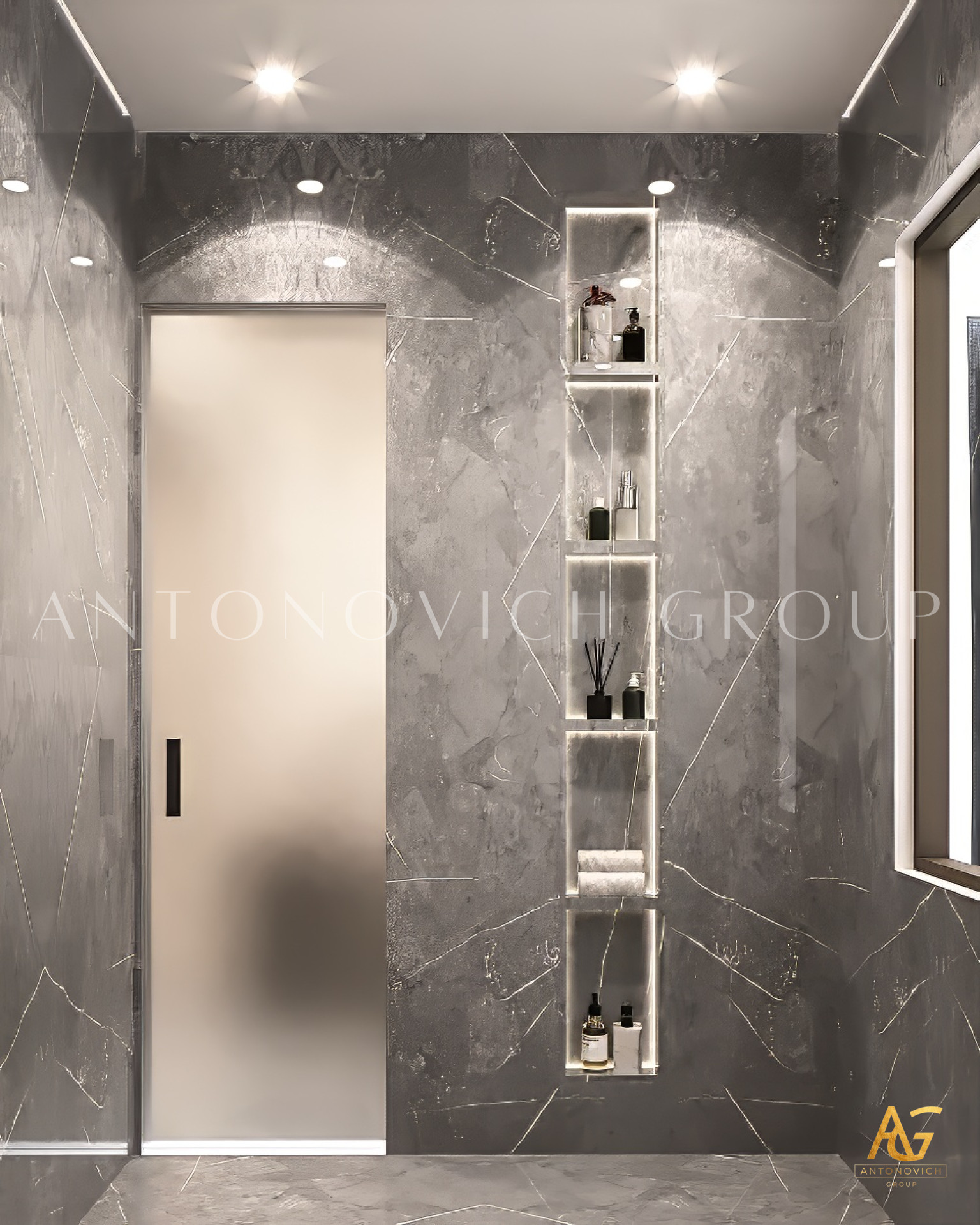 Lighting design is essential in elevating a bathroom’s atmosphere. Antonovich Group uses layered lighting solutions to create a soothing and sophisticated mood. Soft ambient lights, mirror backlighting, and accent fixtures are placed strategically to enhance textures and highlight architectural features.