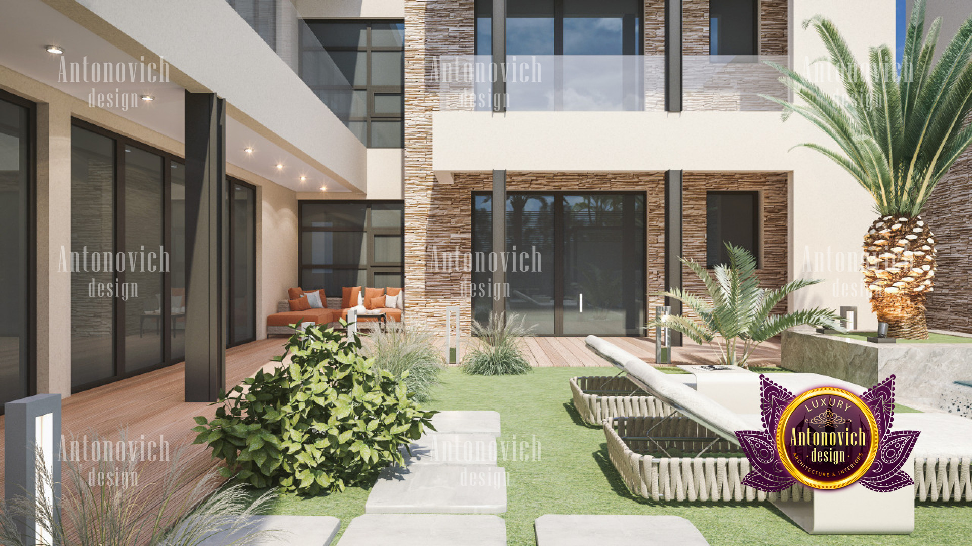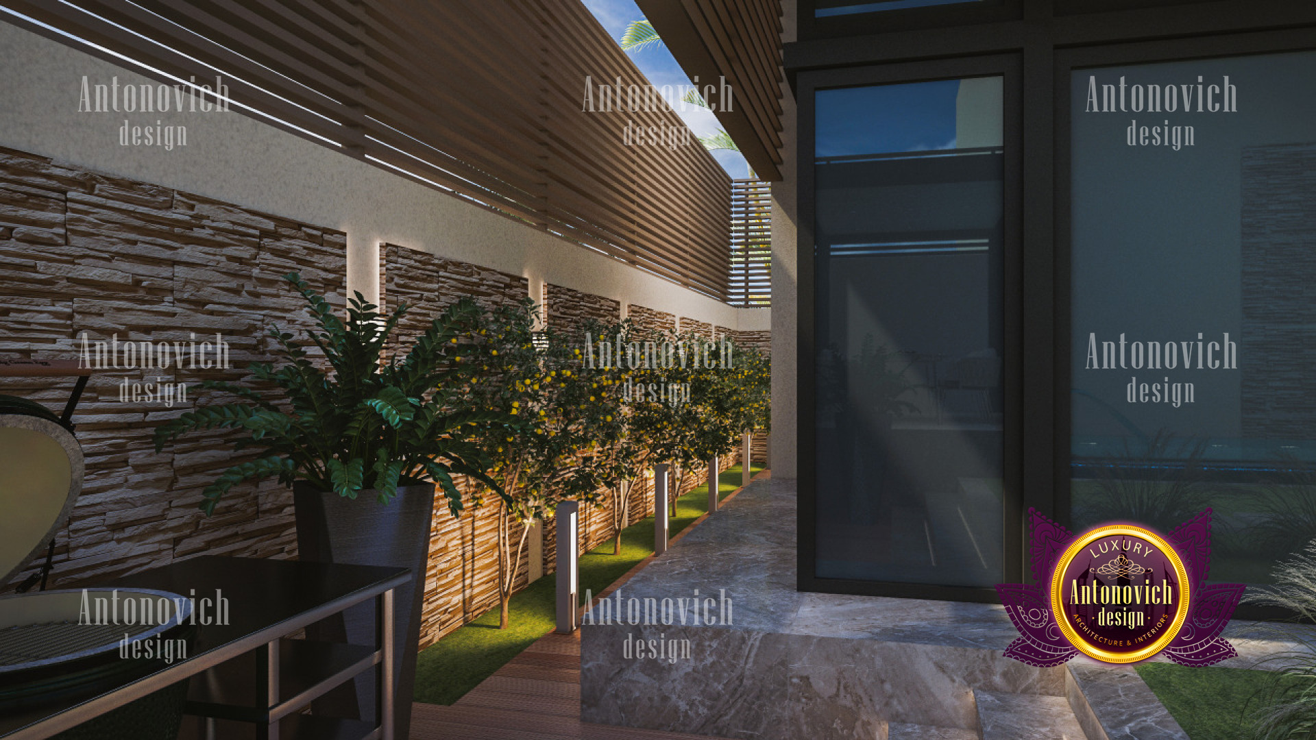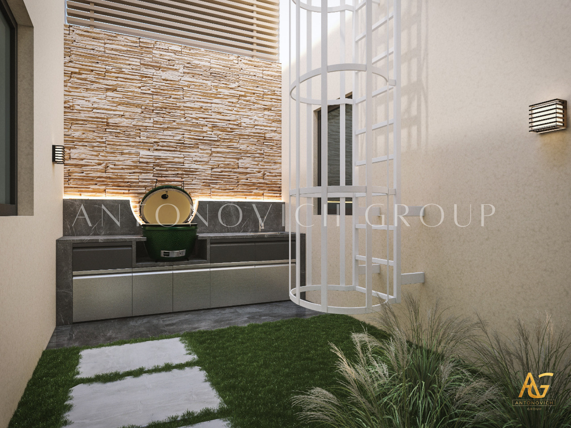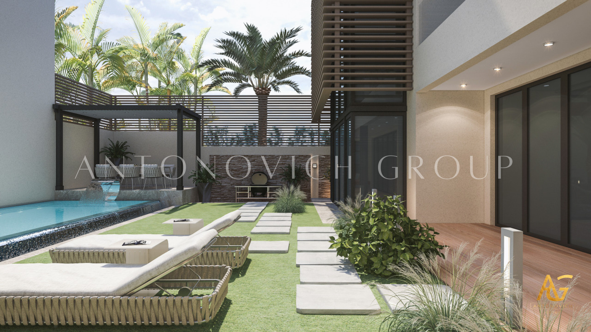 On one side, there are massive racks, and on the other, there is a couch set with an opulent table. A gorgeous window with a black accent and drapes on the side completes this landscapes excellent exterior design. A magnificent plant decor with plenty of space can be seen in the garden space. To match the style and elegance of this modern luxury landscape exterior design, Luxury Antonovich Design provides luxury touches finished in custom-made designs. Its one-of-a-kindness makes it stand out.