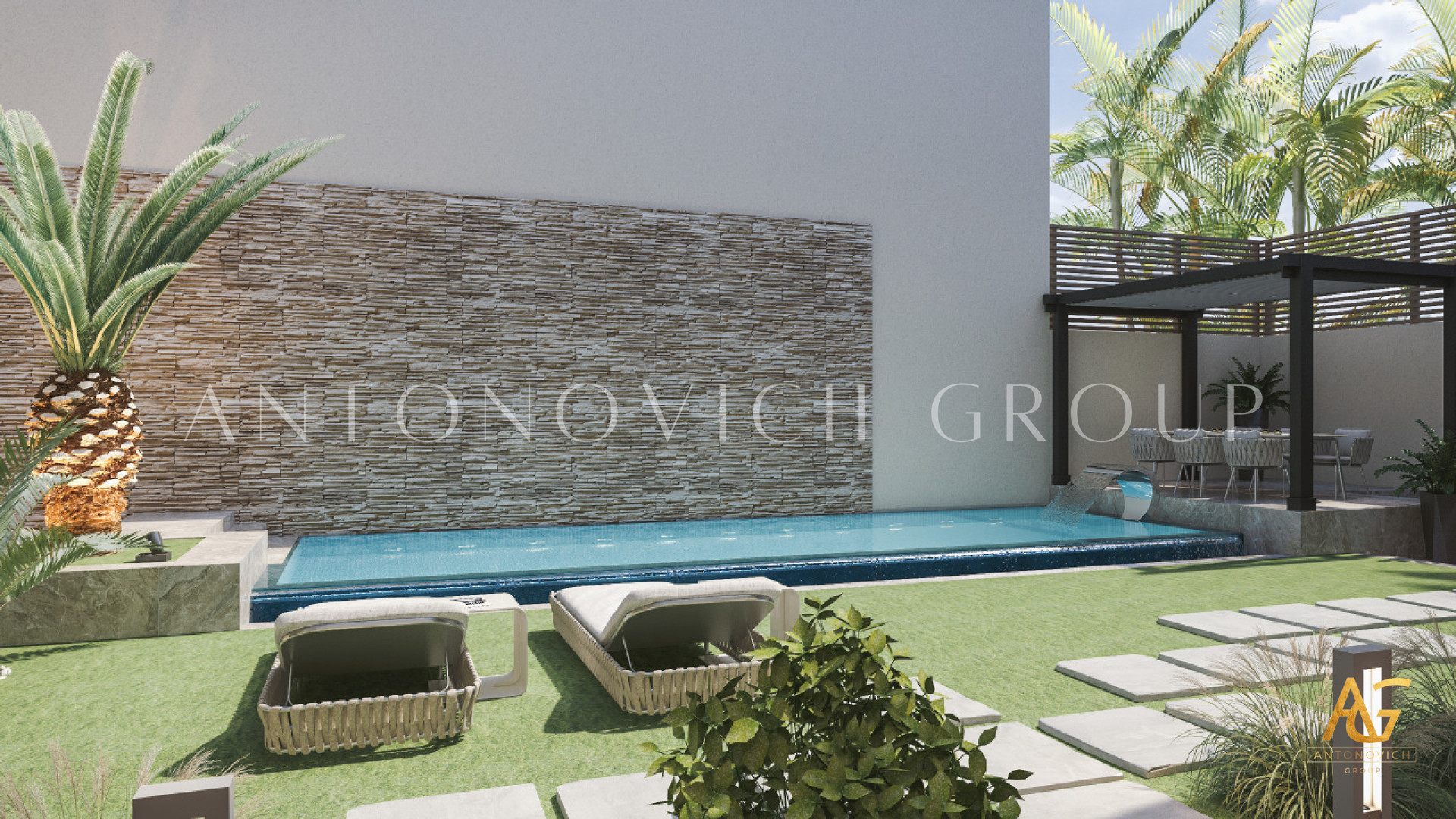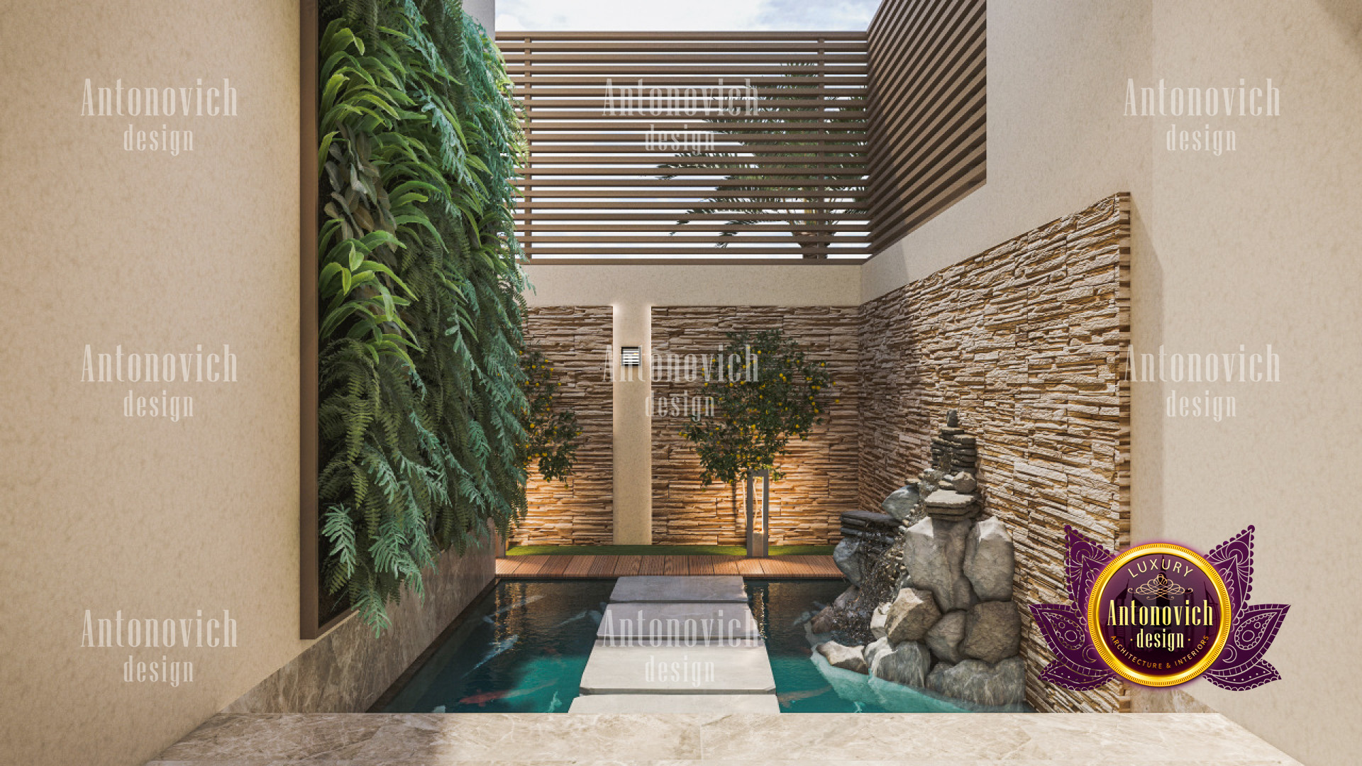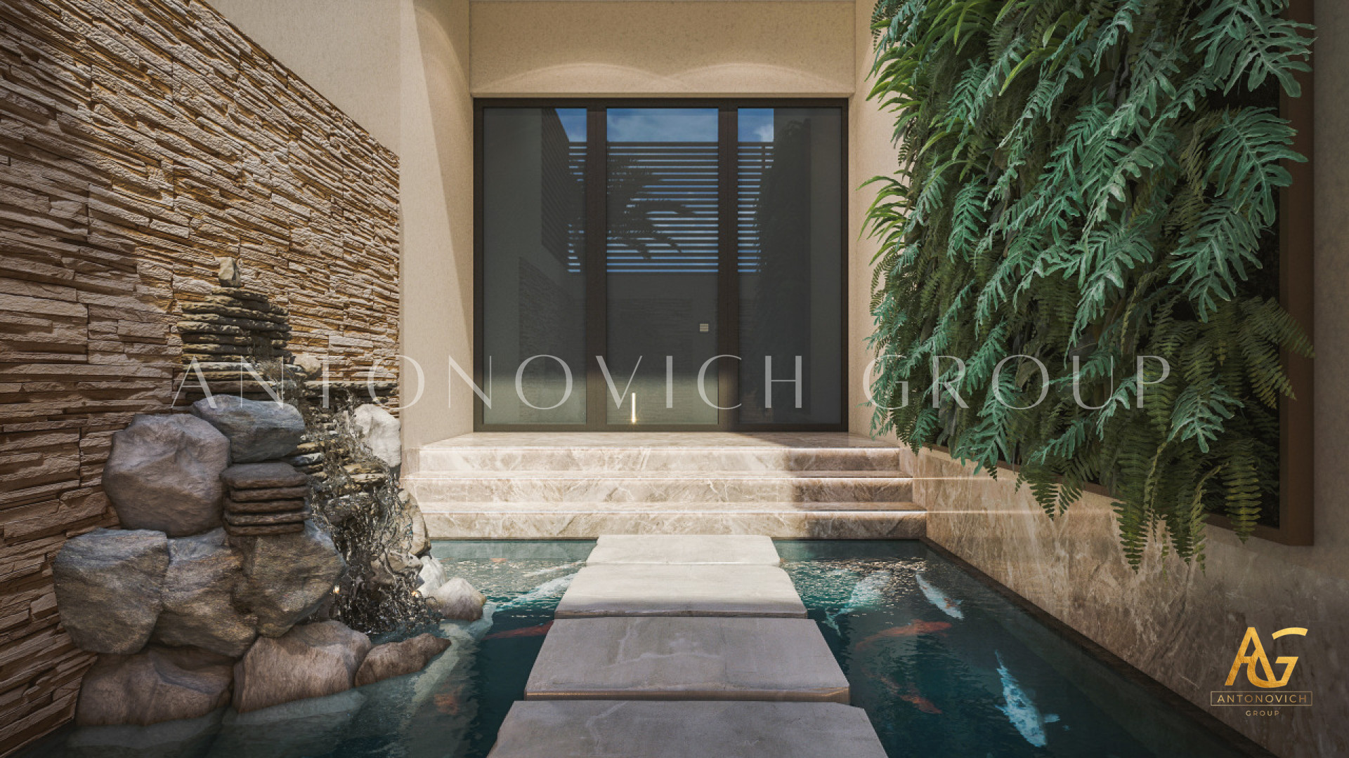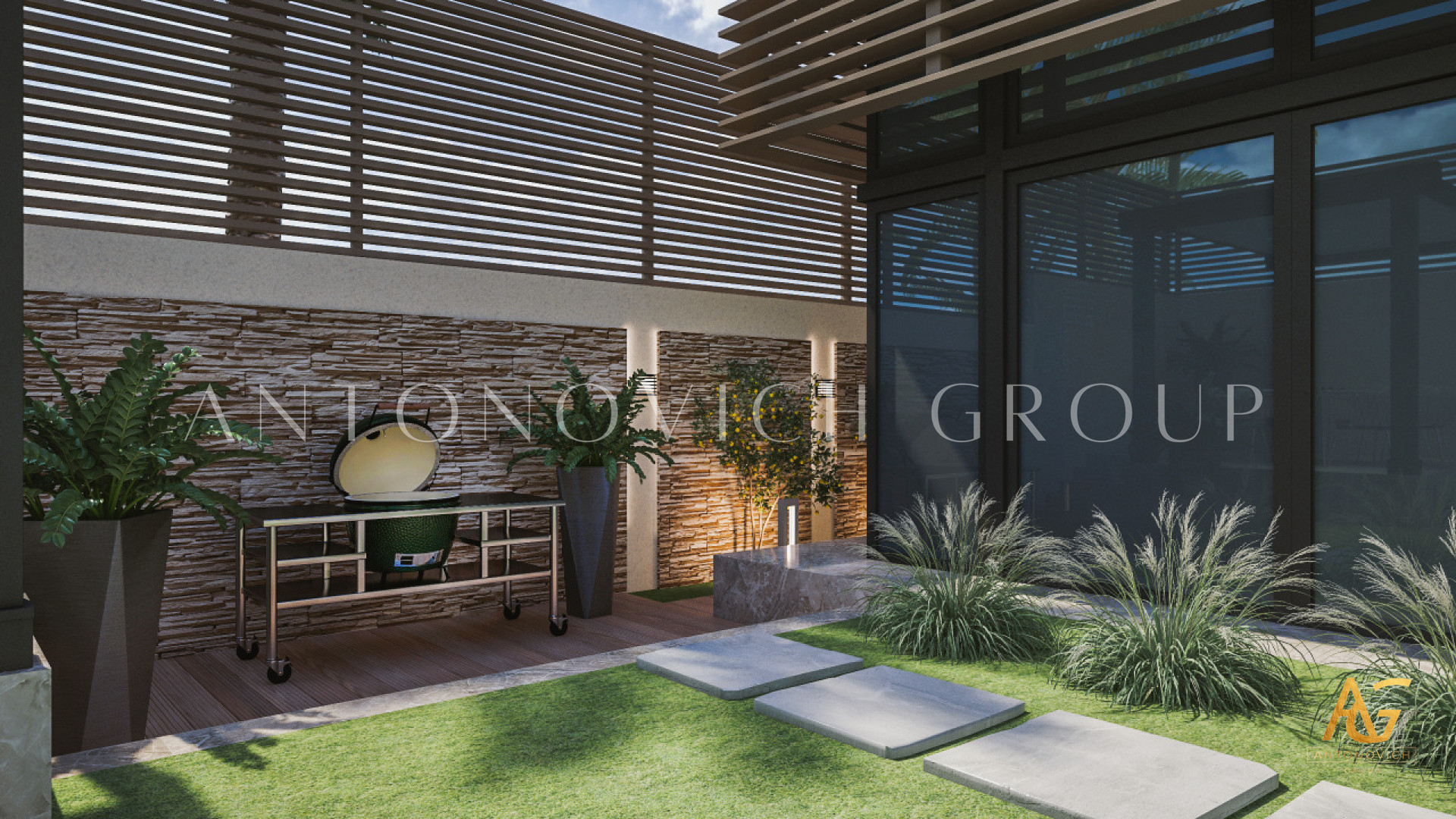 On one side, there are massive racks, and on the other, there is a couch set with an opulent table. A gorgeous window with a black accent and drapes on the side completes this landscapes excellent exterior design. A magnificent plant decor with plenty of space can be seen in the garden space. To match the style and elegance of this modern luxury landscape exterior design, Luxury Antonovich Design provides luxury touches finished in custom-made designs. Its one-of-a-kindness makes it stand out.