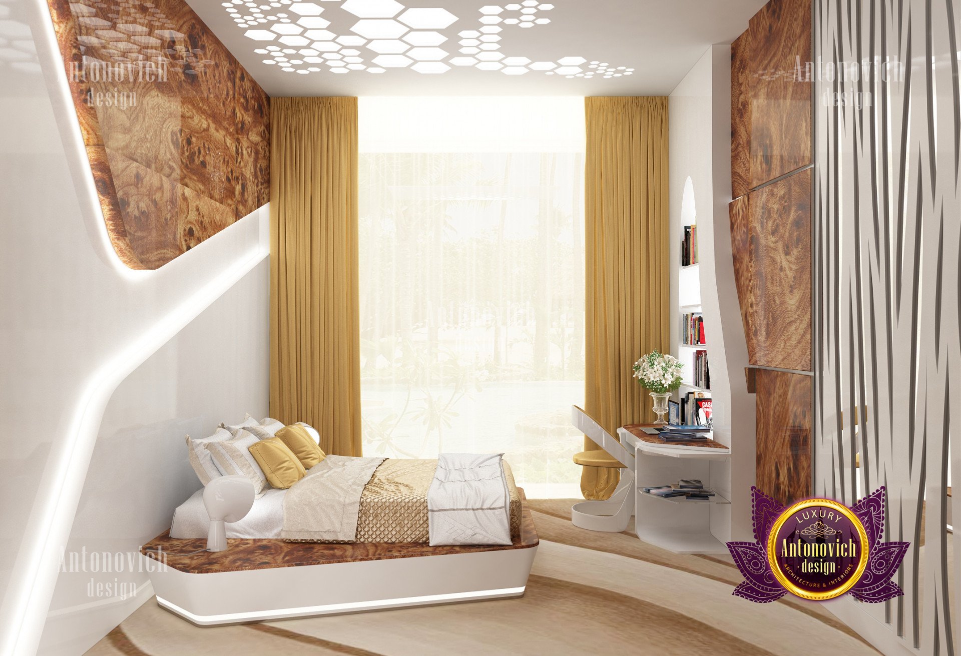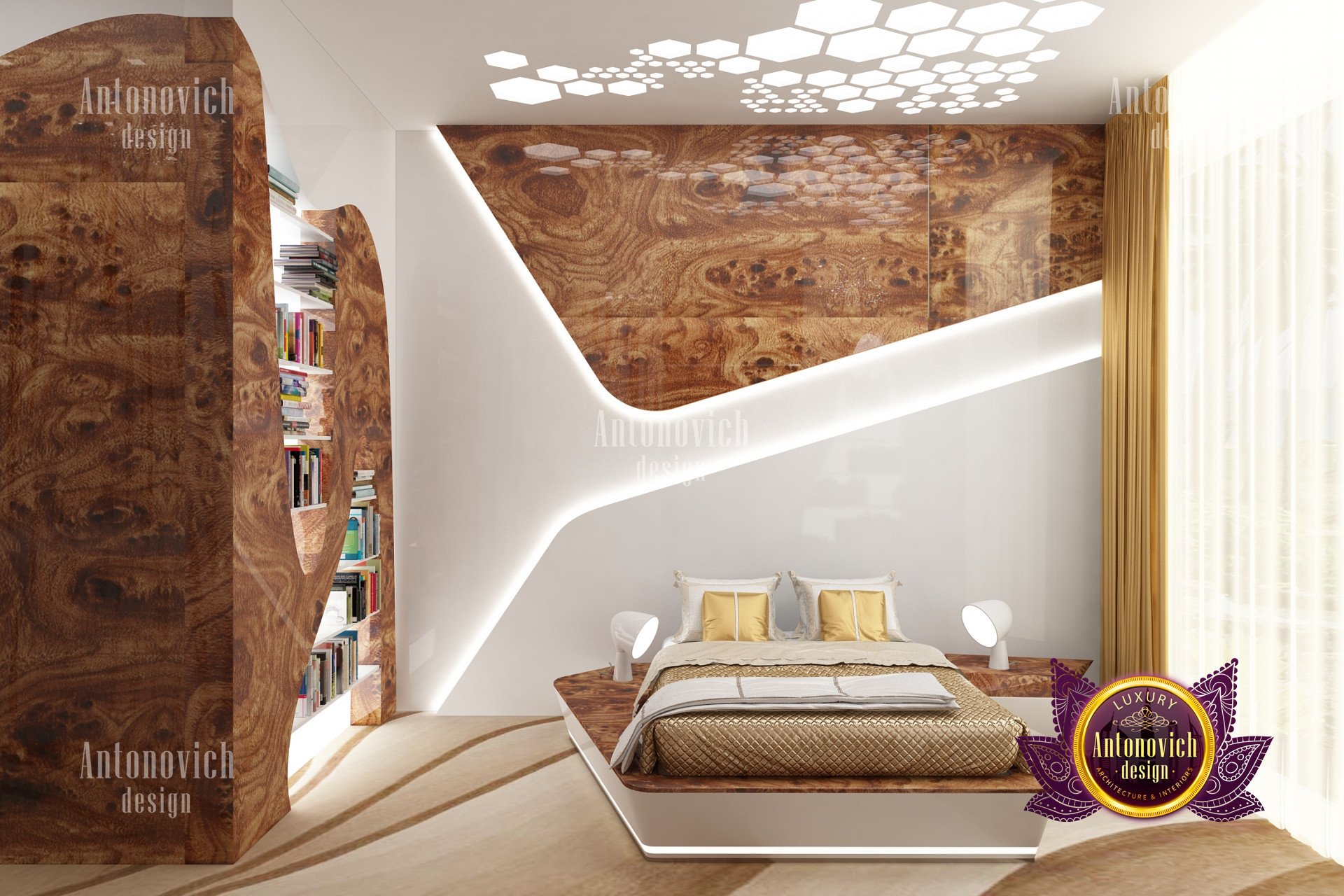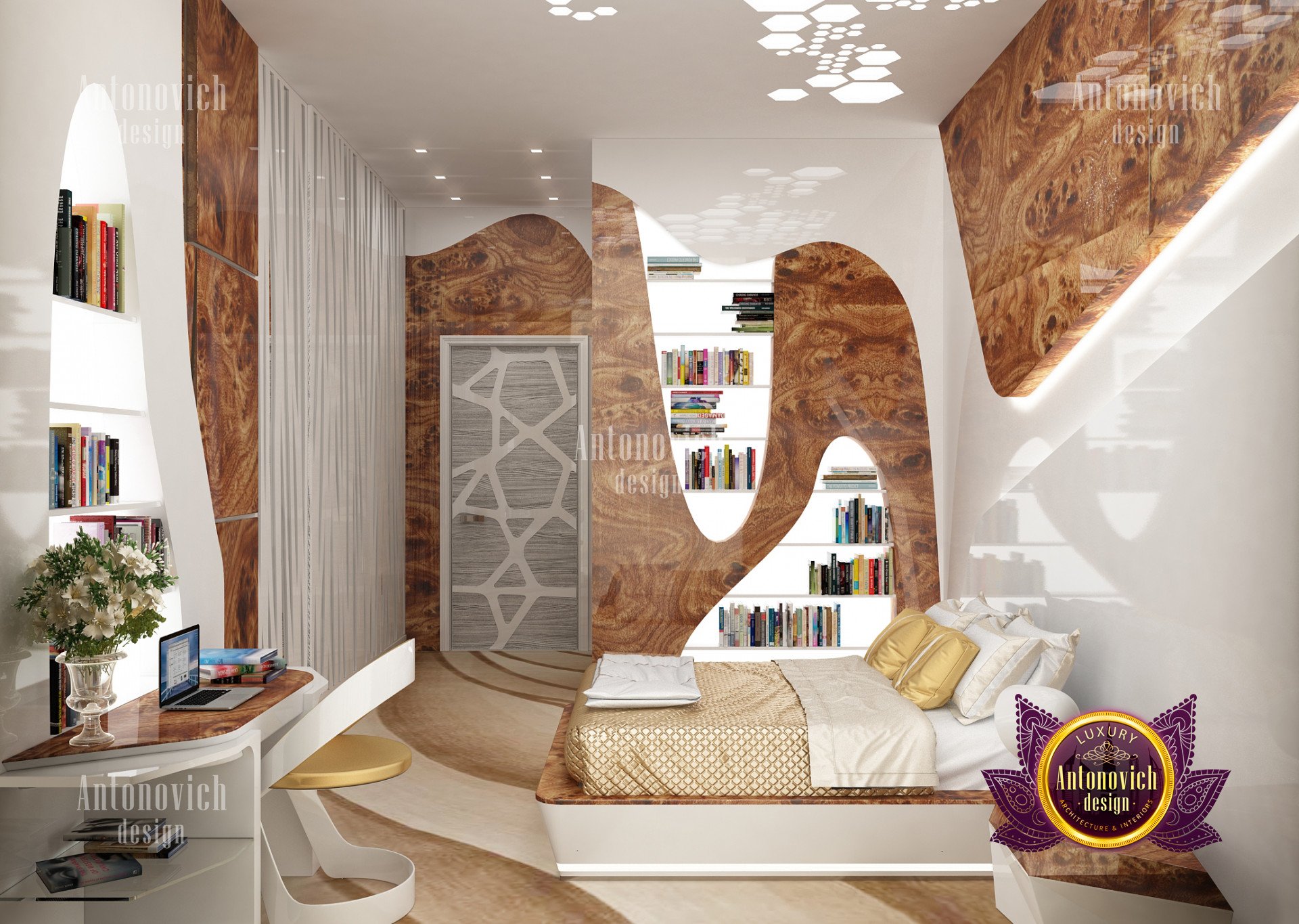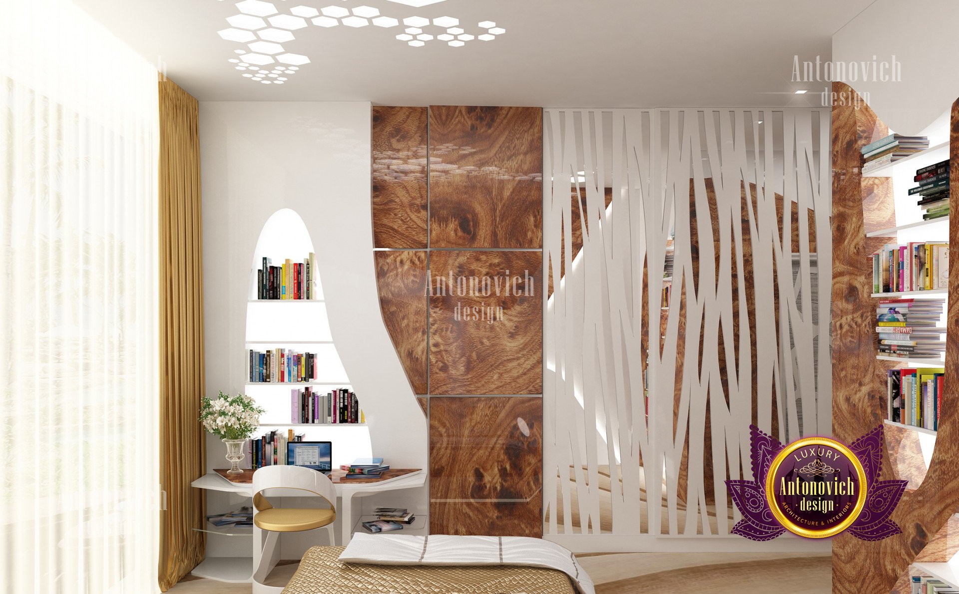 If you want a unique luxury bedroom interior design, this might be the perfect theme for you! The beautiful room has so much class, elegance, and uniqueness all over it. The highlight of this luxury bedroom interior design is the stunning walls. The shape is just so unique that you wont find it in other homes. Often times you will see simple white clean walls, but Luxury Antonovich Design has made sure that this luxury bedroom interior design has so much beauty and style into it. The curved wall accent is such a standout to this luxury bedroom interior design. The cool and interesting curves make this room a great one. On the left side, you will see that the walls were used as a book shelf. Everything about the room is so lovely.