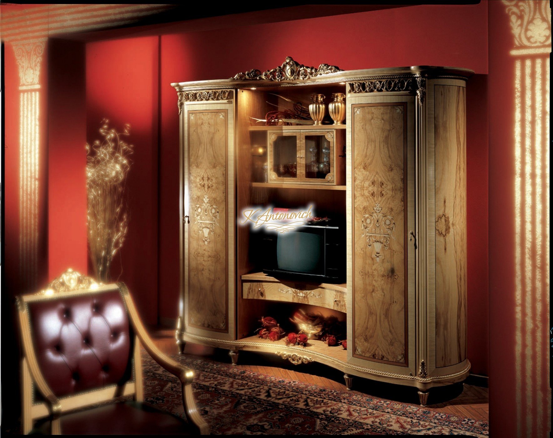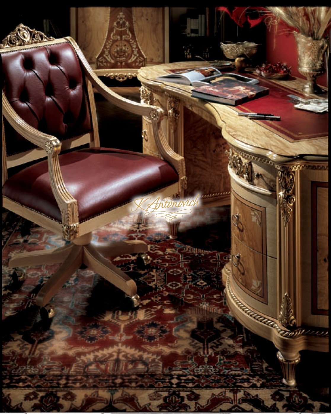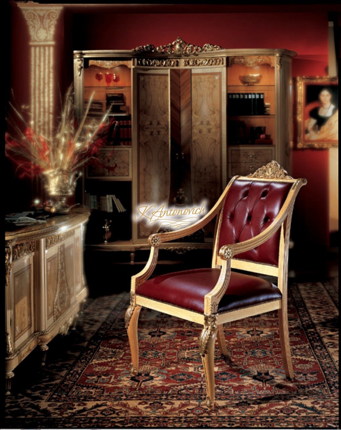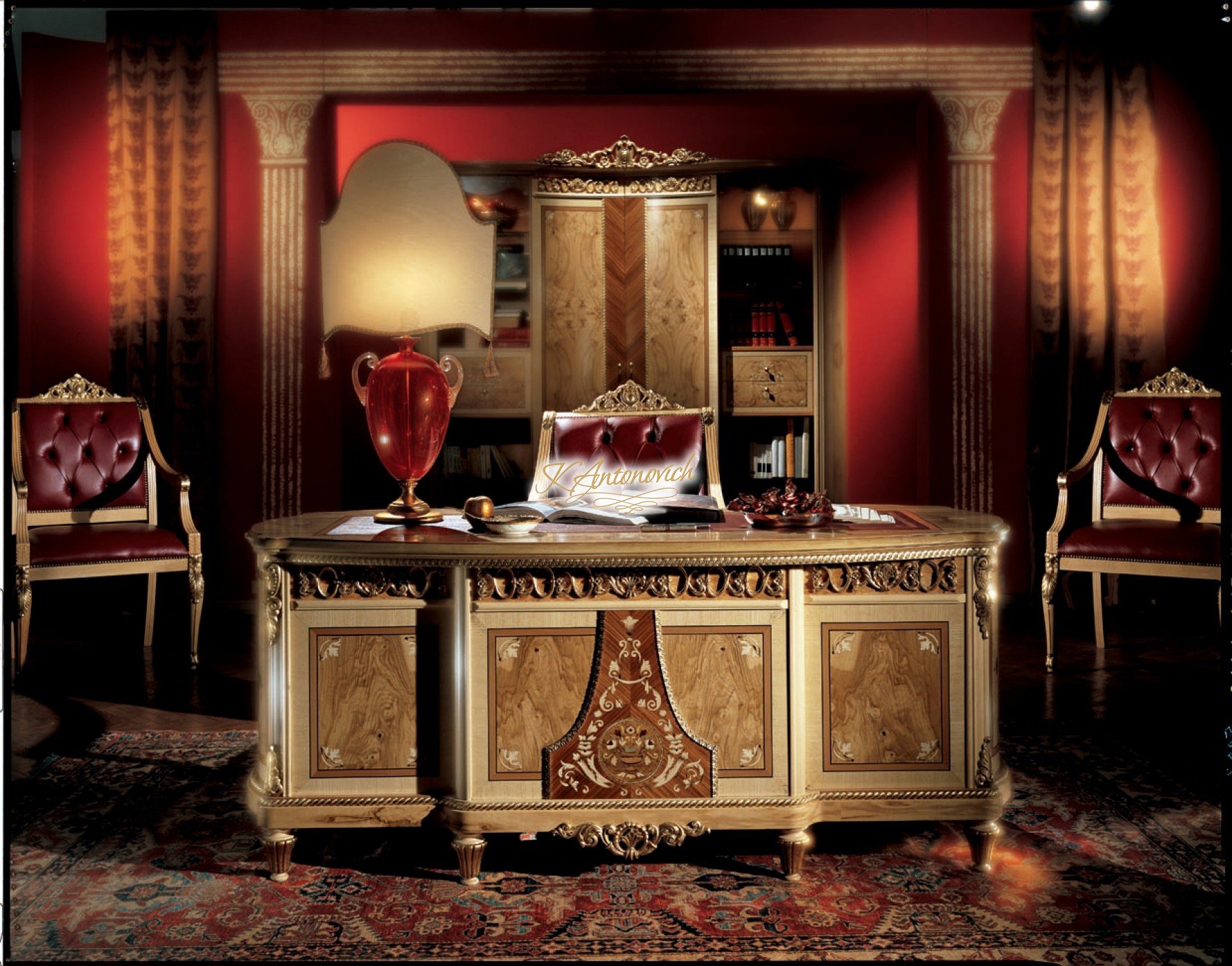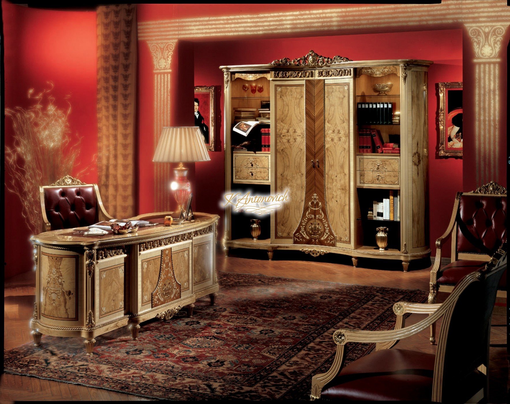 If you are looking to stay in Socci, theres Luxury Antonovich Design that can help you create your elegant interior design. The company wants you to feel fully elegant with the home office by having a beautiful and amazing interior design. Works of wood are what this luxury interior design is all about. One on the wall is a portrait of ancient designs, and on some walls is luxury furniture that you will only see in this luxury home office interior design. The office highlights the beautiful use of red and wood in the entire luxury home office interior design.