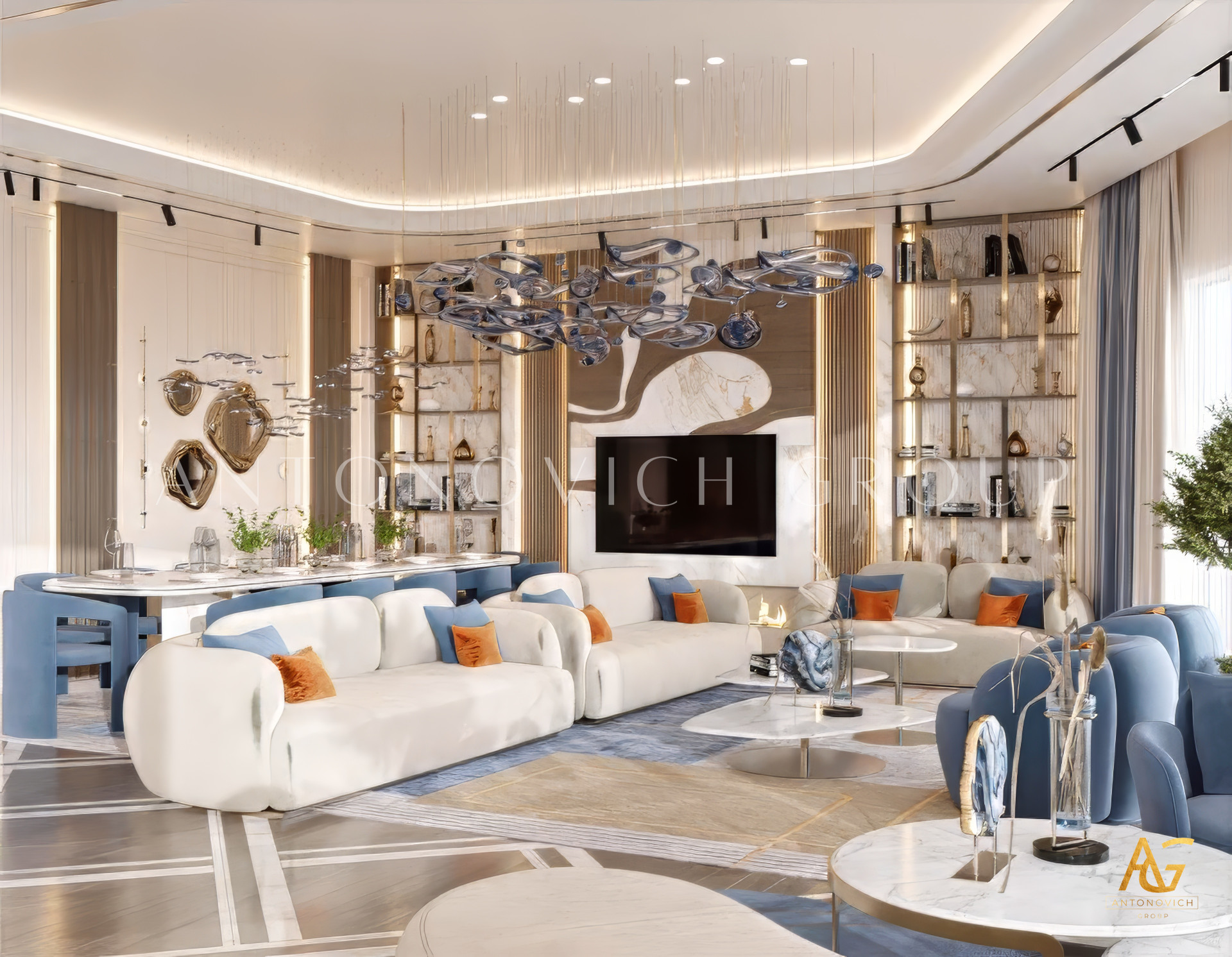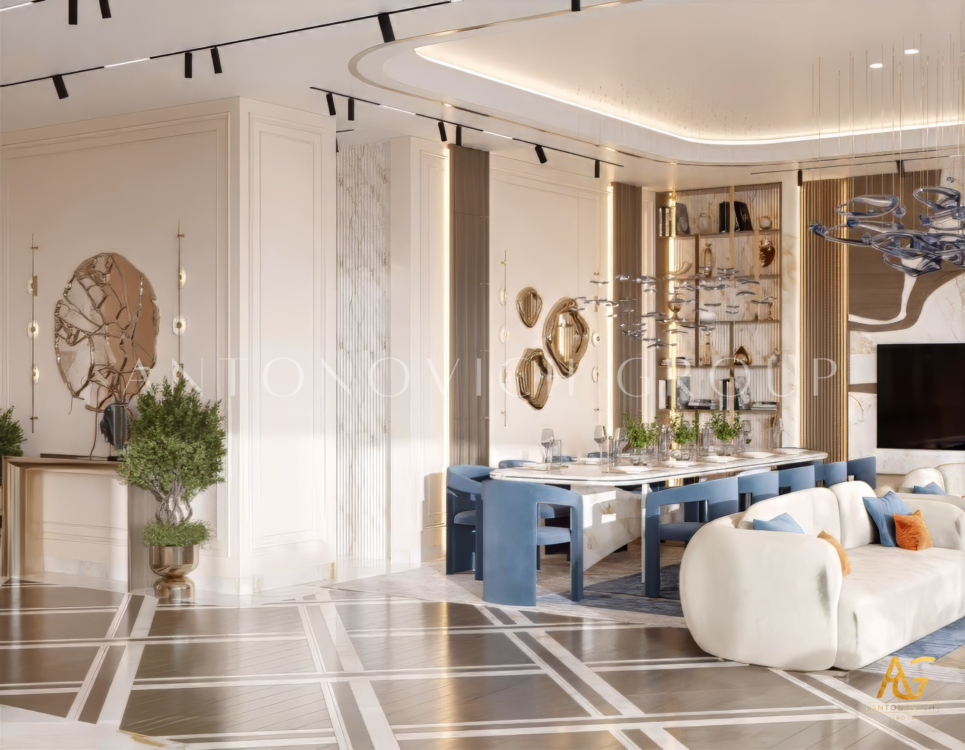 Spacious Gold and White Luxury Sitting Interior Design