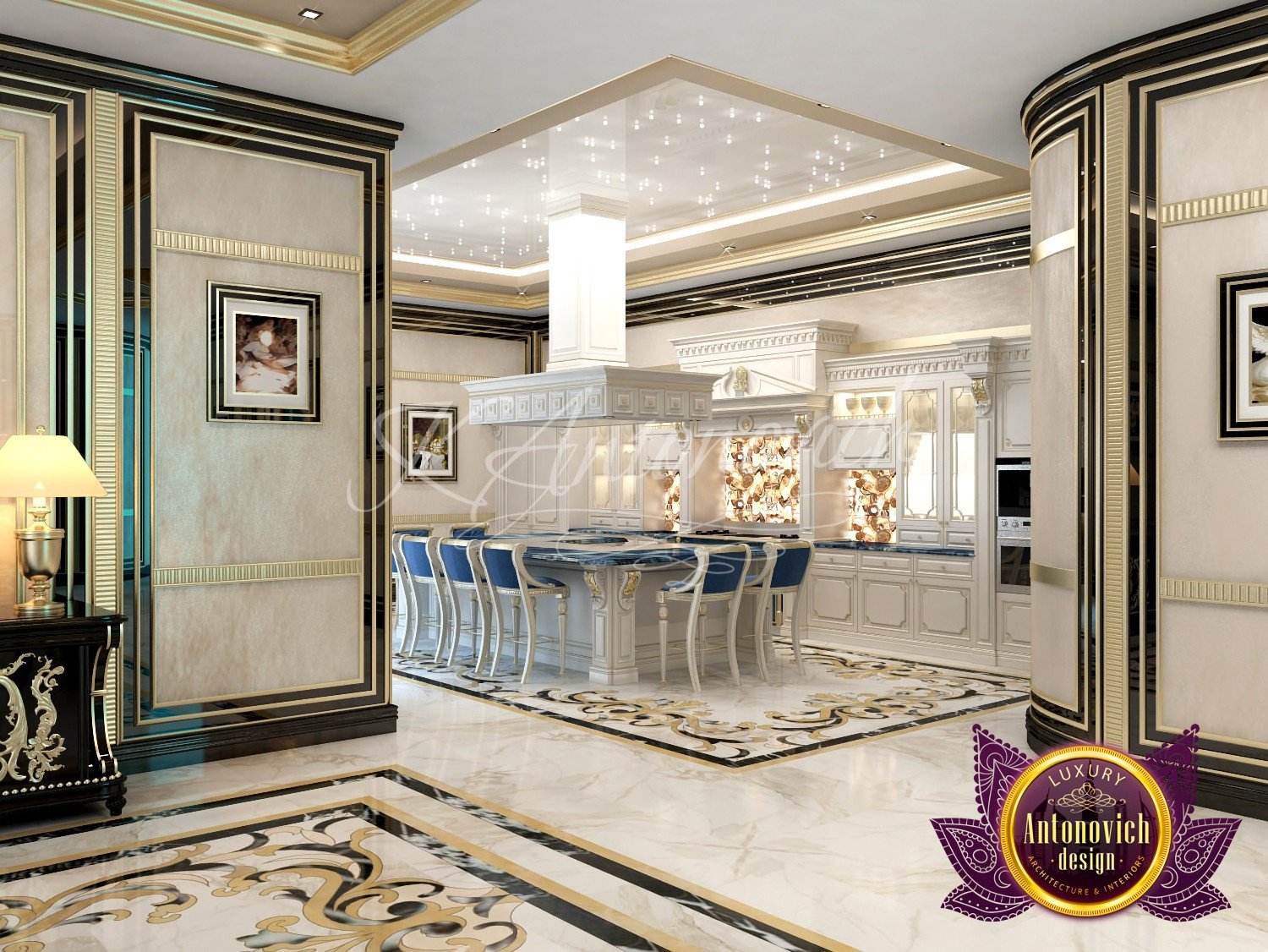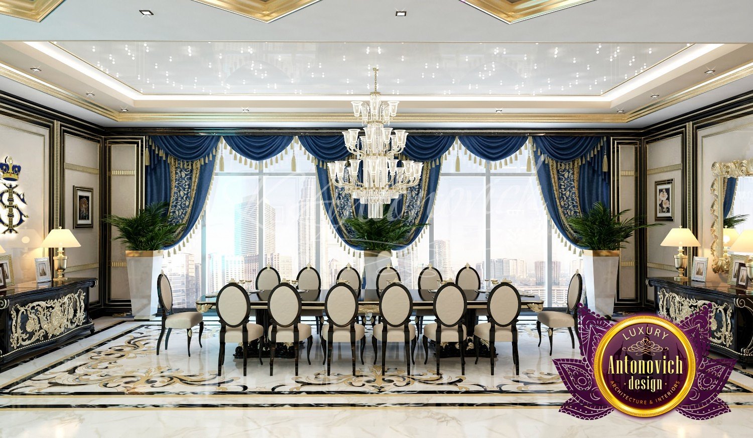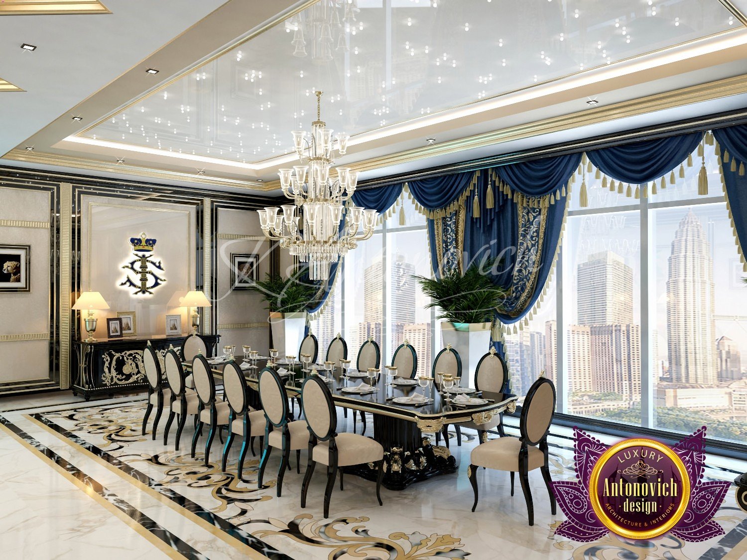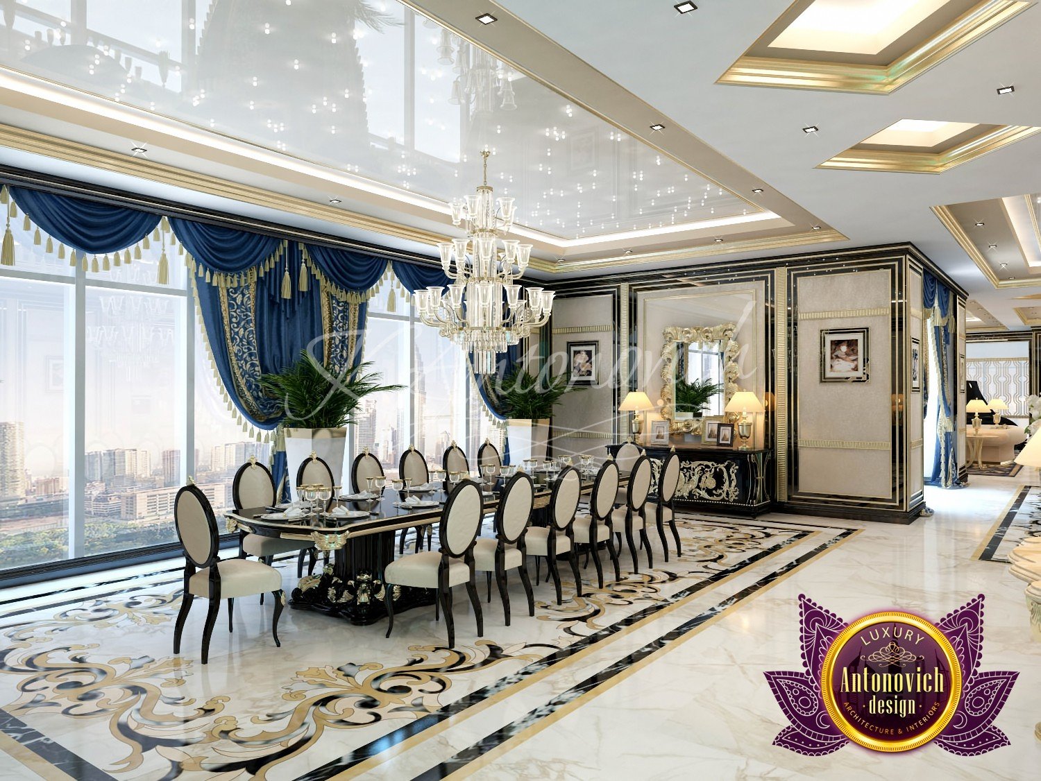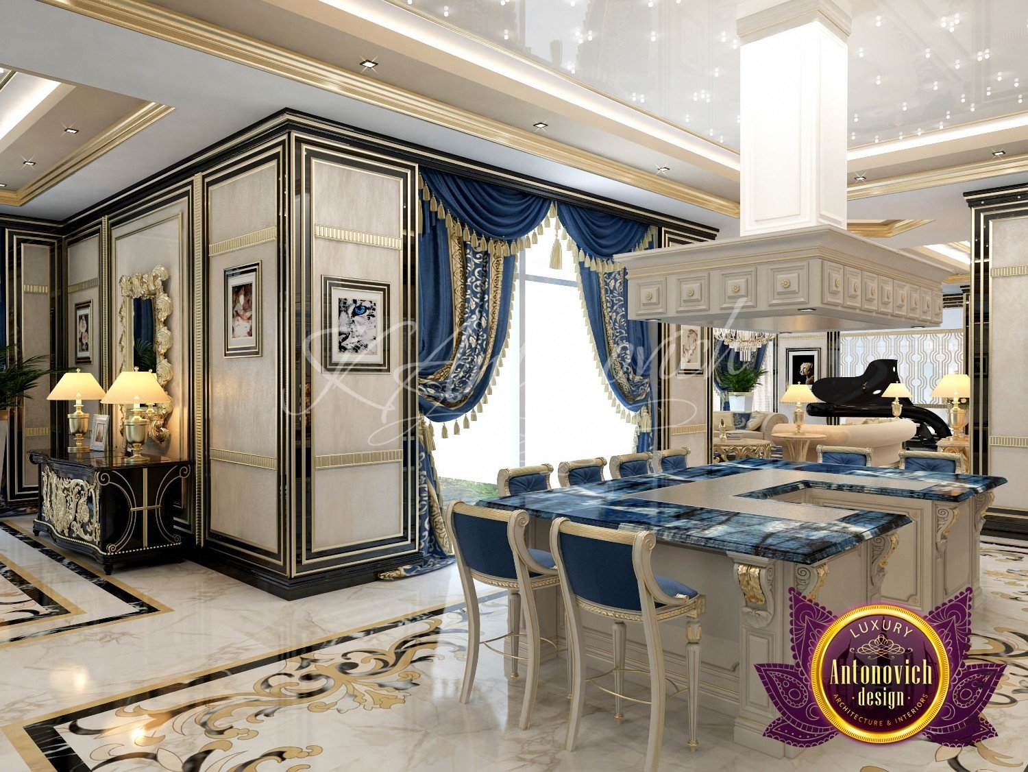 A spectacular home that is made for the richest in the city. Luxury Antonovich Design has elevated its service for this wonderful luxury apartment design. The spiral decor is very evident in the completion of the living room. The tiles and carpet are both integrated with stunning spiral designs which is the focal point of the room. The navy blue curtains give sophistication to the glorious apartment interior design; while the marble wall accents add to the glamorous feel of the luxury interior design. Chic luxury furniture was utilized all over the apartment. Its gold details also make the room one of a kind.