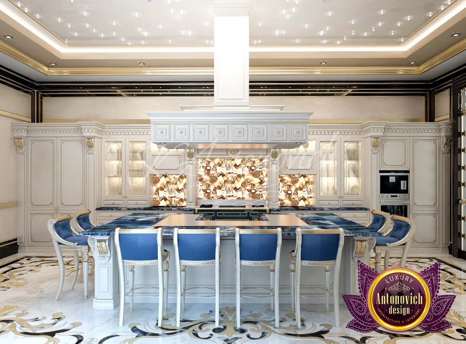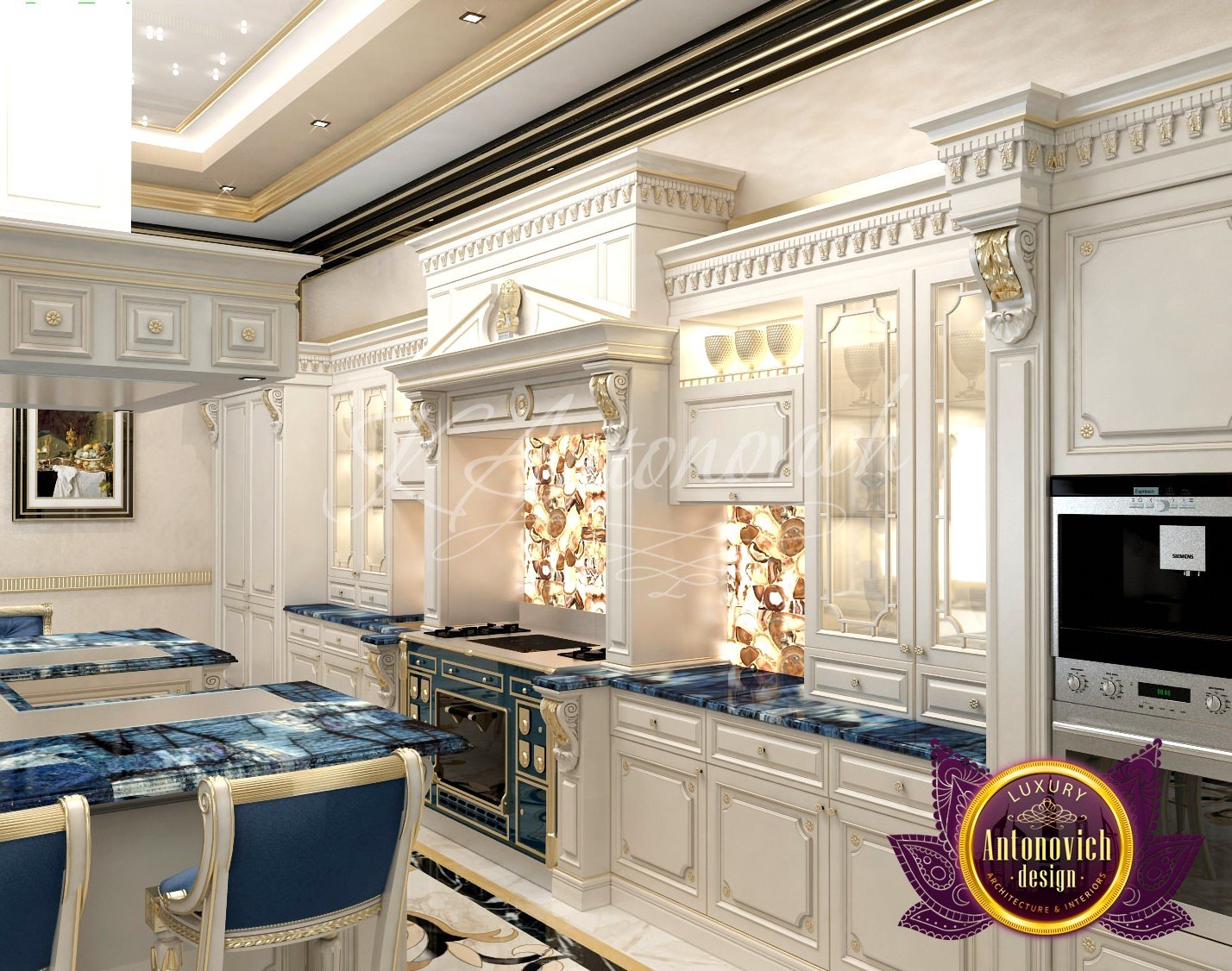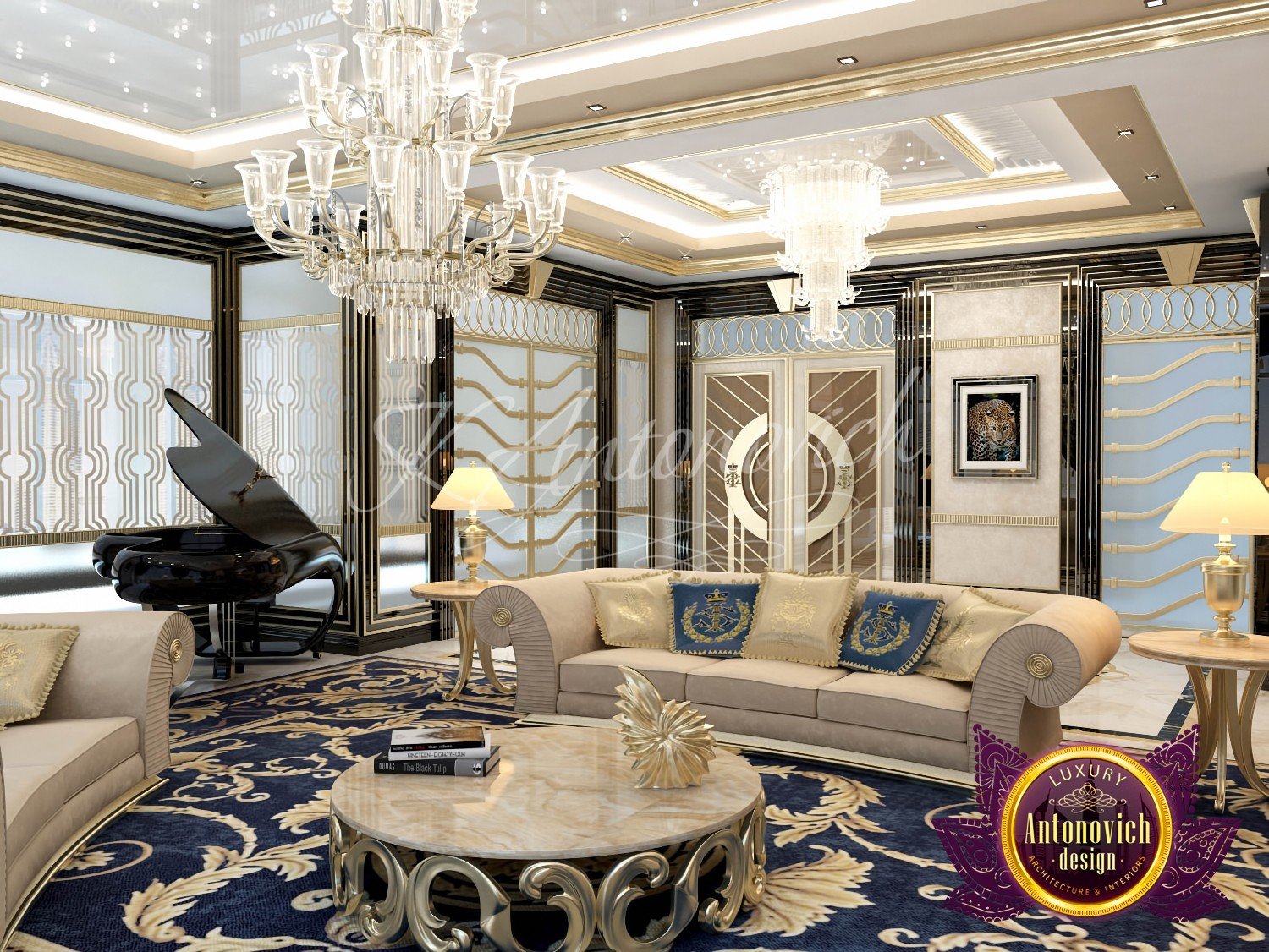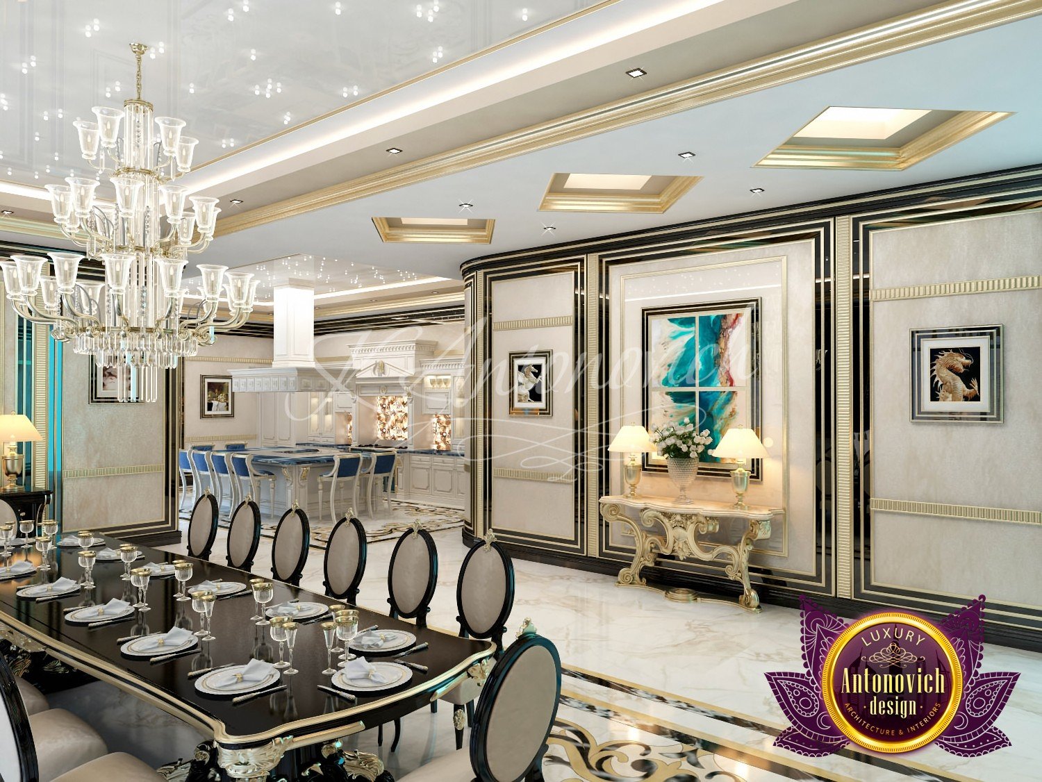 A spectacular home that is made for the richest in the city. Luxury Antonovich Design has elevated its service for this wonderful luxury apartment design. The spiral decor is very evident in the completion of the living room. The tiles and carpet are both integrated with stunning spiral designs which is the focal point of the room. The navy blue curtains give sophistication to the glorious apartment interior design; while the marble wall accents add to the glamorous feel of the luxury interior design. Chic luxury furniture was utilized all over the apartment. Its gold details also make the room one of a kind.