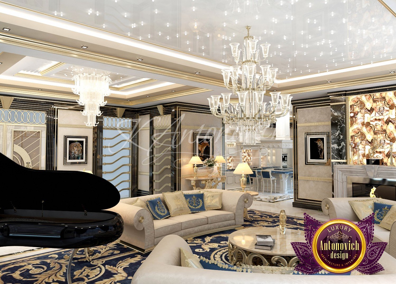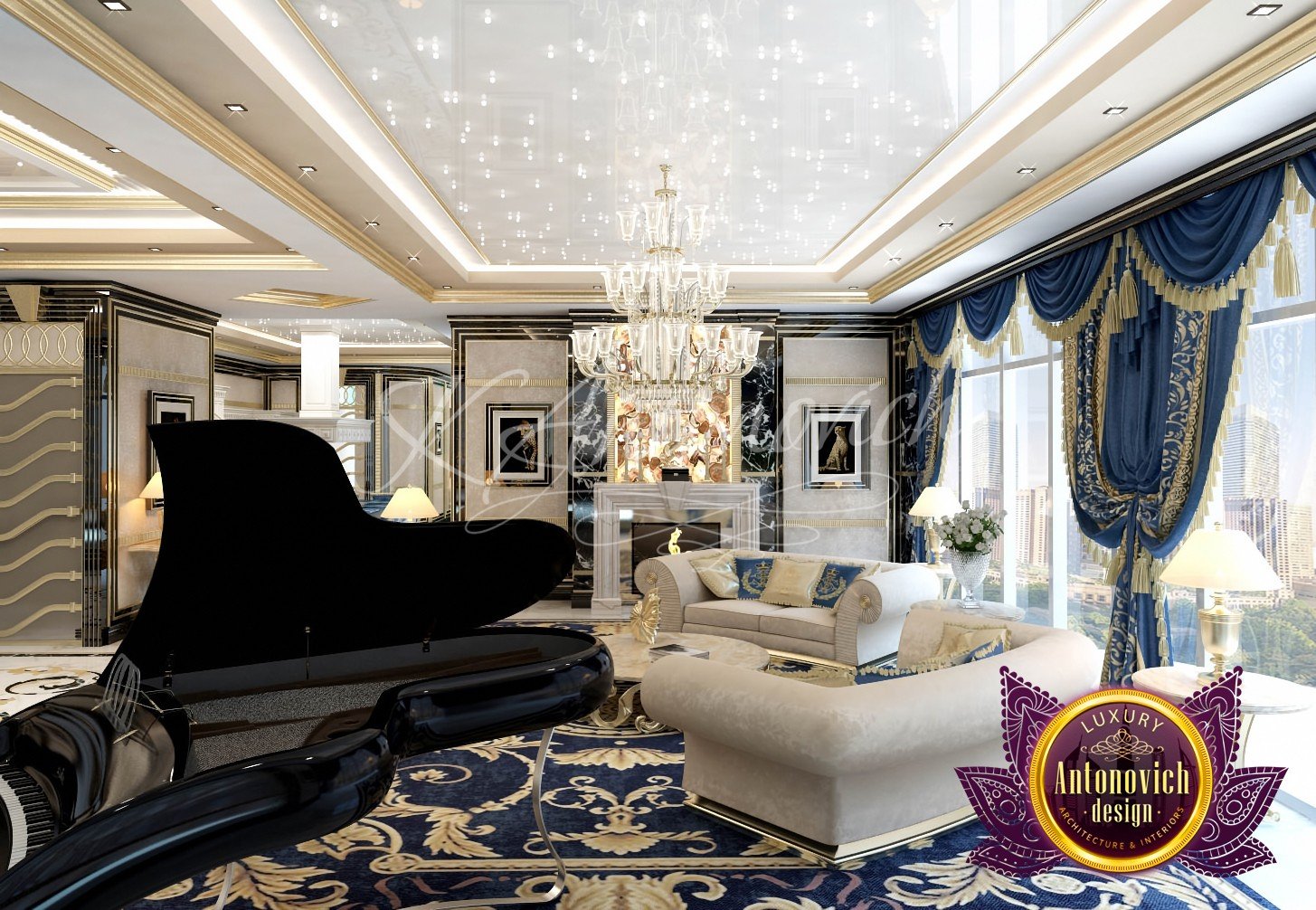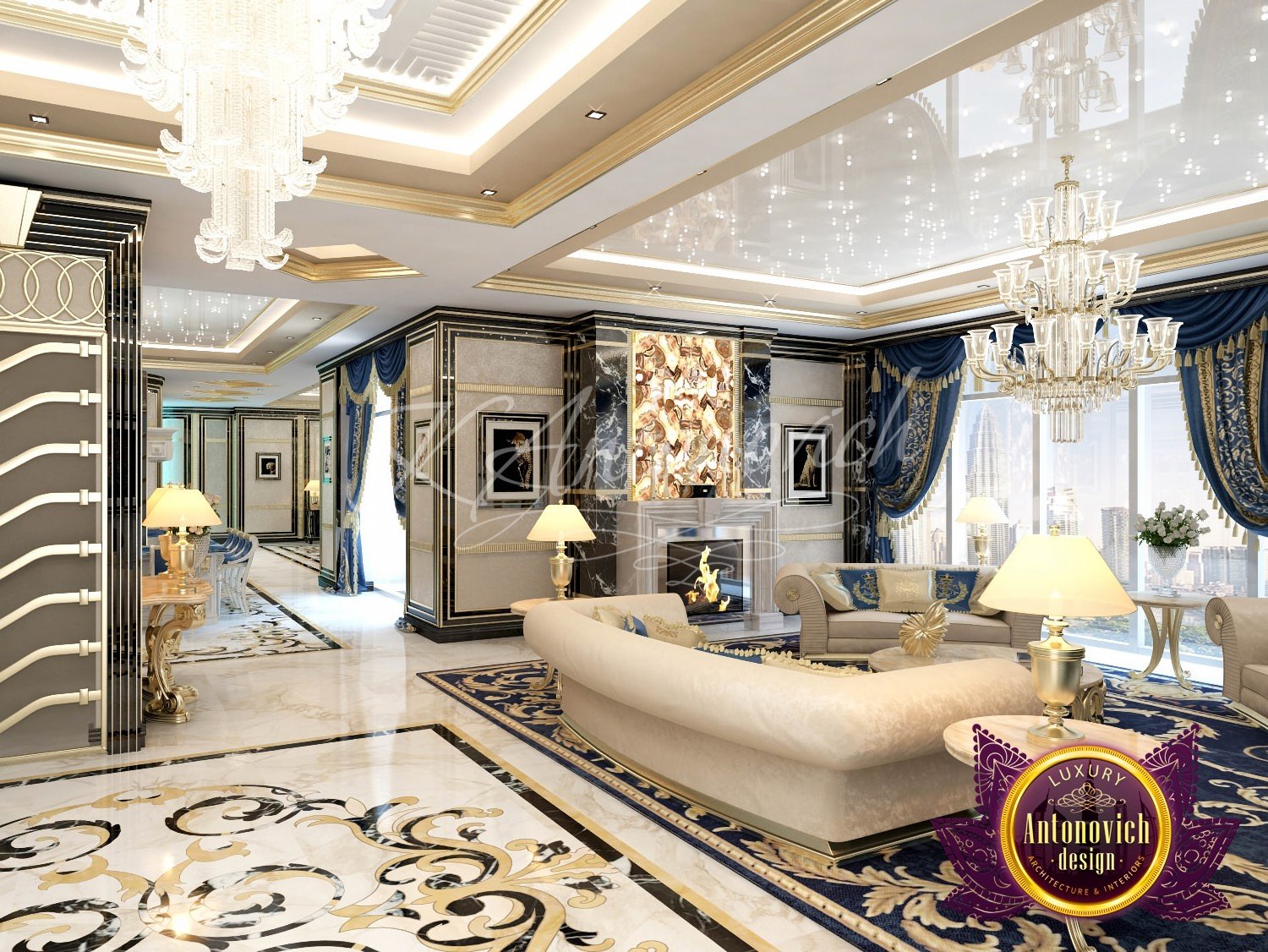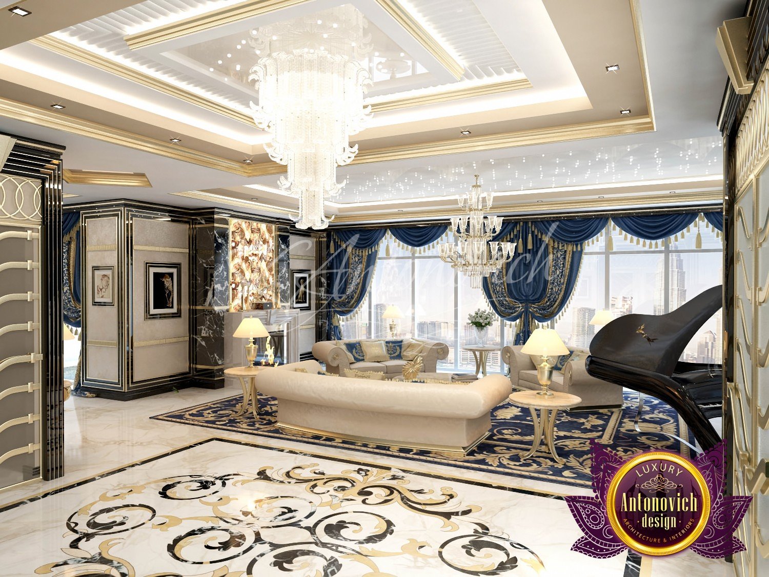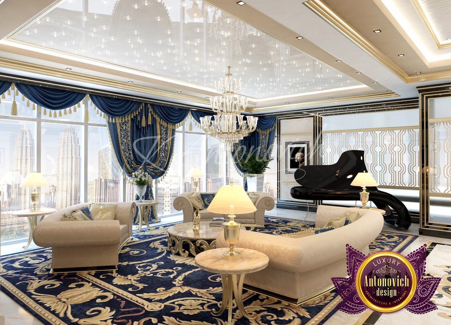 A spectacular home that is made for the richest in the city. Luxury Antonovich Design has elevated its service for this wonderful luxury apartment design. The spiral decor is very evident in the completion of the living room. The tiles and carpet are both integrated with stunning spiral designs which is the focal point of the room. The navy blue curtains give sophistication to the glorious apartment interior design; while the marble wall accents add to the glamorous feel of the luxury interior design. Chic luxury furniture was utilized all over the apartment. Its gold details also make the room one of a kind.