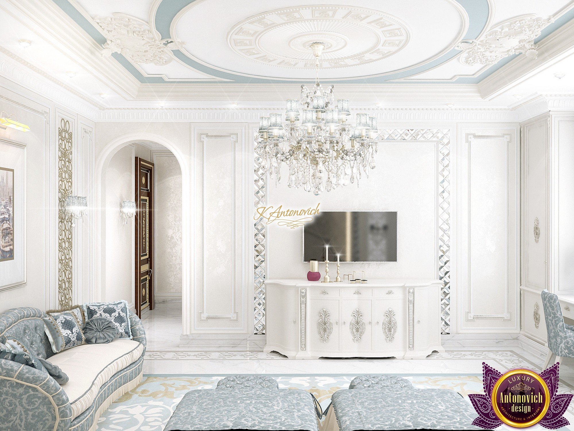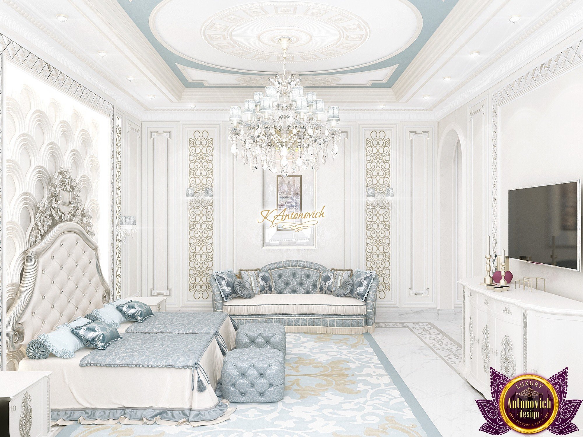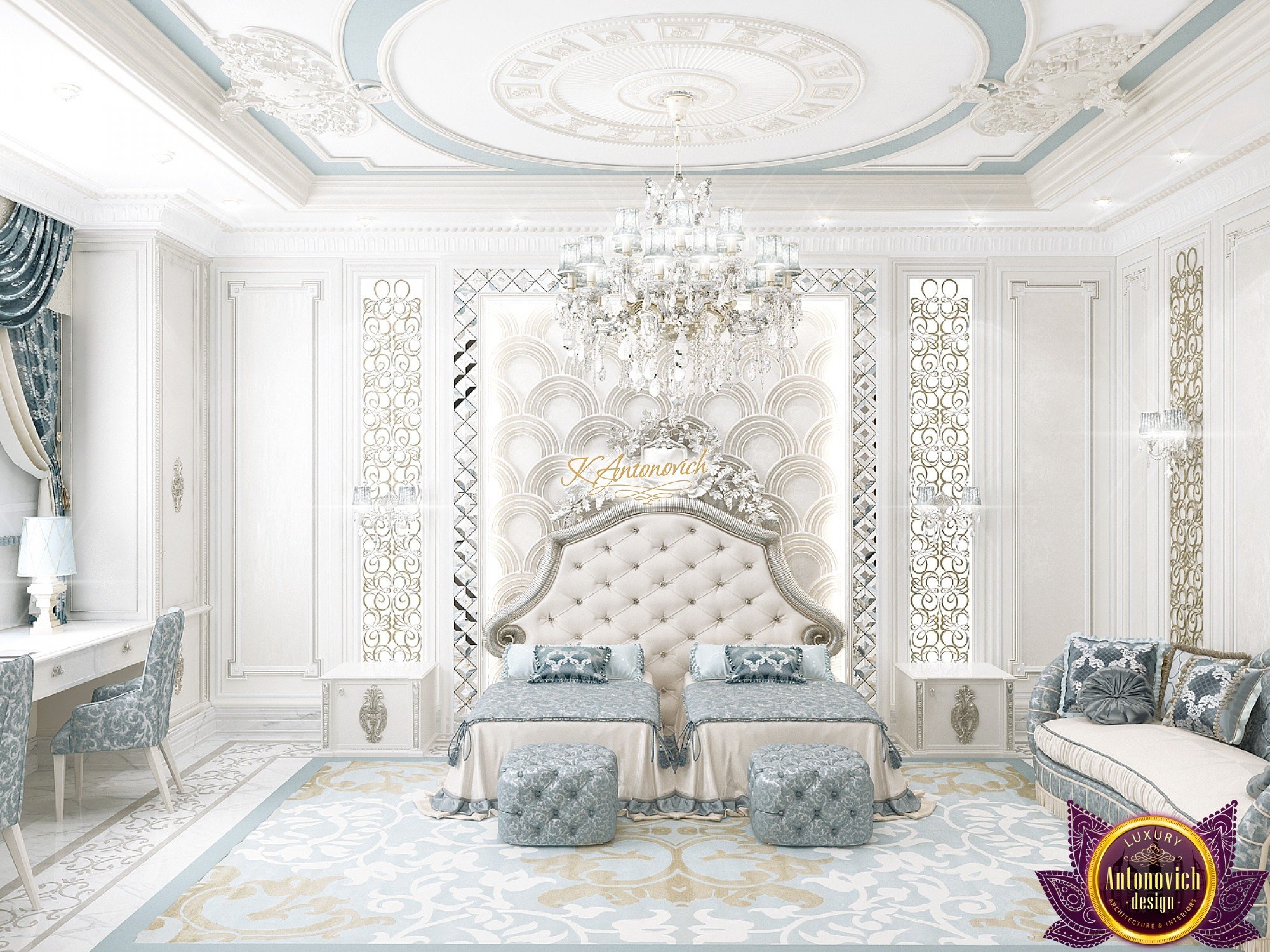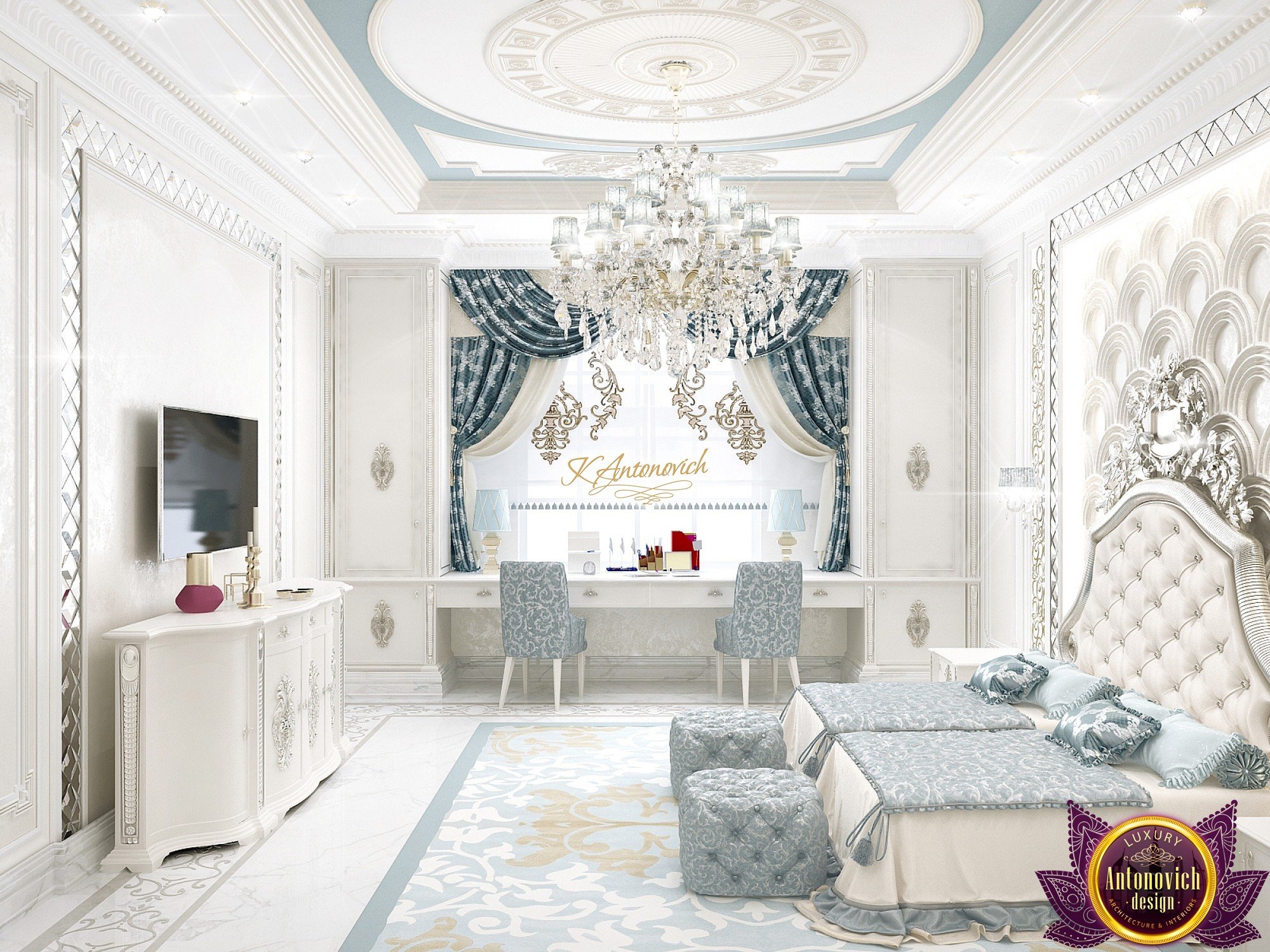 Sometimes beautiful bedrooms becomes something more than just a cozy place to relax.And this beautiful bedroom fully confirms these words. Interior design and fit out companies in Dubai Antonovich Design is high art. Chat with the owners of the luxury house has inspired us in the creation of this masterpiece. Their light character master bedroom design, open mind, and a keen understanding of beauty formed the basis for the luxury bedroom designs. The classic style and Art Deco style harmoniously intertwined and can no longer see the line between them. The pure shine of a beauty is based on the original decor, accent on lighting, and light colors scheme. The epicenter of beauty has become a luxurious bed with high headboard and wall decor behind it. The headboard is decorated with soft panel of white genuine leather with deepenings in a form large diamonds. Openwork carved decoration handmade of silvery tones looks great on the background of a 3D volumetric decor panel on the wall. Geometric ornament looks volumetric, due to the additional illumination line. To make even more vivid wall decor, interior designers used mirrored panels with beveled and insertion of forged brass ornaments with internal illumination. To soften this radiance and shine, the rest of the walls are decorated with stucco in shades of pearl. The floor of white marble is almost completely covered with soft natural carpet in pale blue shades. The decor of the ceiling is worthy of the Royal Palace. Beautiful stucco work and a combination of white and blue color became a beautiful and bright accent in the interior of a master bedroom designs from interior design fit out companies Dubai.