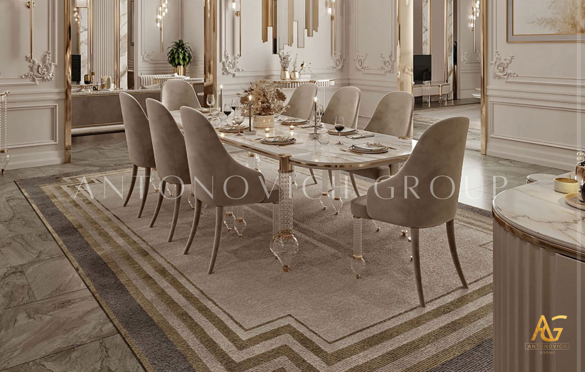 This is without a doubt one of the most effective ways to give your luxury dining interior design Abu Dhabi a makeover with a little, simple gesture. Gold flatware is still popular in luxury dining interior design UAE because of its high sheen metallic finish, which screams "high-end." If showy metallics in the luxury dining interior design UAE arent your style, try black flatware instead. With a somber, mysterious edge, youll receive the same opulent look and feel. Rugs have always been an important aspect of house design for cultures all over the world, both traditional and contemporary. Today, were finding that rugs dont lose any of their room-defining force when theyre used in the luxury dining interior design UAE. Wallpaper is a lovely addition to any area that may make a significant difference. If you want to make a dramatic high-end statement with your luxury dining interior design Abu Dhabi, the perfect wallpaper can be all you need. The captivating wallpaper design in this luxury dining interior design Abu Dhabi draws attention to every other feature in the room. You may even go a step further by creating window shades with a fabric design that matches the wallpaper to complete the look.