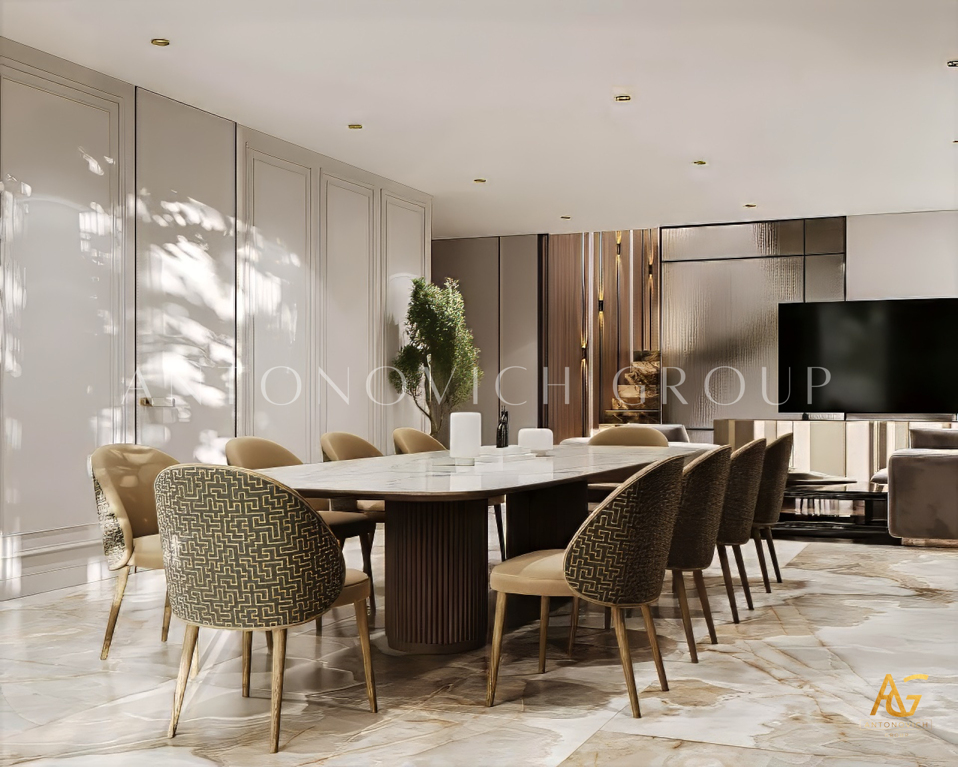 In luxury interiors, furniture is not just functional — it defines style. Antonovich Group offers bespoke furniture production, designing pieces exclusively for each project. Whether it’s a sleek modern sofa, a handcrafted coffee table, or customized shelving units, each piece reflects the finest quality and craftsmanship. These unique furnishings ensure that no two living rooms are alike, giving clients a personalized interior that embodies their individuality. Complementing the furniture are customized decorative elements such as wall paneling, flooring solutions, and hand-picked accessories. Every detail is carefully curated, making the living room an epitome of refined taste and sophistication.