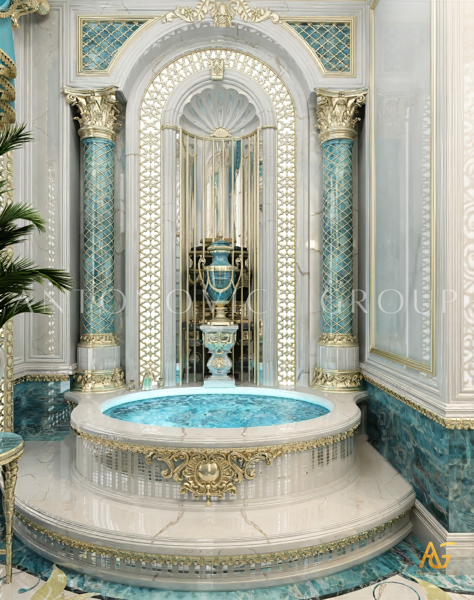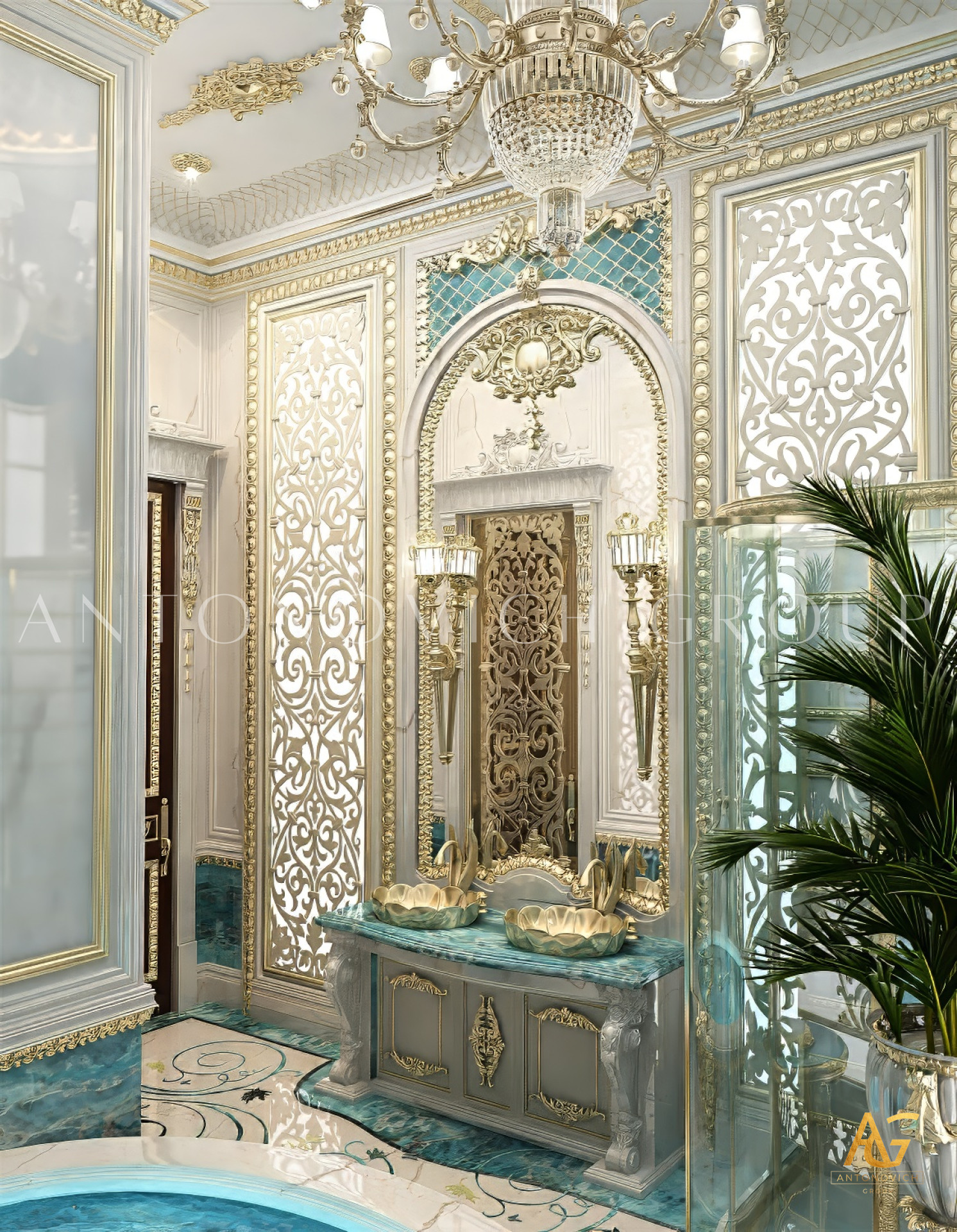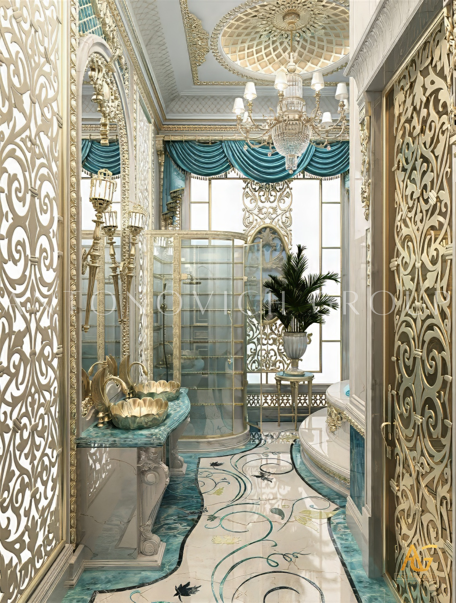 - Luxurious wall and floor finishes in marble, stone, or high-end porcelain.