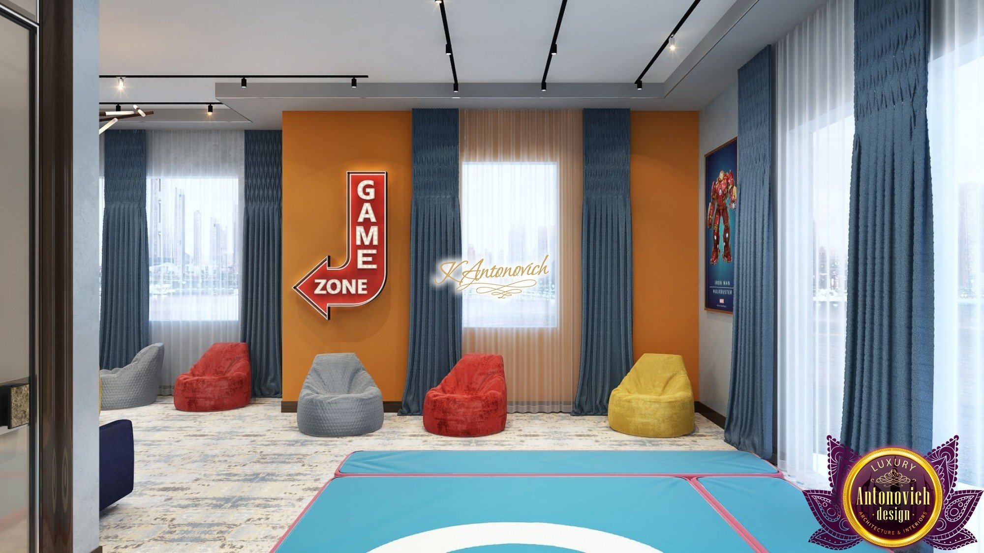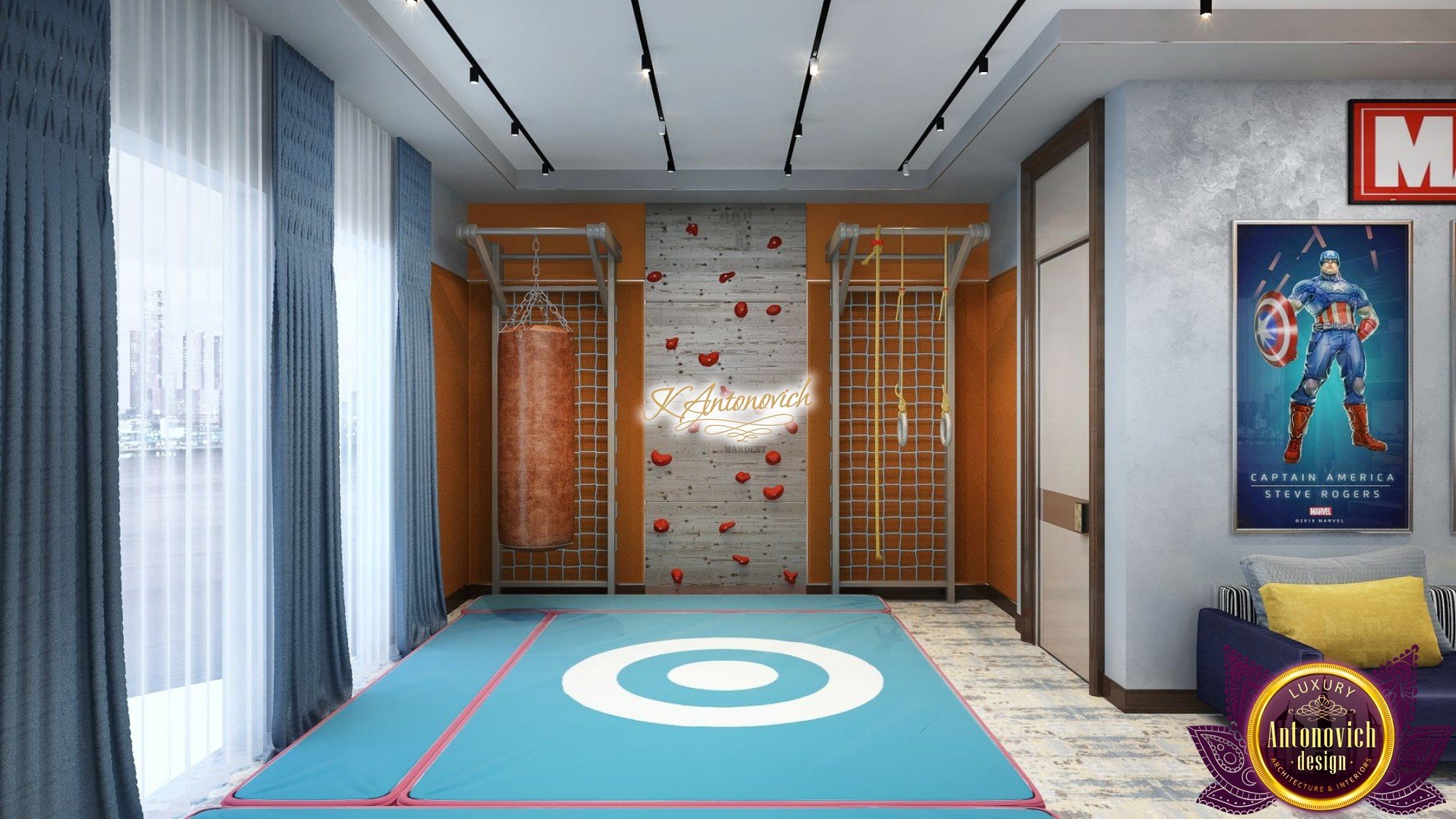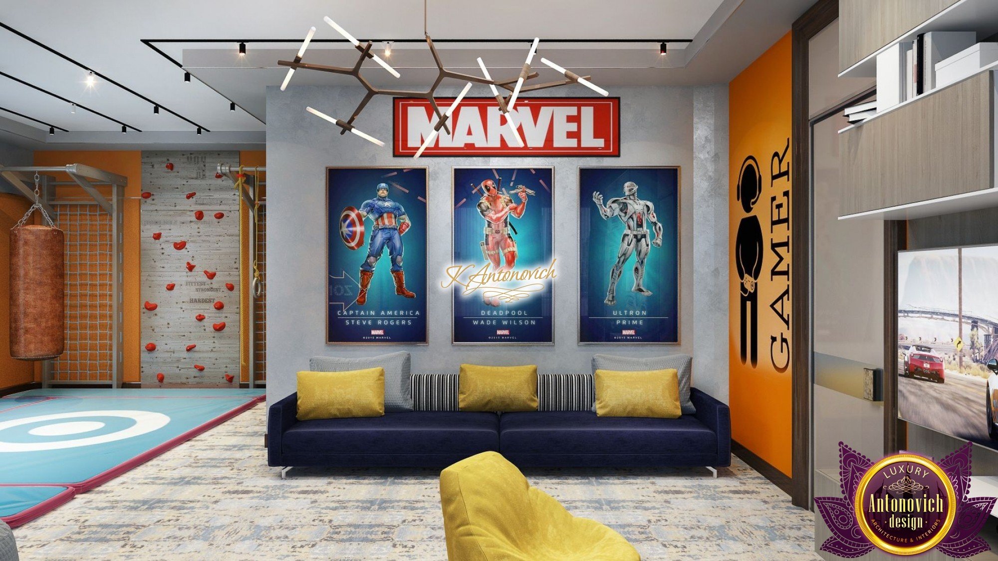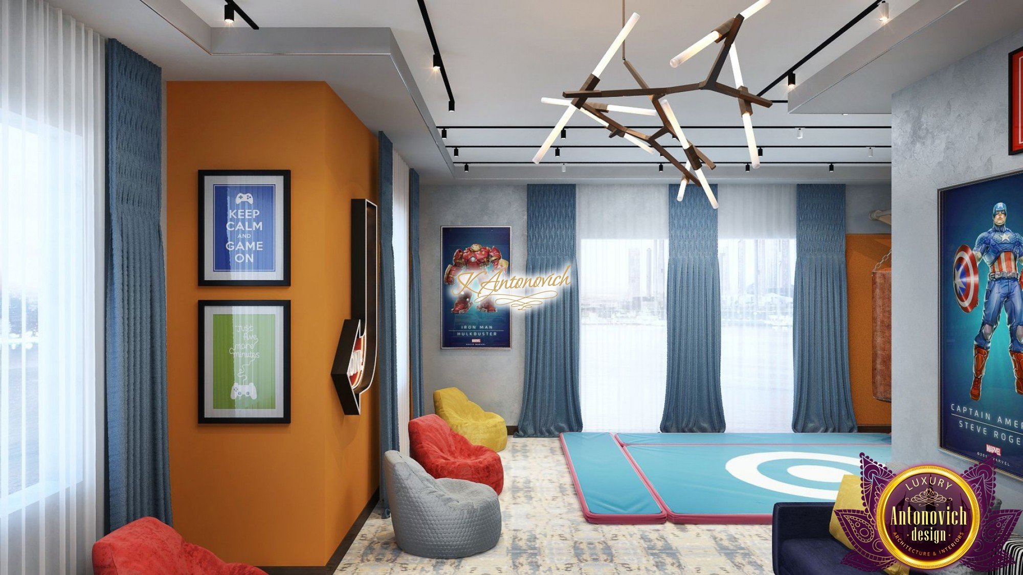 This design of the teenager's room perfectly reflects the dynamic character of the child. The interior designers of the studio Luxury Antonovich Design created a bright room design project for a teen boy in a modern style. Interiors for children aged 12-16 years is a separate direction, which largely depends on the characteristics of child psychology. It is in this ages, the process of transition from childhood to adulthood. It is very important to create the most comfortable space for the child. Here, every detail of the decor, colors choice and lighting plays a huge role.The design of the teenager's room filled the space with bright colors and at the same time the warmth of home comfort. The color palette is dominated by a blue and orange tinge.To slightly soften the bright colors, interior designers complement the palette of hues with subdued gray tones in the décor of the walls and floors. The interior design of the teenager's room fine emphasizes the features of the architectural layout.The room is clearly divided into a play area and a rest area. In the playing area, interior designers provided a zone for sports.At this age, the child has a lot of energy, which should be used in sports exercises. The interior design of the teenager's room became an exact continuation of the character of the child and became his ideal environment. In the interior, there are such interesting moments as the original ceiling decor with modern high-tech chandeliers. Interior design for a teenager is aesthetically perfect, which is very important for the education of good taste from an early age.Maximum comfort provides a large number of soft armchairs. This is provided so that he can invite your friends to visit and treat them with comfort. The modern design of the teenager's room is based on the use of both natural materials and new technologies. And the design of a room for a teenager boy is usually making in a modern style.