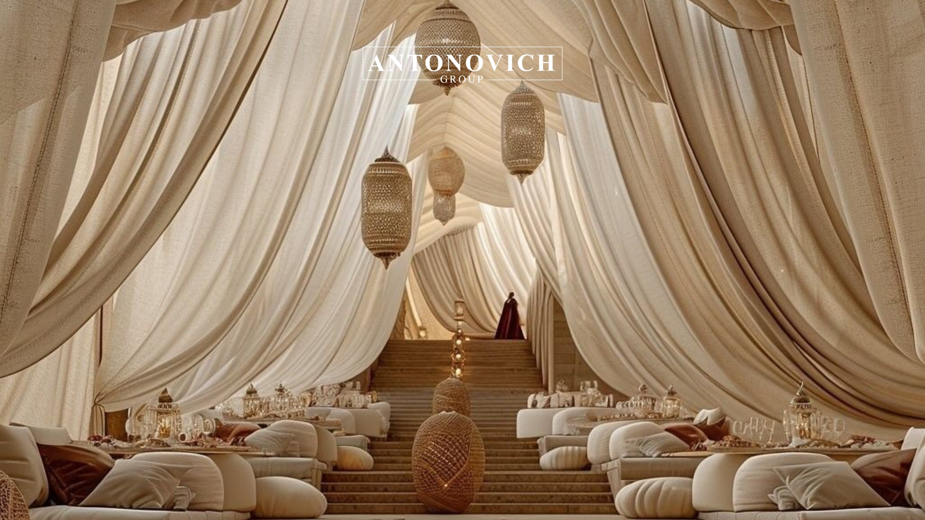 Antonovich Group also specializes in seasonal tent installations for special occasions such as Ramadan, Eid, weddings, and private events. These structures are designed with rich cultural motifs, arabesque patterns, and ceremonial seating arrangements.