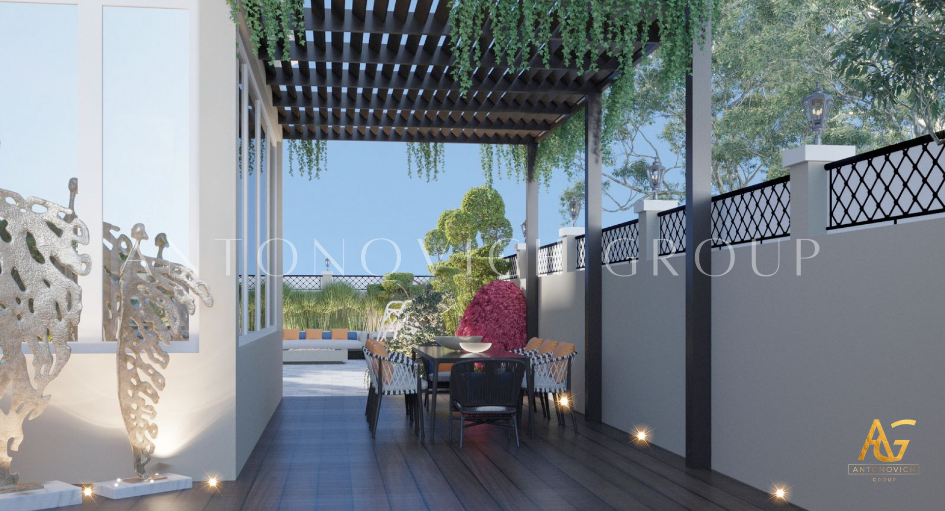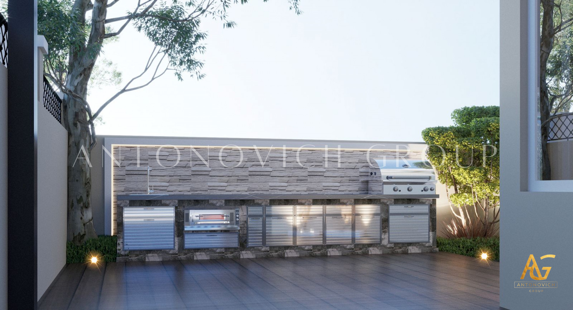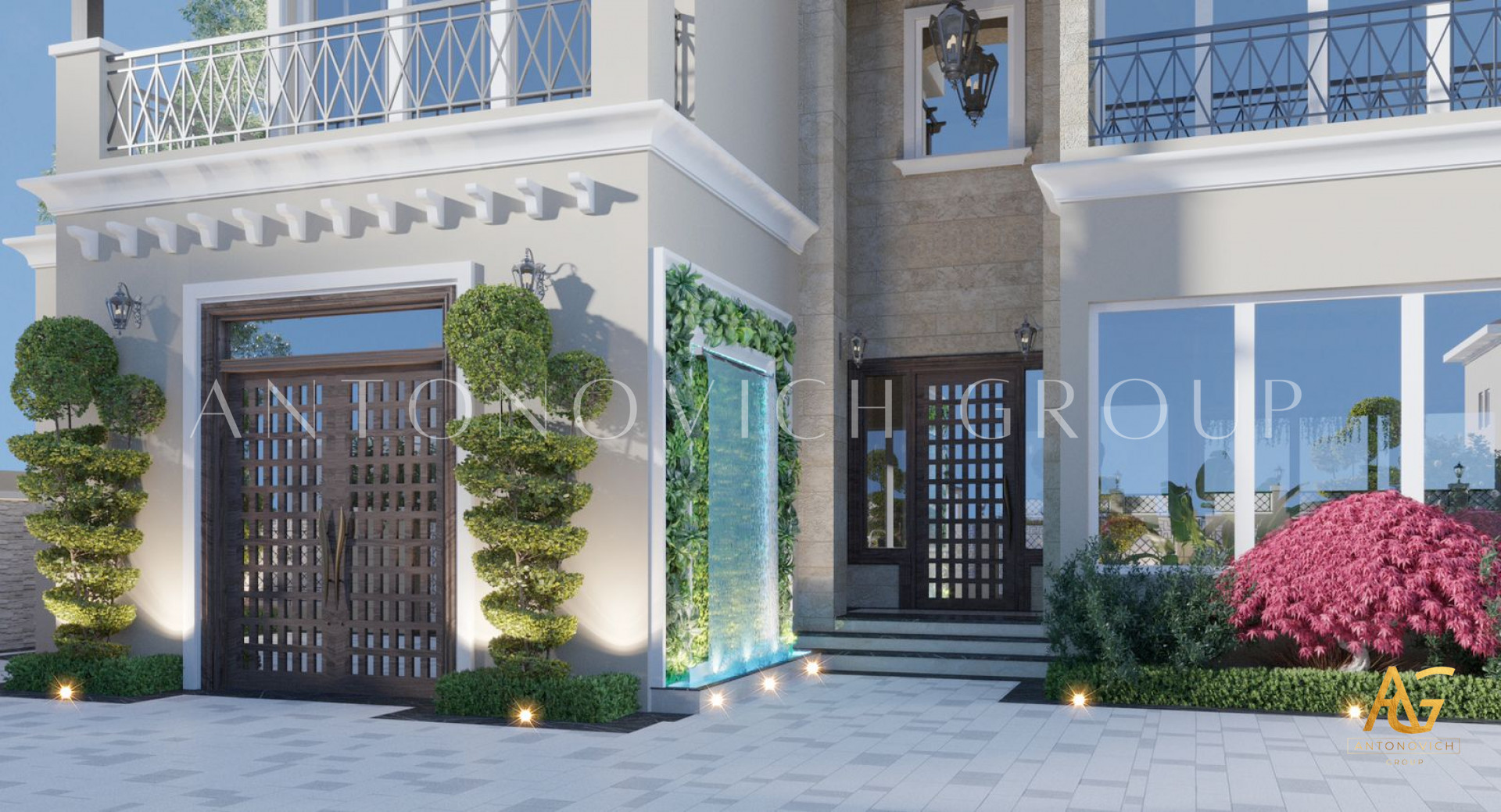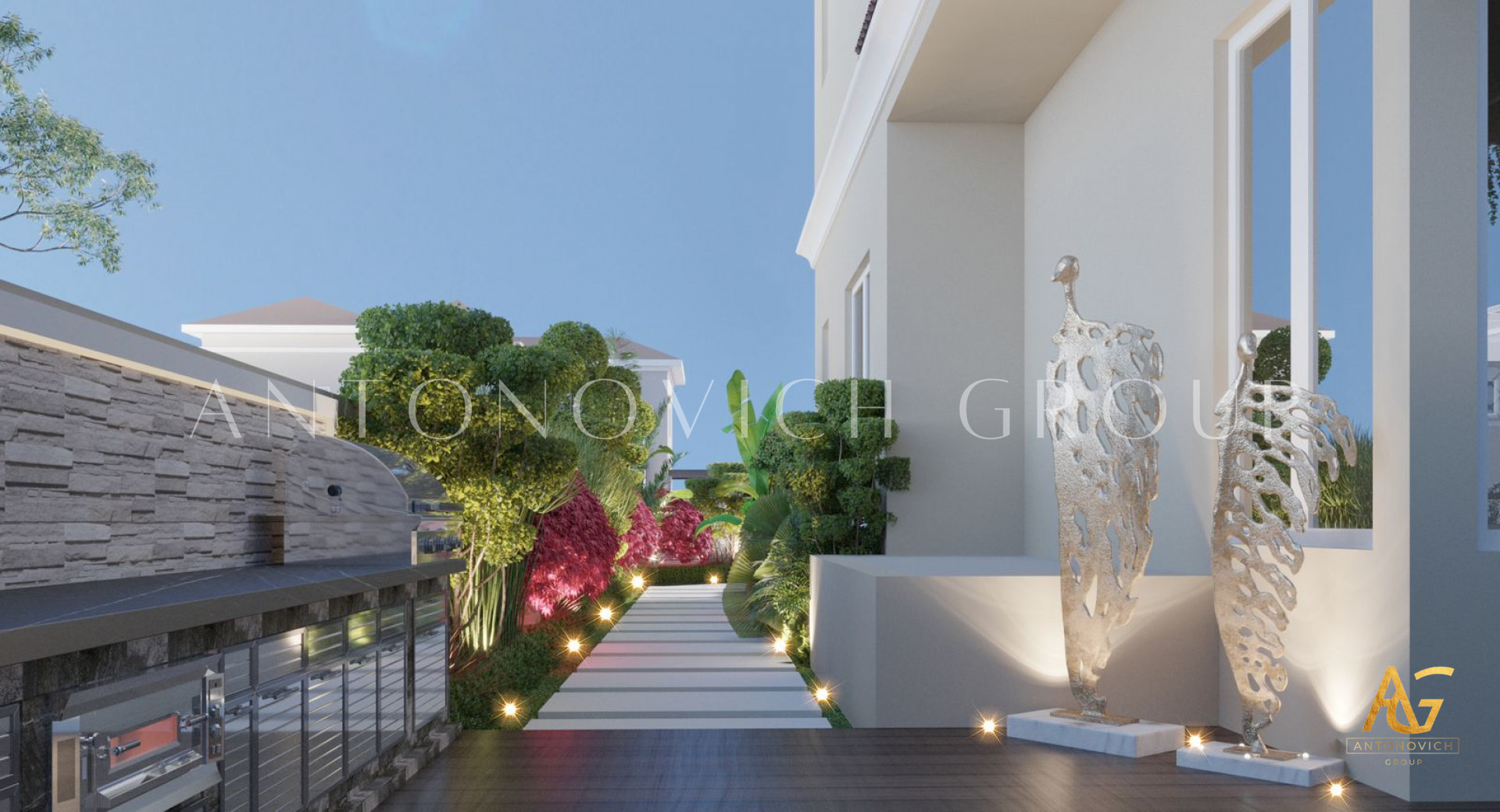 The Aldea is a popular residential area with a calm and comfortable ambiance. This is a peaceful corner of heaven where you may relax away from the hustle and bustle of the city. The region has beautiful villas that are surrounded by natural nature. There are several buildings available for family gatherings. The BBQ area is a terrific place to have fun. Inside, many villas include private pools and beautiful gardens. The Aldea contains everything a person may want, from stores to clinics. This Villa Exterior Design has been designed and developed by Antonovich Group the form its original plain and typical exterior features. The team has leveled up each exterior detail that consists of a spacious Spanish-inspired villa set against the backdrop of a desert landscape. Our team has performed a ranch-style with lush green courtyards inside. The exterior is surrounded by greenery and there are well-groomed walking paths throughout the landscape area.