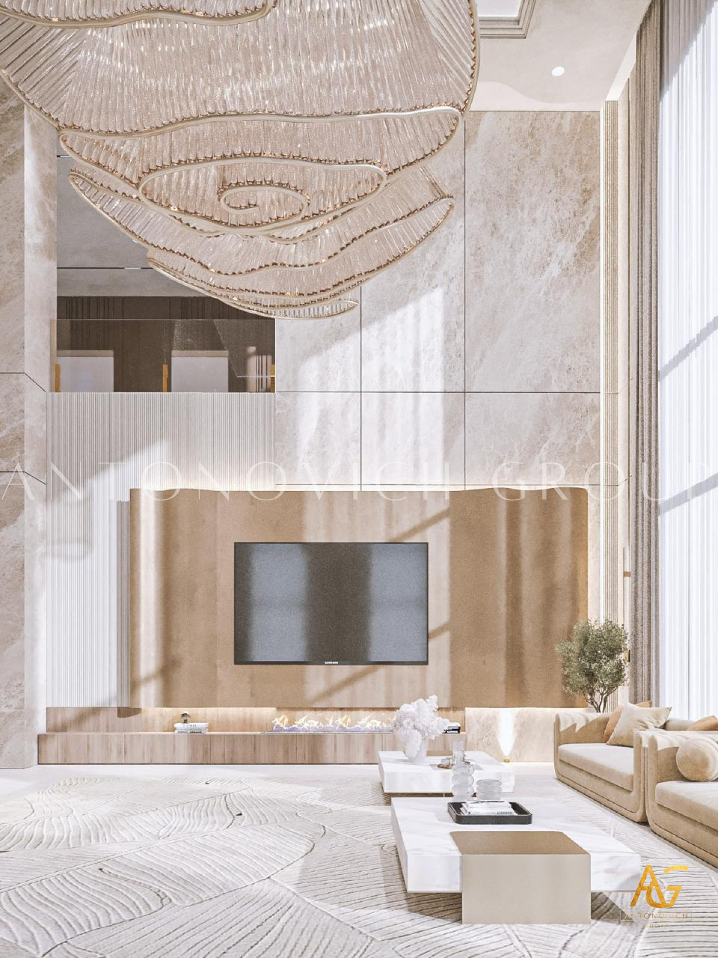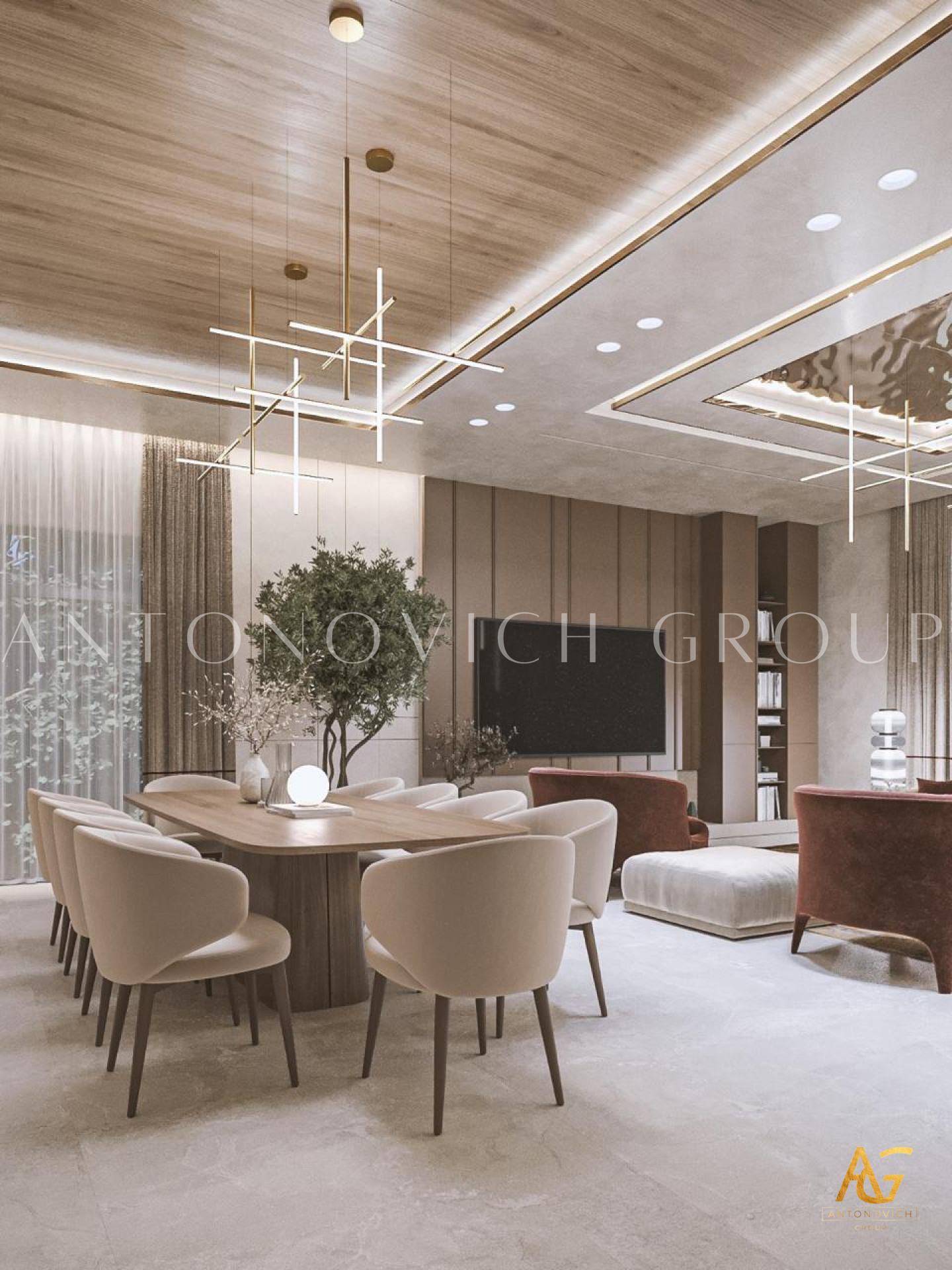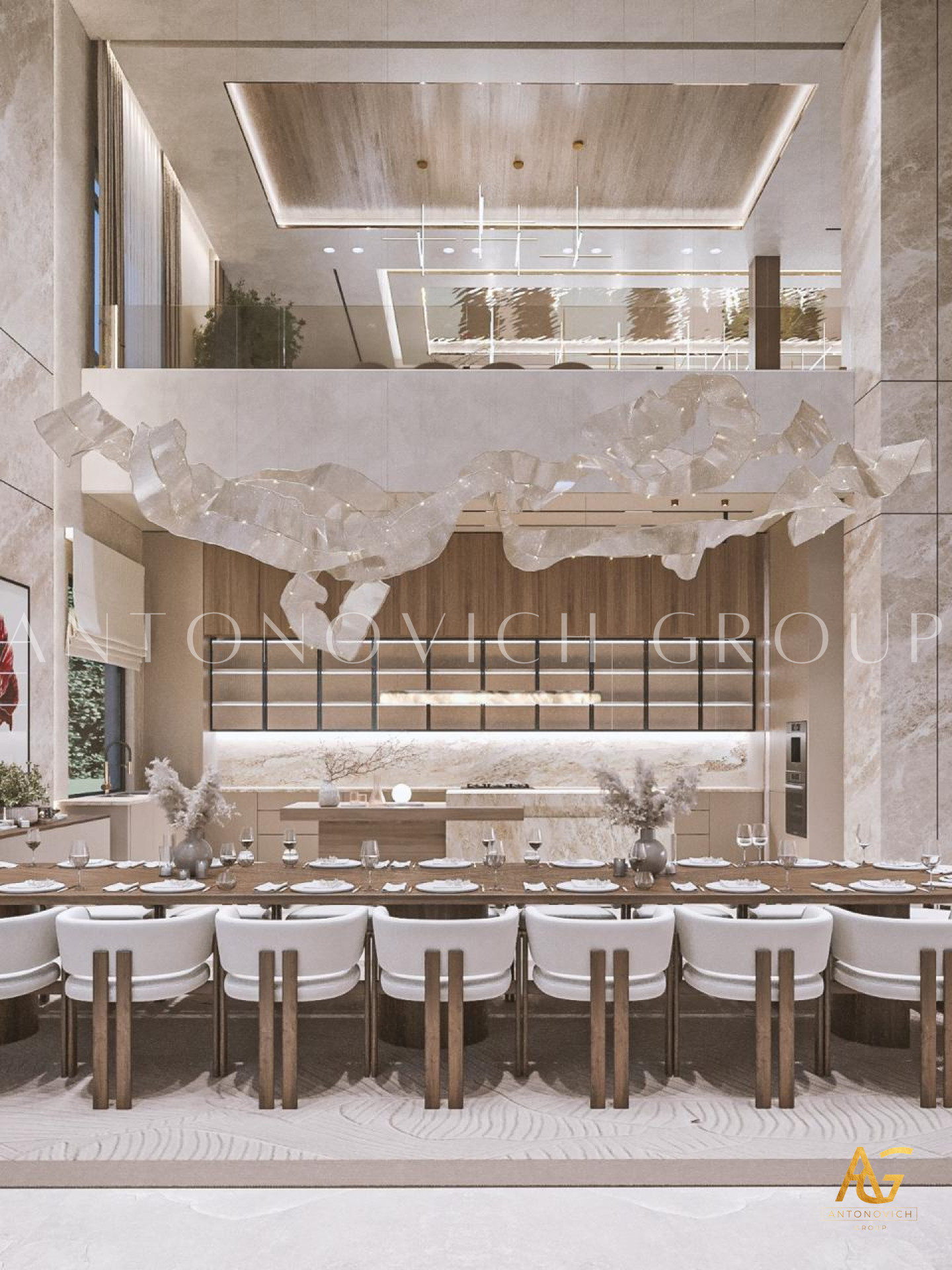 The villa’s interiors showcase Antonovich Group’s hallmark of luxury design. The grand entrance hall immediately sets the tone with bespoke chandeliers, premium marble flooring, and a sense of openness that reflects modern elegance. The living room is crafted as a welcoming yet sophisticated space, blending custom-made furniture with rich textures, decorative finishes, and carefully planned lighting.