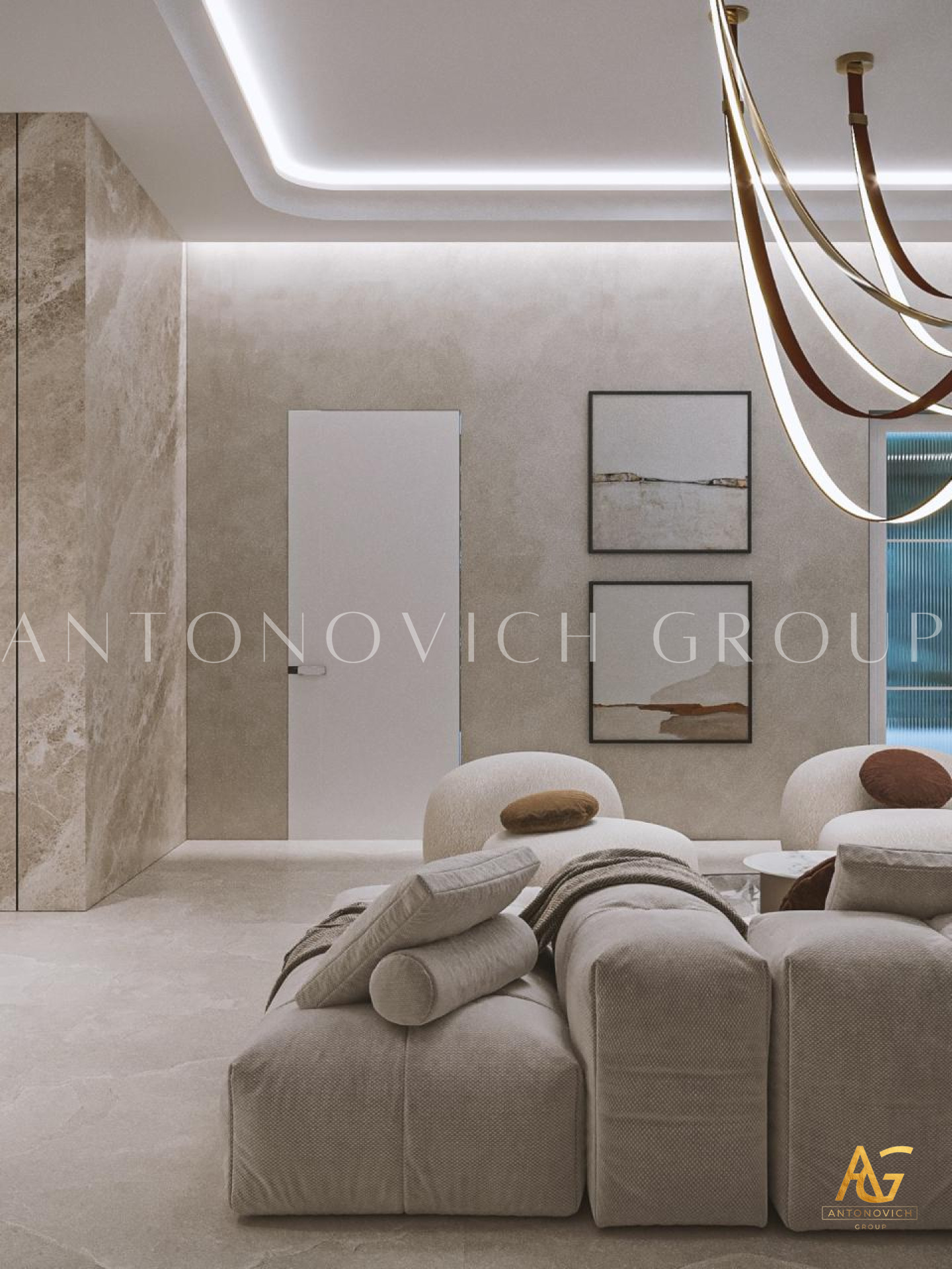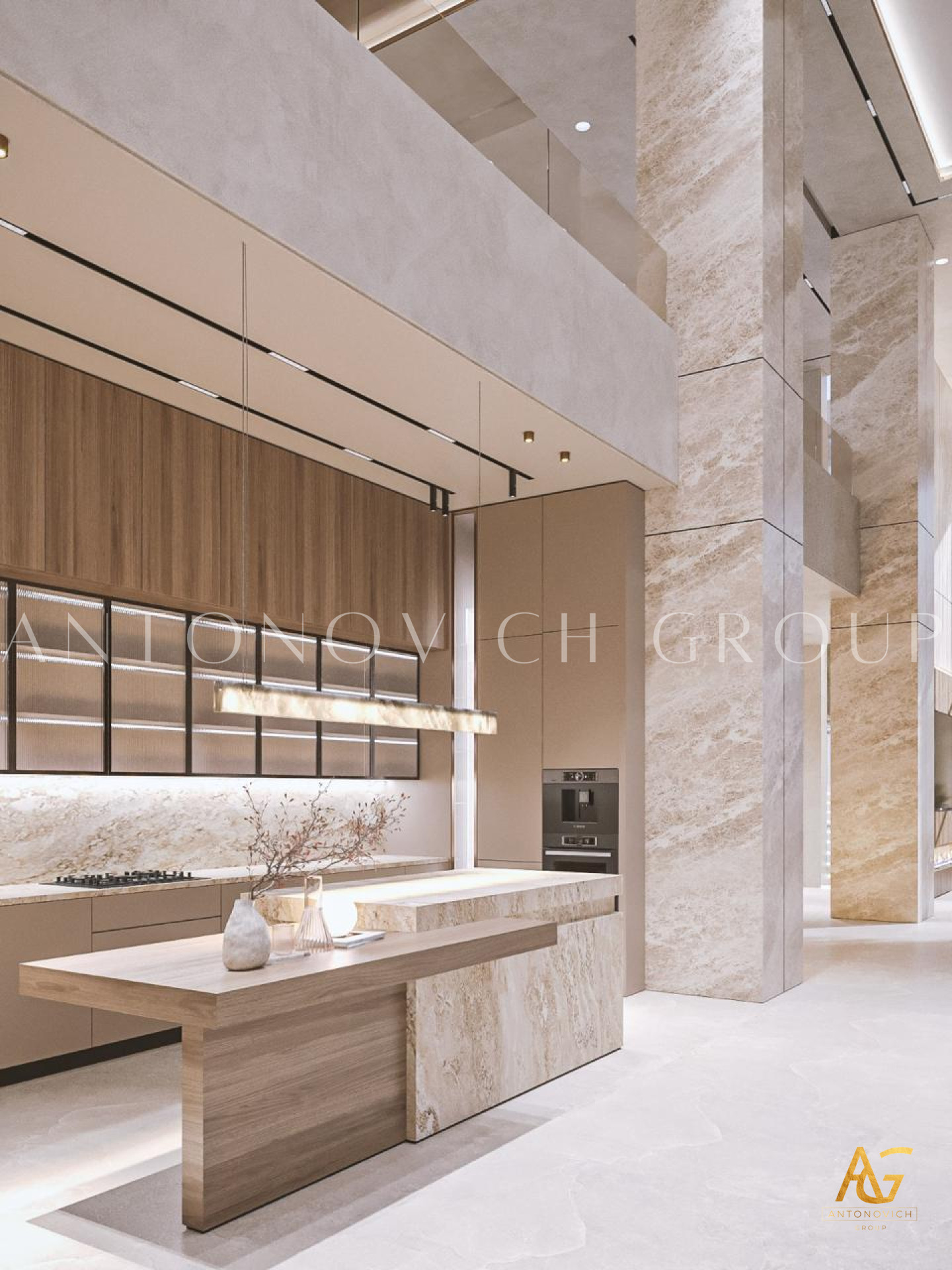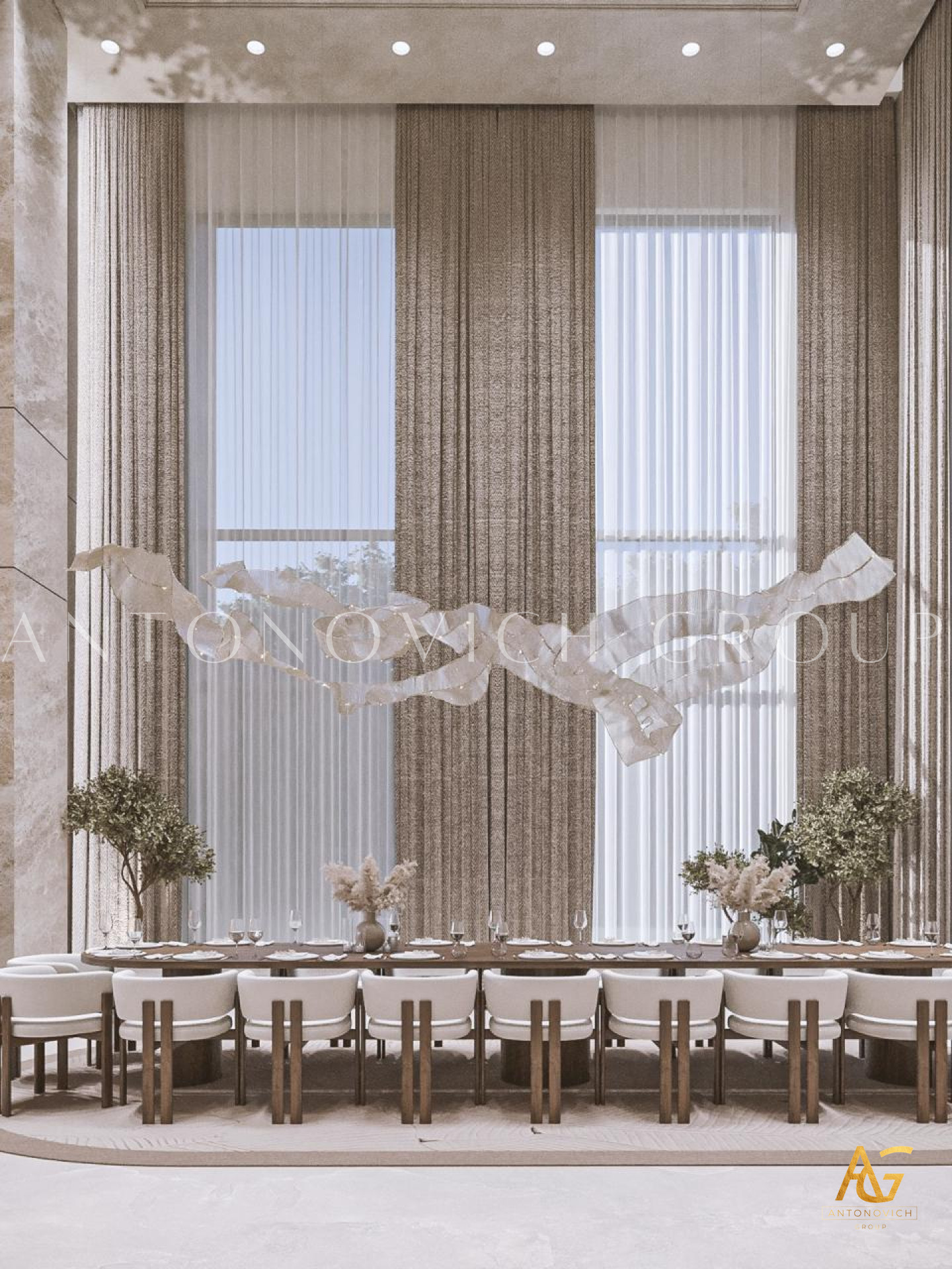 The villa’s interiors showcase Antonovich Group’s hallmark of luxury design. The grand entrance hall immediately sets the tone with bespoke chandeliers, premium marble flooring, and a sense of openness that reflects modern elegance. The living room is crafted as a welcoming yet sophisticated space, blending custom-made furniture with rich textures, decorative finishes, and carefully planned lighting.