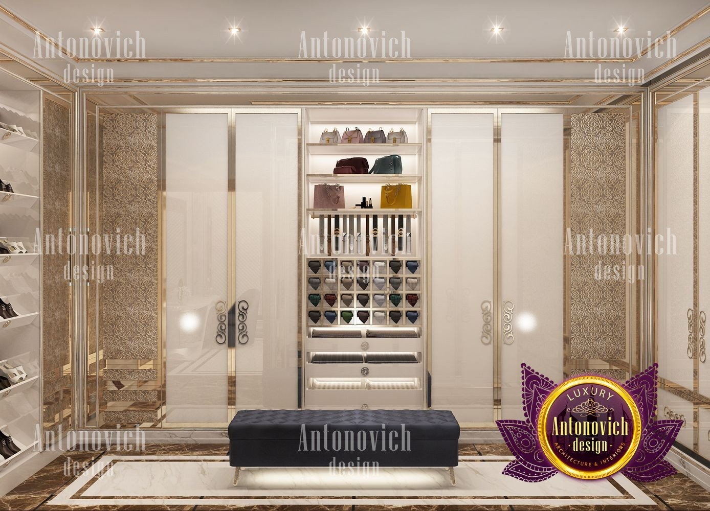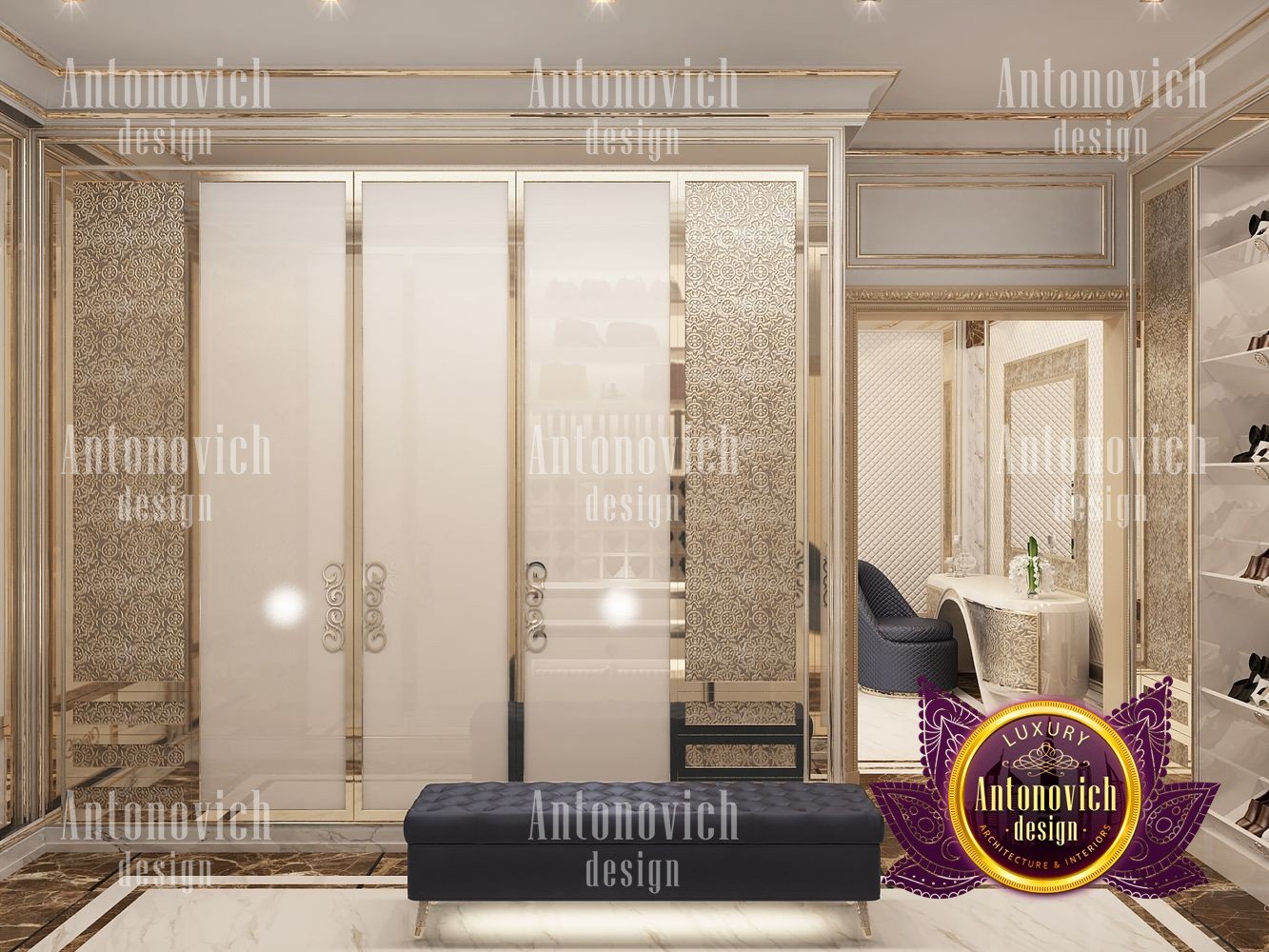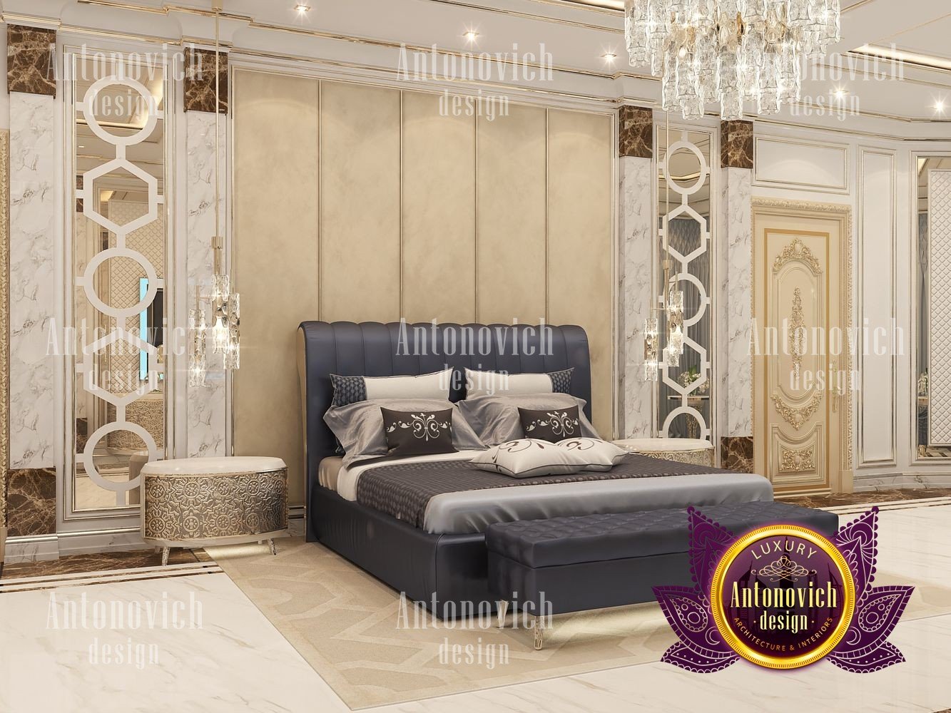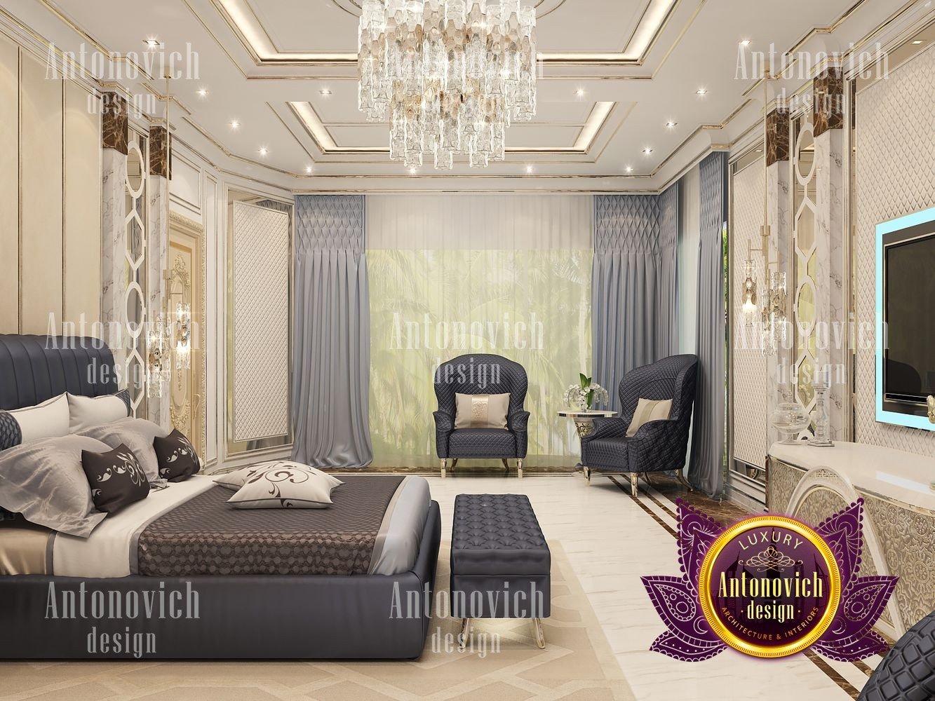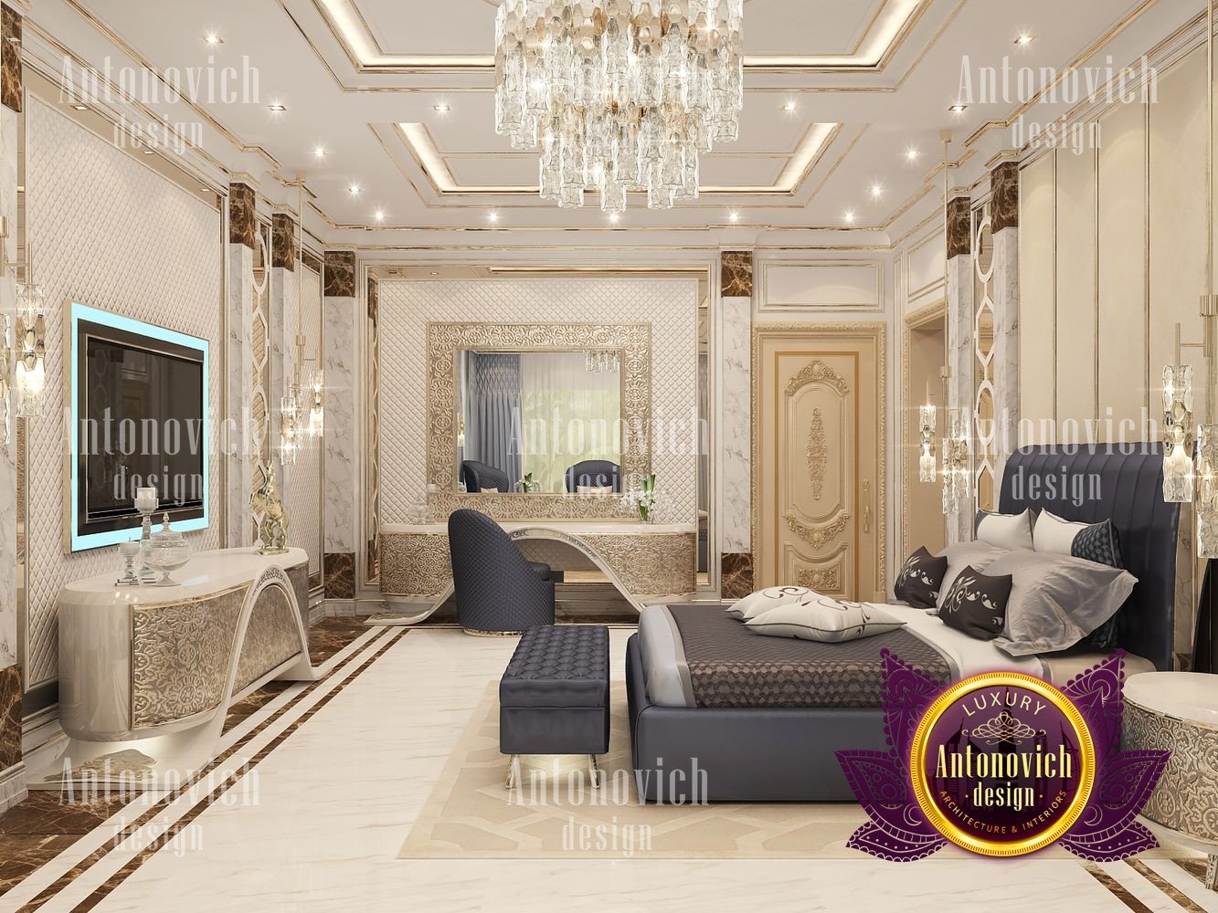 Fashionable interiors of 2018 by the design studio Luxury Antonovich Design is an interesting mix of natural materials, the feeling of absolute comfort and ultramodern design decisions. This bedroom interior in a modern style, in general, expresses the whole essence of fashion trends. One such trend is improvisation with geometric ornaments. With the help of the right forms and lines, interior designers create very picturesque and expressive interior options unique. If you look more closely at the interior of this cozy and comfortable bedroom, then you will notice an interesting game of geometry in every corner of the room. A high white ceiling in the niche in the center, the authors of the project was decorated with a grid ornament of circles. A soft natural carpet of light beige hue with a light ornament from a grid of hexagons is interestingly contrasting with this part of the decor. This geometry simultaneously fills the space with clarity and expressiveness, and with the warmth of nature itself. After all, these hexagons exactly repeat the configuration of honeycombs. Next, we turn our attention to the main subject of the bedroom interior, namely a large bed with a high soft headboard. The headboard of the bed in the upholstery made of luxurious textiles became single piece with the decor of the accent wall. The soft panel with parallel lines in upholstery made of light natural leather looks very beautiful in the frame of mirror panels with a geometric pattern that echoes with the pattern on the carpet. Minimalism in the decor of curtains and walls makes this part of the interior more vivid and expressive.