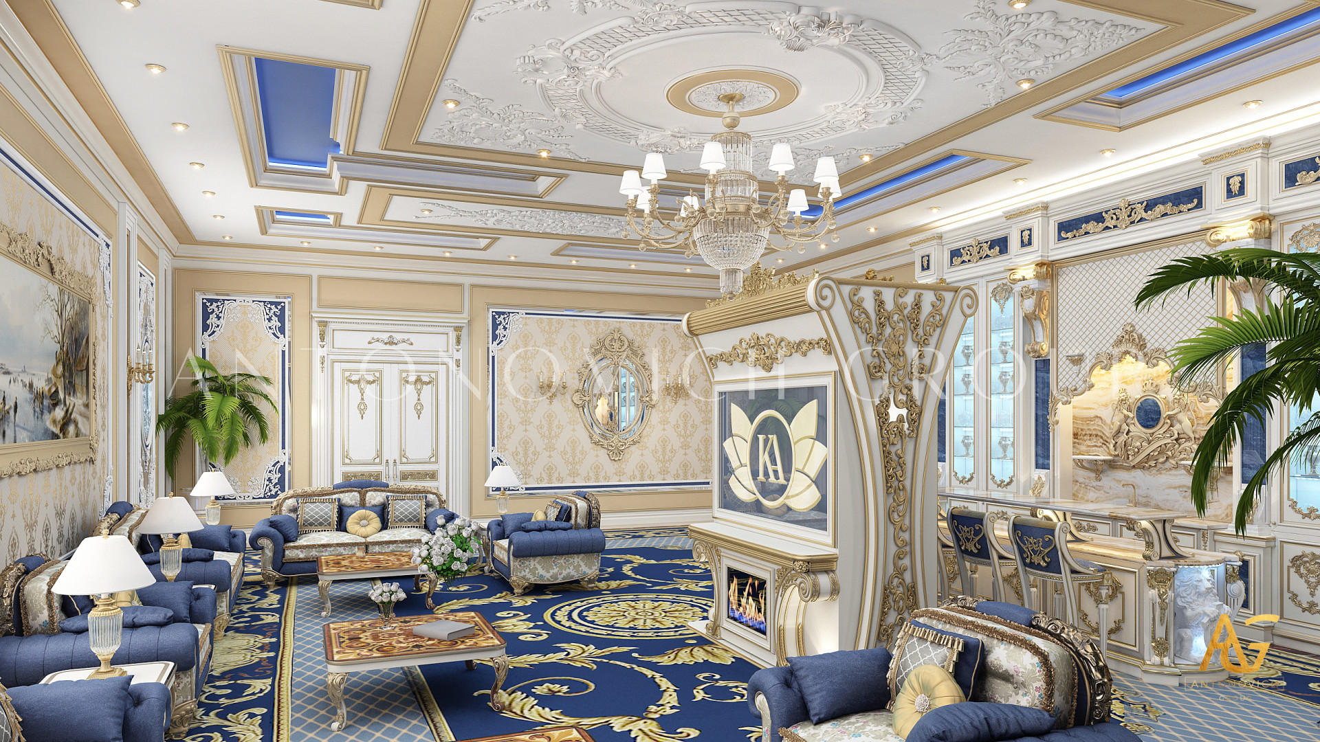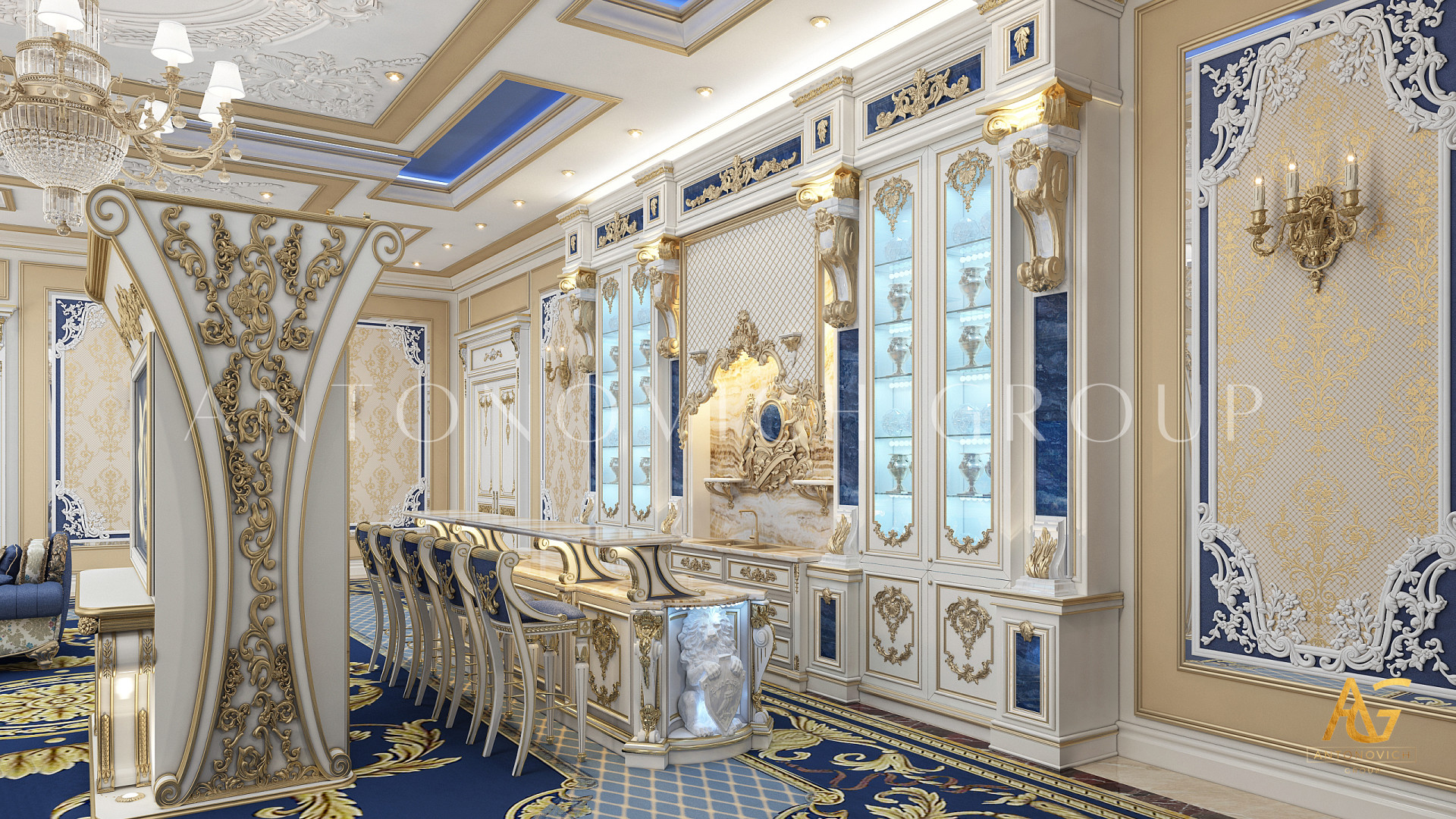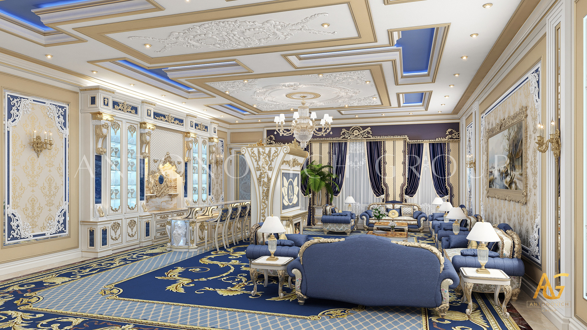 The fabulous and excellent Majlis interior design by the architectural and design company Luxury Antonovich Design inspires and pleases the eye. There is individuality in everything – it is the motto of the interior in the Arabic style. The true professionals of global renown of the studio Luxury Antonovich Design that is known in foreign countries will fill the house with harmony, beautiful images, and stunning scenes. Your life will be brighter and will be painted with all shades of colors in such comfortable and cozy atmosphere. The main part of the Arabic Majlis interior design is its individuality and singularity. An easy, natural charm gives a feeling of calm and relaxation. An expensive fashionable furniture is used in the beautiful space, richly decorated with exquisite carvings, fine exclusive fabric. According to Koran, there is no painting and sculpture in Arabic interior. Therefore, the design is dominated by varied and complicated patterns. There are geometrical paintings, which are interwoven with the text. The magic of the ceiling takes your breath away. Everything is thought out to the last detail. The graceful chandeliers, as the integral elements of the decor, catch the rapturous glances of the guests. They invite like to the ball with the originality. The smooth clean lines with exquisite patterns not only increase the space, but also give the room a special highlight. Look at the floor coating. Marble is a completely natural material, so the floor is ecological friendly. The surface of marble tile is smooth and shiny. The marble polishing feature creates special dramatic shades. Due to the beautiful patterns, the floor coating looks more refined and elegant. The final touch to the decoration of Majlis interior design are the curtains. The beautiful elegant curtains give the nobility and charm to the room.