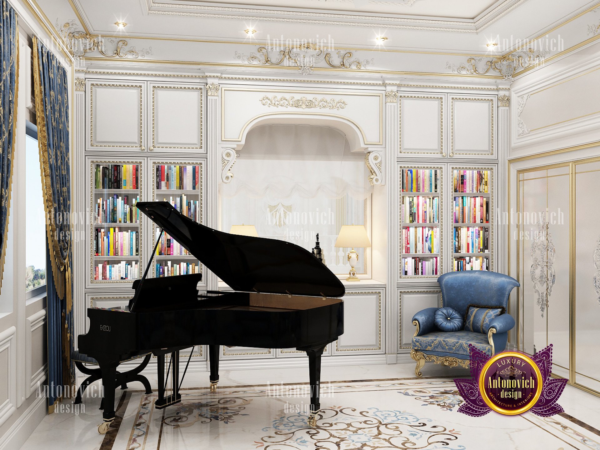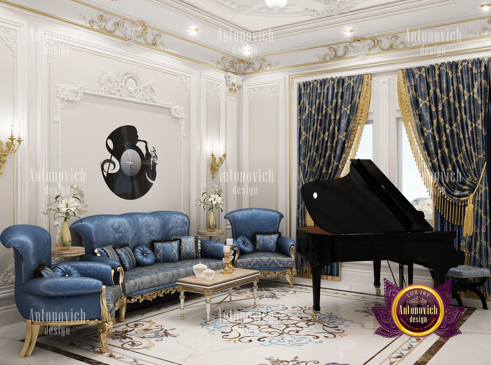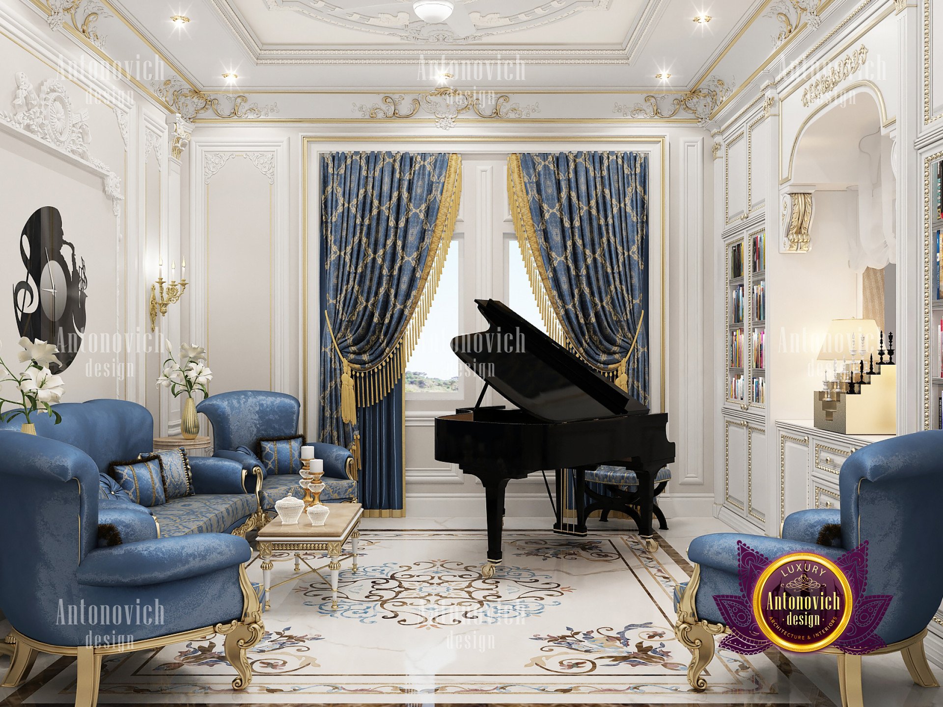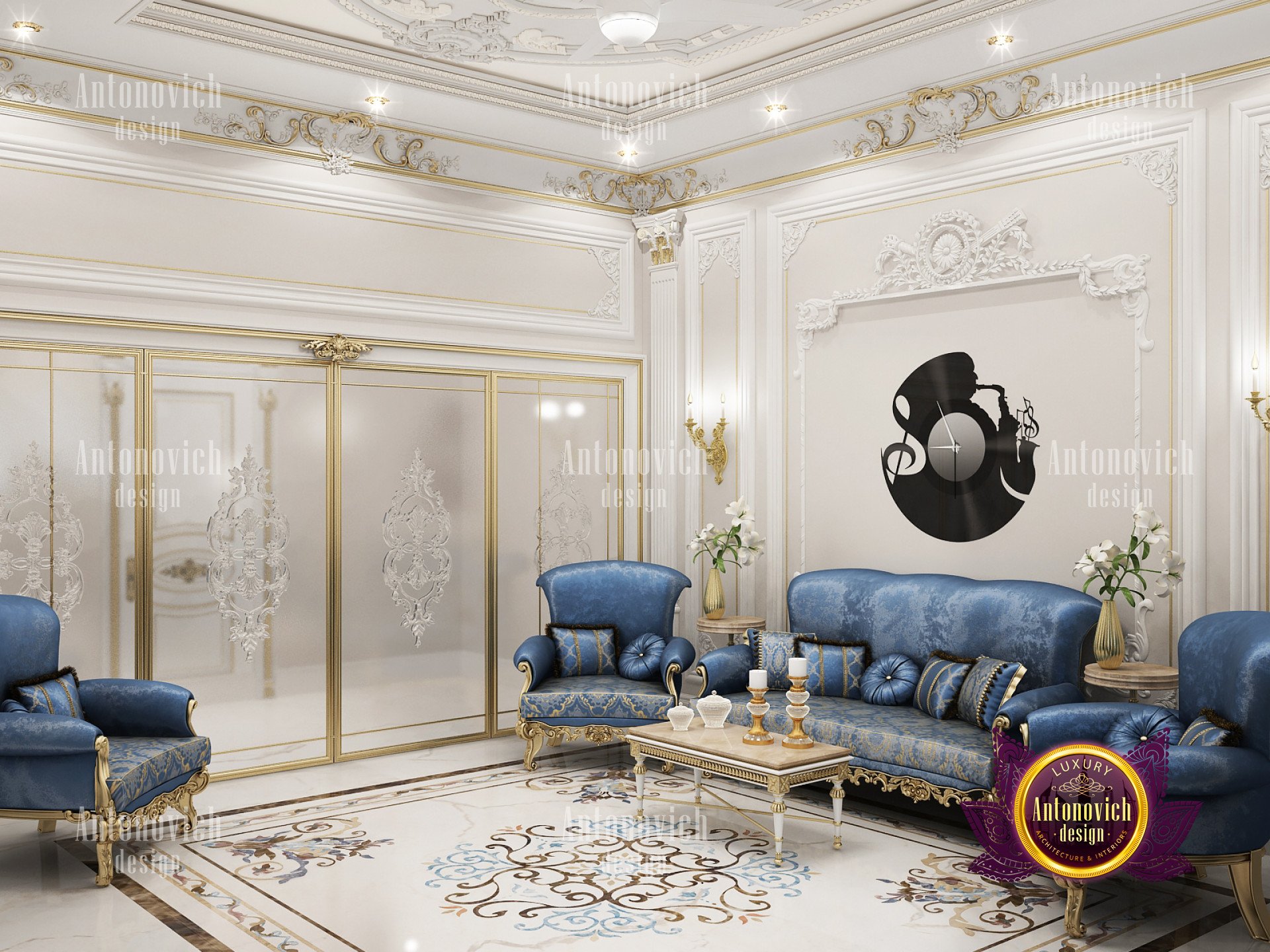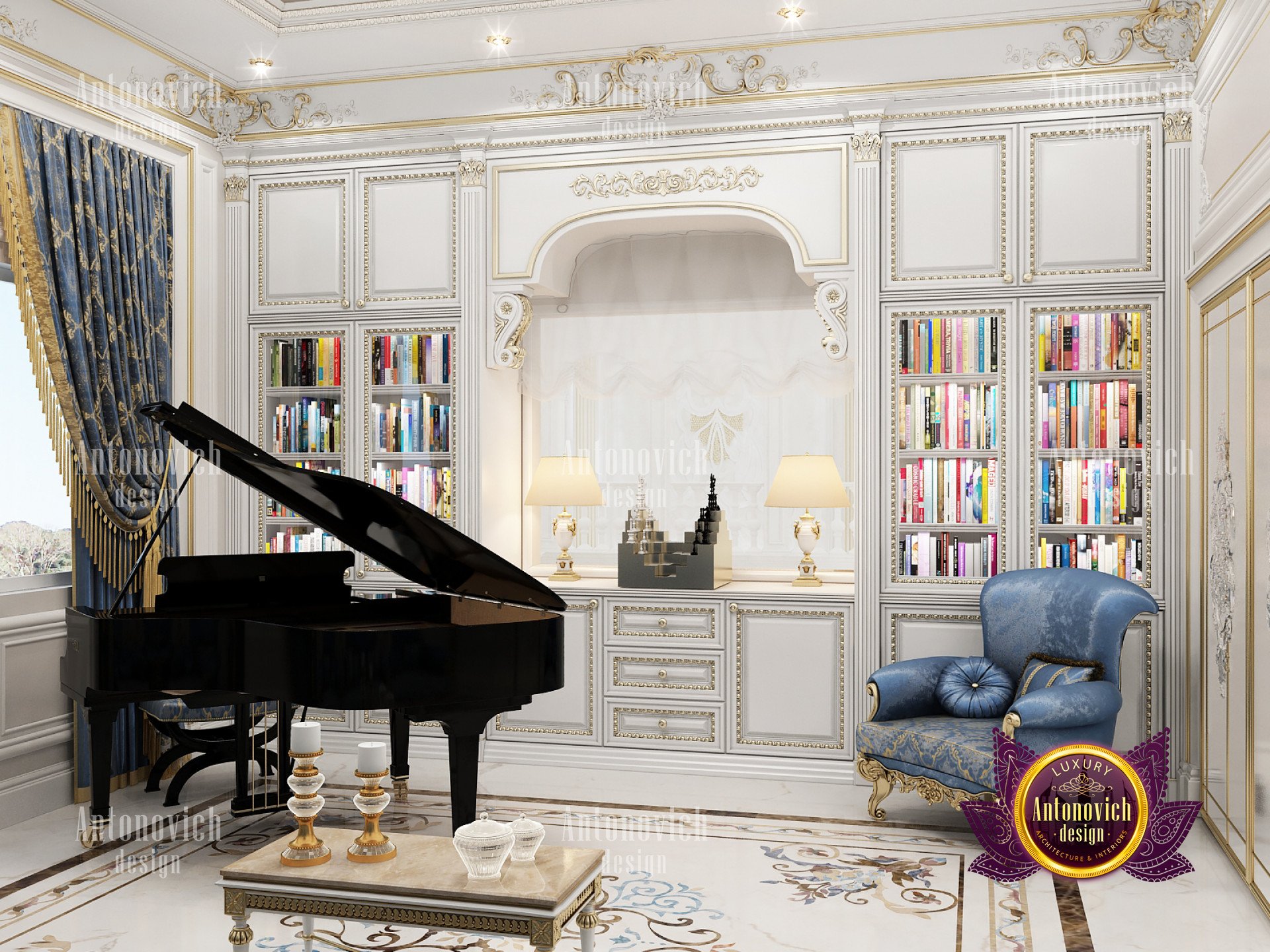 The blue and white accent colors make such a big difference in the luxury decor. One of the attractions of this opulent design in Dubai is the stunning furniture. Todays trend is for classic, hardwood interior design. The pattern features on the wall are such a fantastic complement to the luxury living room interior designs classic aesthetic. Luxury Antonovich Design has created an interior concept where peace and productivity go hand in hand in this lovely and elegant room design.
