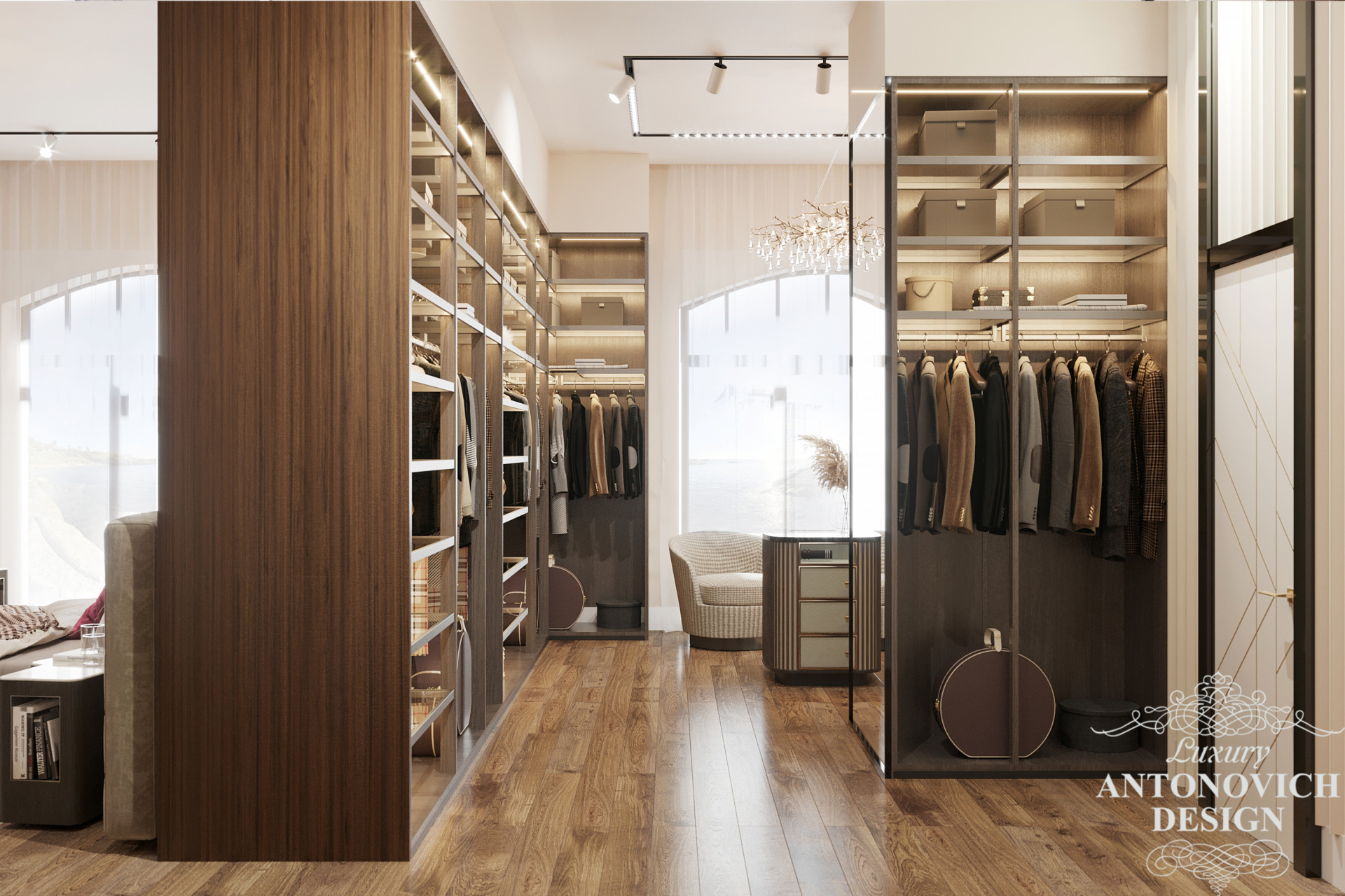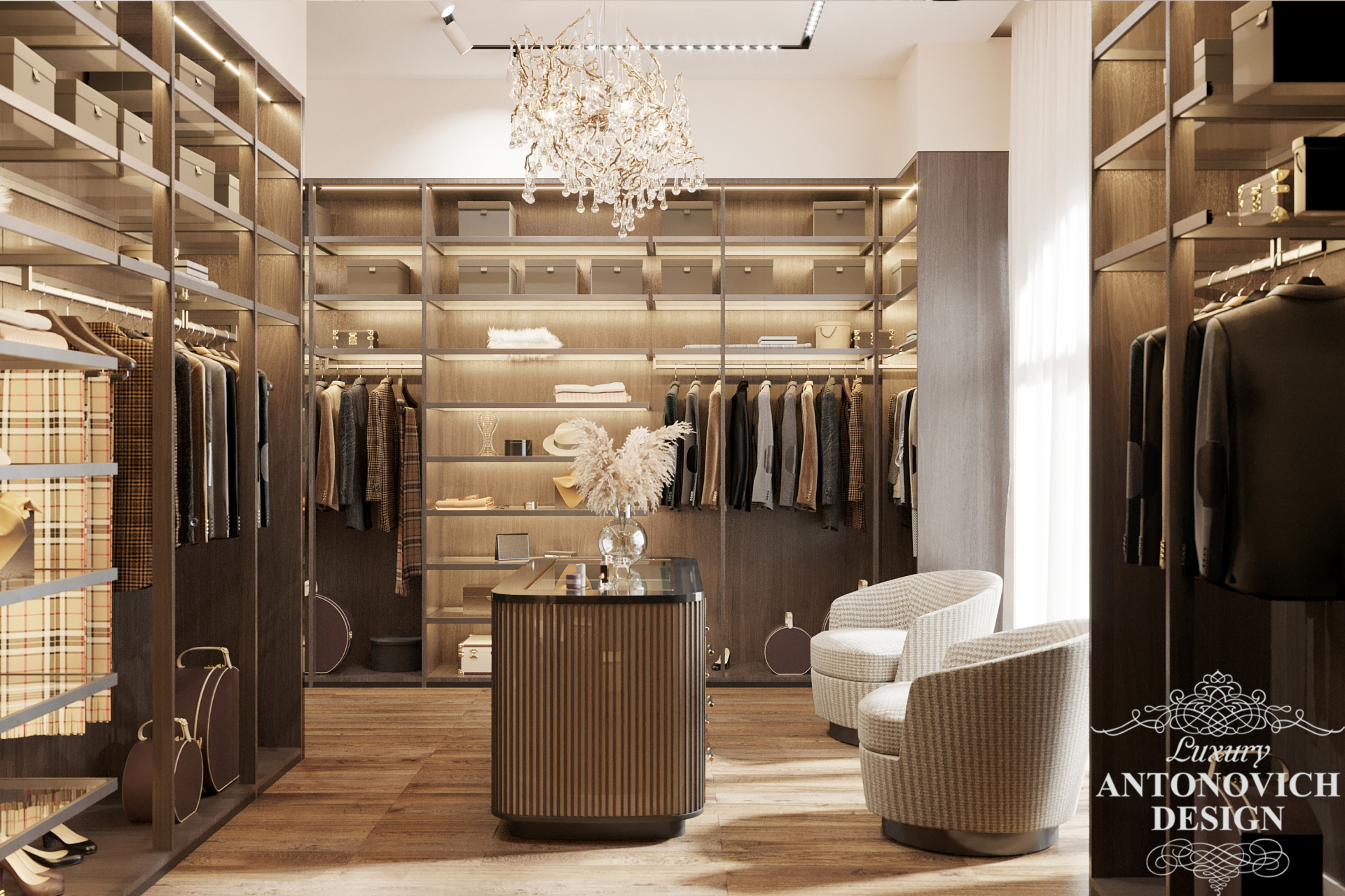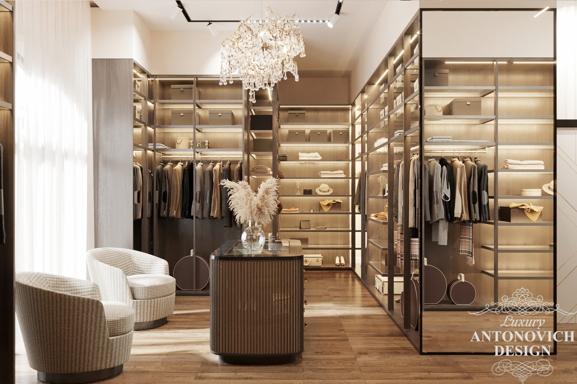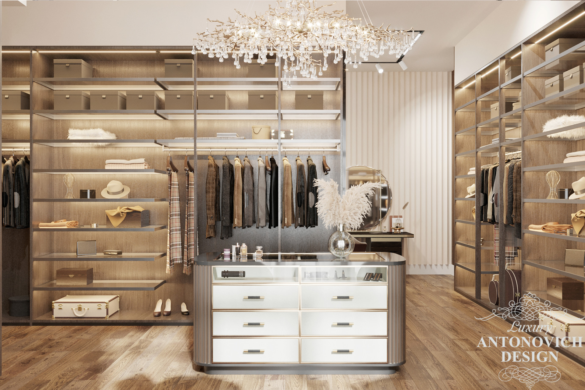 Dressing here will undoubtedly give you a luxurious vibe, from the carpet to the chandelier. The large team at Luxury Antonovich Design has completed several large interior design projects, including this one! The contemporary design of the luxury walk-in closet interior design is very much alive with the colors that were chosen. Brown is such a standout in the completion of the room and it is paired with gold that makes the entire room a classy finish.