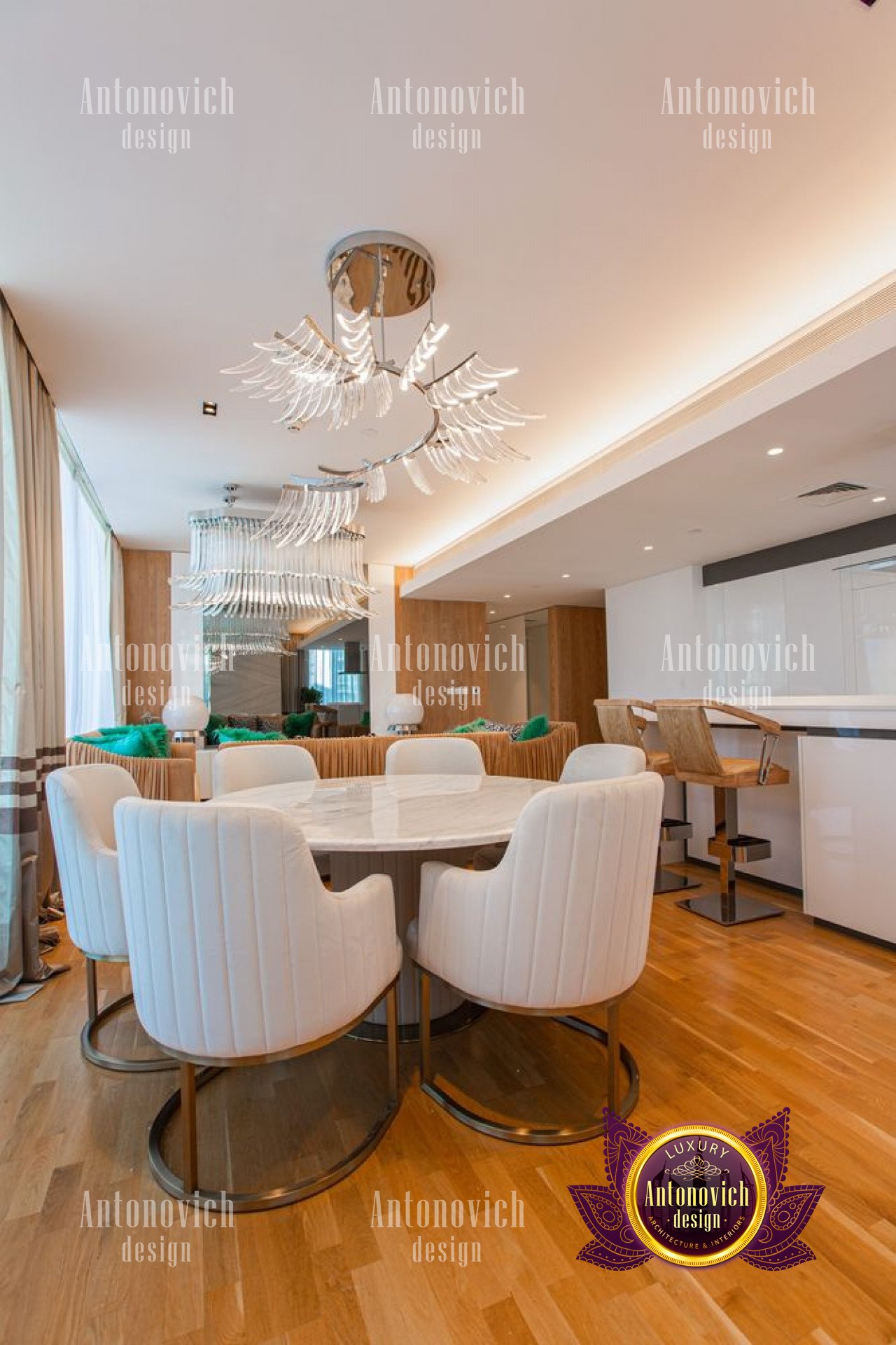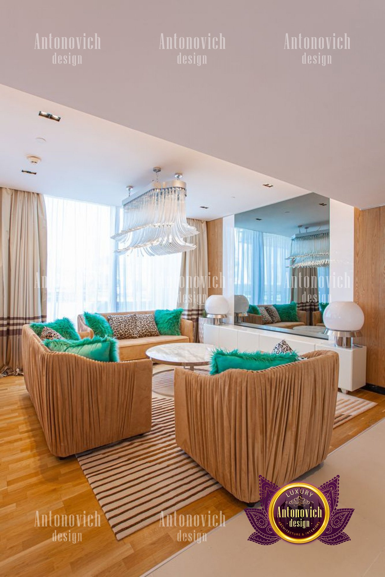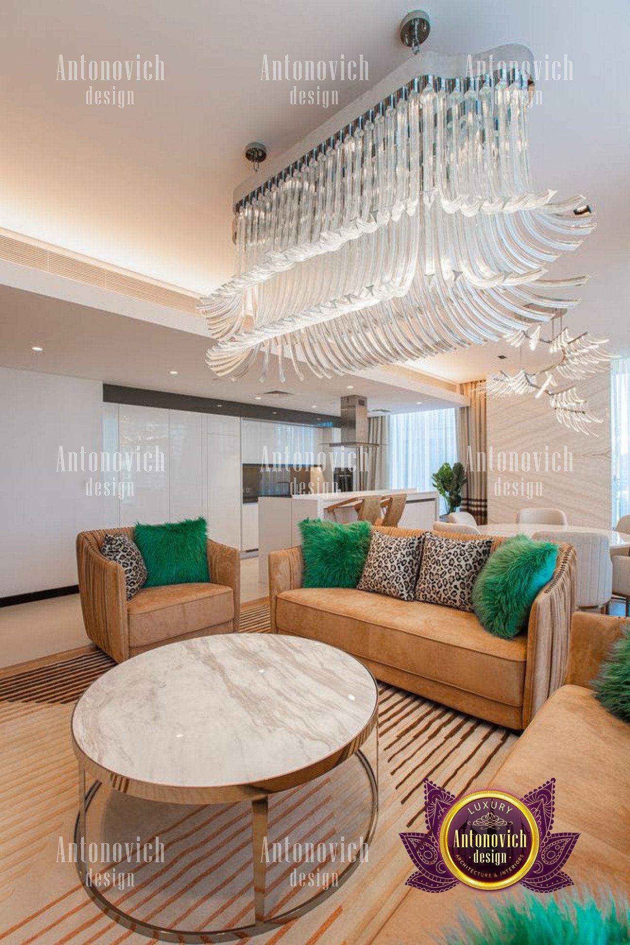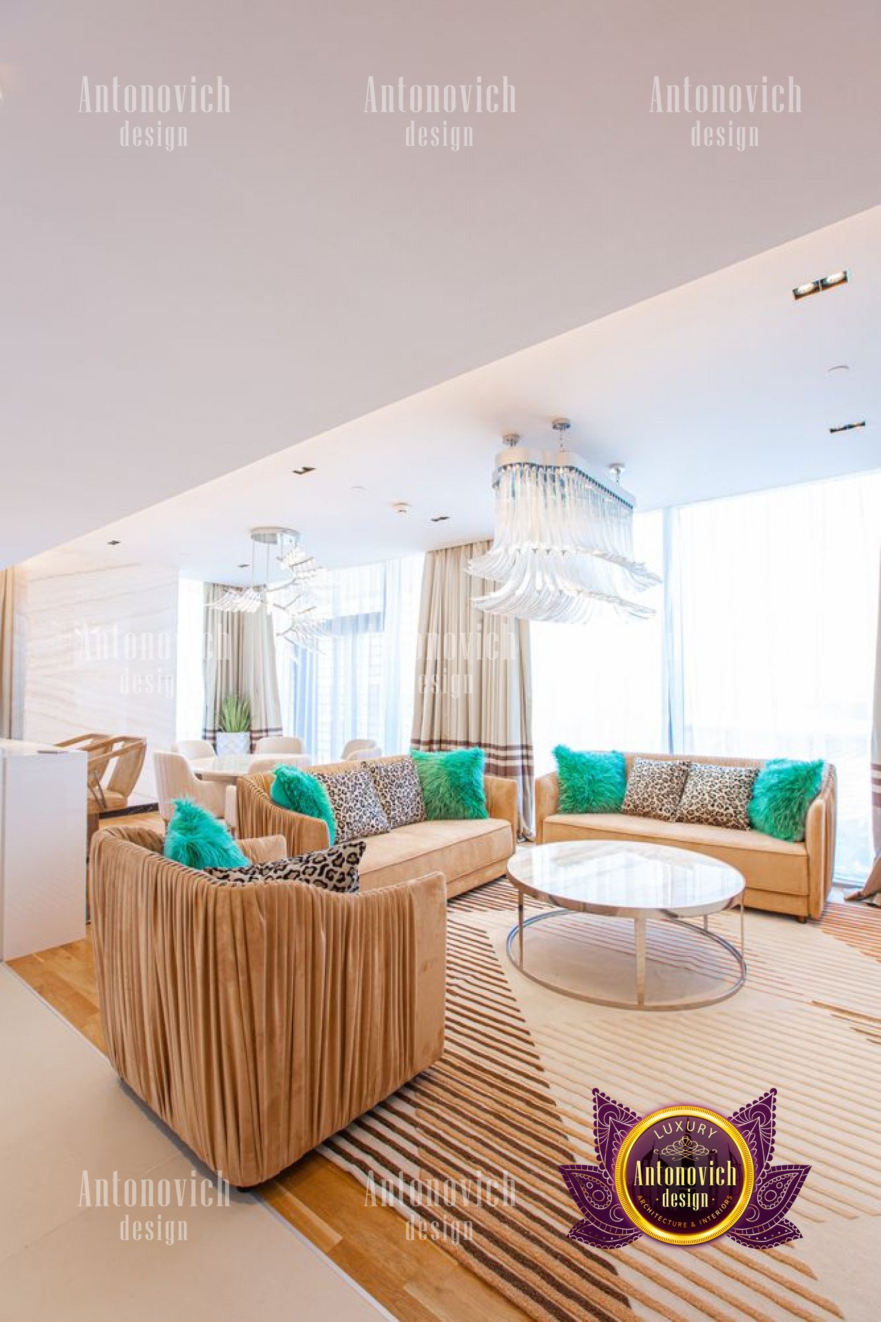 Orange and teal are always a good color combination for interior design. They give such a powerful yet calming ambiance to the room. In this beautiful apartment in Dubai Blue Waters, Luxury Antonovich Design has utilized the beauty of orange and teal. They go well with each other and their style is undeniably beautiful. The beautiful sofa is partnered with an equally gorgeous throw pillow.