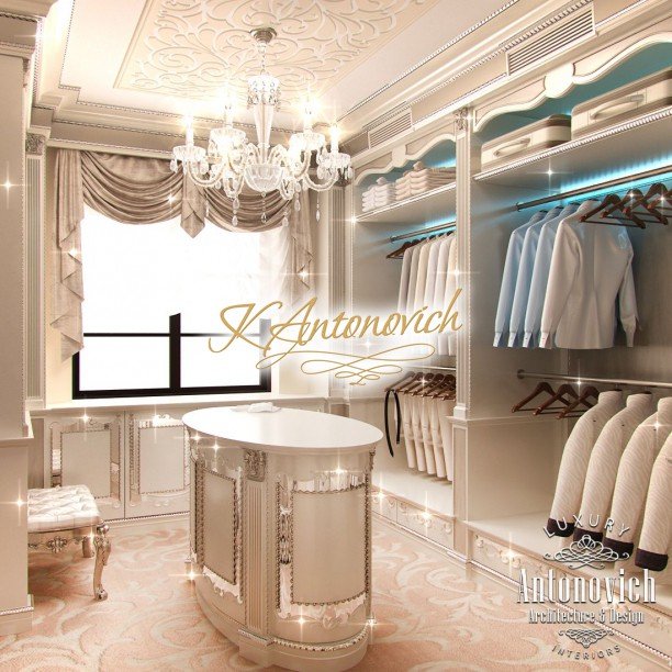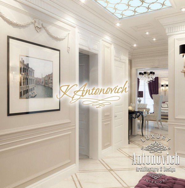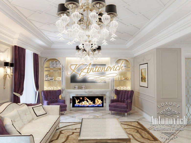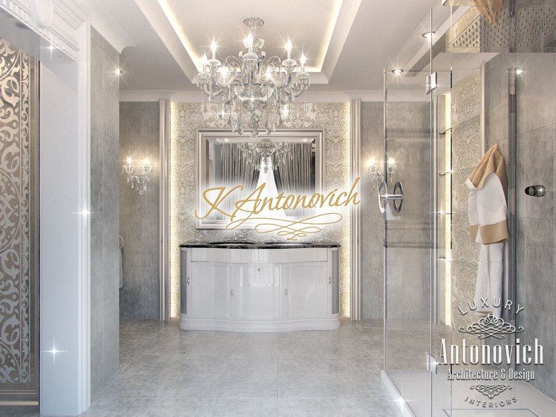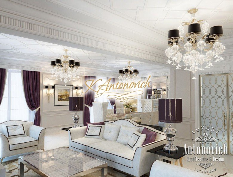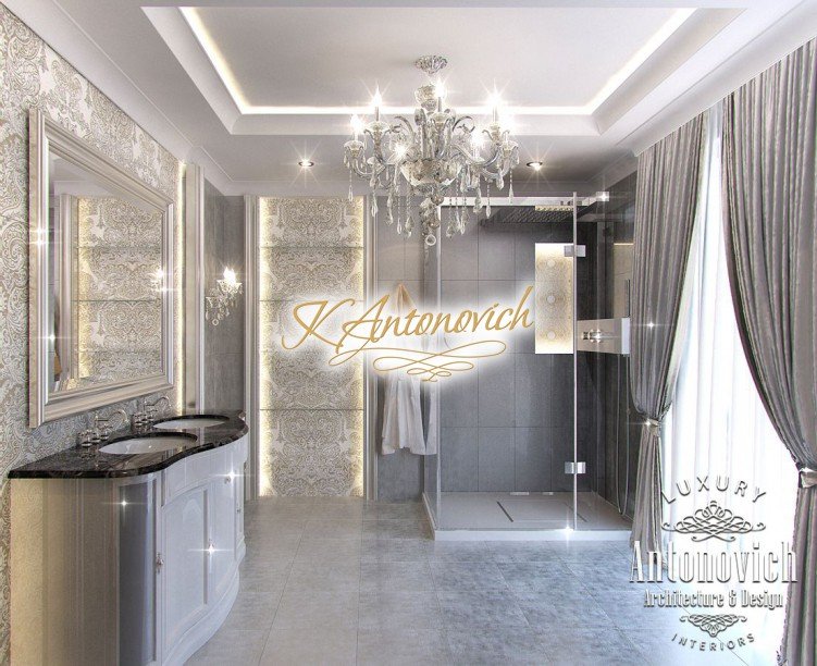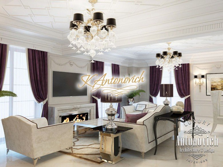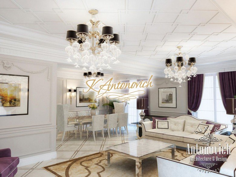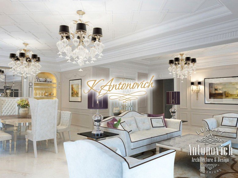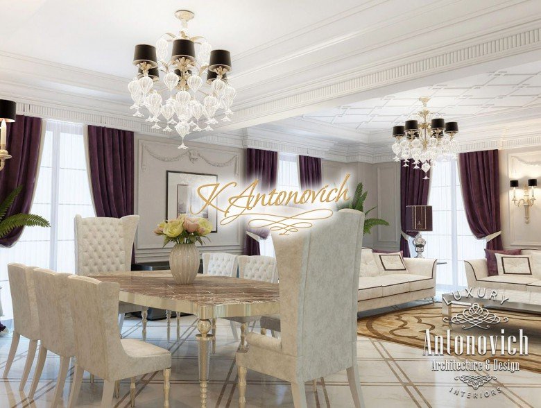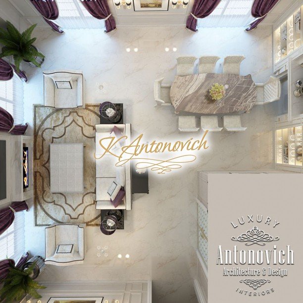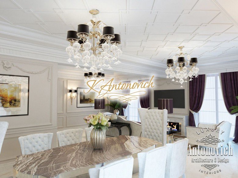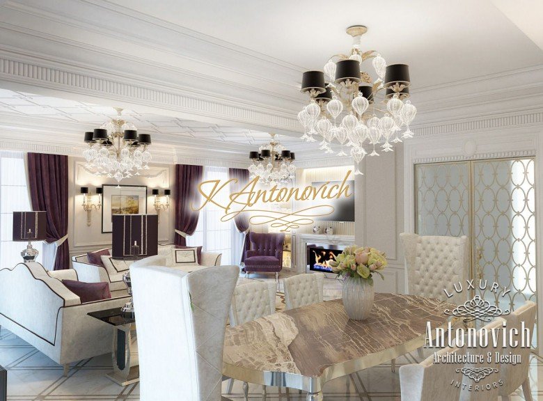 This modern villa reflects brand-new trends of the villa interior design. This style can be described as a modern classics. And in works of Luxury Antonovich Design, it acquires unique and beautiful features. A living room interior, which is combined with a dining area, has a bright image. The basis of the color range is light and milky-white. On this background, luxurious velvet curtains of eggplant hue look stunning. All furniture is upholstered in soft silk velvet of white color. Sofas and armchairs for emphasis are decorated with inserts of dark silk shade. The main way of zoning the interior space has become a modern villa ceiling decor. Large rectangular niches with decorative geometric patterns define the living and dining area. In the center of each slot, the interior is decorated with an elegant chandelier and additional lighting lines. In the dining area, the modern fireplace is complemented by mirror panels that visually expand the space. The interior design of the modern villa exudes nobility and elegance. On the walls, lamps and paintings look stylish and expressive. The light expanse of marble floor blends with a natural carpet in the living room. All these moments of elegance and sophistication continue in each room. Two comfortable bedrooms have a gentle image. The interior designers have added a few elegant notes in a bathroom and a dressing room.