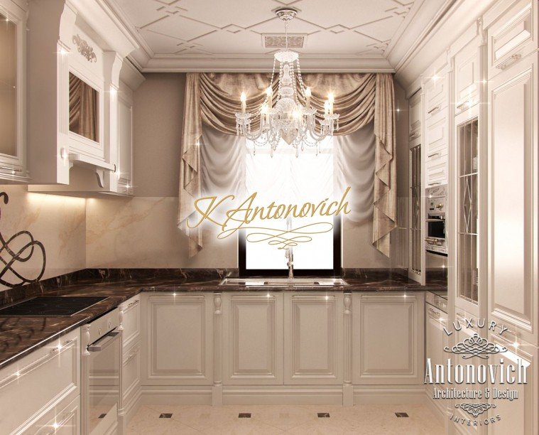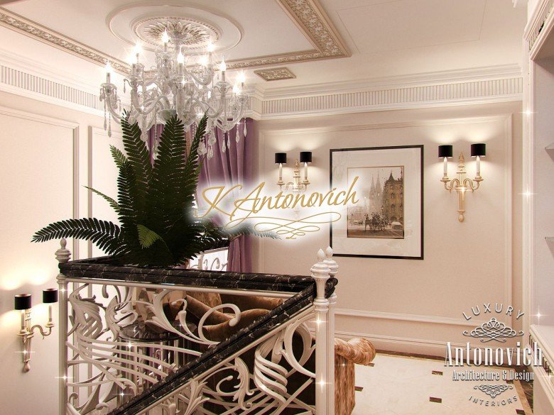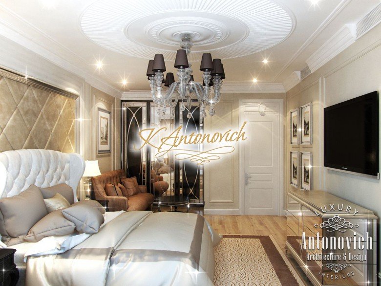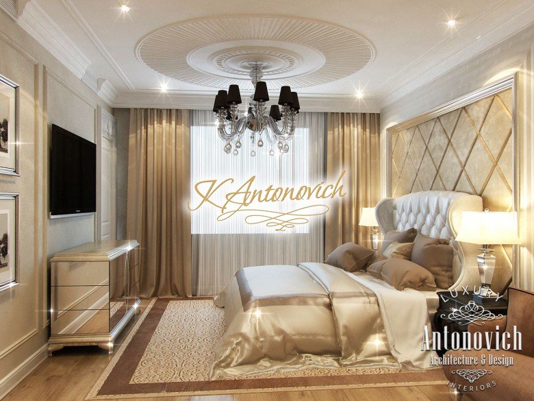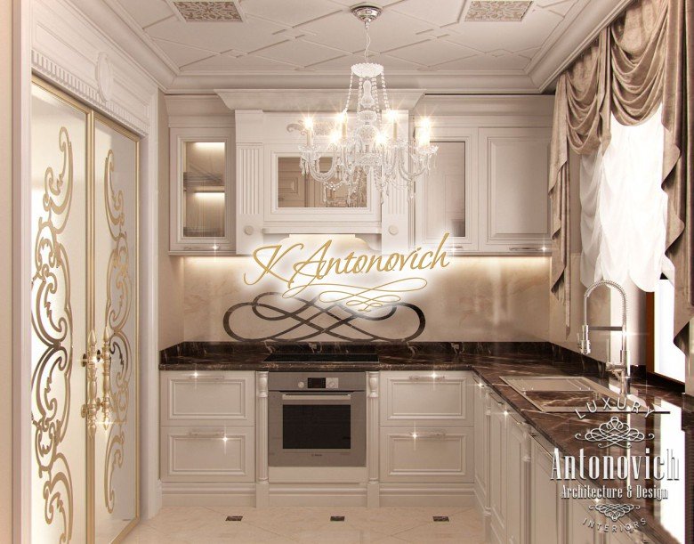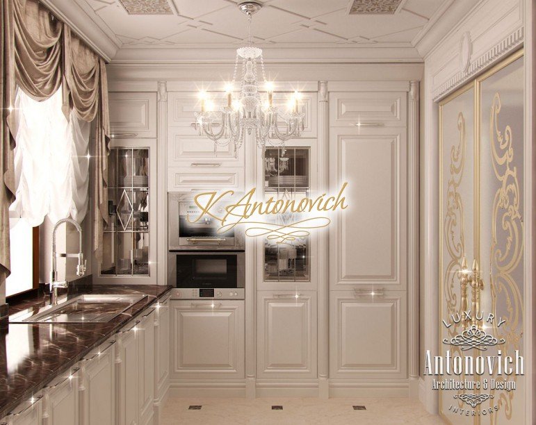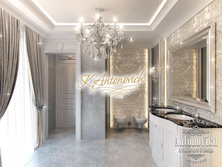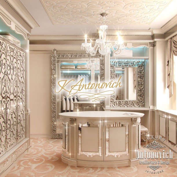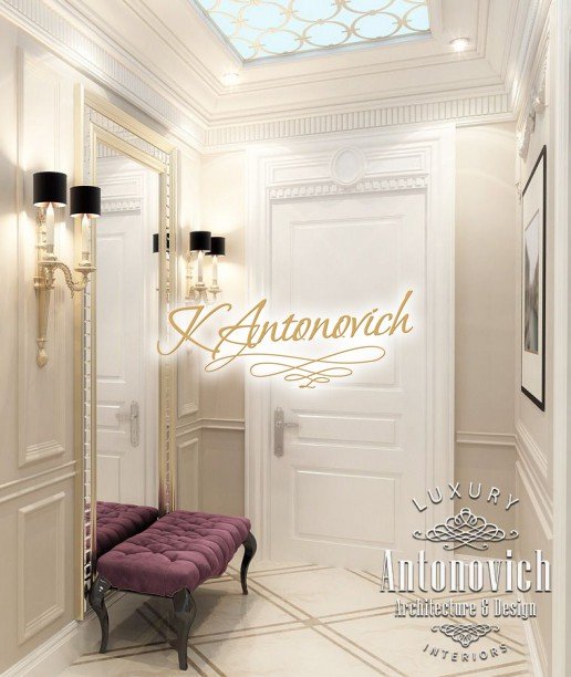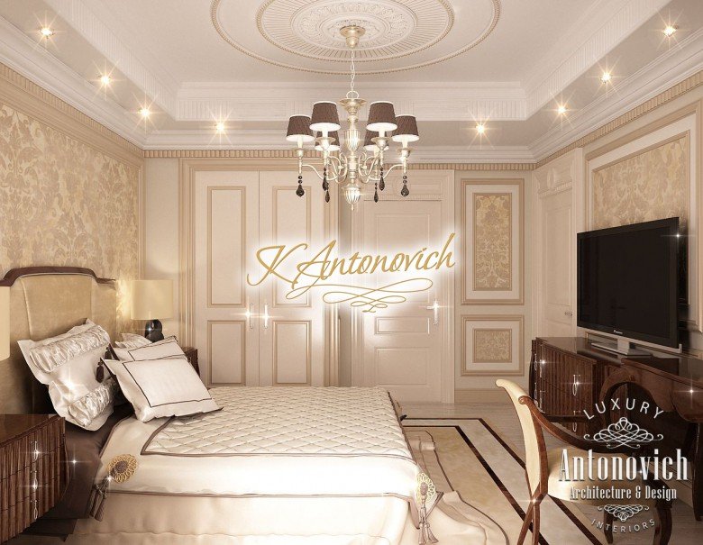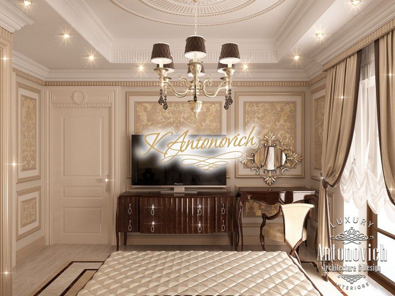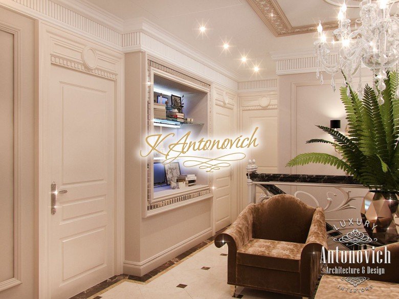 This modern villa reflects brand-new trends of the villa interior design. This style can be described as a modern classics. And in works of Luxury Antonovich Design, it acquires unique and beautiful features. A living room interior, which is combined with a dining area, has a bright image. The basis of the color range is light and milky-white. On this background, luxurious velvet curtains of eggplant hue look stunning. All furniture is upholstered in soft silk velvet of white color. Sofas and armchairs for emphasis are decorated with inserts of dark silk shade. The main way of zoning the interior space has become a modern villa ceiling decor. Large rectangular niches with decorative geometric patterns define the living and dining area. In the center of each slot, the interior is decorated with an elegant chandelier and additional lighting lines. In the dining area, the modern fireplace is complemented by mirror panels that visually expand the space. The interior design of the modern villa exudes nobility and elegance. On the walls, lamps and paintings look stylish and expressive. The light expanse of marble floor blends with a natural carpet in the living room. All these moments of elegance and sophistication continue in each room. Two comfortable bedrooms have a gentle image. The interior designers have added a few elegant notes in a bathroom and a dressing room.