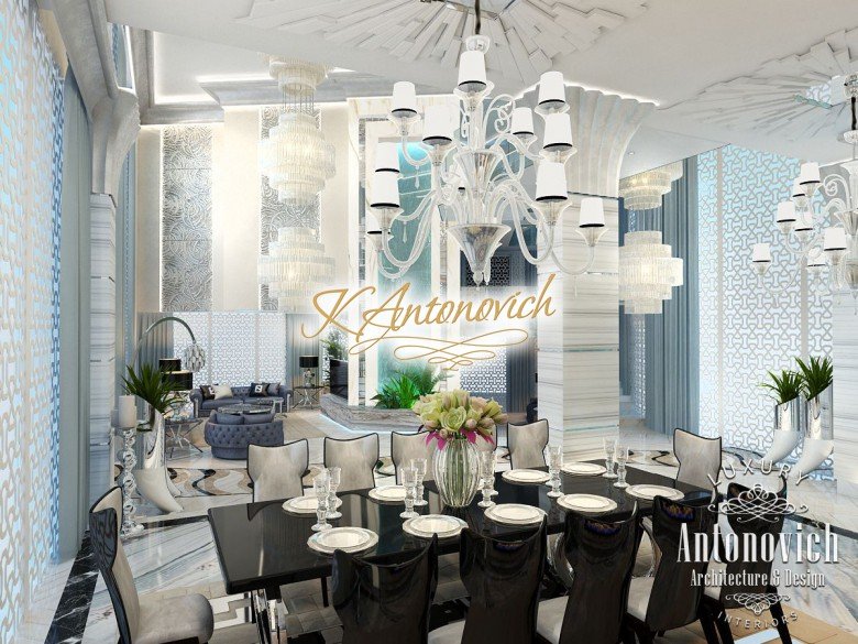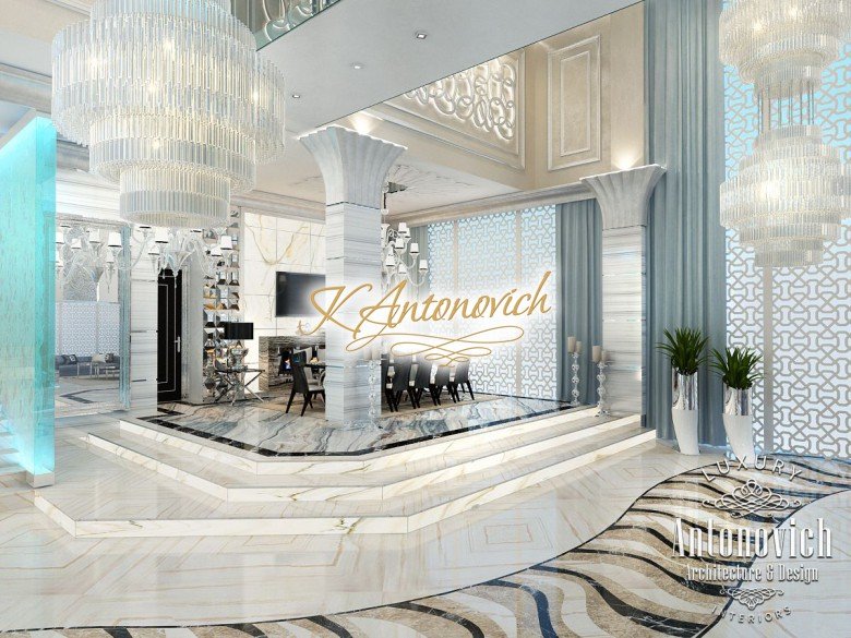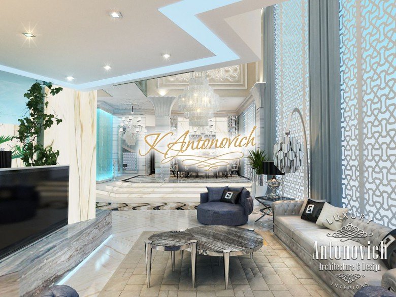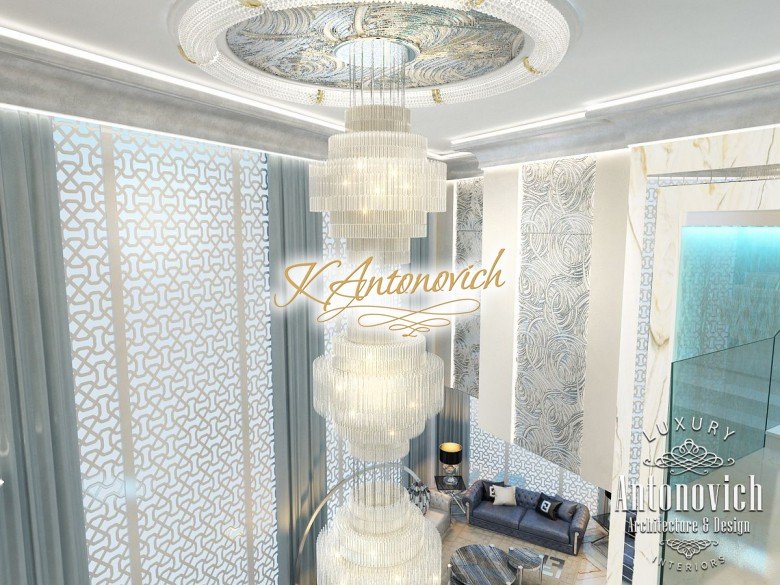 Contemporary villa design is becoming the best way to create a unique interior with original design solutions. These solutions often look startling and become sources of new styles in the interior. Villa design is a reflection of the boundless imagination and talent of the interior designers. We carefully monitor new technologies, not only to offer our customers unique and beautiful solutions but also to implement them in life. Perfection, harmony, comfort and aesthetic perfection. That is how you can describe the authors project of at the villa in Palm Jumeirah. All solutions regarding interior design continue the architectural design. A spacious living room consists of a dining area and living room itself. The height of the wall extends over the entire height of the building. The interior has got a unique sensation of freshness and breadth of space. Part of the wall is decorated with interlacing patterns with decorative effect of Mashrabiya. The living room is decorated with a glass panel with special lighting, which visually resembles a large waterfall. The floors are decorated with natural marble with carved abstract patterns. The dining area is taken to a podium with backlight. Massive crystal chandeliers in this space look visually light and weightless. A terrace on the second floor perfectly fits into the interior, thanks to the balustrade made of transparent glass. Spectacular bas-reliefs on the walls with lighting elements make the interior more dynamic.