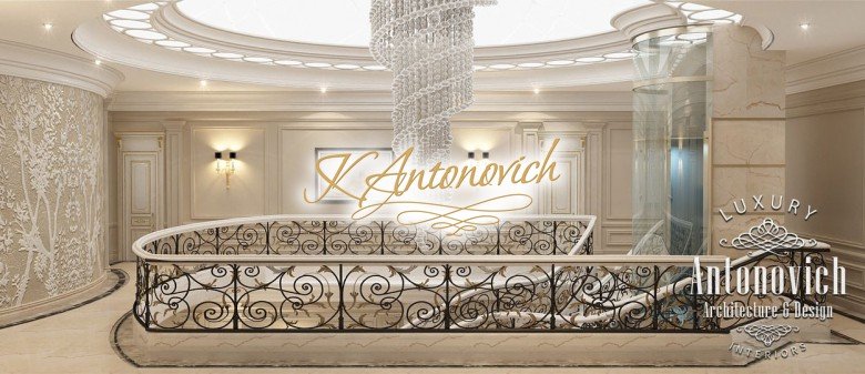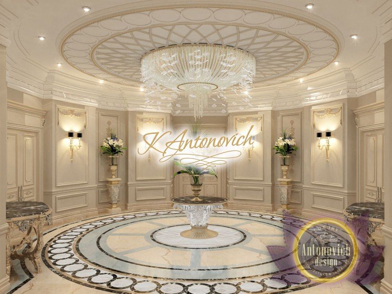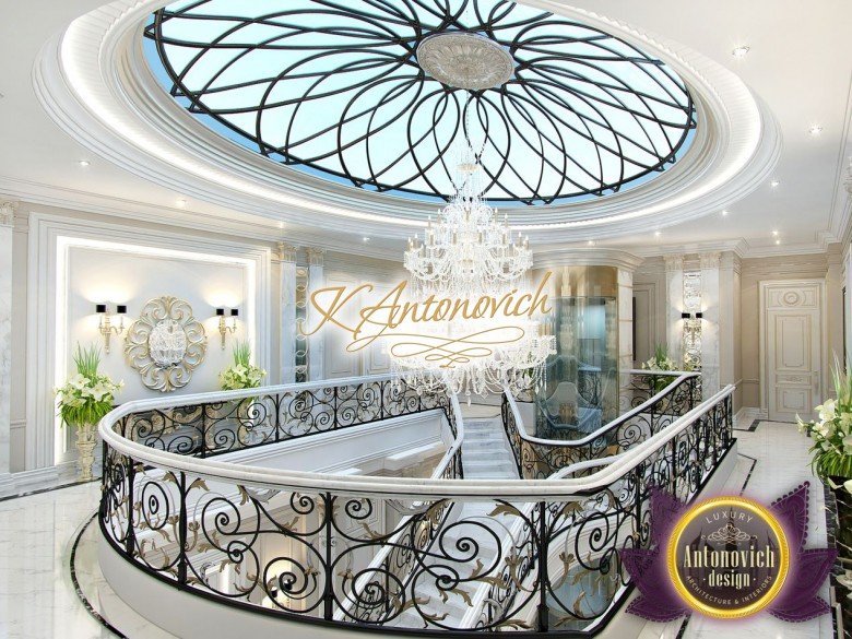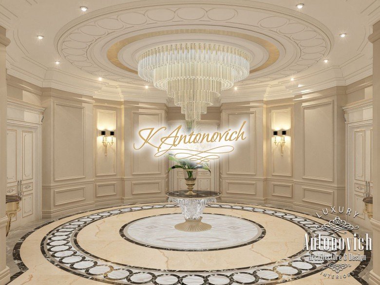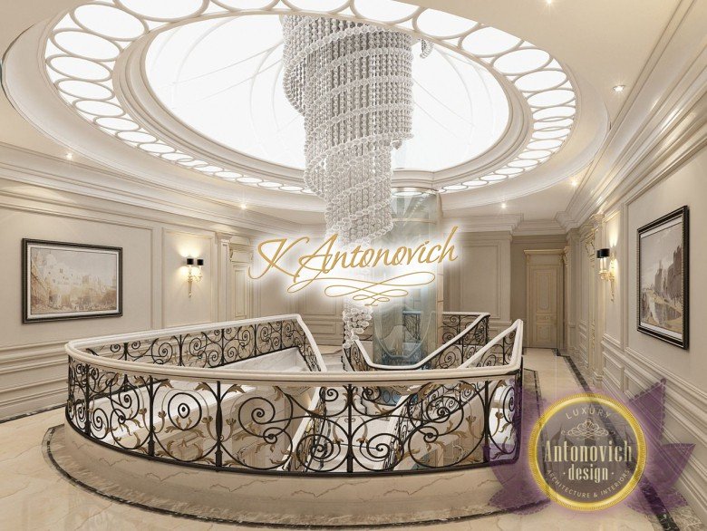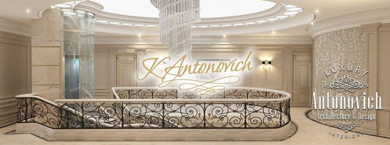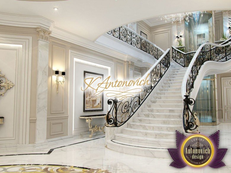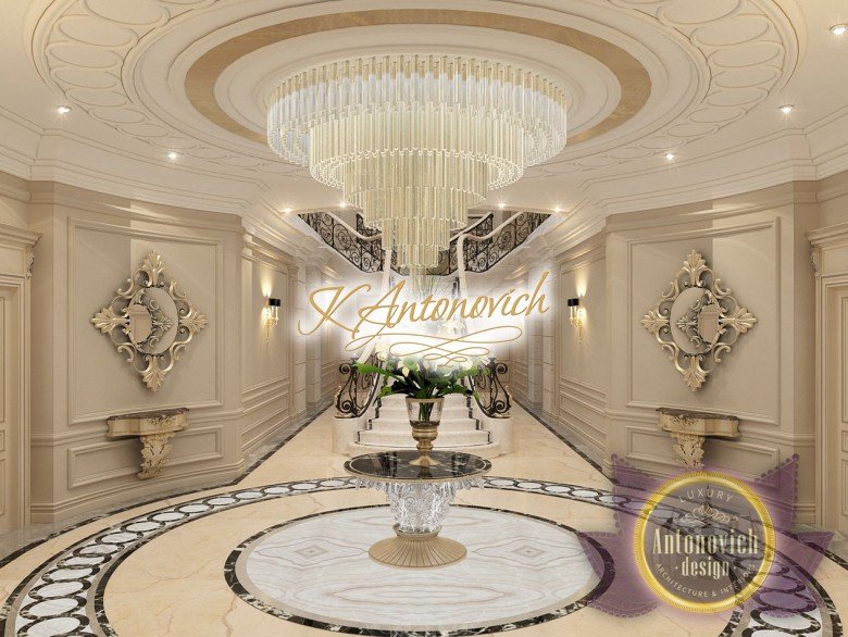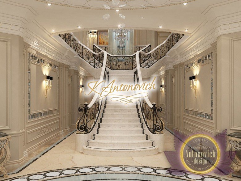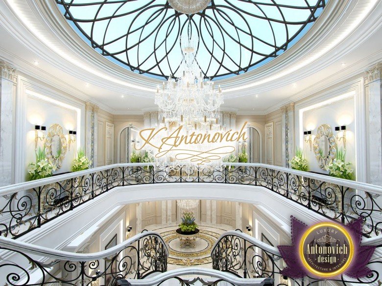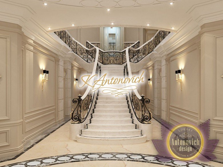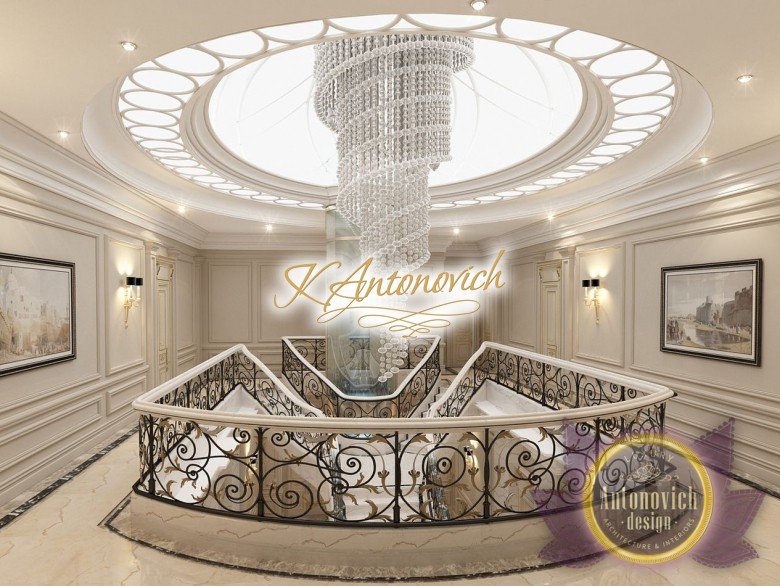 Architectural designs are often closely linked to the interior design. And in the early stages of the architectural design development, the planning of the future interior and its important points take place. This luxury villa interior reflects fashion trends in a classic style. It absorbed the romance of palatial luxury of France, the English nobility and charm of a festive mood. Rounded shapes of a hall became major moments in solutions regarding the interior design elements and the space organization. The floor in the villa interior is decorated with precious marble with exquisite geometric patterns. The center of the composition is decorated with a charming round table with a marble top and a crystal base. To set a festive mood, the interior designers use in the ceiling decoration, an elegant luxury chandelier. This underlines modern classic motifs in the interior, as well as stucco decoration with geometric motifs. In the hall design, the authors use a time-tested method of a mirroring reflexion. Two luxurious console tables on carved legs and mirrors in gold frames like reflecting each other. It gives the interior integrity and expressiveness. This composition with the luxury floor, ceiling and wall decorations becomes an excellent prelude to the main decoration. And the main decoration has become a luxurious staircase that leads to the second floor. The white marble stands out in the background of the muted walls. A polished balustrade with elements of gilding emphasizes the respectability of the interior.