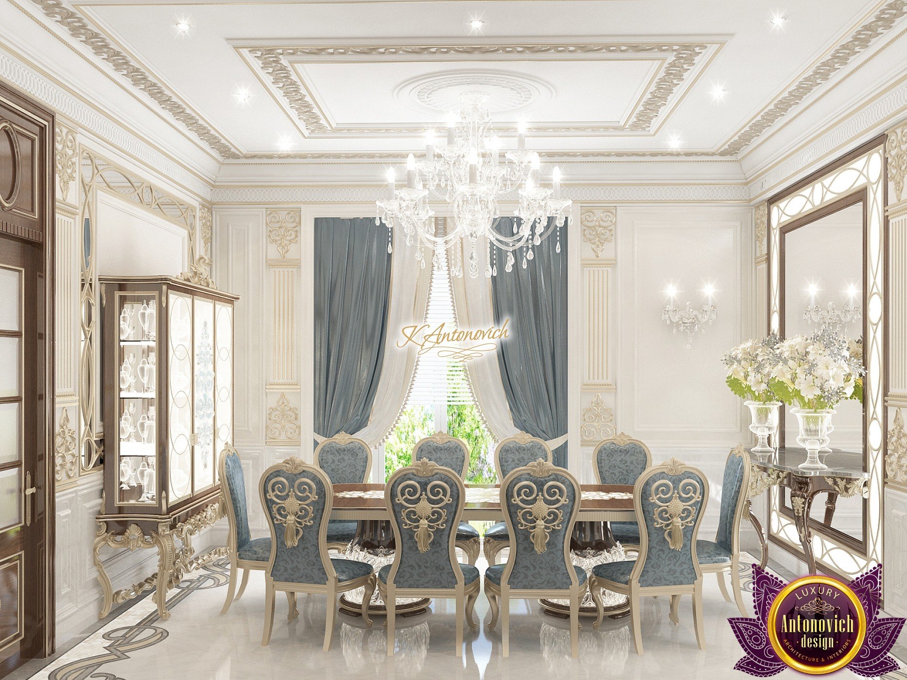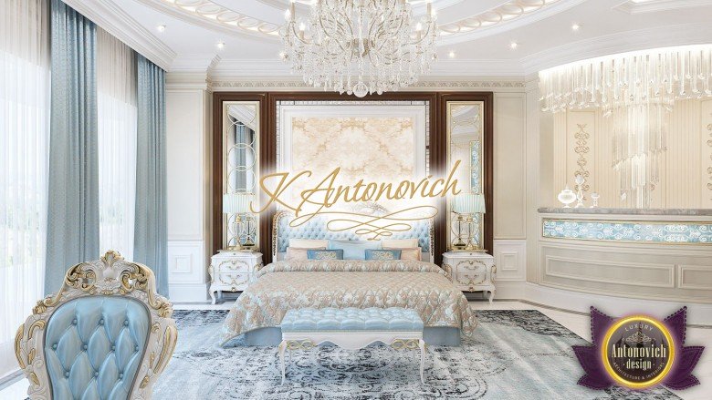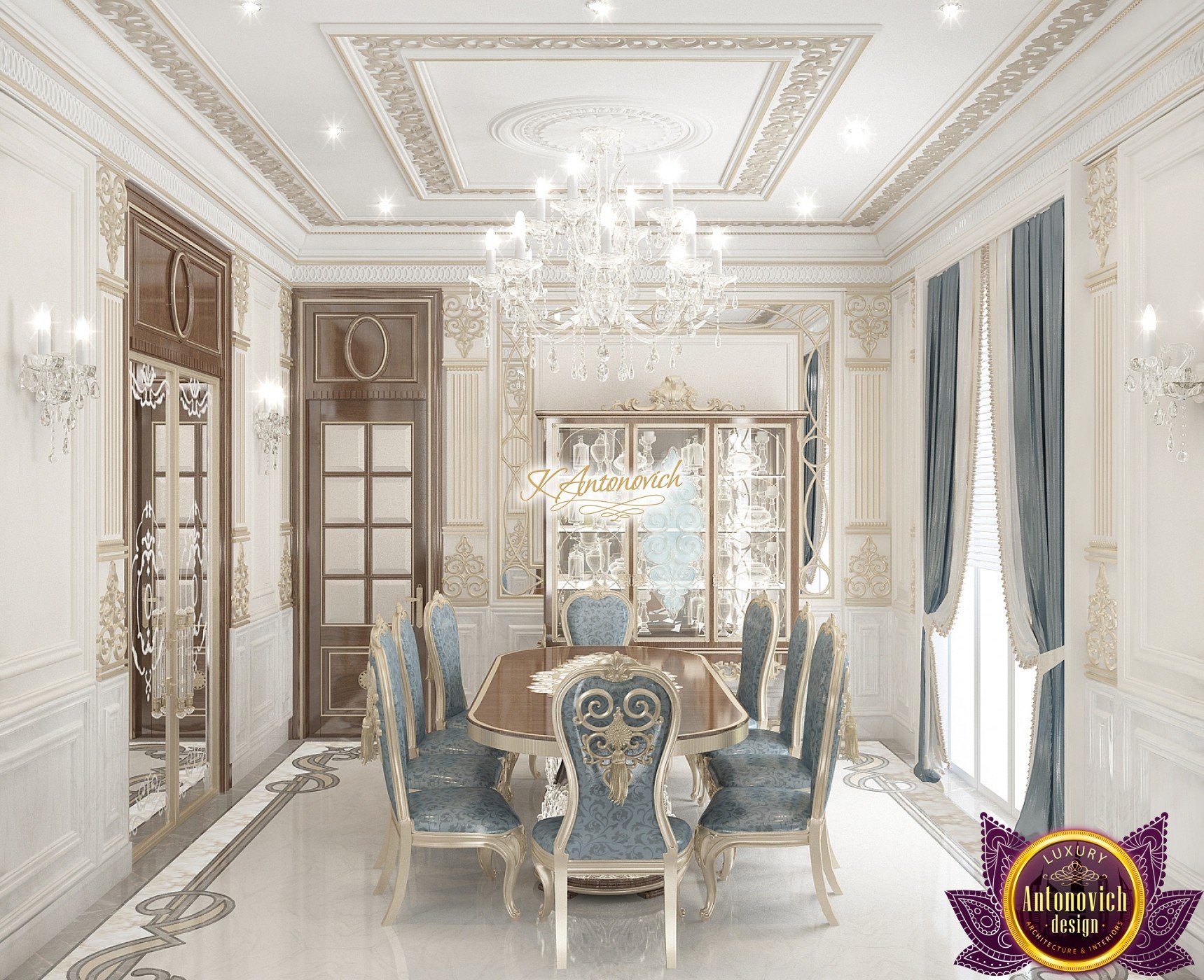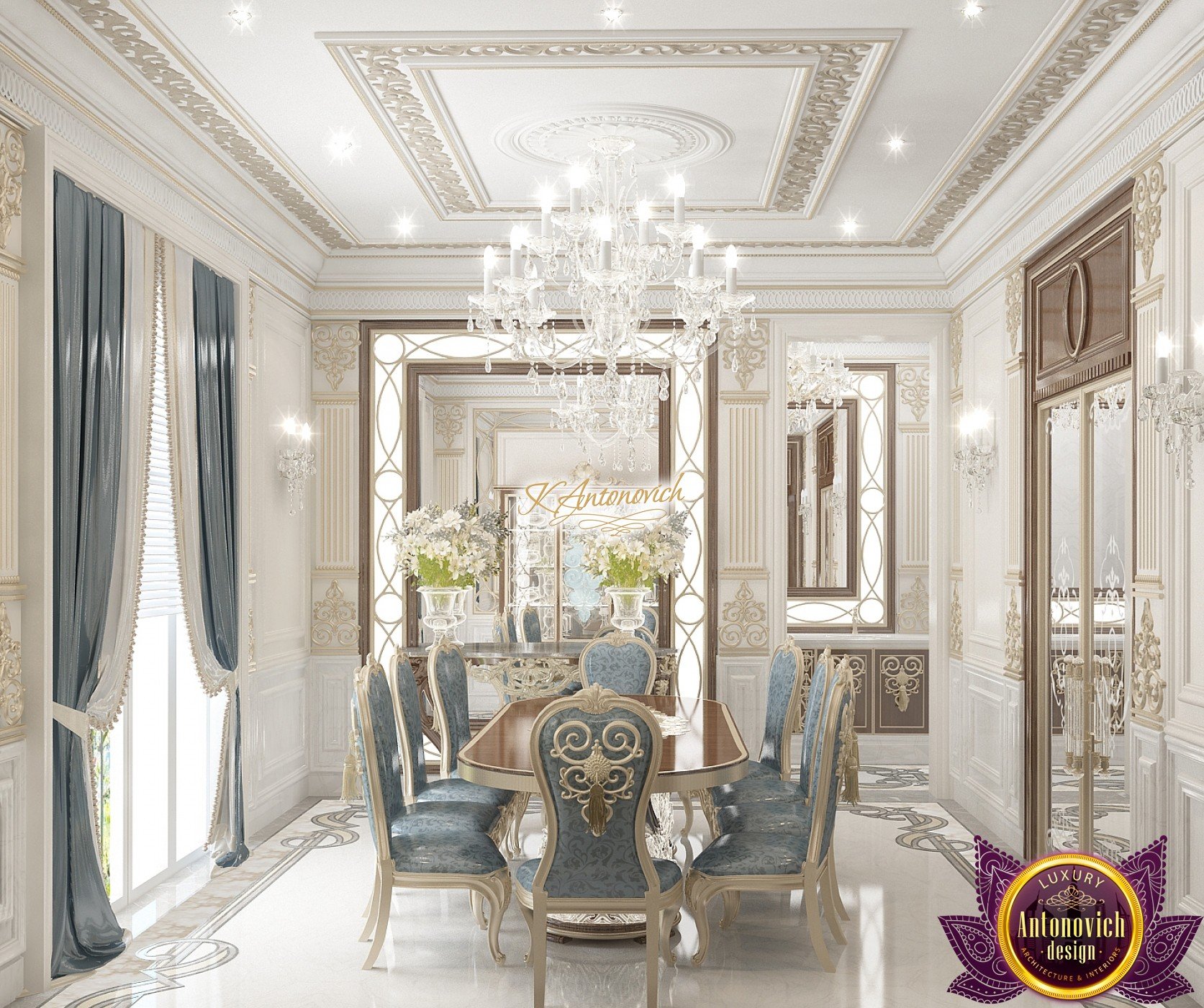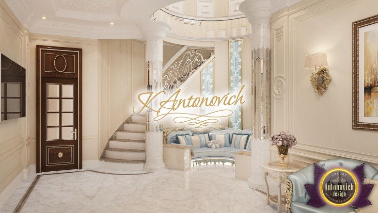 house interior has a very bright and easy nature. The first floor of the house - it is an open space, were very harmoniously combined living and dining hall. To visually zoning the interior, authors of the project proposed an original decor floors and ceiling. Floors made of white marble are multilevel. The dining room is elevated on a podium. And from the hall to the living room, you can go down by the semicircular marble steps. Blue curtains of silk became an excellent way to complement the interior expressiveness in the shining snow-white tones. The interior of the hall and dining room, interior designers offered an interesting way to expand the space. Such a method are frequently used in simple house plans. By using mirrors, which are opposite each other, it turns a beautiful illusion of infinity of the luxury interior. The luxury villa is full of romantic festive atmosphere and gives very pleasant emotions.