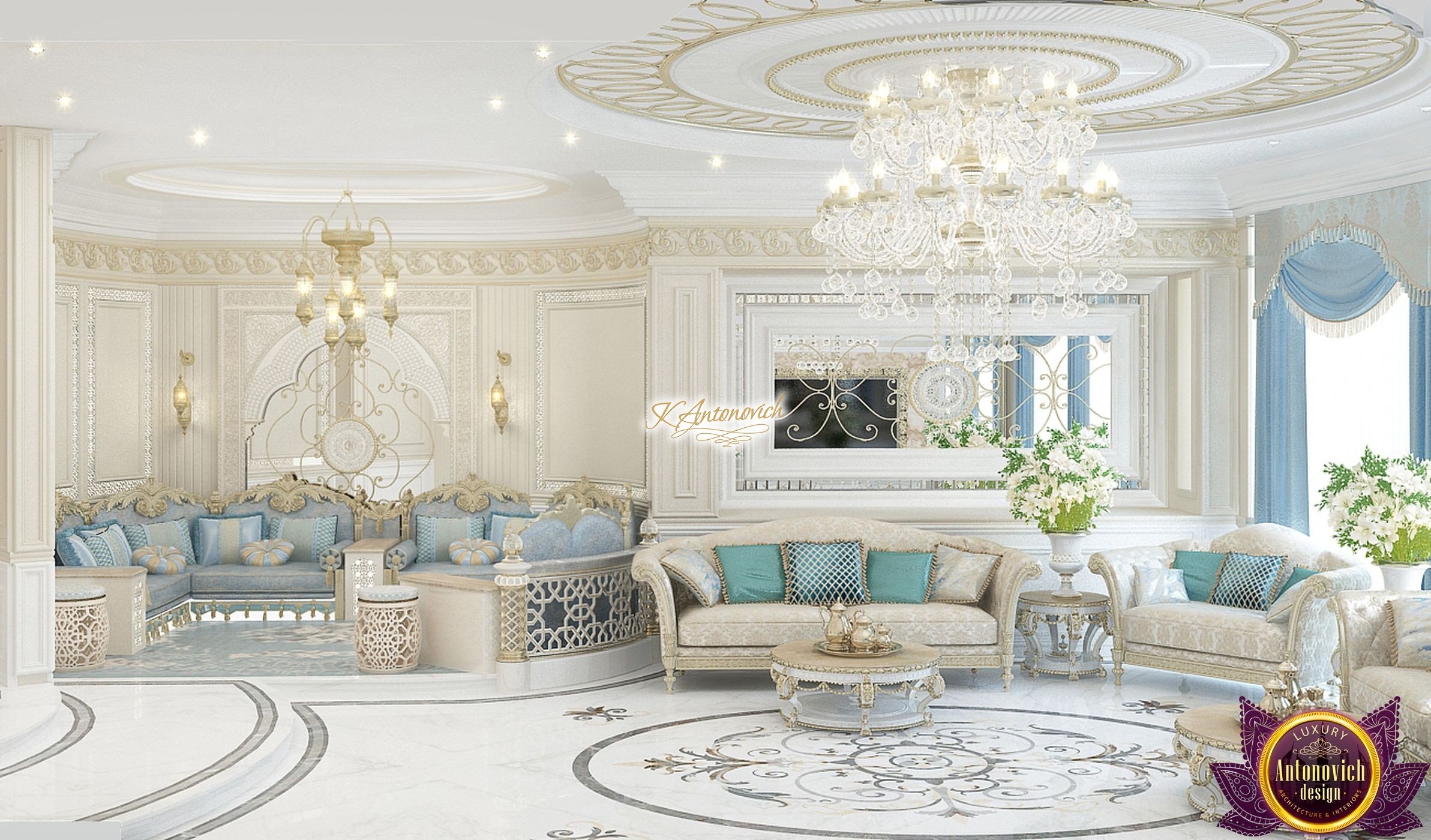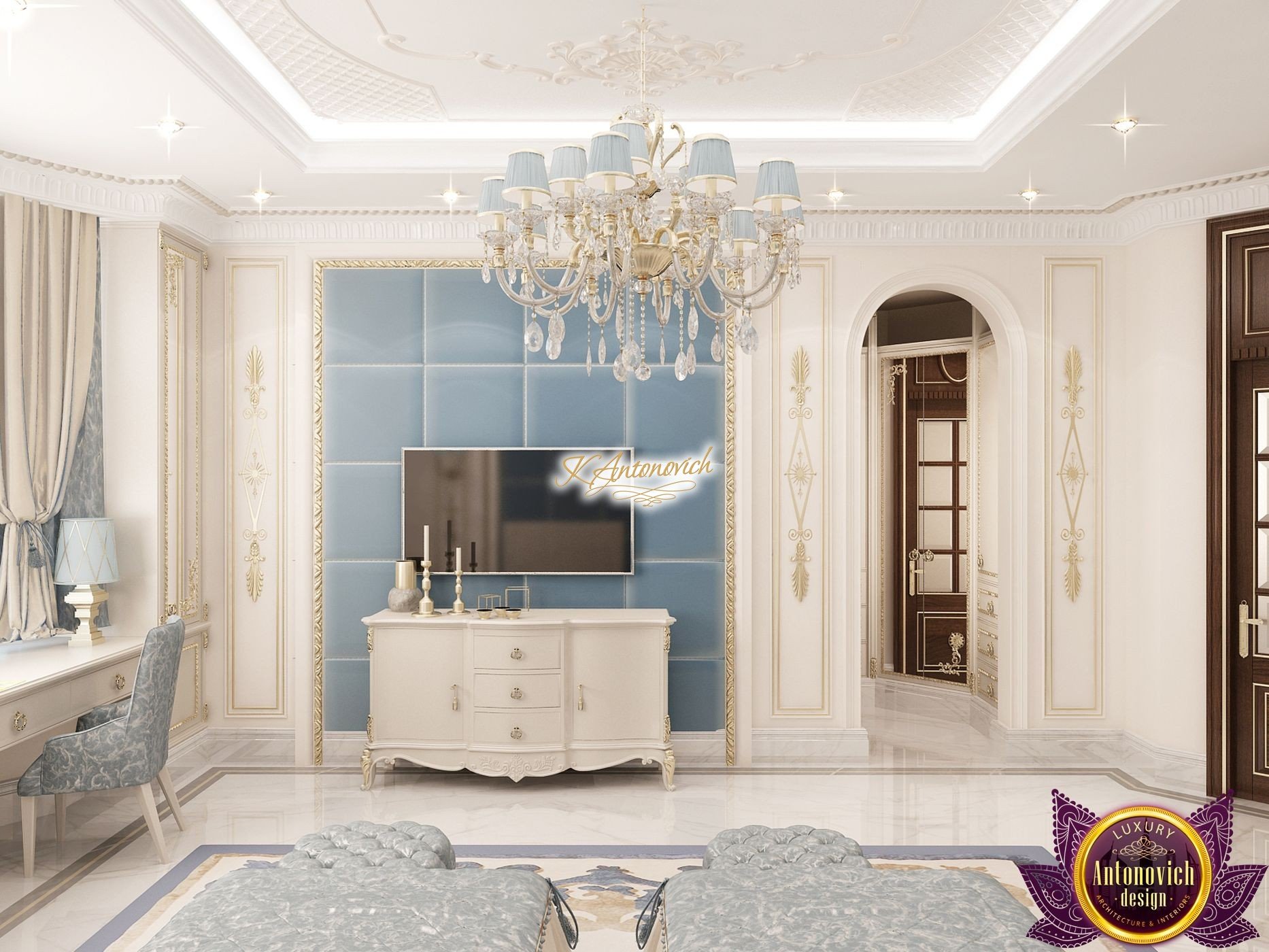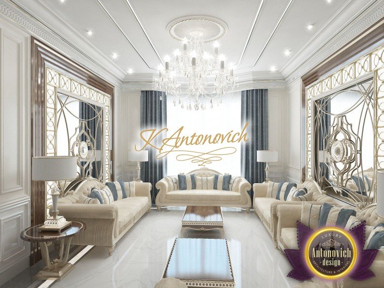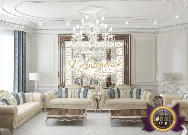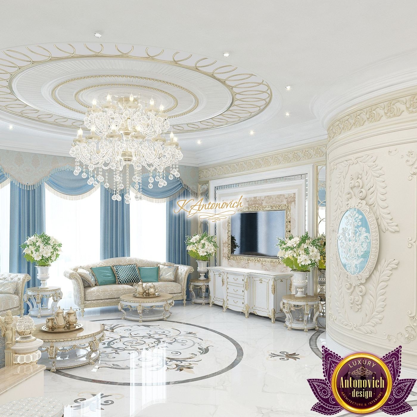house interior has a very bright and easy nature. The first floor of the house - it is an open space, were very harmoniously combined living and dining hall. To visually zoning the interior, authors of the project proposed an original decor floors and ceiling. Floors made of white marble are multilevel. The dining room is elevated on a podium. And from the hall to the living room, you can go down by the semicircular marble steps. Blue curtains of silk became an excellent way to complement the interior expressiveness in the shining snow-white tones. The interior of the hall and dining room, interior designers offered an interesting way to expand the space. Such a method are frequently used in simple house plans. By using mirrors, which are opposite each other, it turns a beautiful illusion of infinity of the luxury interior. The luxury villa is full of romantic festive atmosphere and gives very pleasant emotions.