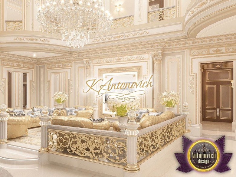 The grand greatness of the interior with royal charm miraculously combines a cozy mood. The upper terrace is limited balustrades with stained glass . From this part of the house starts spectacular view on the living room. In the center of the room is a large round fountain. It's complemented by house plants and lighting. Fountain has the carved pattern of natural marble. This new perspective on luxury and comfort in luxury real estate.