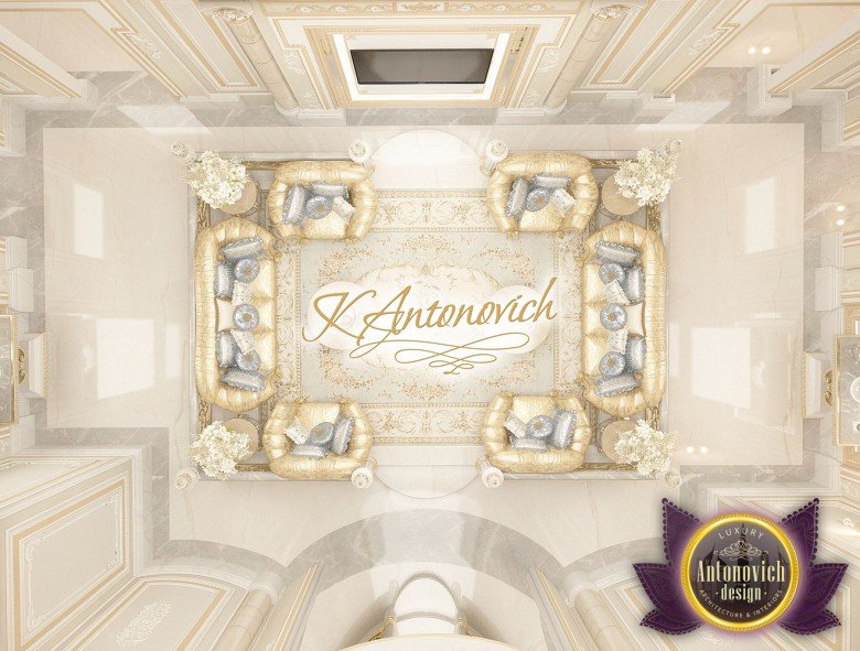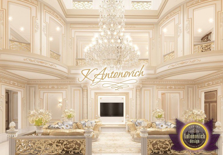 The upper floors are hidden from view. Rounded stair portals elegantly extending beyond the ceiling light. The most impressive in the interior is very bright and easy mood. The dominant cream tint complemented by backlighting of ceilings, furniture, and each stair. For the floor decor, Dubai interior designers have offered the white marble. And in the wall design - decorative plaster muted cream tints. And the luxurious interior of the hall - it's just a prelude to the stunning interior of a huge living room. The height of the walls of the living room extends over the entire height of the building.