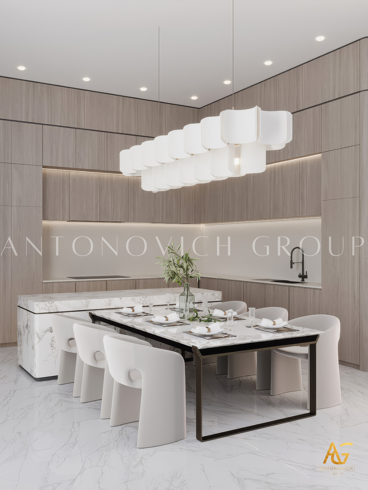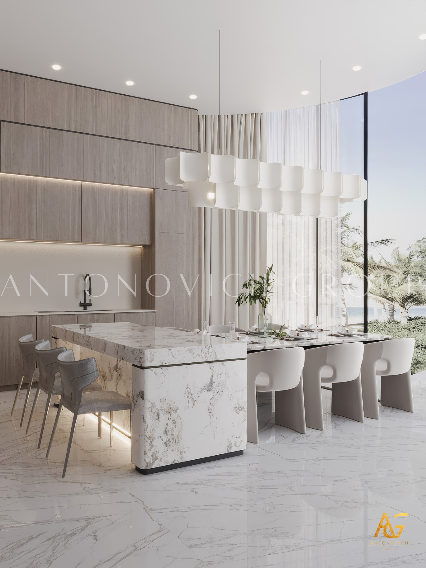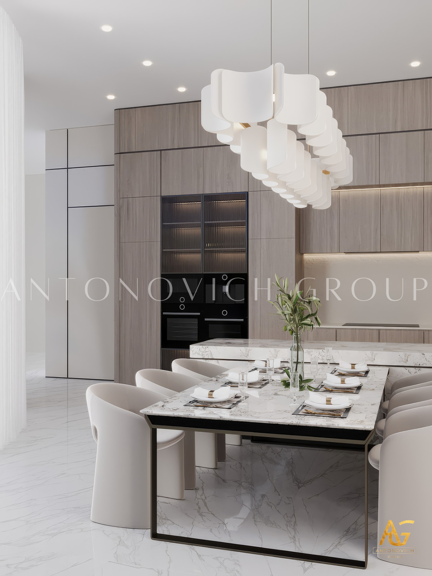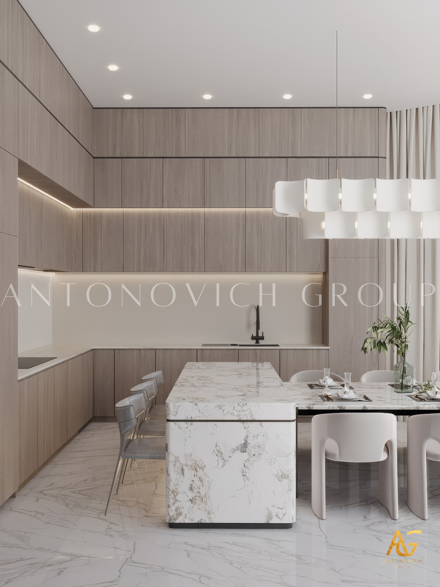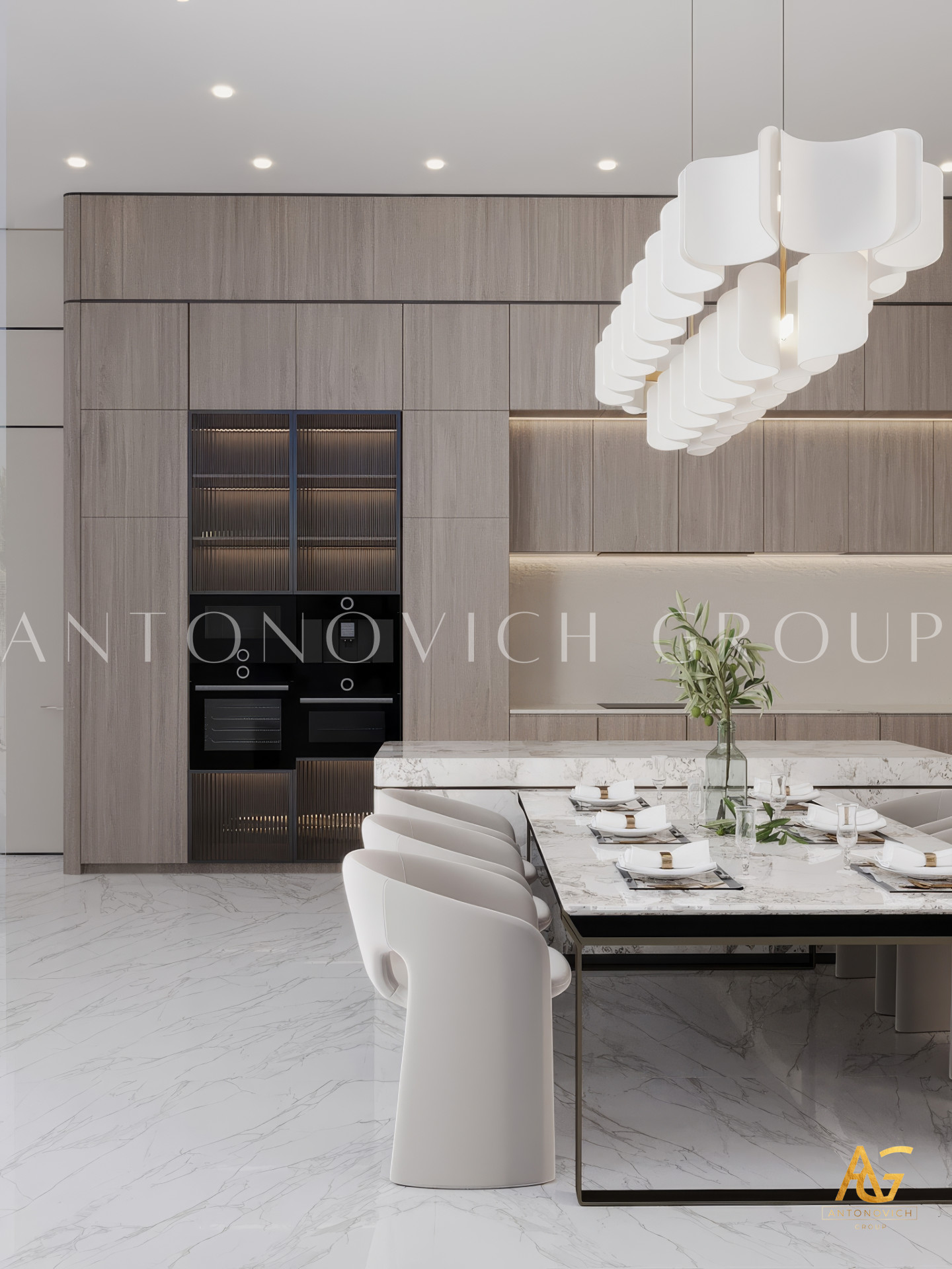 Our chief designer Katrina Antonovich built this wonderful kitchen – in a two-story villa construction. Our amazing team incorporated a neoclassical design with white, beige, and gold details. We were able to take advantage of our joinery skills because we also designed and built the cabinet that is installed in this kitchen. Customized and unique, these cabinets have carvings on them to keep up with the neoclassic interior. The ovens, sinks, and other appliances are all in built-in storage to keep the look of the kitchen uniformed and elegant. To keep the elegant look, we designed and paired the beige cabinetry with gold details that have a damask carving which reflects the art-deco design. We added a kitchen island which lets people have smaller meals like breakfast or snacks. The custom-designed kitchen counter is a strong statement in this kitchen design. We made sure that the interior would fit well in the structure of the house which is proportional to the entire kitchen. The kitchen originally has a high ceiling which is very important for the kitchen interior. Our designer created a fun statement, but still, maintained the classic characteristics of the home. Starting from the neutral walls, with bold splashes of gold, our team has combined a well balanced traditional and modern look. This kitchen is a large proportion which makes it easy to install all the necessary components to give it a full look.
