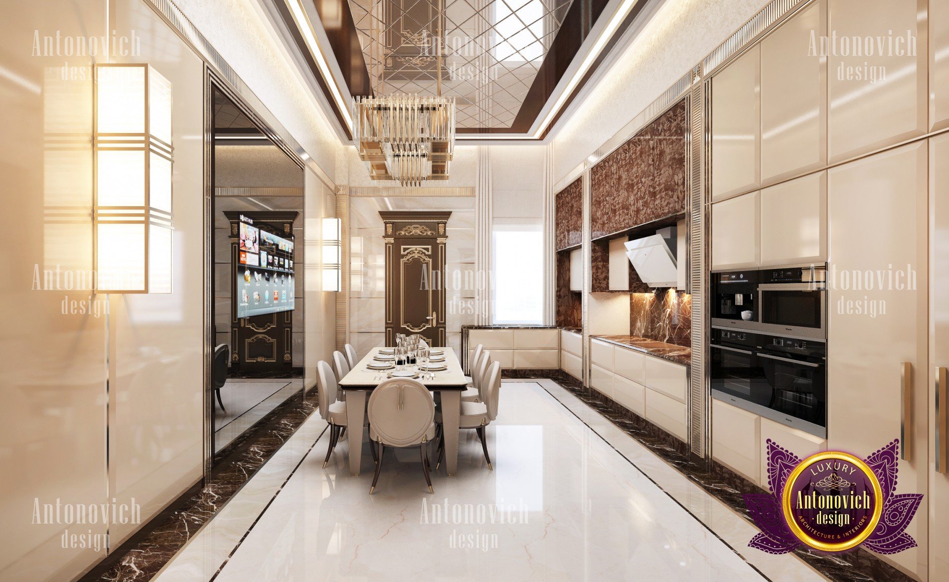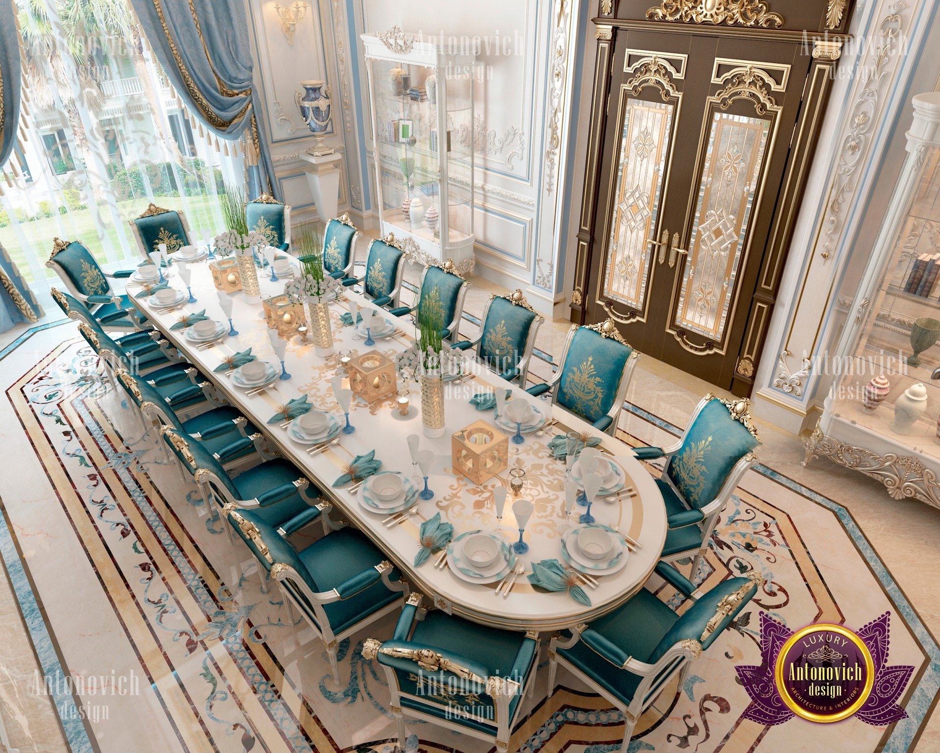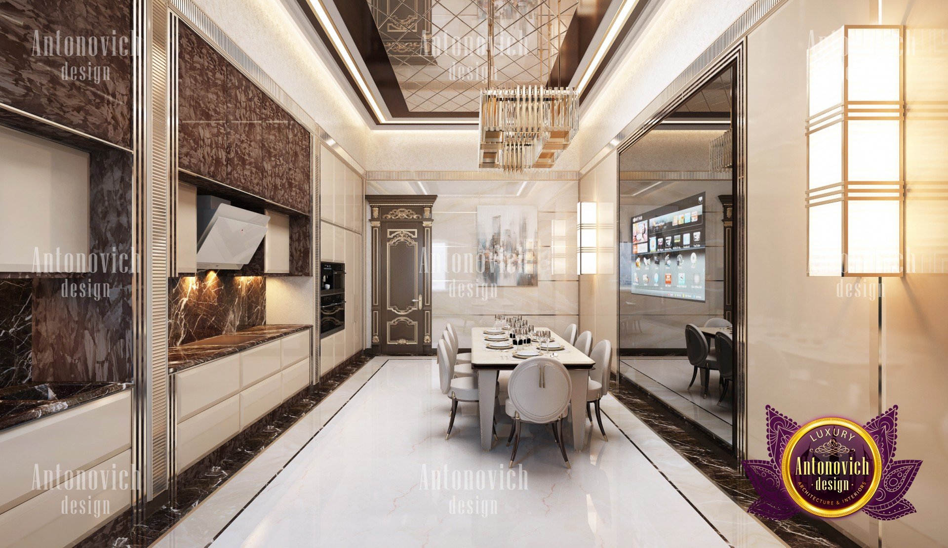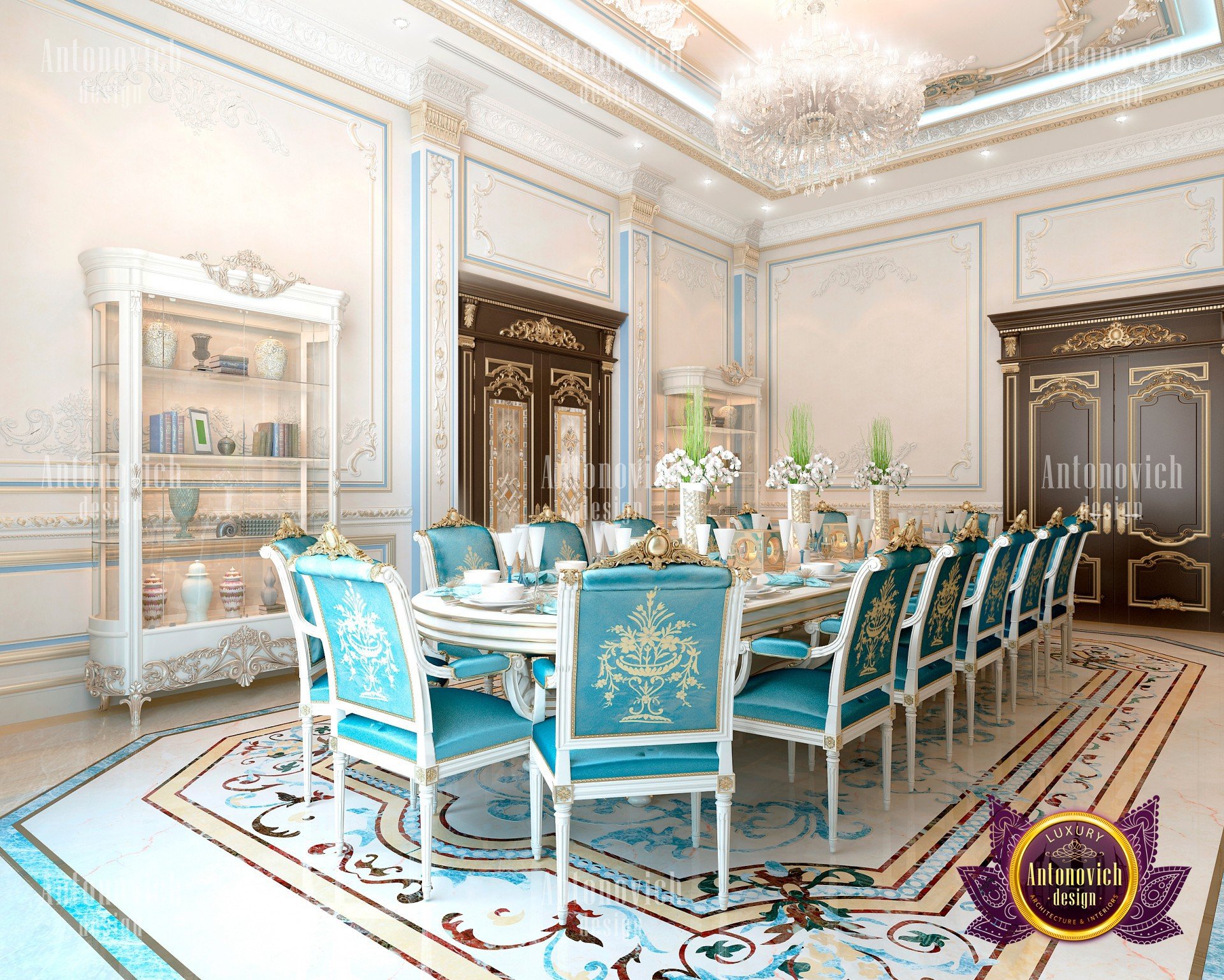 The brilliant Royal living room interior design Saudi Arabia of Luxury Antonovich Design have created a concept where luxury meets premiums in this luxury villa Royal living room interior design Saudi Arabia in Riyadh. The city is a laid-back place, and having an Royal living room interior design Saudi Arabia like this will set you apart from the crowd. With their lovely elegant detailing, the exquisite cabinets and television rack are stunning. The chandelier is whimsical, giving it an abstract appearance. The center table and sofa allow ample opportunity for conversation and bonding. An elegant dining room connects the living room in the luxury villa Royal living room interior design Saudi Arabia. From the flooring to the staircase, several tones of green were incorporated. The stunning cream color in the luxury villa Royal living room interior design Saudi Arabia offers an accent color to the beautiful room. The gorgeous hue brown is also paired with green in the kitchen, giving the premium luxury villa Royal living room interior design Saudi Arabia a unique twist. The eating space is similarly decorated in a brown motif, which is really attractive. The room is further enhanced by the presence of nature. The large wall in the kitchen are a lovely accent to the otherwise opulent space. It is, without a doubt, a luxury villa Royal living room interior design Saudi Arabia.