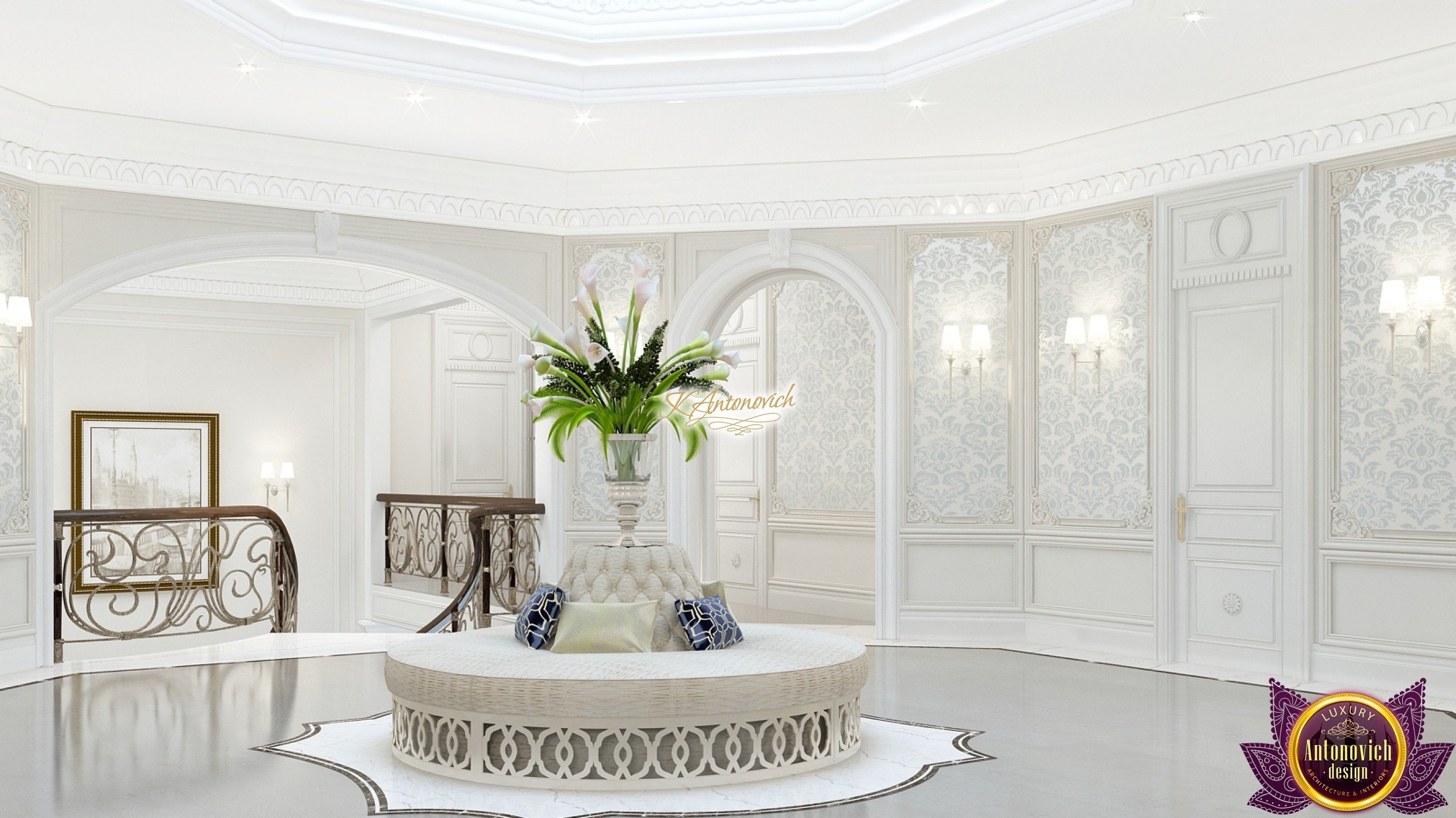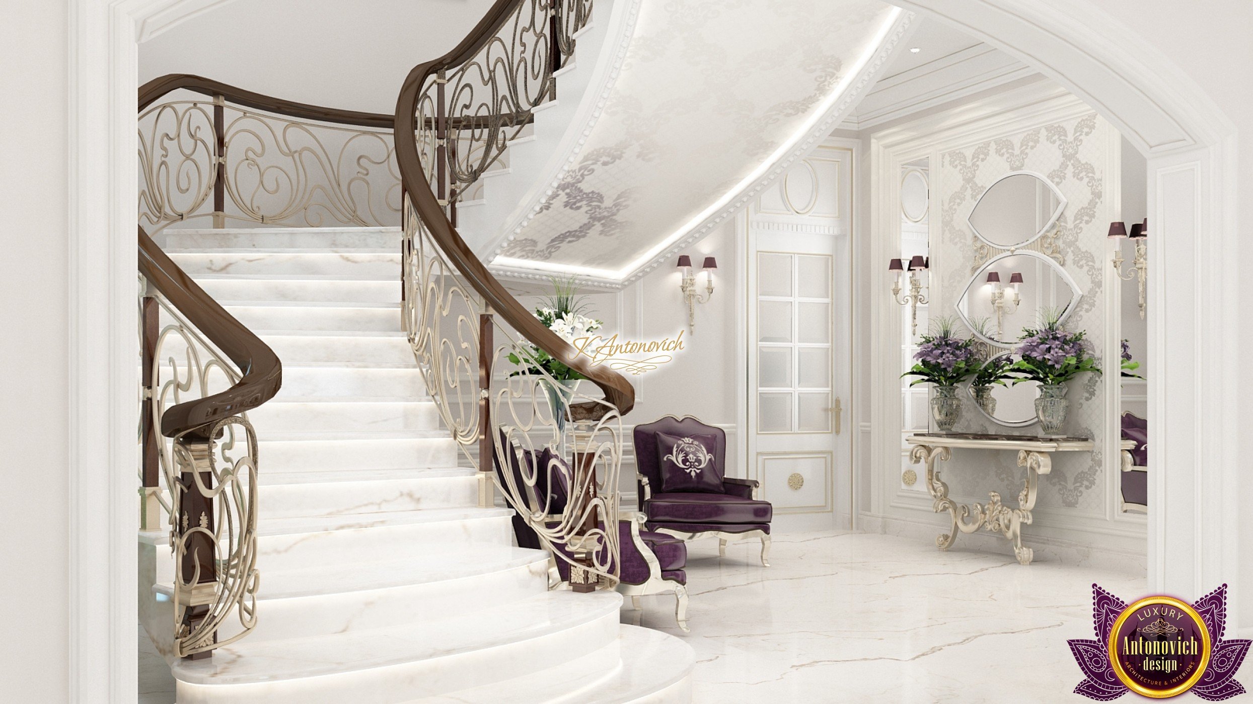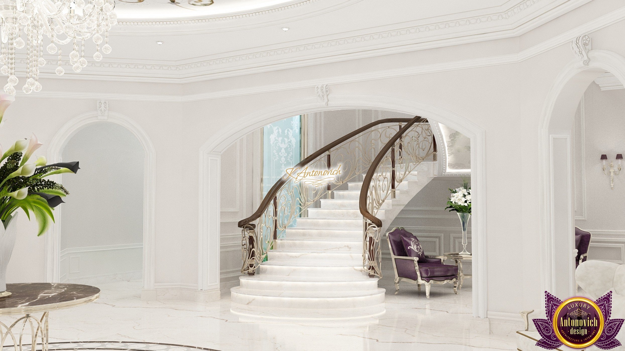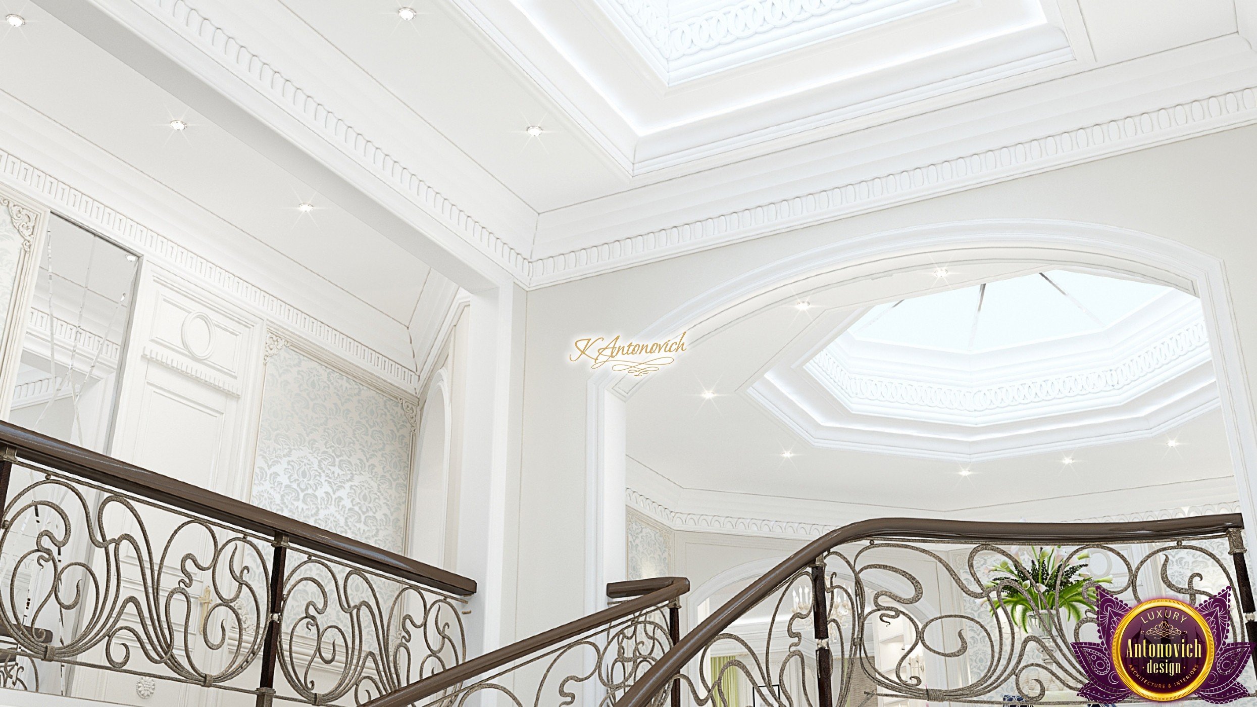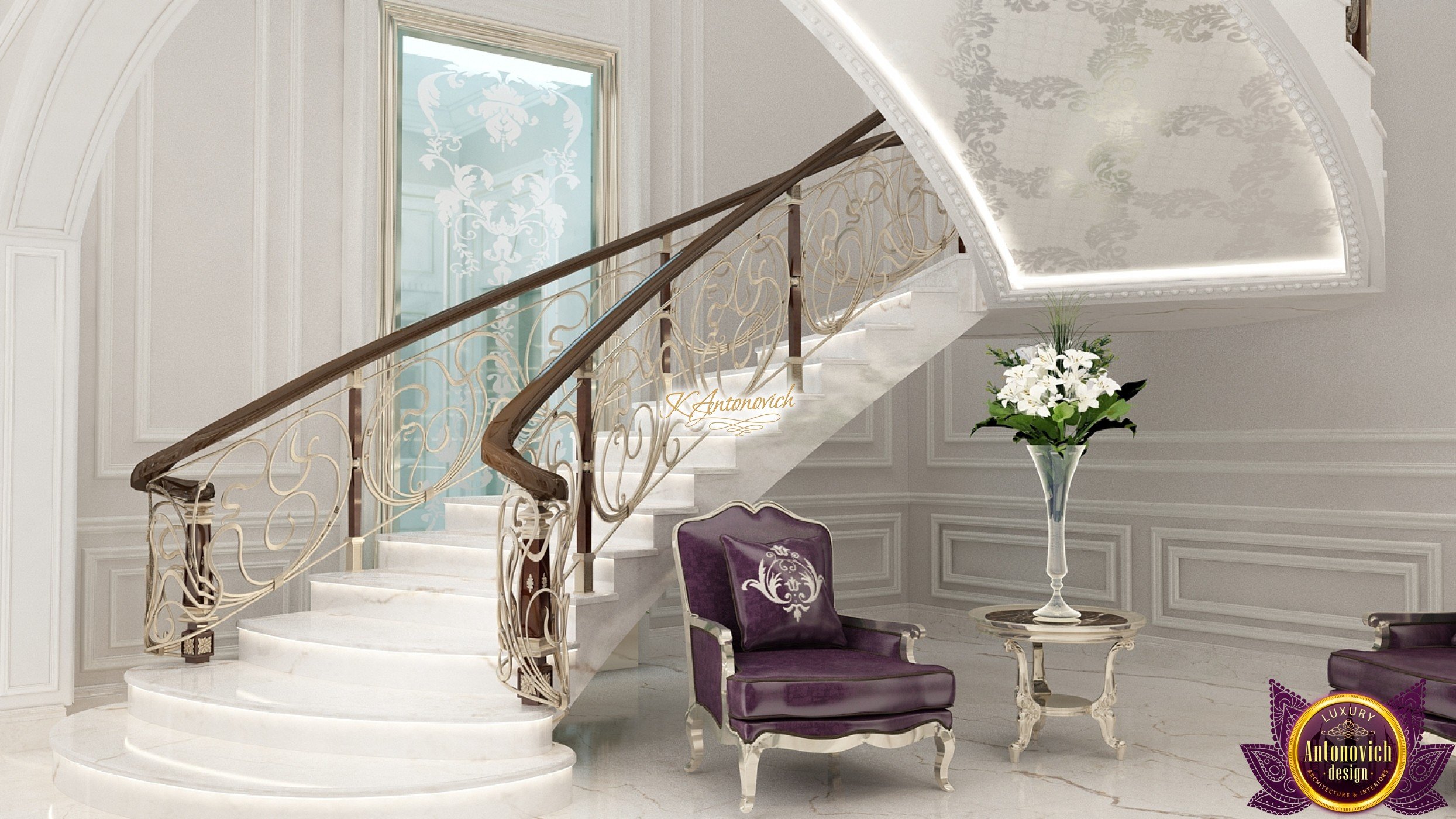 The double staircase, which leads to the upper floors of the villa, reflects perfect symmetry. A gilded wrought-iron balustrade complements its graceful contours with a handrail of oaky dark wood. This gives an artistic expression to the composition of the design. The Hall shines with pure beauty, in the walls decor, the main decorations are vertical stained glass windows with abstract ornaments made of brass. The stained glass windows extend almost to the entire height of the building, and they emphasize the luxury and artistic interior values. Fantastic Tiffany stained glass windows on the ceiling reflect similar patterns, as on the marble floor.