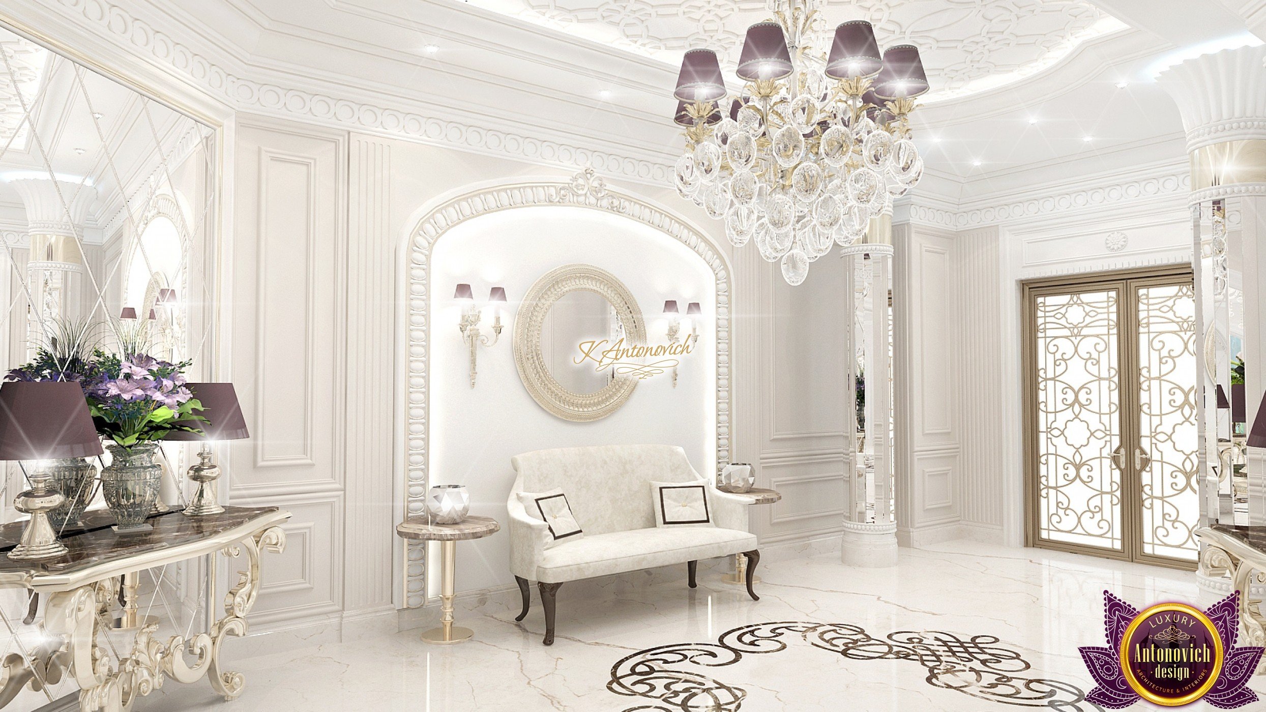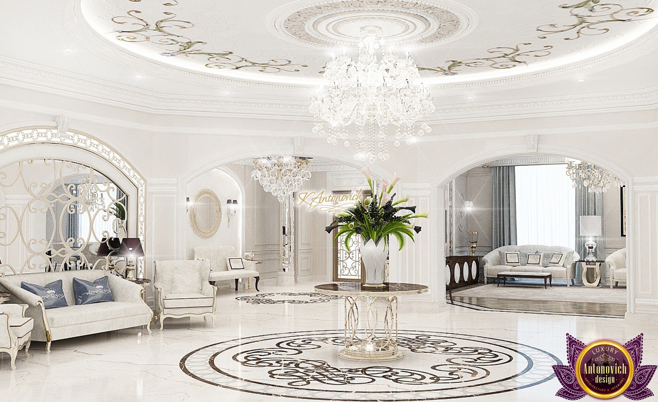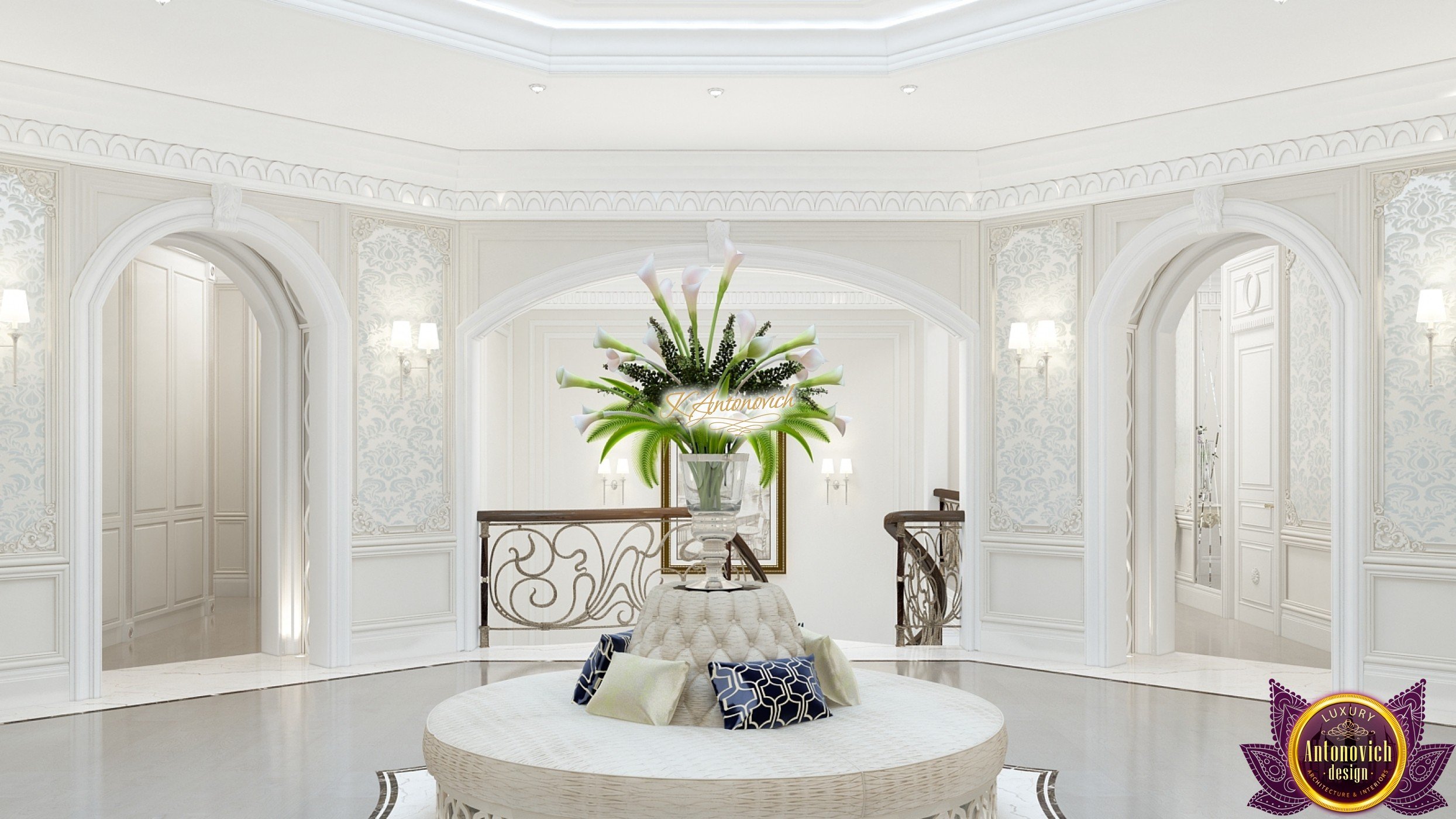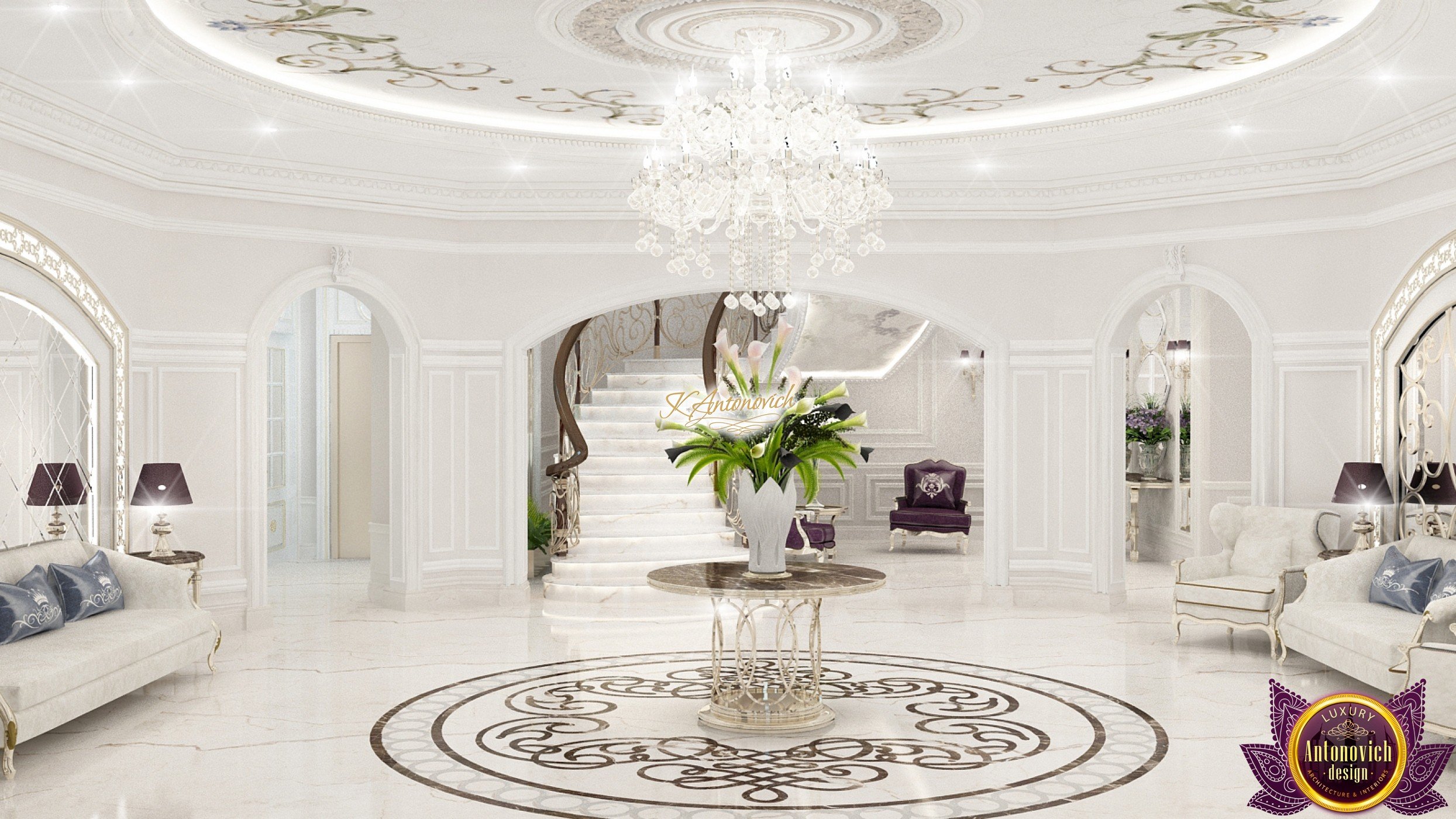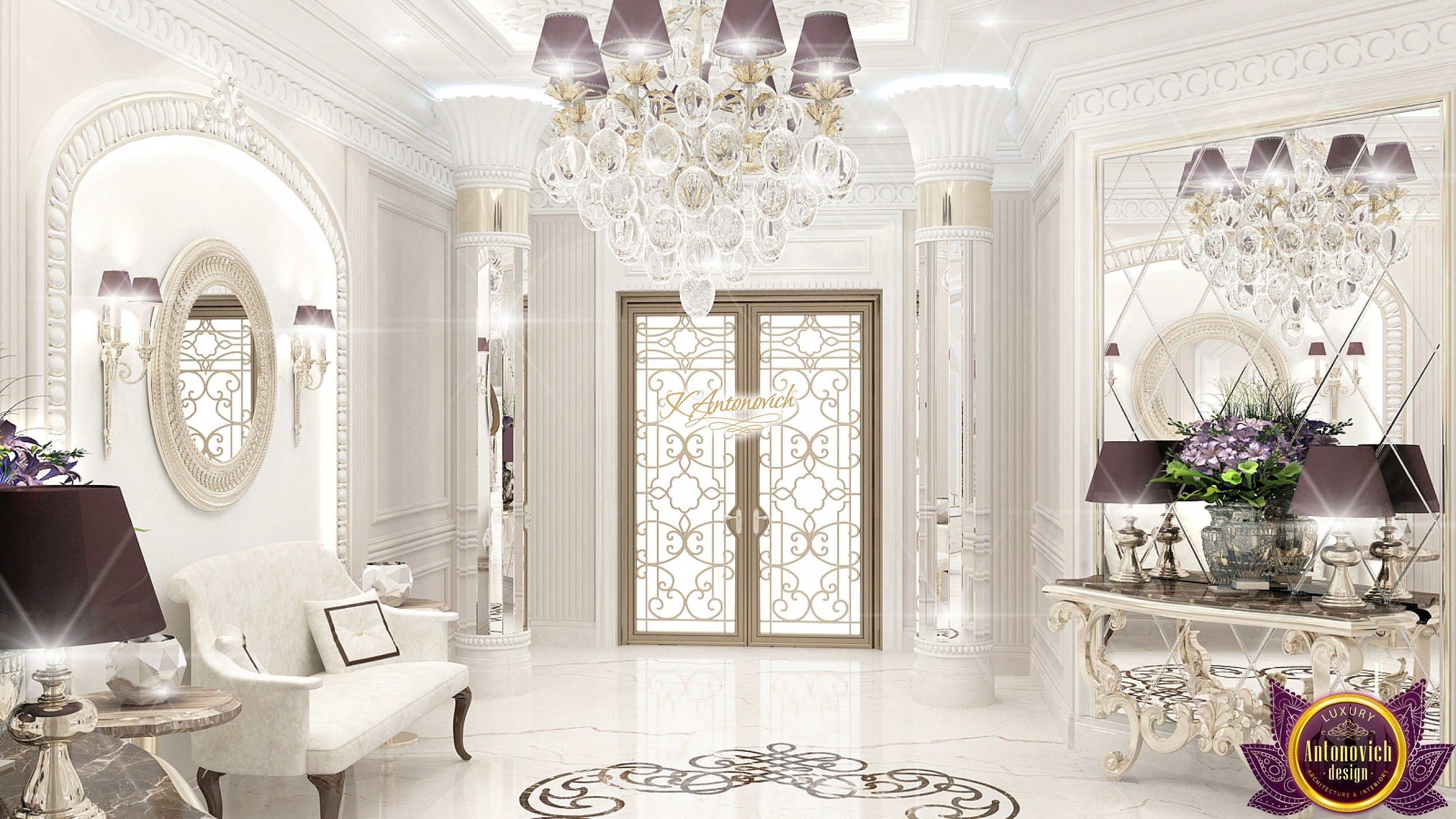 The double staircase, which leads to the upper floors of the villa, reflects perfect symmetry. A gilded wrought-iron balustrade complements its graceful contours with a handrail of oaky dark wood. This gives an artistic expression to the composition of the design. The Hall shines with pure beauty, in the walls decor, the main decorations are vertical stained glass windows with abstract ornaments made of brass. The stained glass windows extend almost to the entire height of the building, and they emphasize the luxury and artistic interior values. Fantastic Tiffany stained glass windows on the ceiling reflect similar patterns, as on the marble floor.