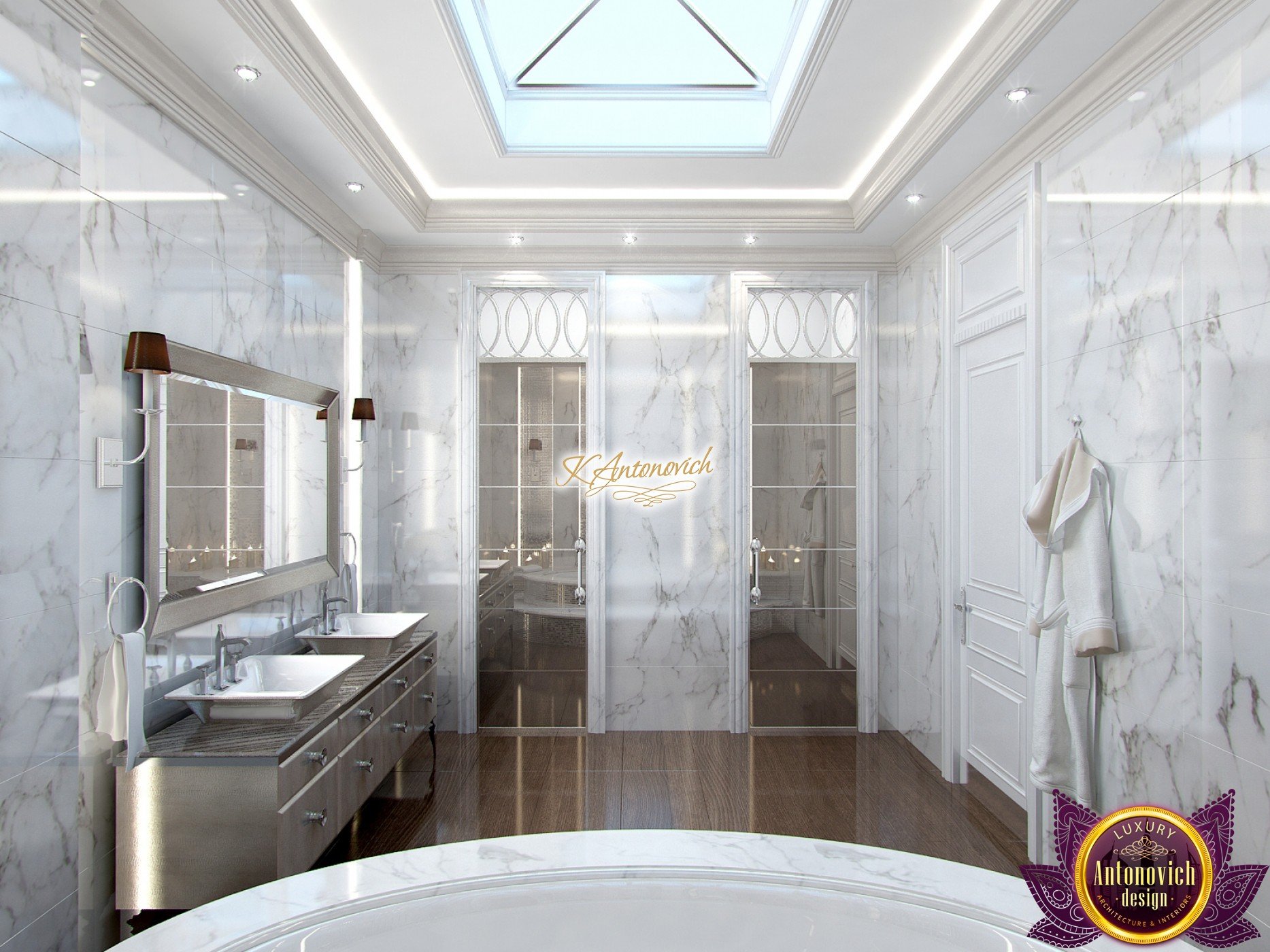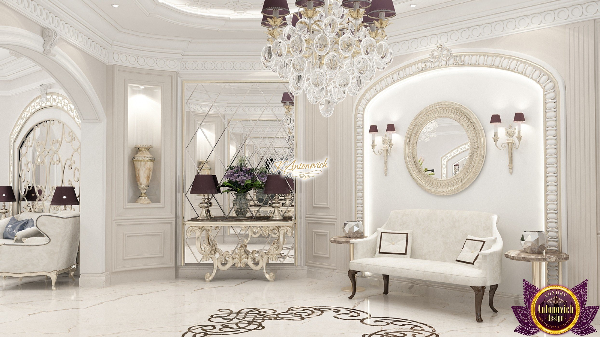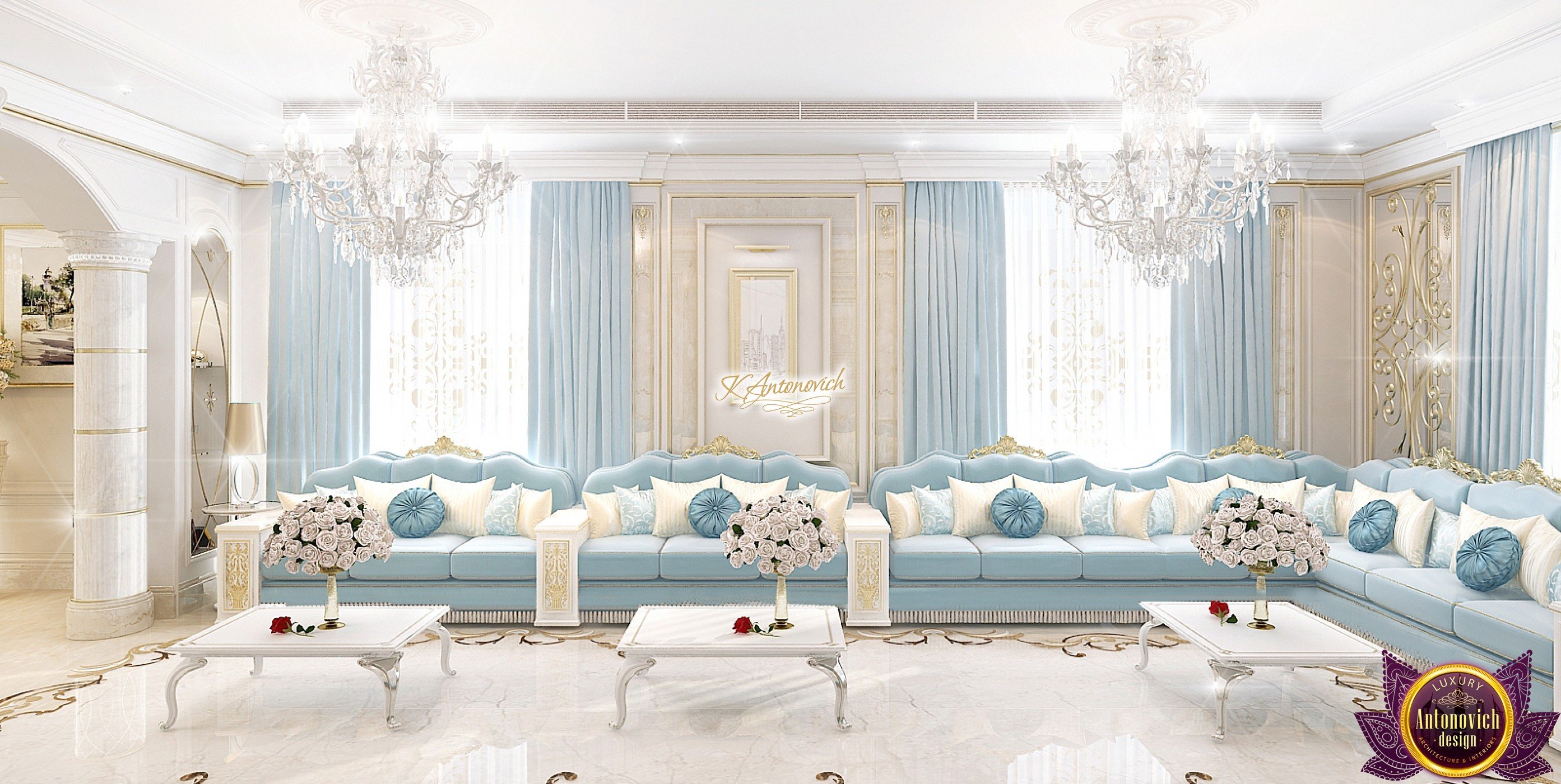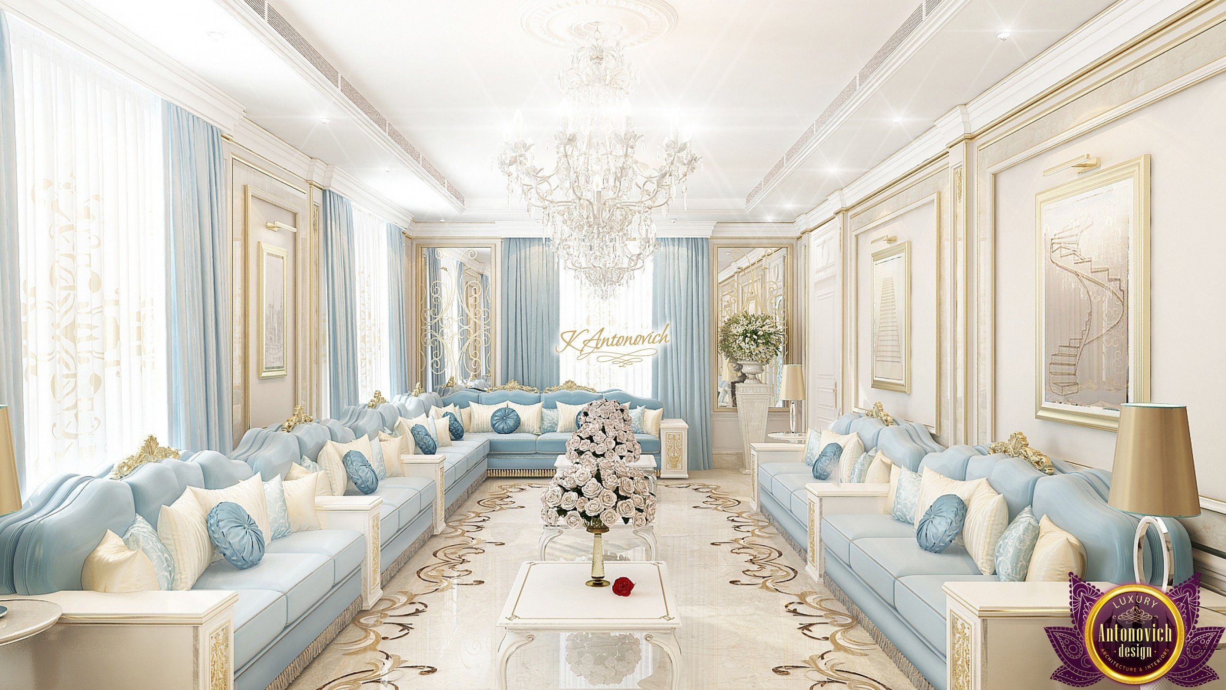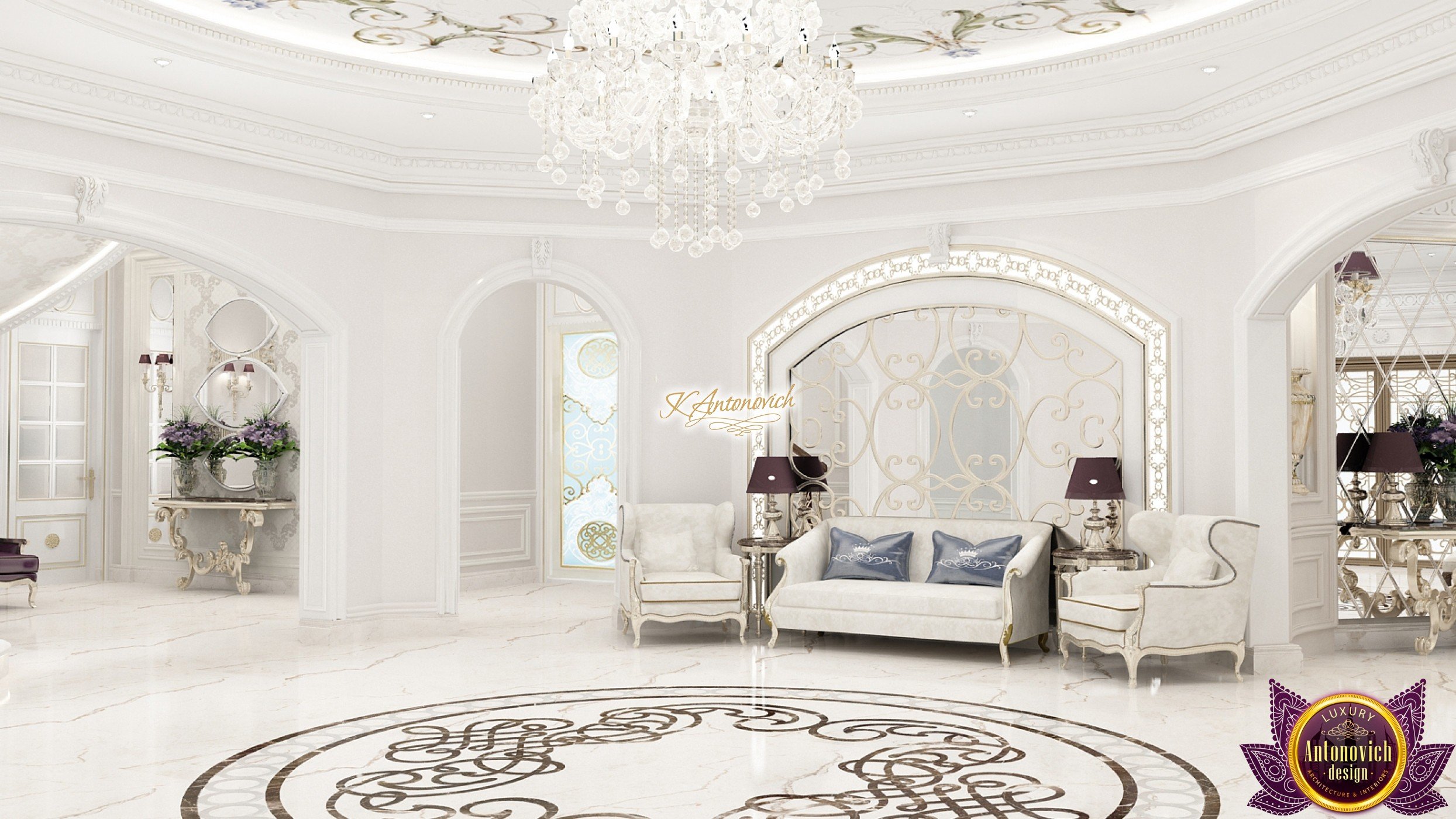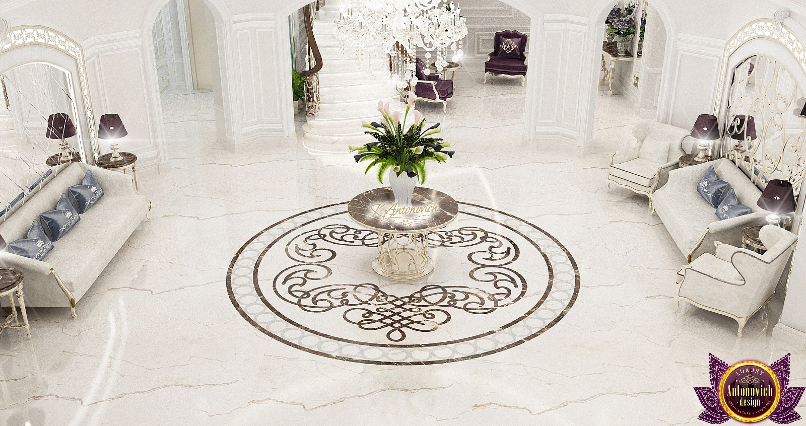 The double staircase, which leads to the upper floors of the villa, reflects perfect symmetry. A gilded wrought-iron balustrade complements its graceful contours with a handrail of oaky dark wood. This gives an artistic expression to the composition of the design. The Hall shines with pure beauty, in the walls decor, the main decorations are vertical stained glass windows with abstract ornaments made of brass. The stained glass windows extend almost to the entire height of the building, and they emphasize the luxury and artistic interior values. Fantastic Tiffany stained glass windows on the ceiling reflect similar patterns, as on the marble floor.
