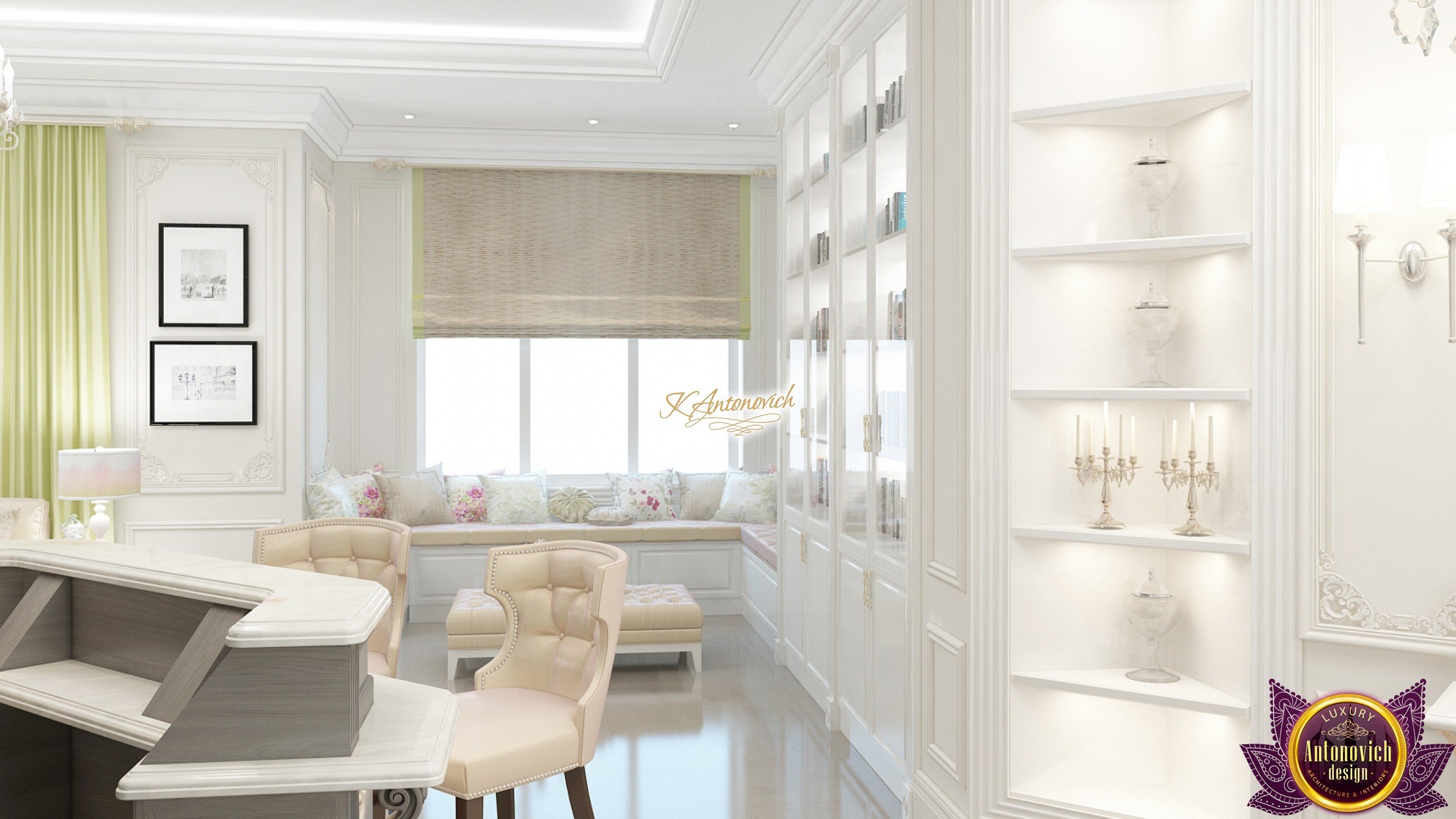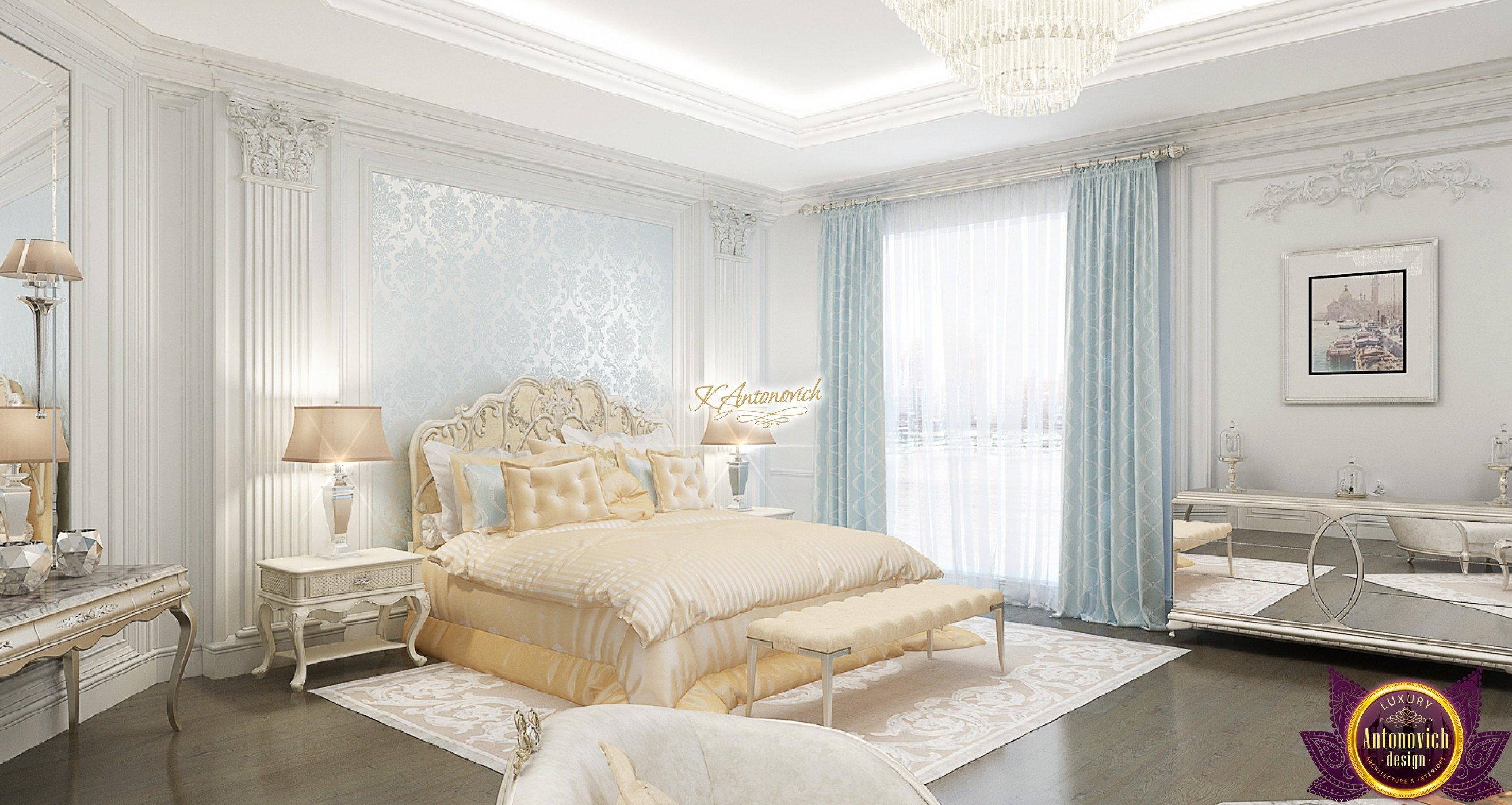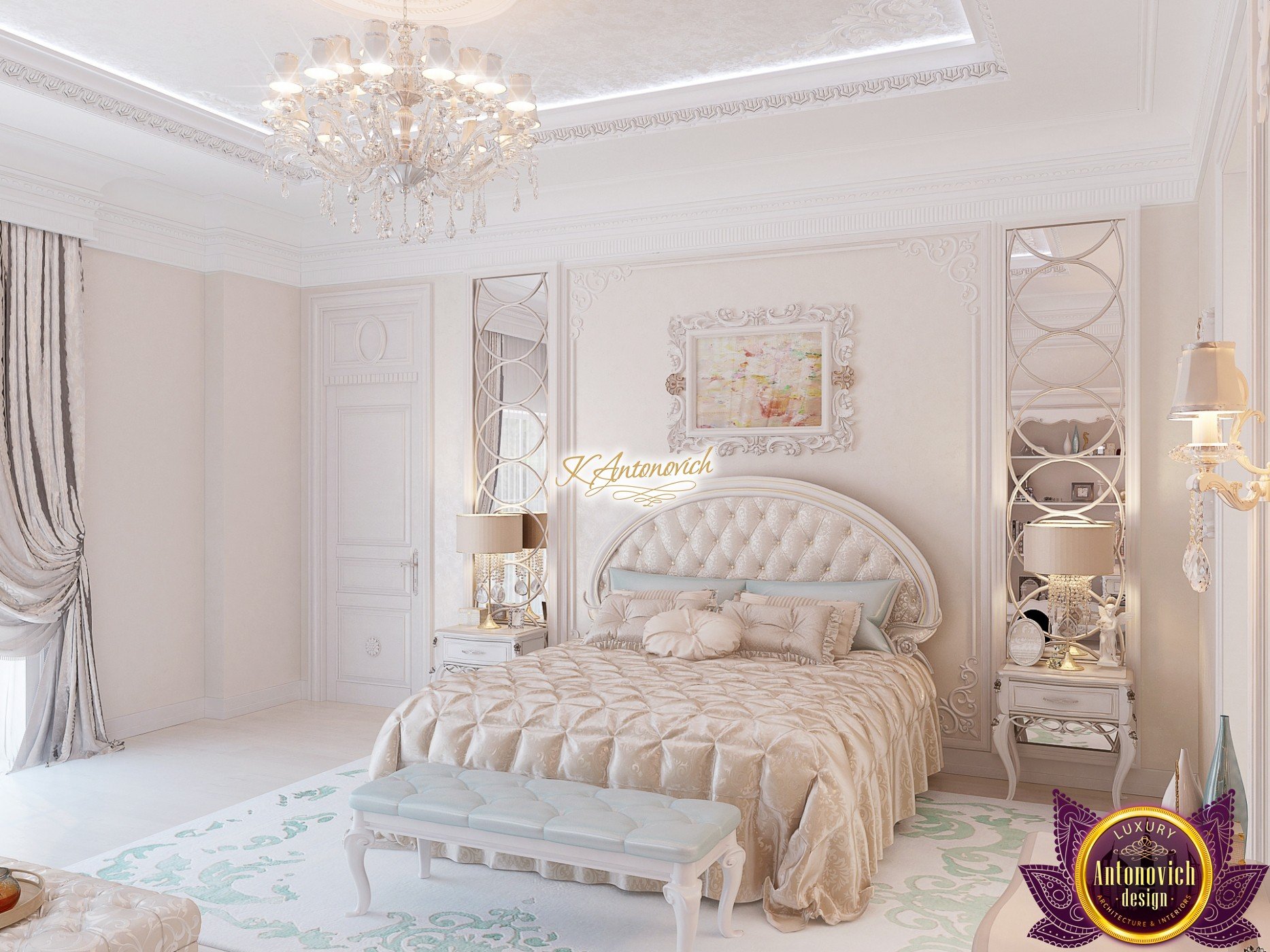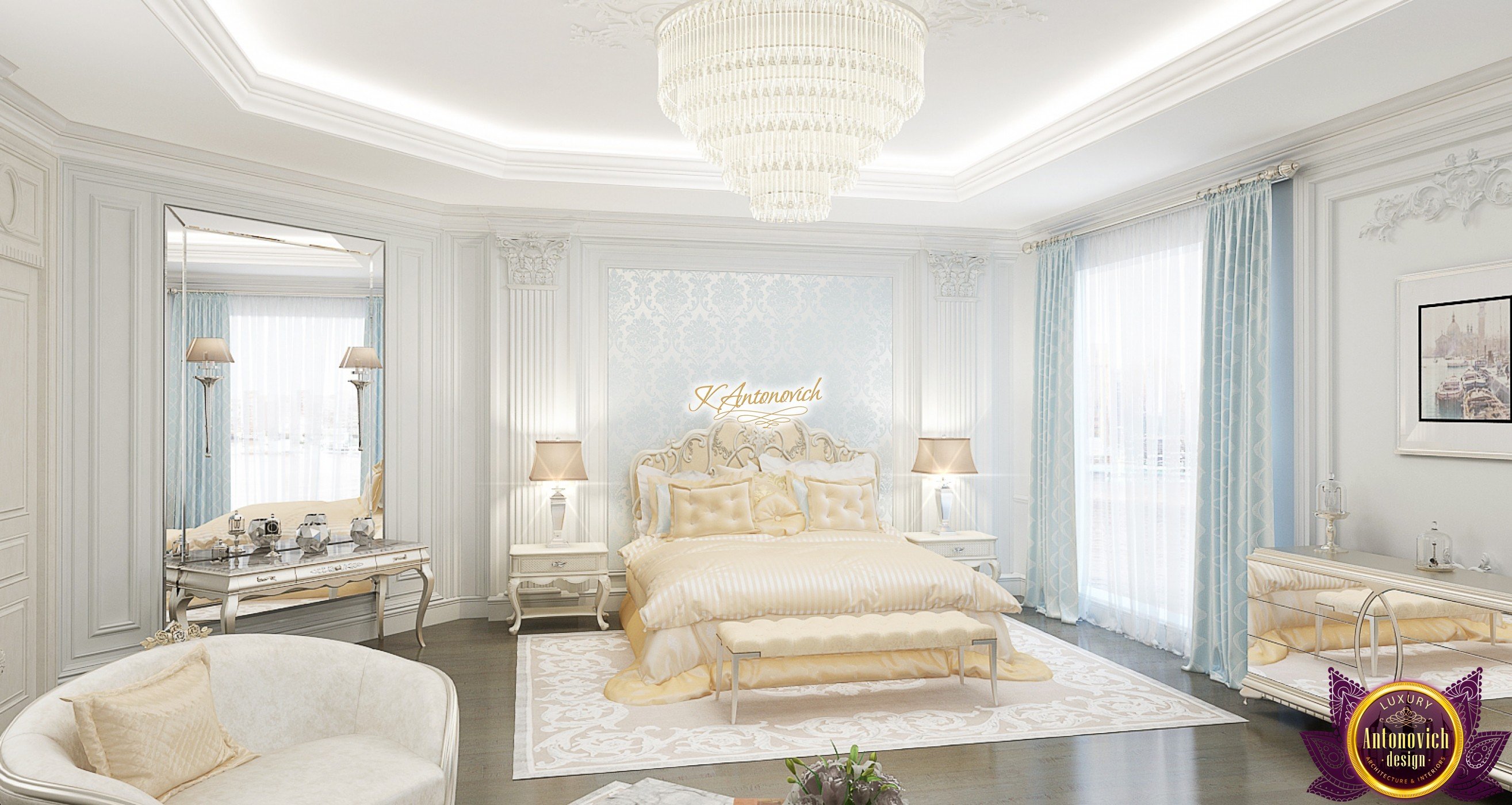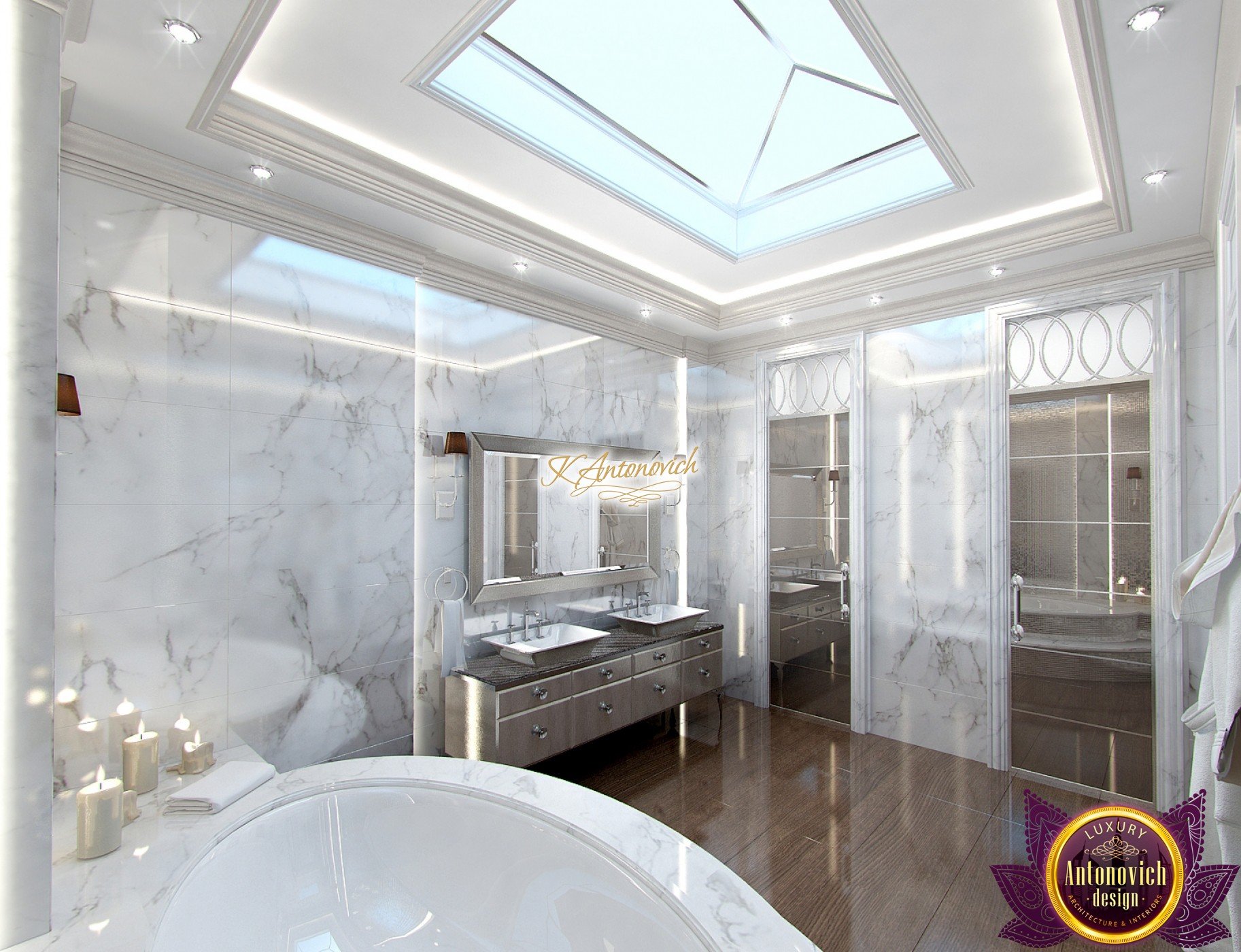 The double staircase, which leads to the upper floors of the villa, reflects perfect symmetry. A gilded wrought-iron balustrade complements its graceful contours with a handrail of oaky dark wood. This gives an artistic expression to the composition of the design. The Hall shines with pure beauty, in the walls decor, the main decorations are vertical stained glass windows with abstract ornaments made of brass. The stained glass windows extend almost to the entire height of the building, and they emphasize the luxury and artistic interior values. Fantastic Tiffany stained glass windows on the ceiling reflect similar patterns, as on the marble floor.