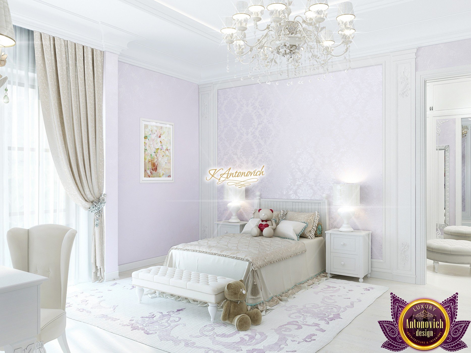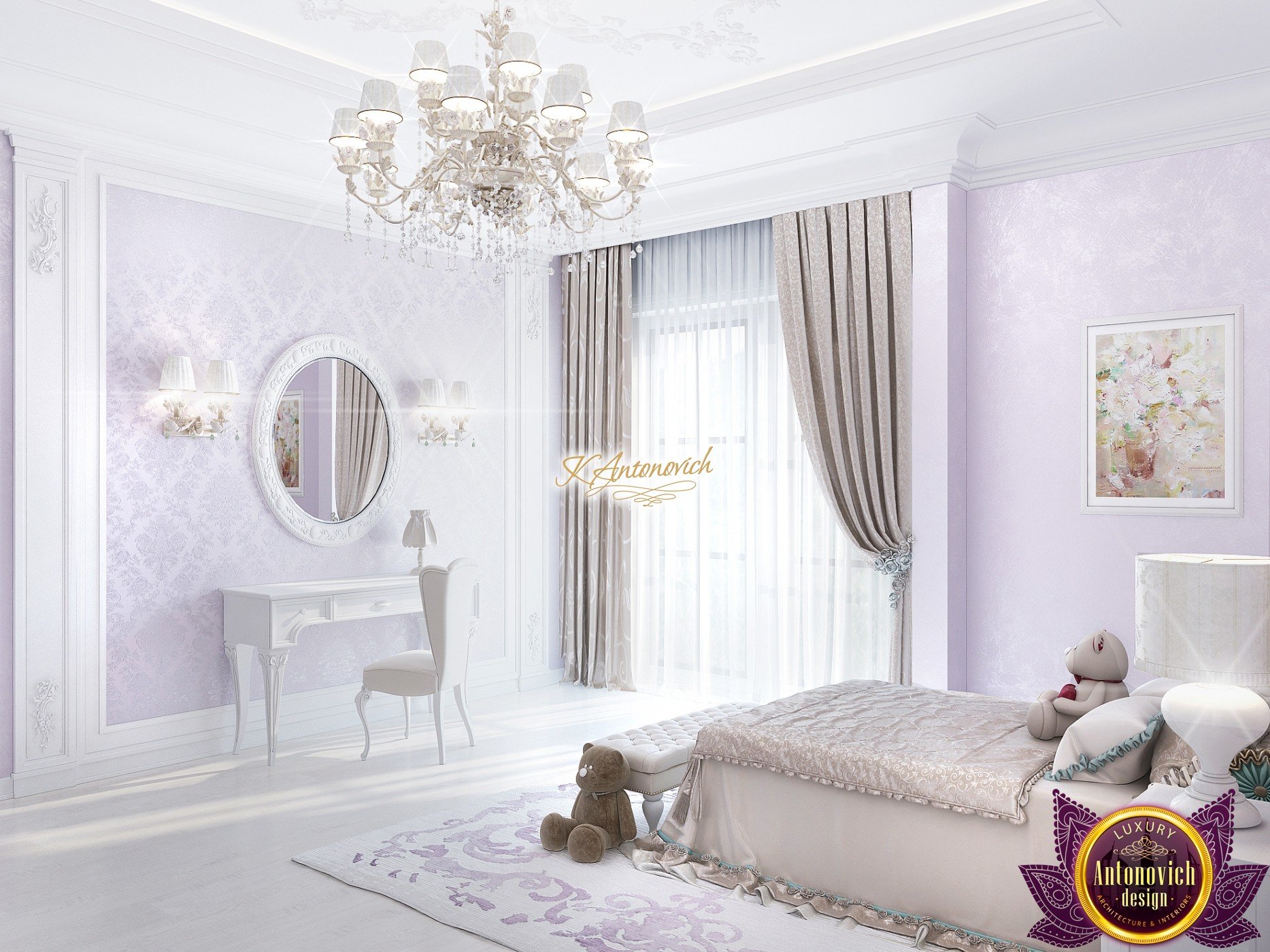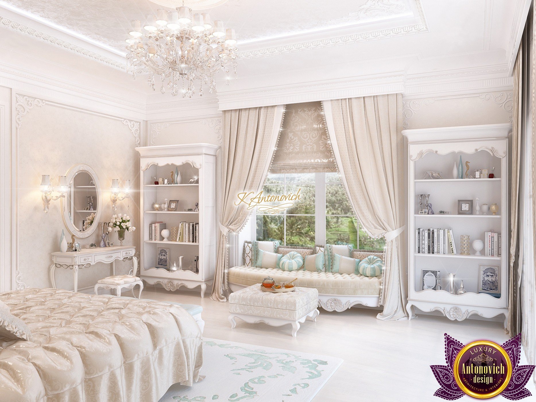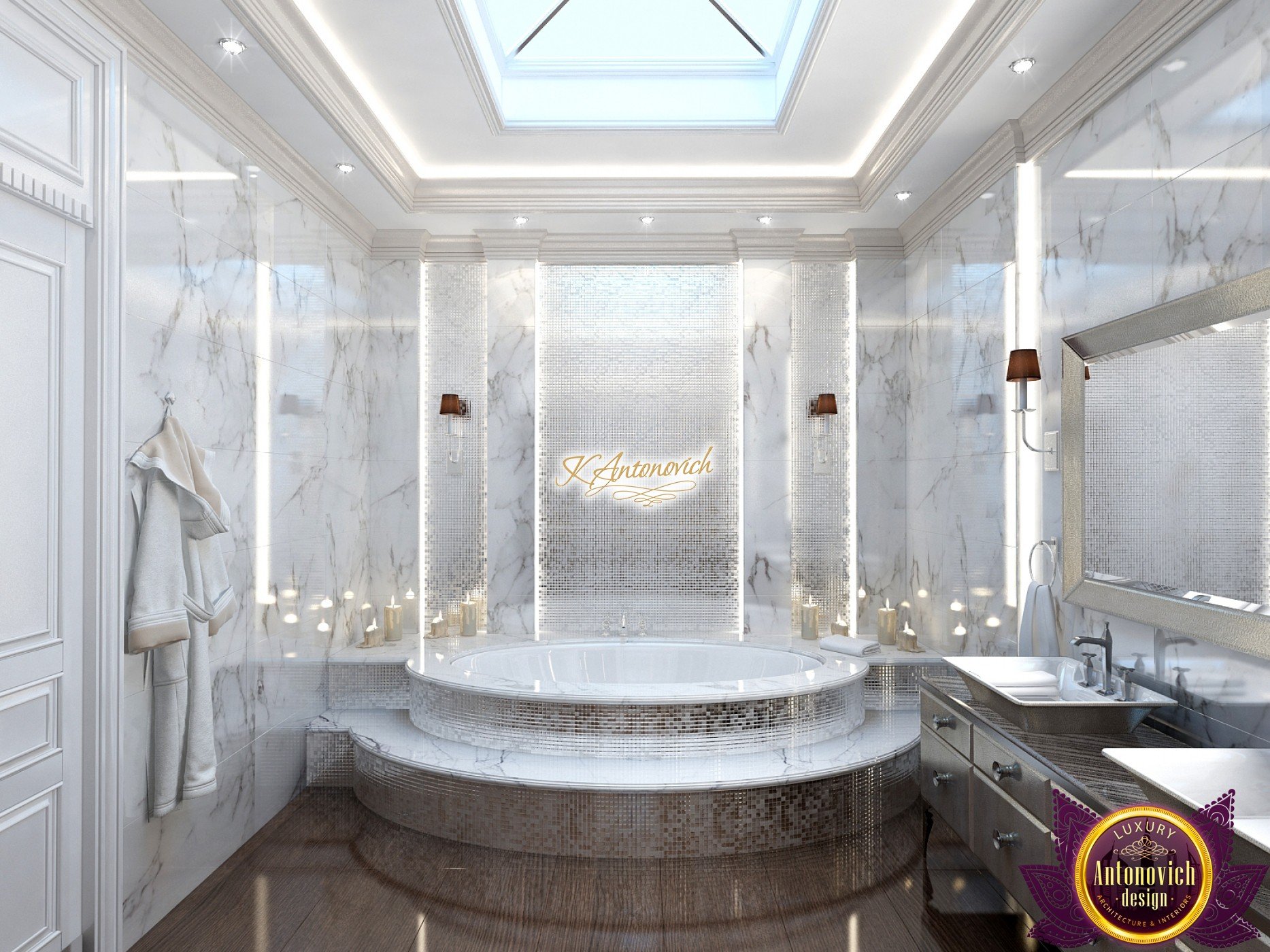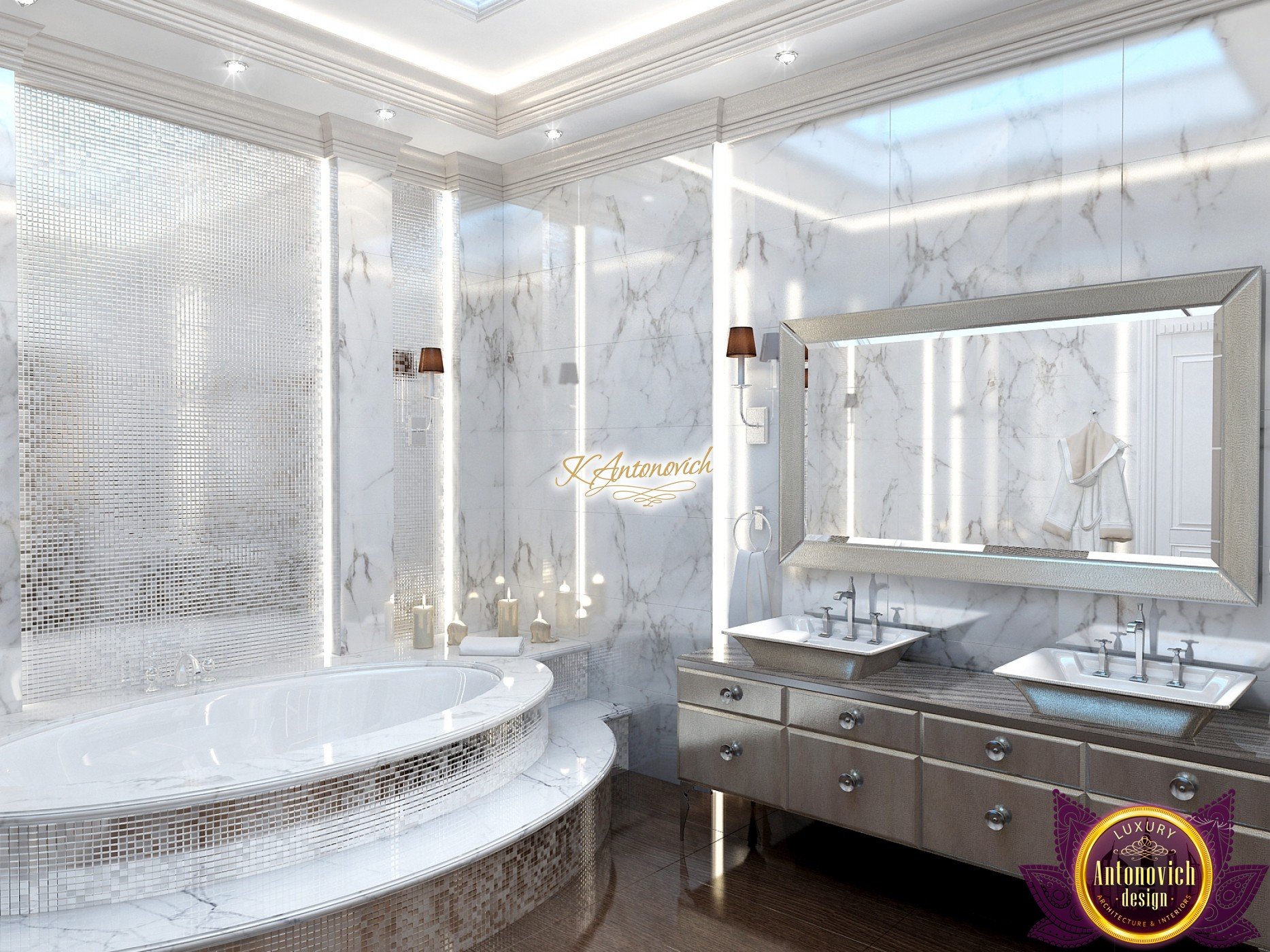 The double staircase, which leads to the upper floors of the villa, reflects perfect symmetry. A gilded wrought-iron balustrade complements its graceful contours with a handrail of oaky dark wood. This gives an artistic expression to the composition of the design. The Hall shines with pure beauty, in the walls decor, the main decorations are vertical stained glass windows with abstract ornaments made of brass. The stained glass windows extend almost to the entire height of the building, and they emphasize the luxury and artistic interior values. Fantastic Tiffany stained glass windows on the ceiling reflect similar patterns, as on the marble floor.