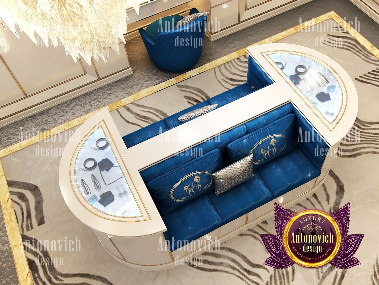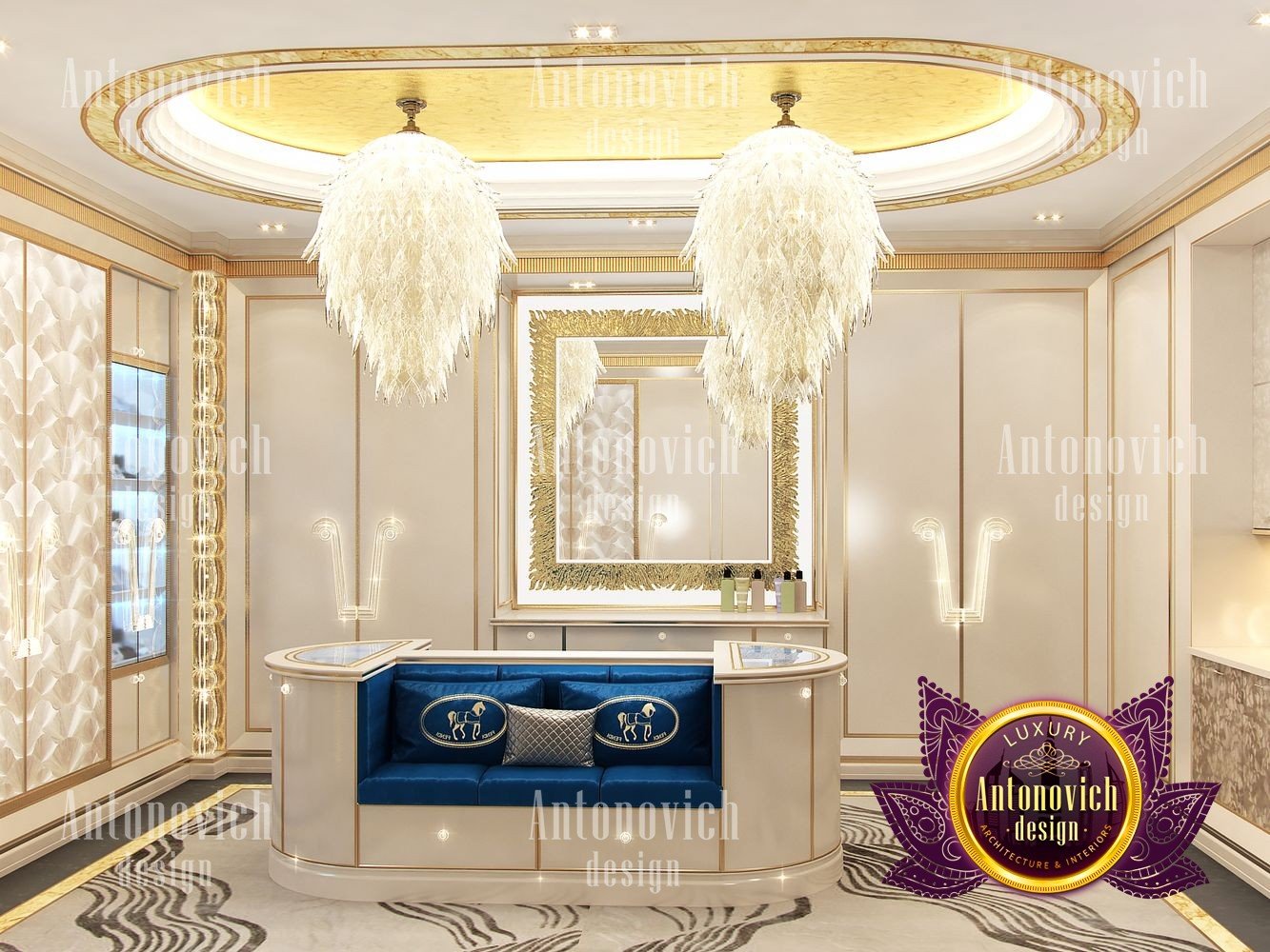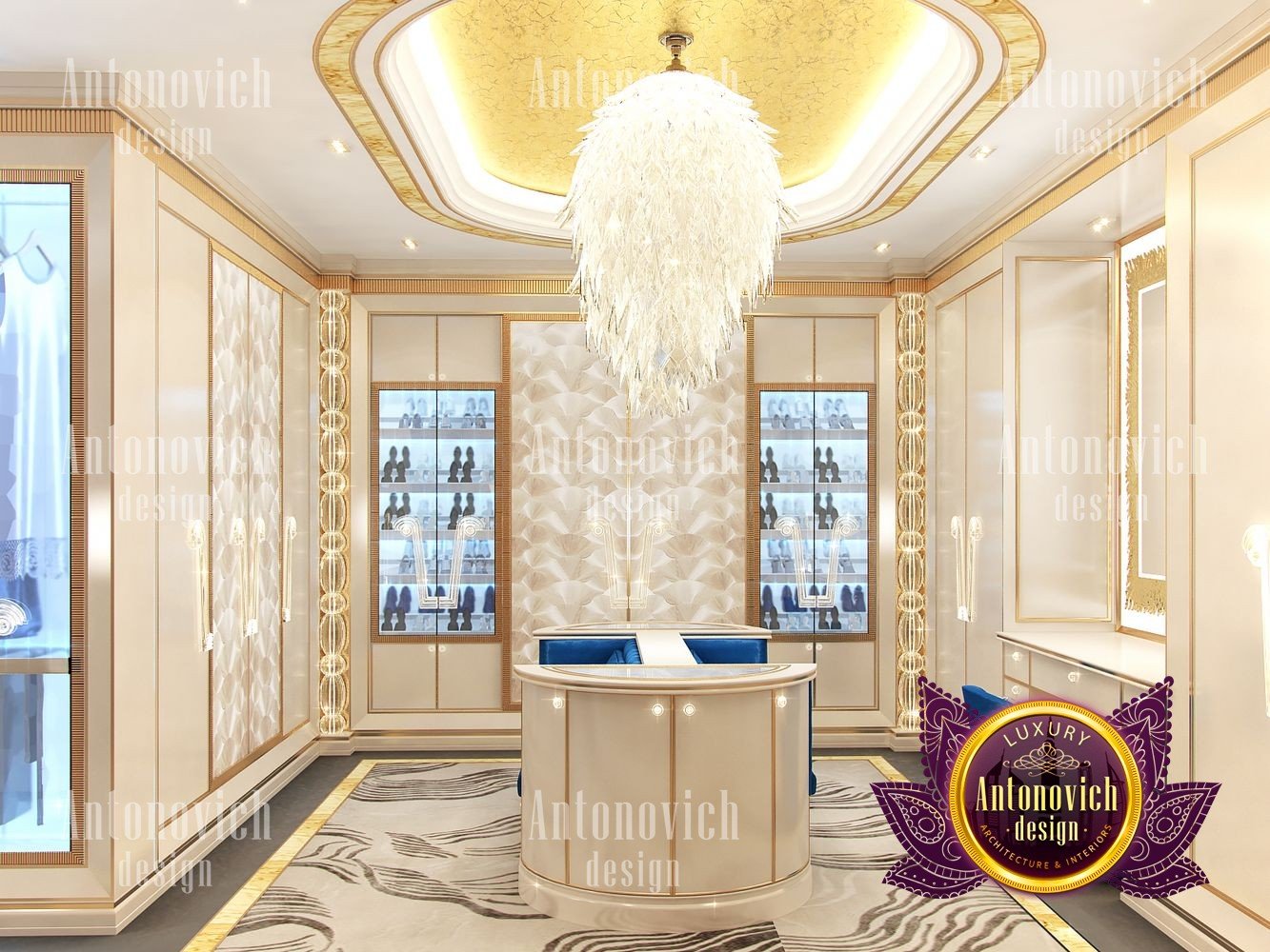 Sometimes such a room as a dressing room can quite claim the role of a pearl among all the other rooms in the house. Especially if the hostess closely follows the fashion and likes to constantly update clothing. For just such a connoisseur of the beauty, with impeccable taste, interior designers of the studio Luxury Antonovich Design have developed a variant of an art deco dressing room. The interior radiates a festive extravaganza of happiness. In such a space, whatever the weather conditions outside the window, no matter how sad it is sometimes, it will always be sunny and positive. Here you can completely abstract from the hustle of the surrounding world and fully devote time to yourself, your happy emotions and choose things for this or that event. In the first place, the luxurious ceiling decor sets such undoubtedly very festive mood. A deep niche with oval outlines is filled with golden hue decorative plaster. Against such a background, a luxurious chandelier with waterfalls of delicate crystal pendants looks very charming. The color palette of the interior is dominated by a milky white shade that accentuates the gilded elements of the decor and the luxurious accents of furniture. As soft furniture items, interior designers suggested an original double-sided couch in the center of the room and a soft chair near the boudoir with a beautiful large mirror. Upholstery made of beautiful velvet fills the interior with a special mood of luxury. Everything is very ergonomic and thought out for maximum functionality.