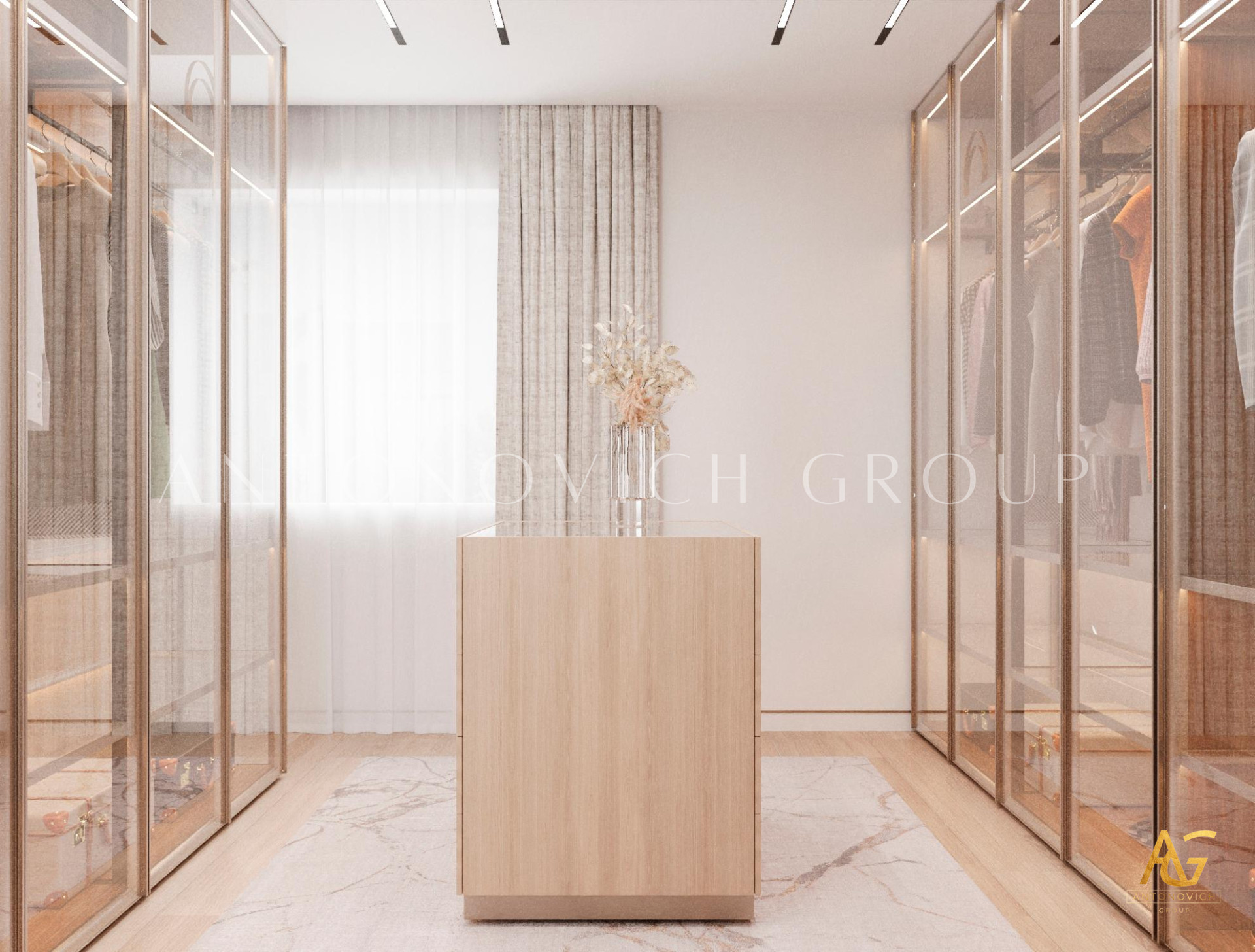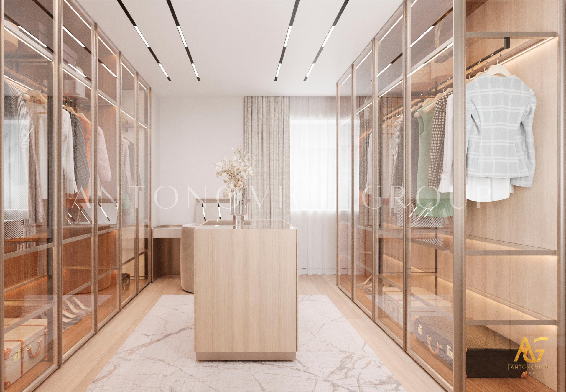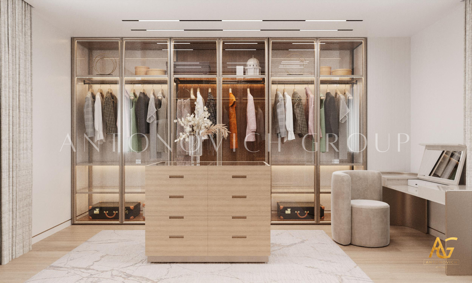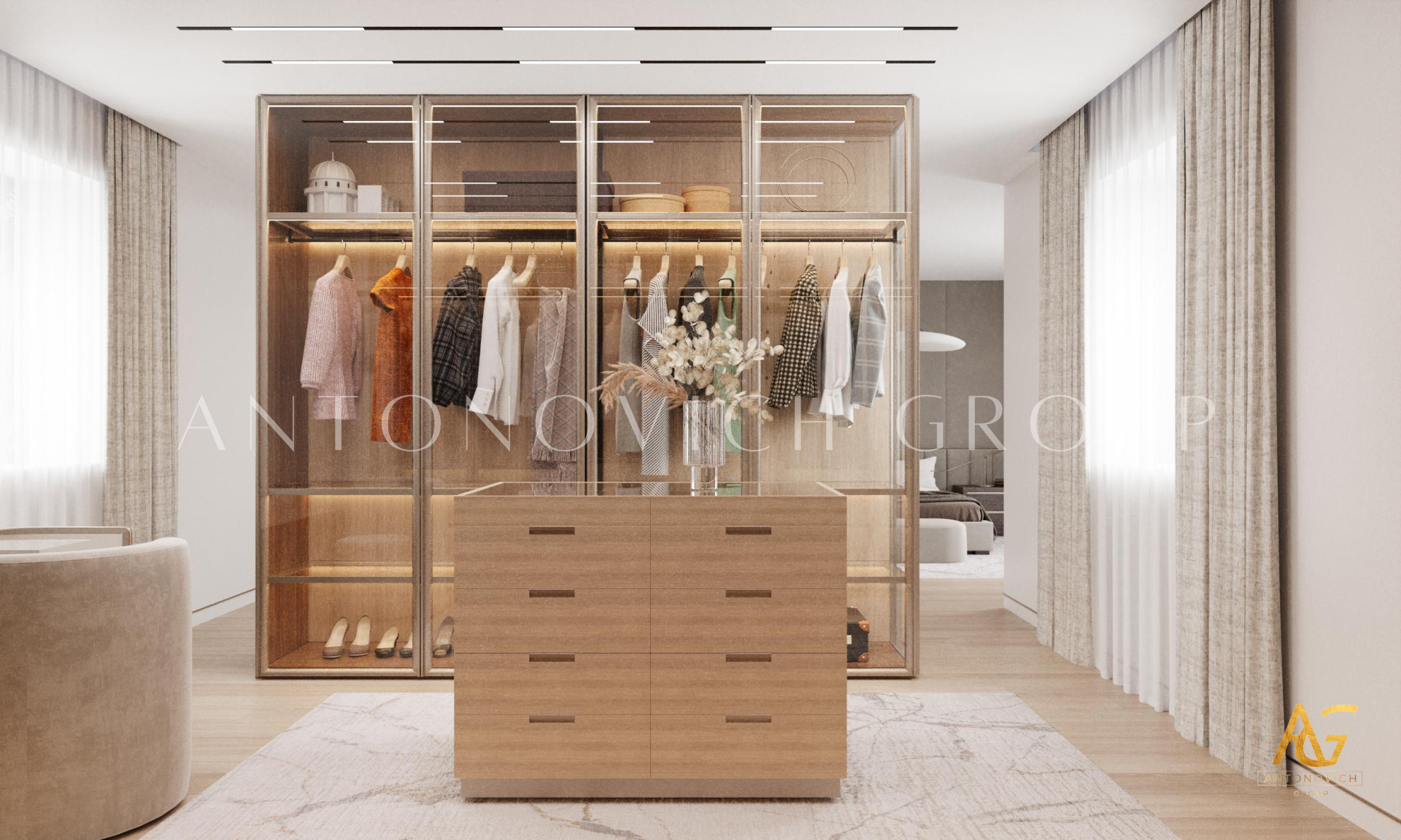What is the definition of a walk-in closet island? It looks like a built-in kitchen island, with wooden cupboards and drawers underneath and counter space. It is, however, utilized to store garments, belts, jewelry, scarves, and other accessories. Also, the counter area can be used as a dressing table by laying out your clothes as you get ready. Alternatively, utilize the counter as a folding surface. A well-designed walk-in closet can be an excellent storage solution for your clothes, shoes, and accessories. Beautiful closets with fundamentals like amazing storage cabinets and gorgeous lighting, as well as some pretty interesting vanity elements, may be found below. The walk-in closet in the photo maximizes storage on both sides of the available walls. The U-shape cabinets are made of wood with a dark wenge finish and simple molding elements, but instead of solid wood doors, they have wood-framed clear glass doors so you can see what's within. Bags have their own closed shelf, and in the center is a sort of island with additional drawers for belts, jewelry, and other goods.