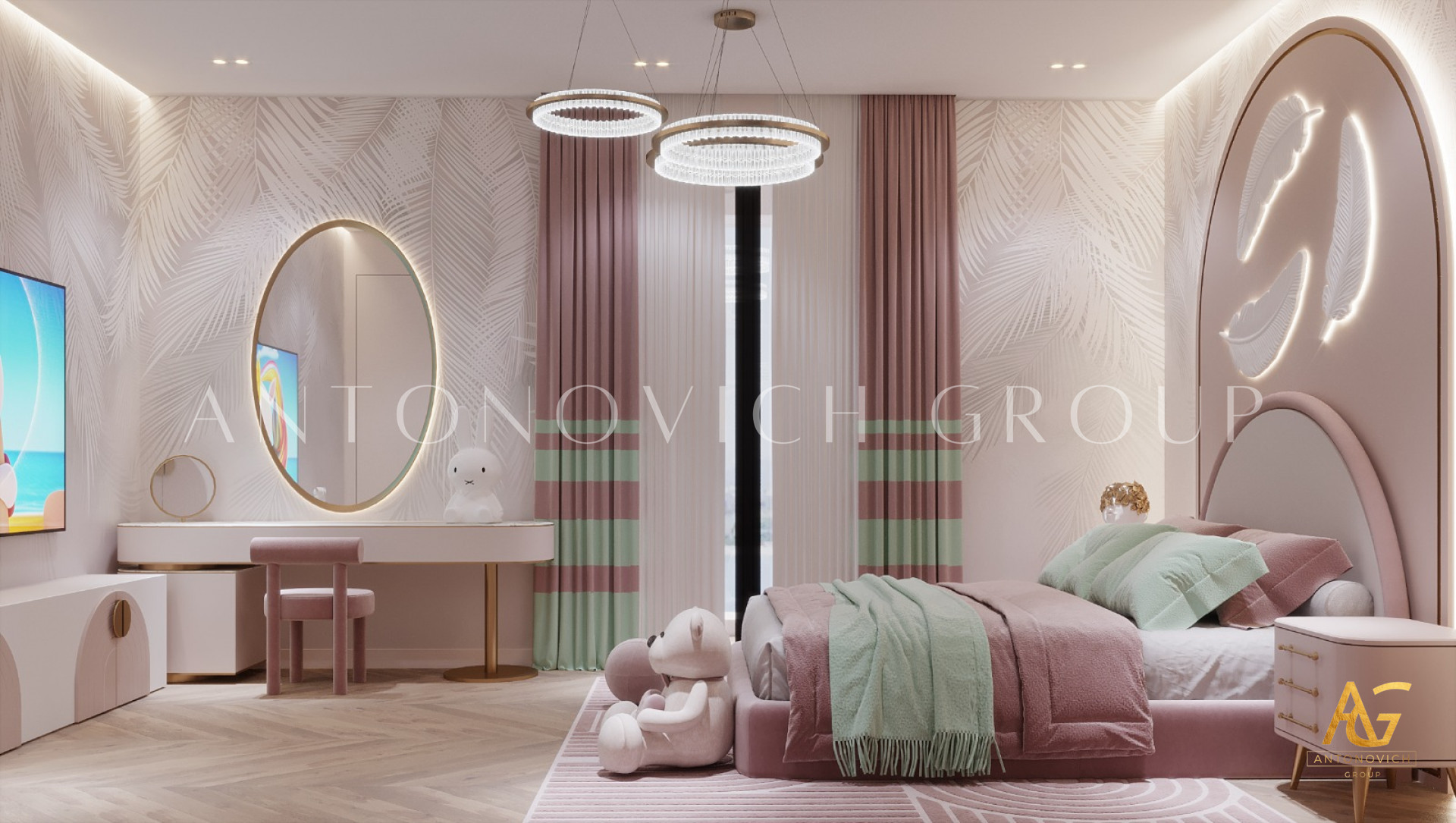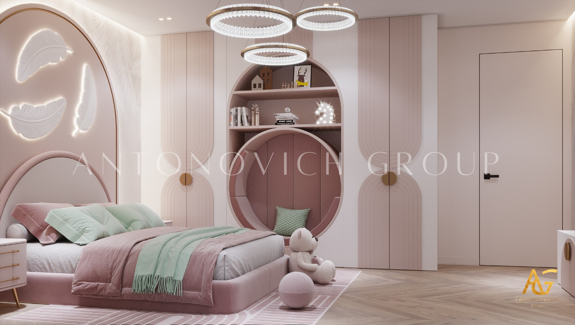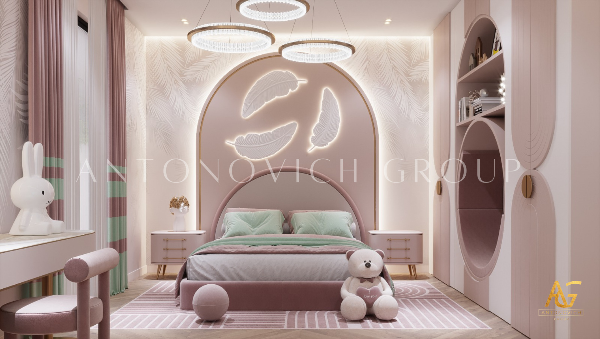 Antonovich Group's expertise in interior design, furniture, and fit-out shines through in their creation of enchanting kids' bedrooms with a baby pink and feather theme. These spaces transcend the conventional, offering a blend of elegance and whimsy that captivates both children and parents. With a commitment to creating personalized and dreamlike environments, Antonovich Group continues to redefine the possibilities of children's room design, turning each space into a haven where dreams take flight.