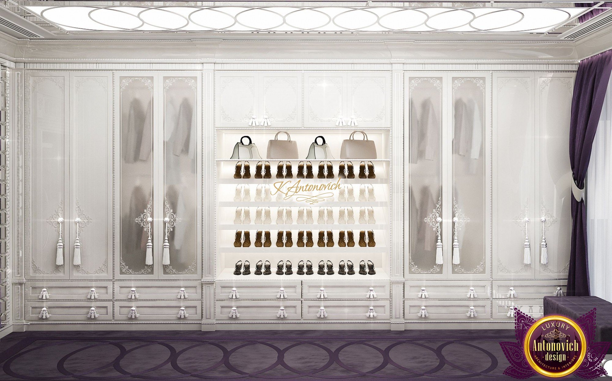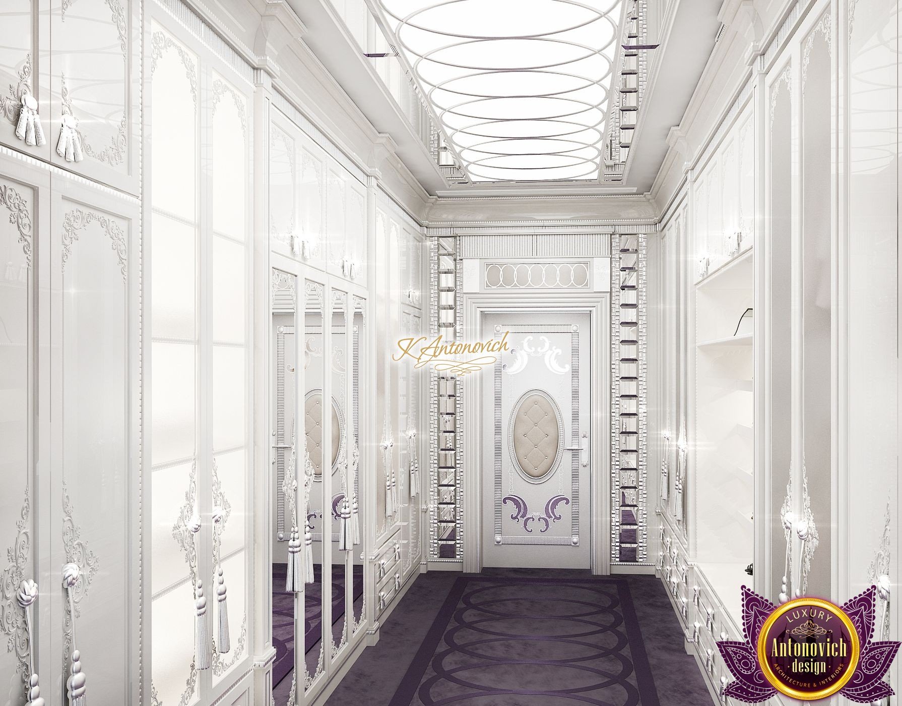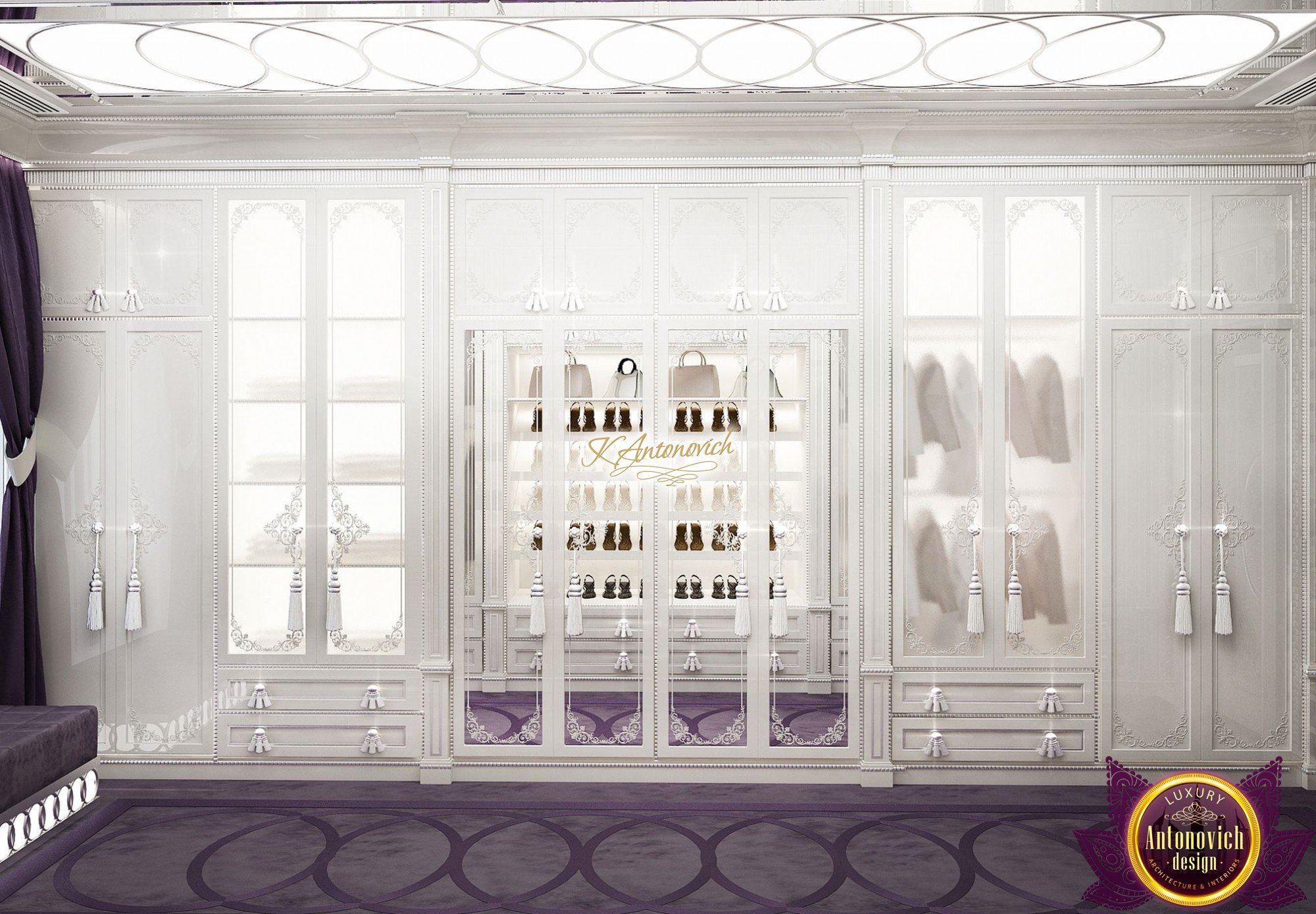 The design of the dressing room becomes an excellent way to create the most comfortable space for storing clothes, shoes, and accessories. In this project, this room has the shape of a rectangle. The advantage becomes the presence of a window and a quite large area of a dressing room. As this wardrobe belongs to the female owner of the house, interior designers suggested taking as a basis snow-white shades.And for the window, the curtains of velvet of a dark purple shade marvelously suited.Ottoman at the nice window is upholstered in the same velvet. The dressing room interior design is always the use of new storage systems and modern ways of lighting.Designers of Antonovich Design Studio create interiors in which is always as convenient as possible to store a wardrobe and to choose an outfit for one or another day. The design of the dressing room turned out very bright and slightly glamorous. To visually expand the space, the authors of the project proposed to decorate the ceiling with a large niche with backlighting around the perimeter.The geometric pattern on the niche perfectly matches the carpet pattern on the floor. The design of the dressing room is a stylish interior for a stylish woman.