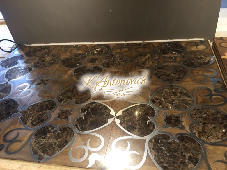 Laying of floors from natural wood with carved patterns and parquet
